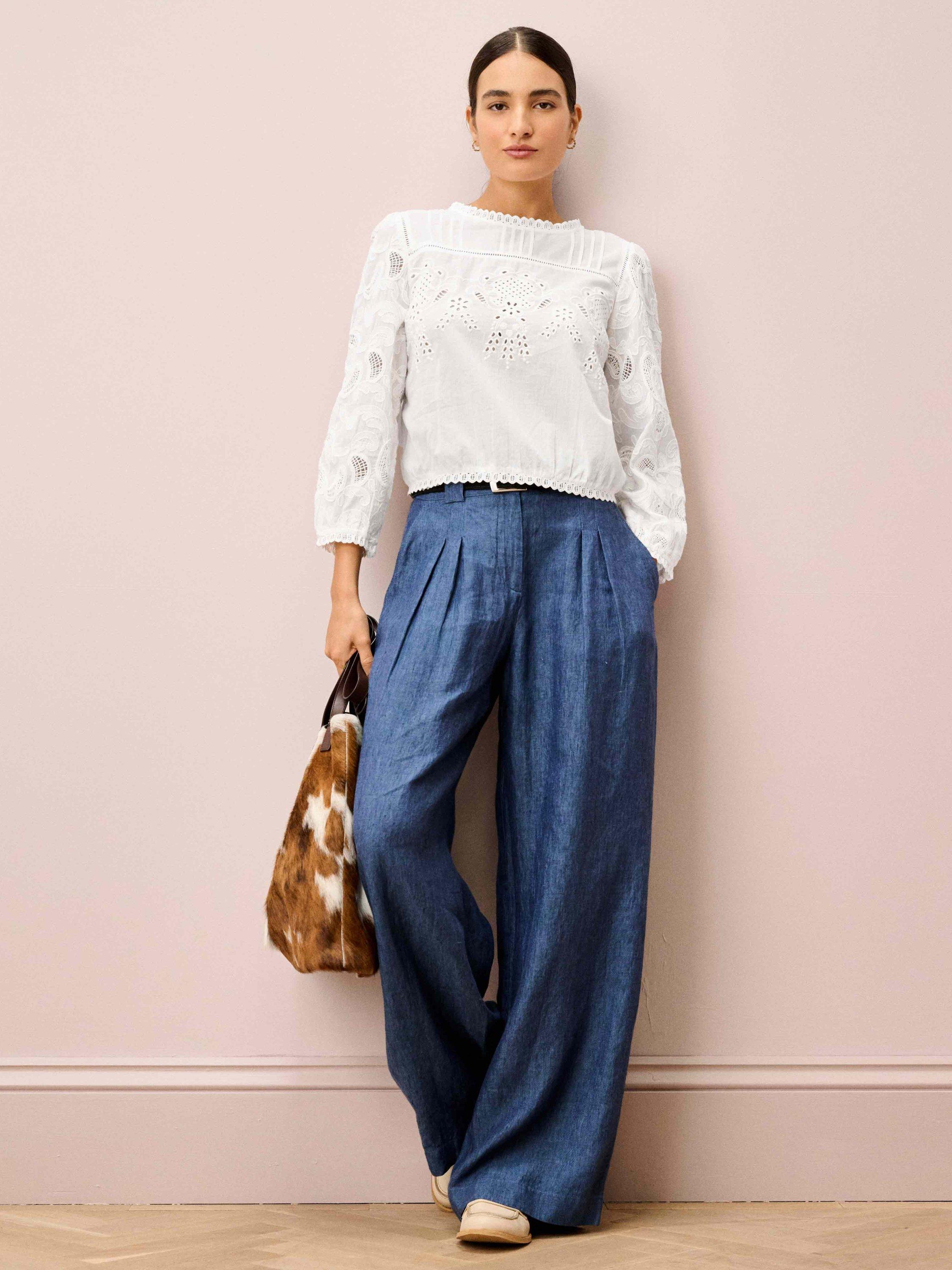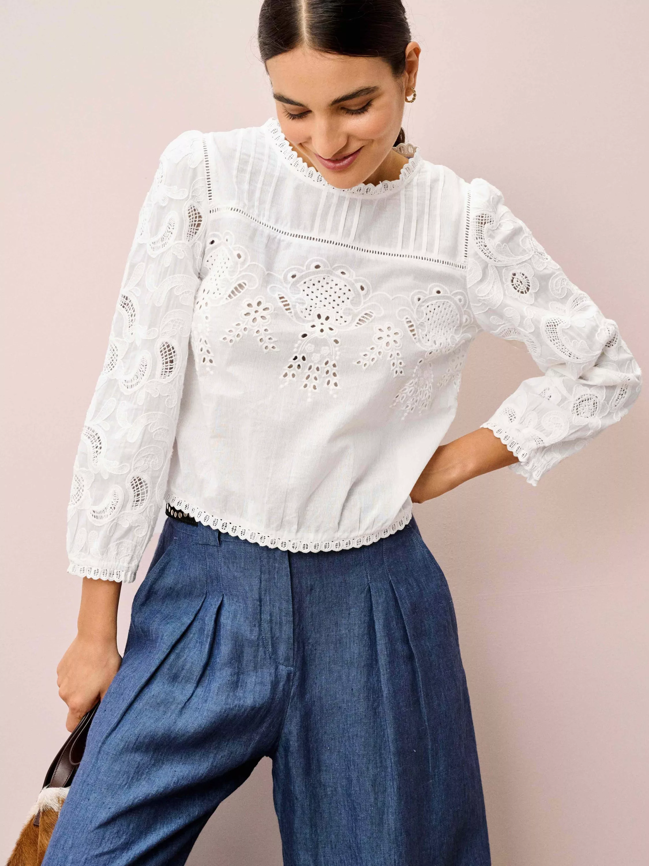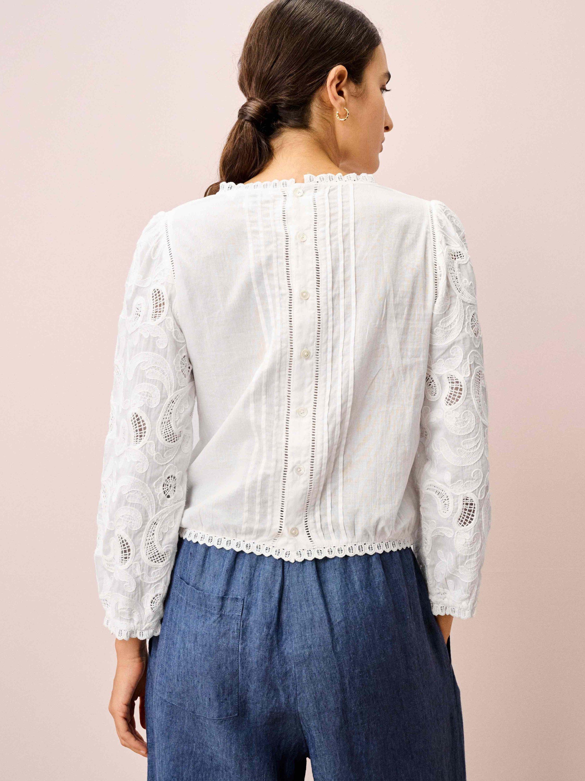 Designed in-house, this cotton beauty combines all the details you love: floral broderie anglaise, intricate embroidery, ladder-stitch inserts, pintucks, elasticated cuffs, frill trims and buttons down the back.