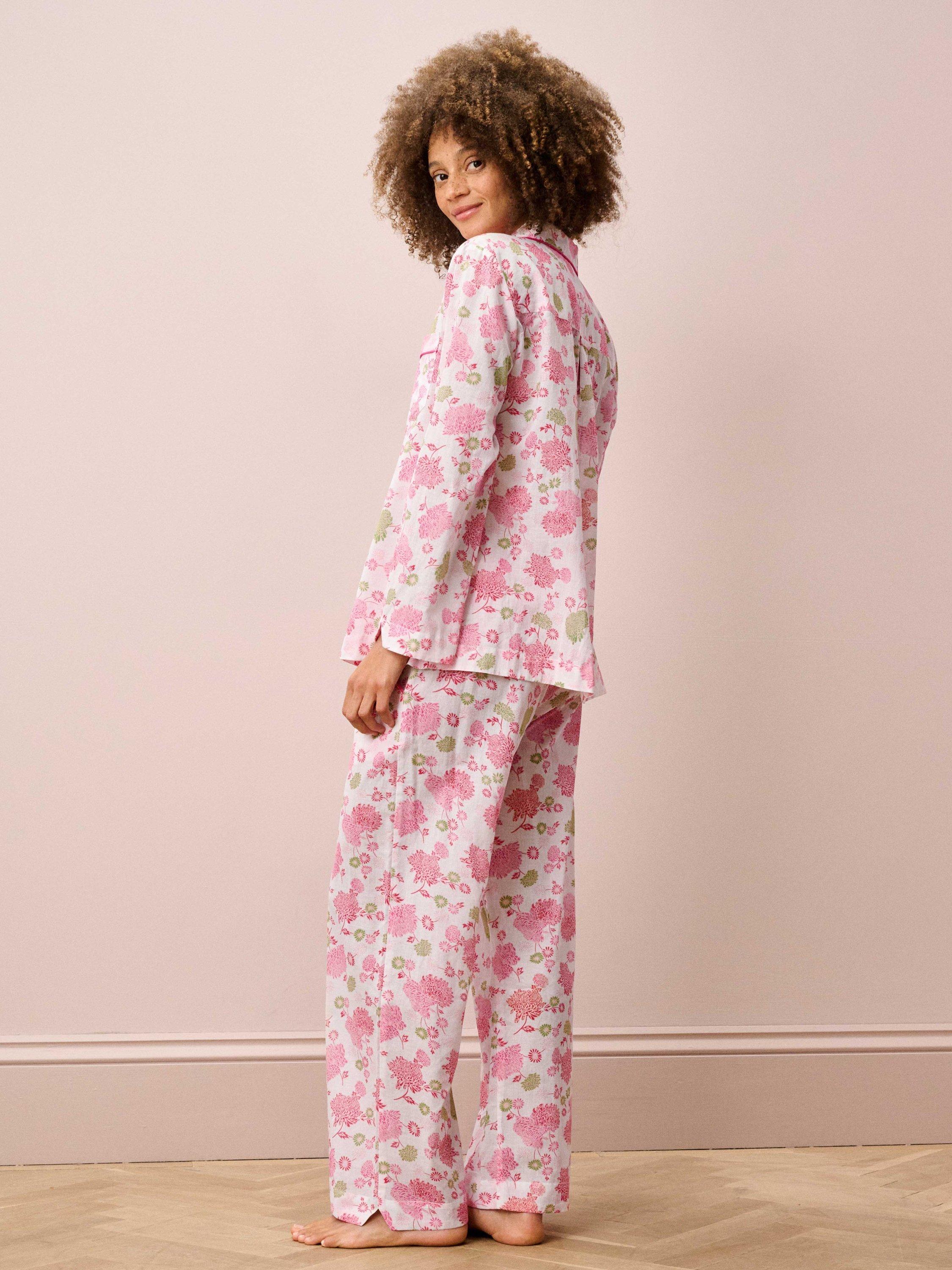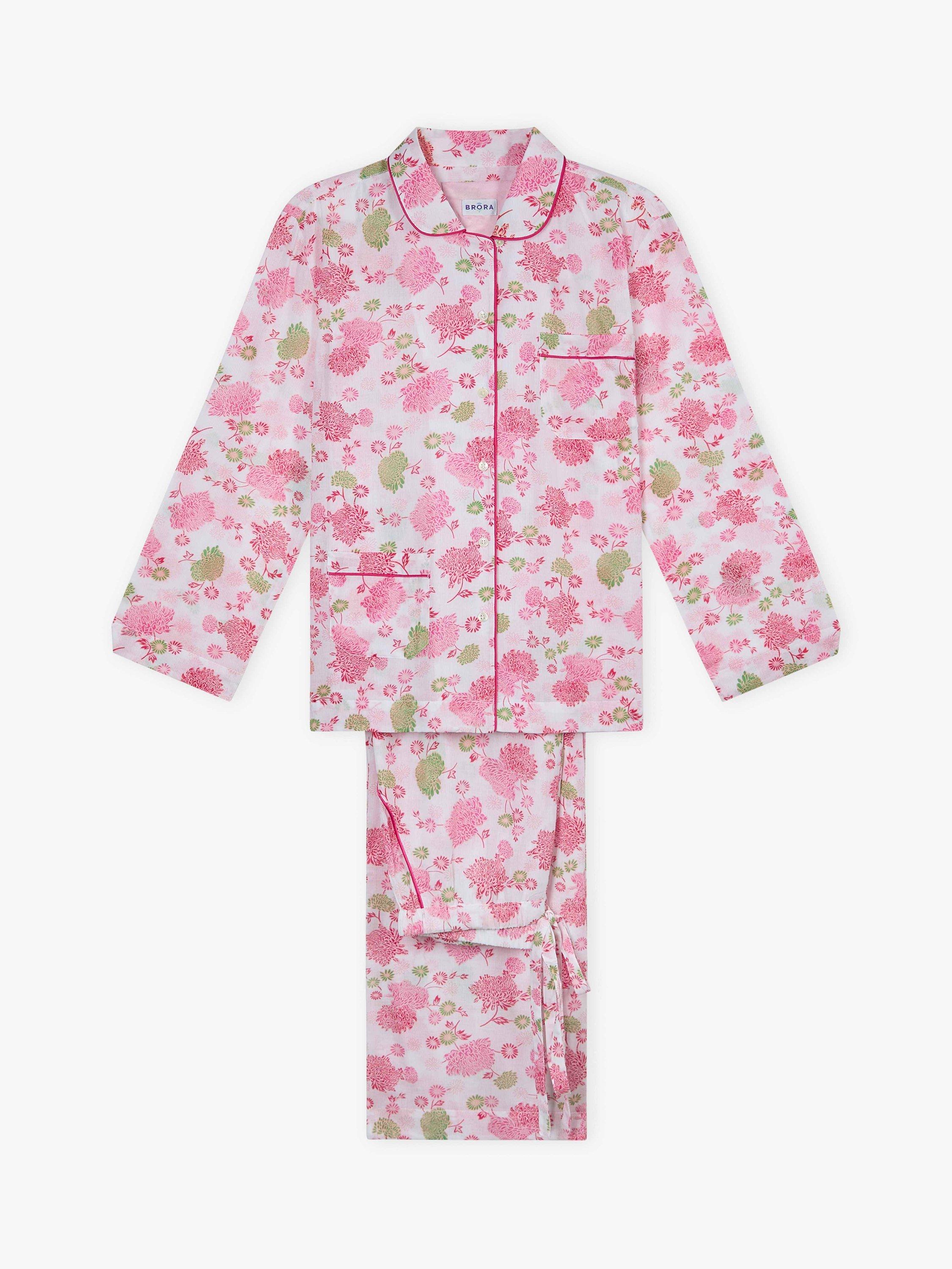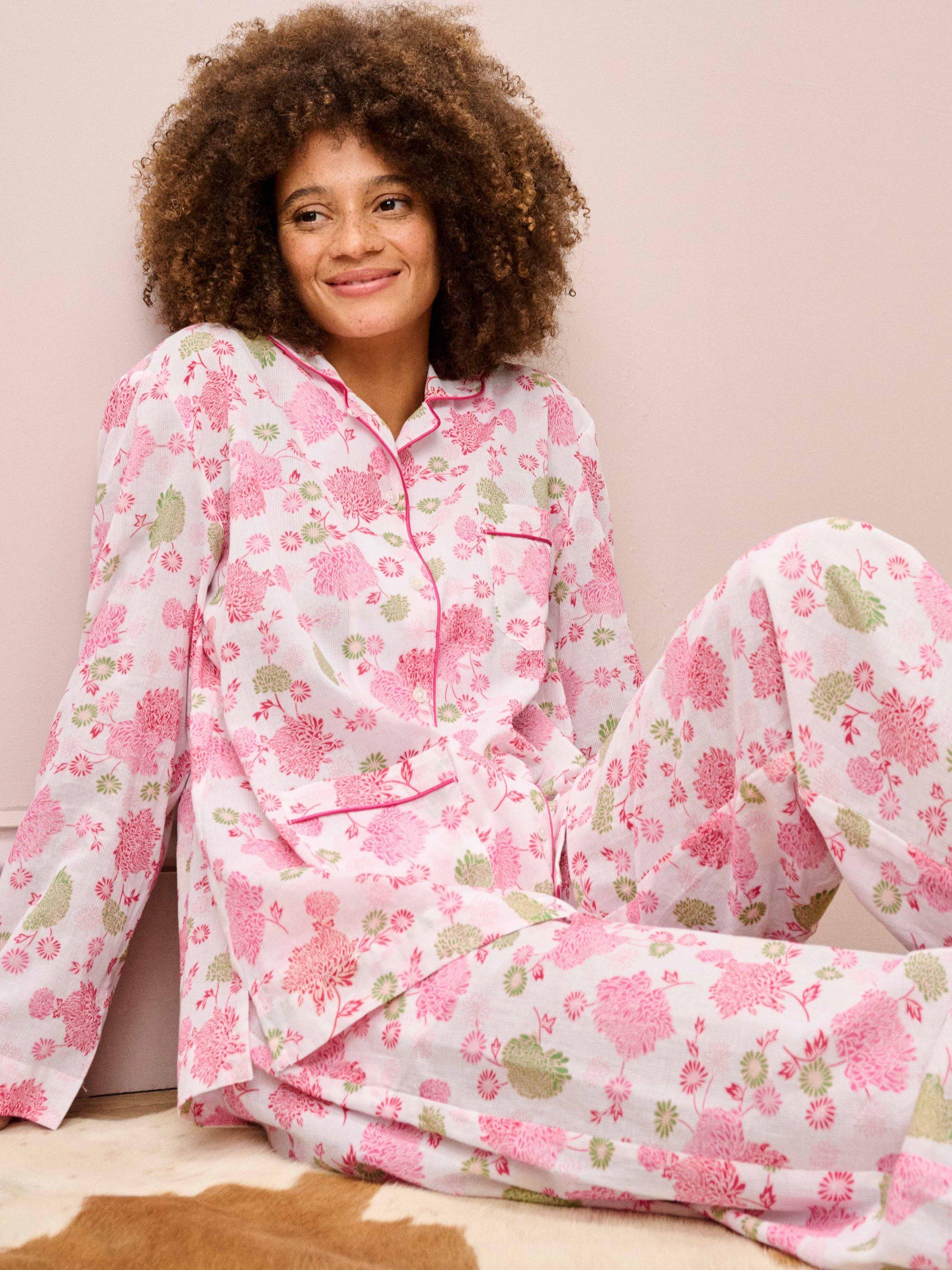 Made from breathable cotton, these pyjamas were designed for peaceful nights and unhurried mornings, finished with a bold floral pattern, satin contrast piping, a drawstring waist and a top rouleaux loop fastening.