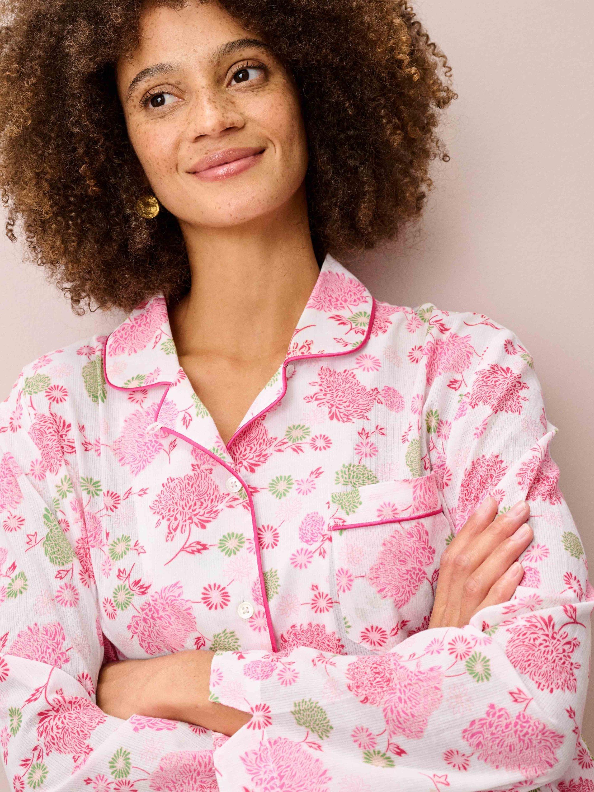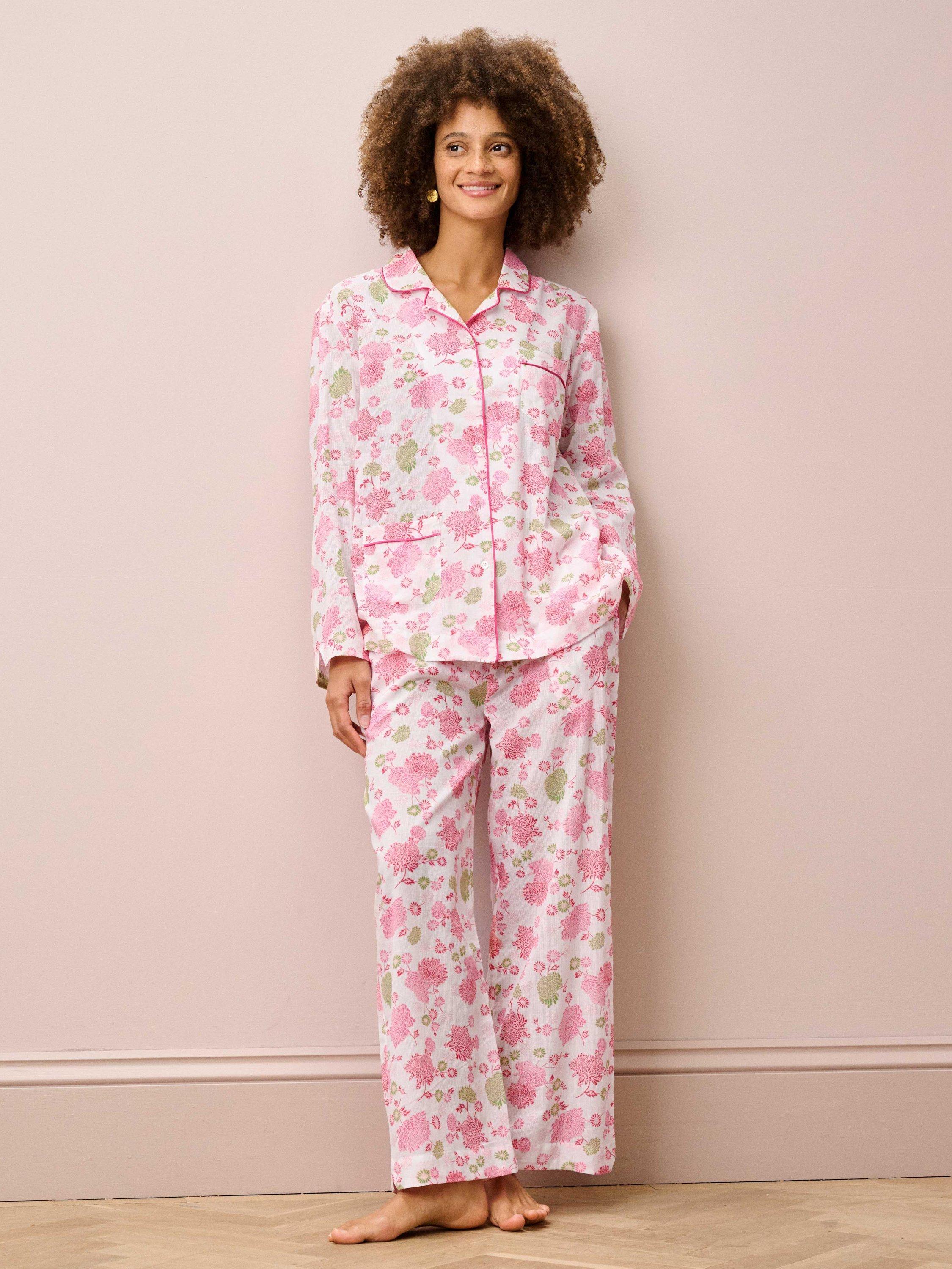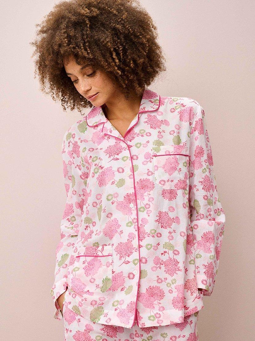 Made from breathable cotton, these pyjamas were designed for peaceful nights and unhurried mornings, finished with a bold floral pattern, satin contrast piping, a drawstring waist and a top rouleaux loop fastening.