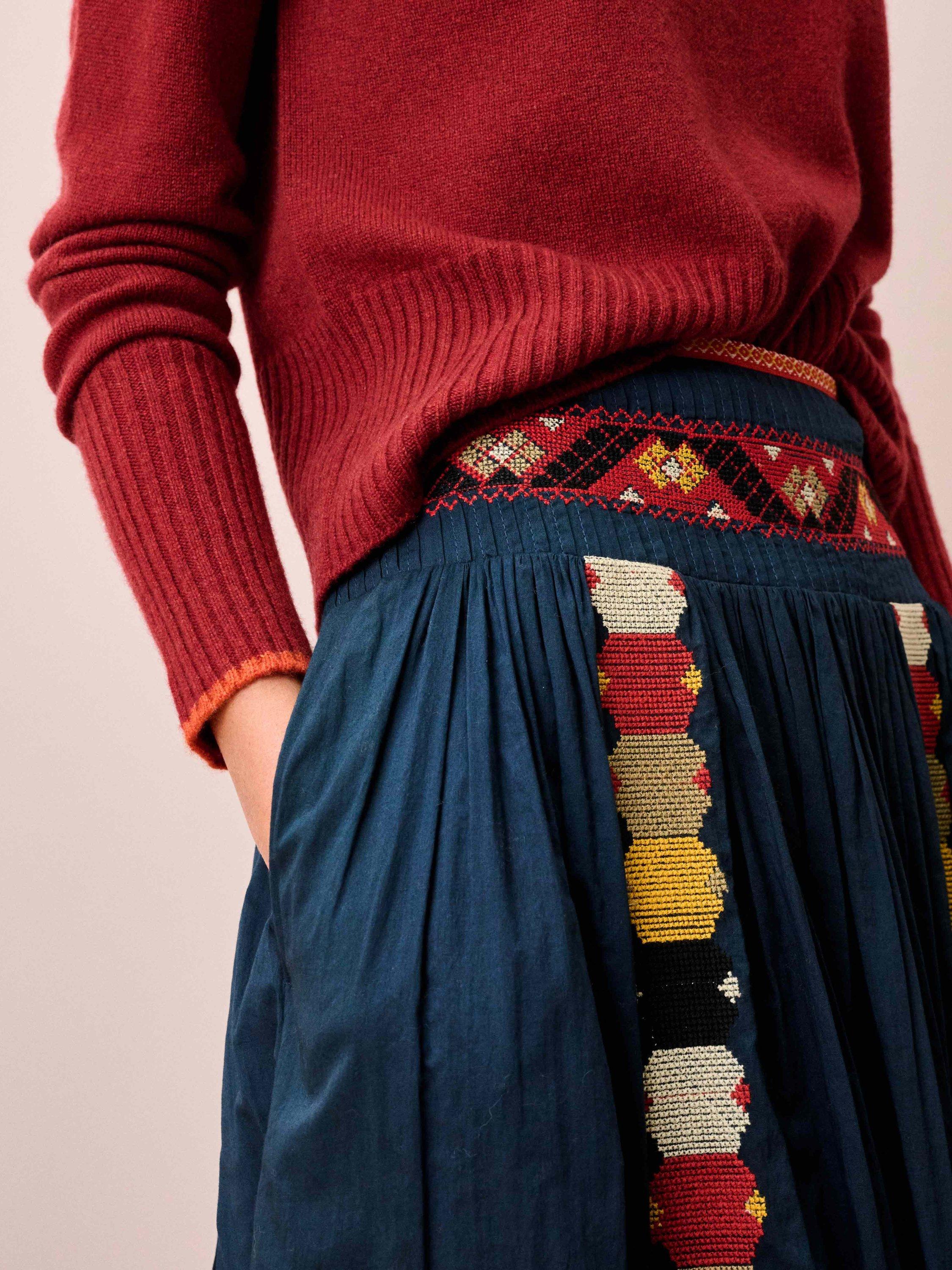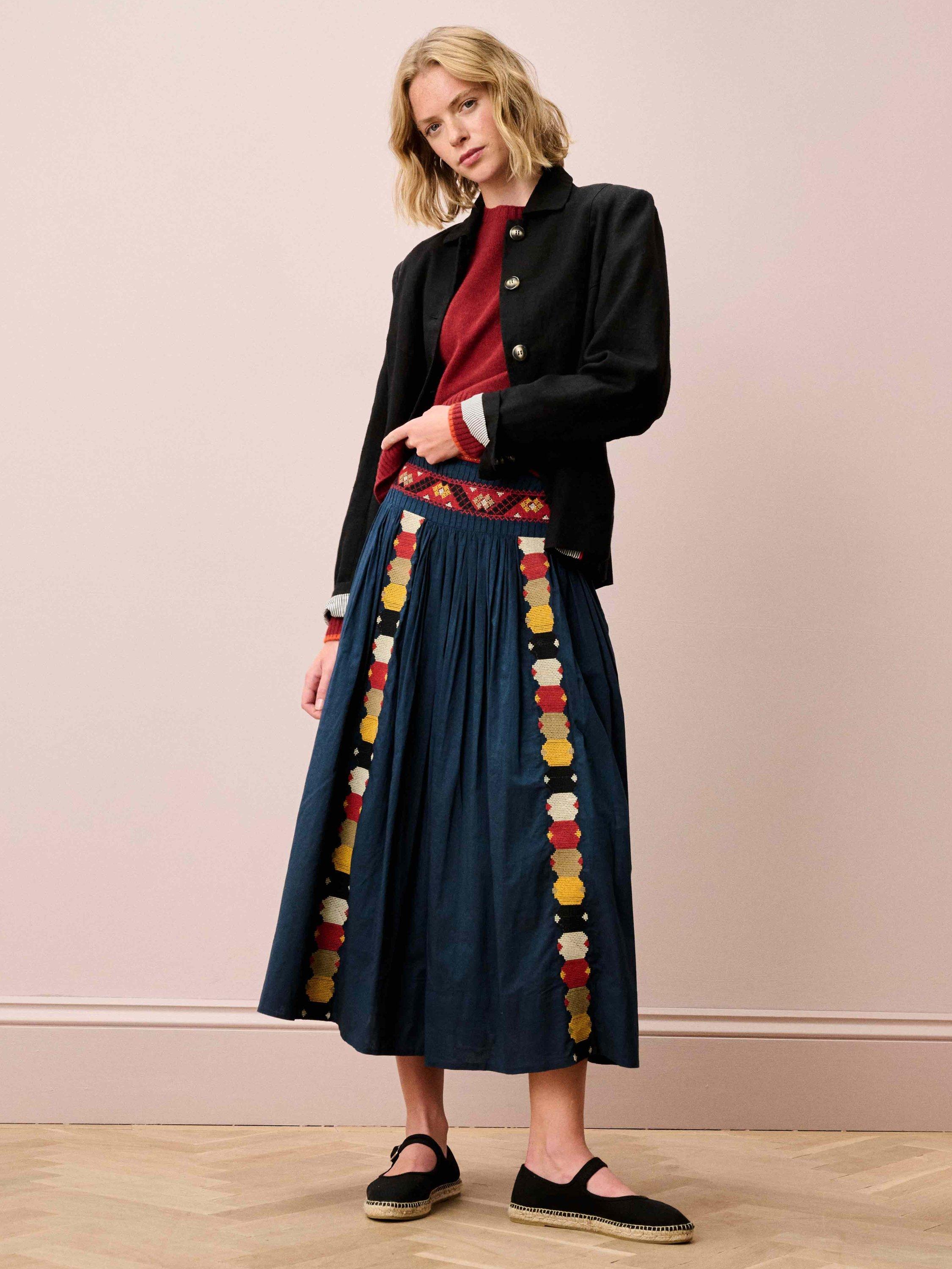Thoughtfully designed in-house for the fashion-forward woman who loves to stand out from the crowd, this cotton skirt combines intricate pintucks, pleats and folk embroidery with colour-clashing geometric trims to finish.
