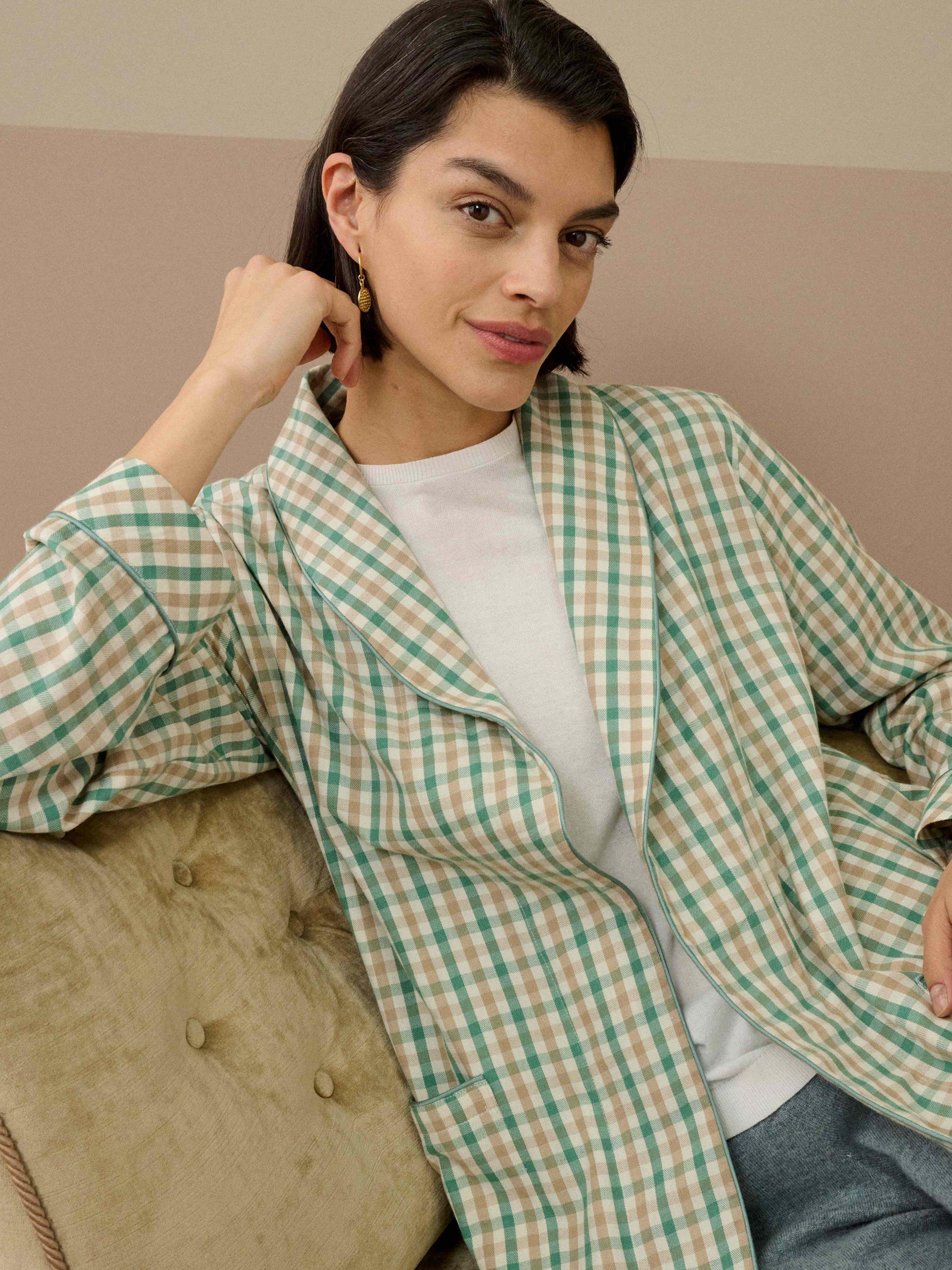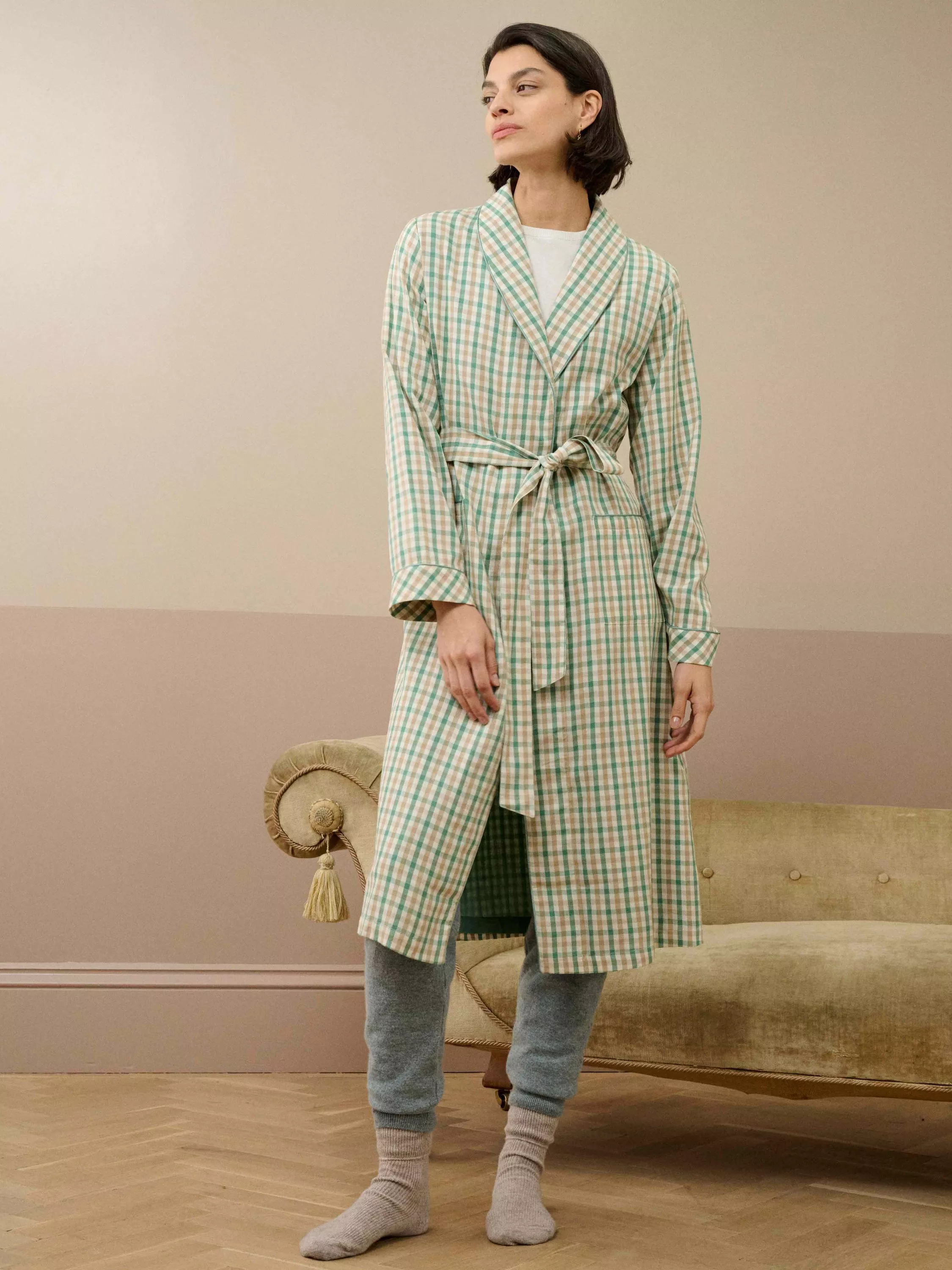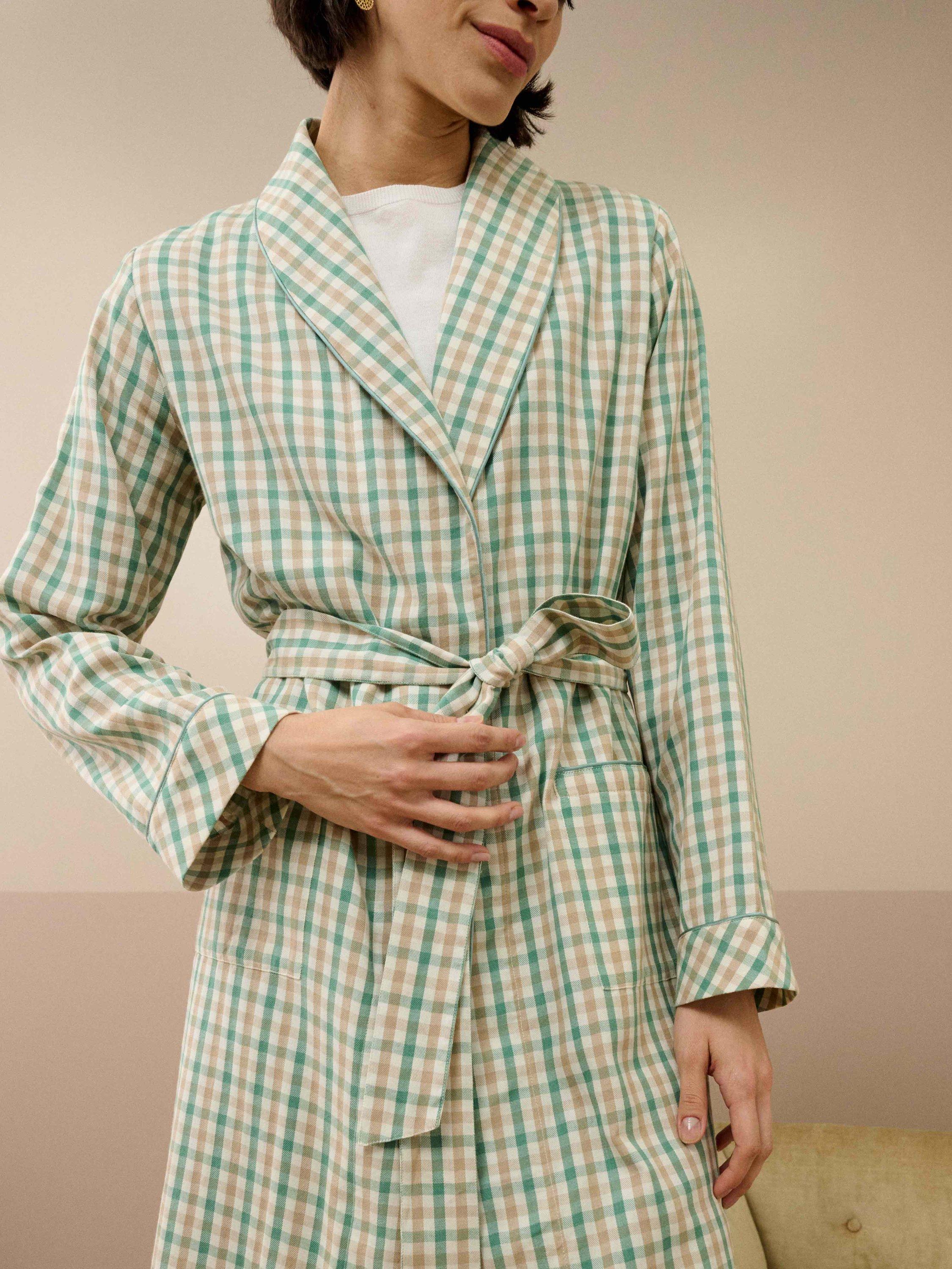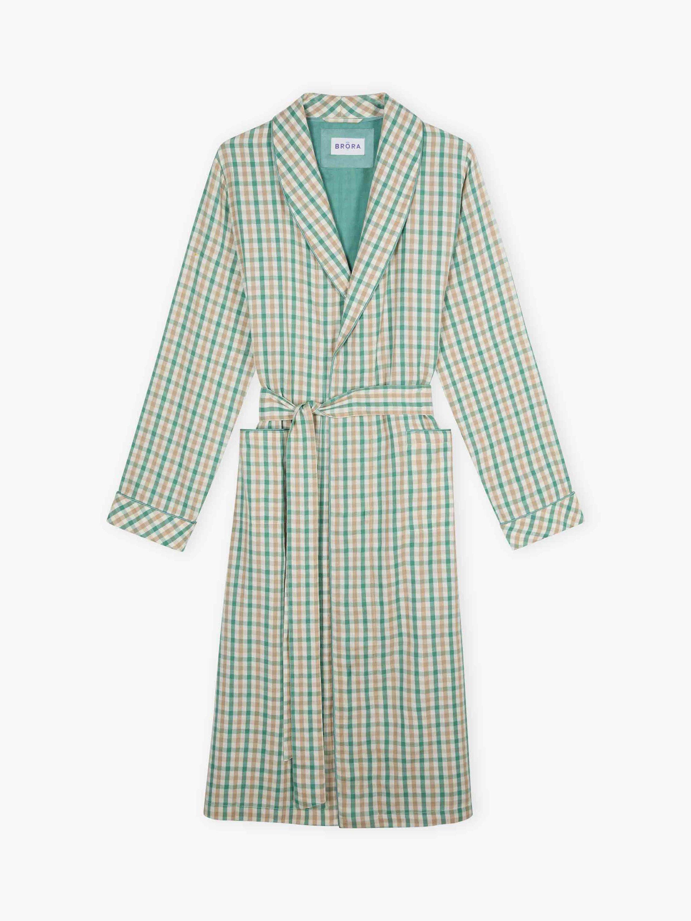 Made from pure, butter-soft cotton, we're sure this cosy dressing gown will go down a treat with you, due to its gingham check, waist-cinching belt, functional patch pockets, bias-cut cuffs, and luxurious silk trims.