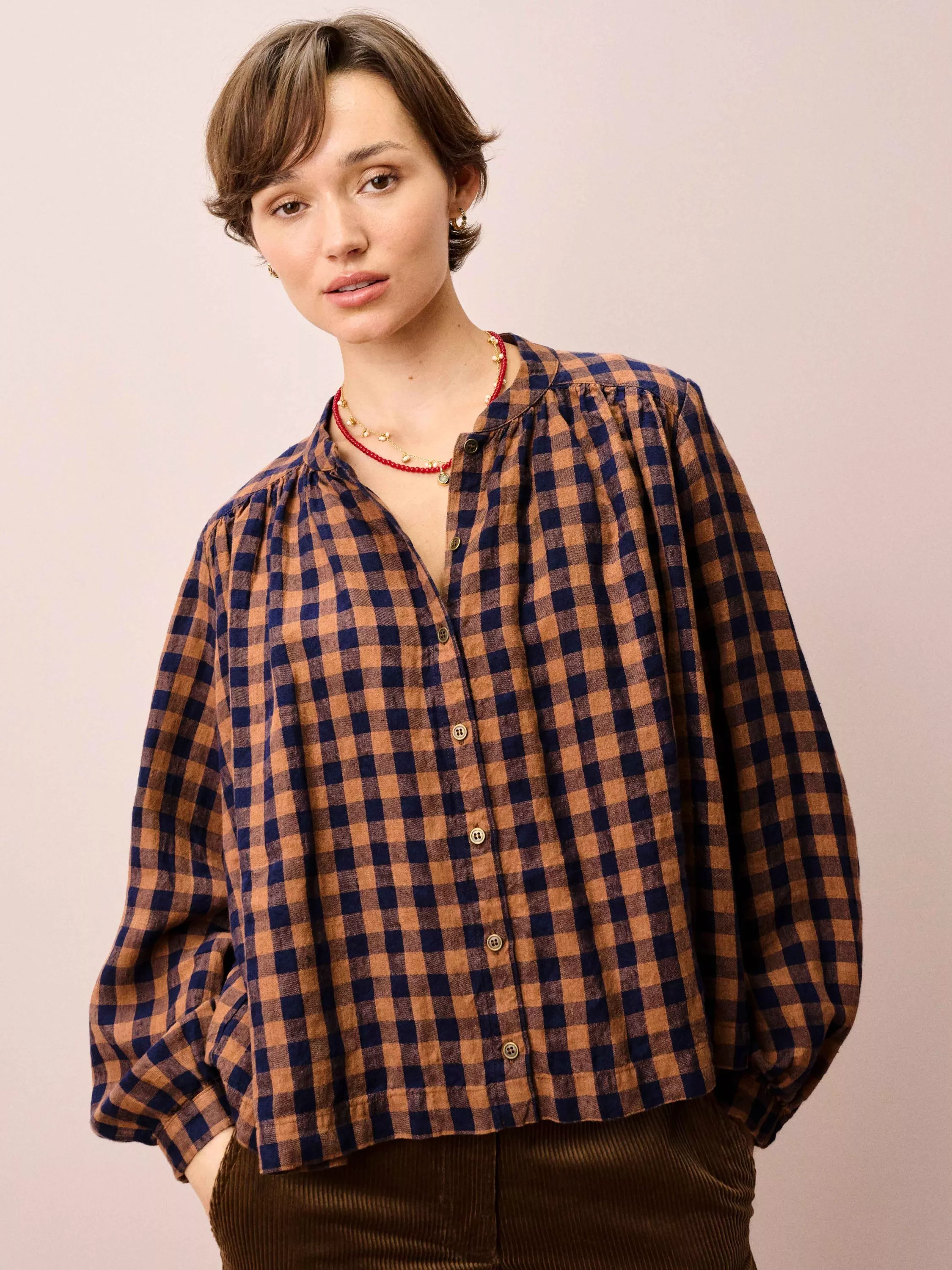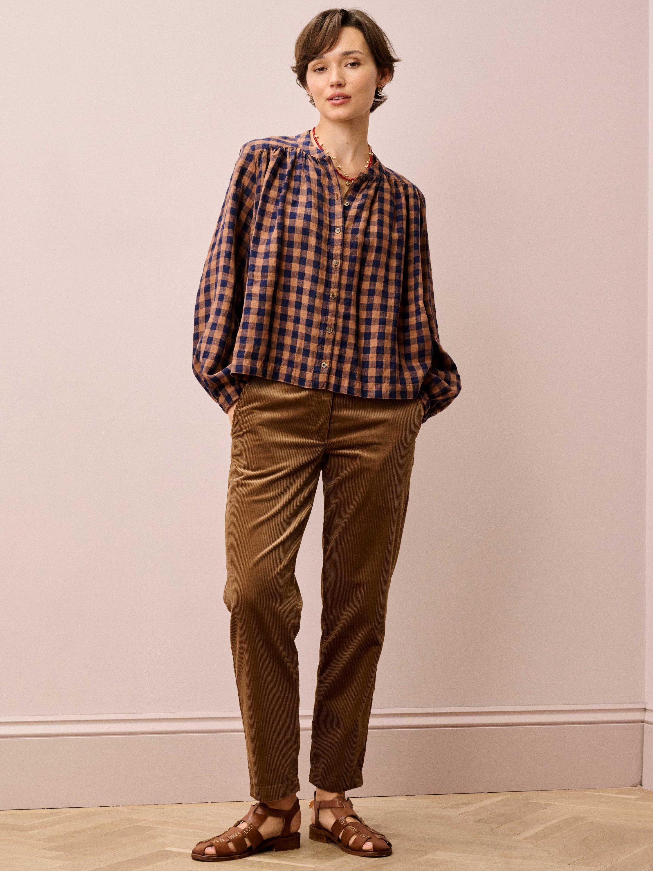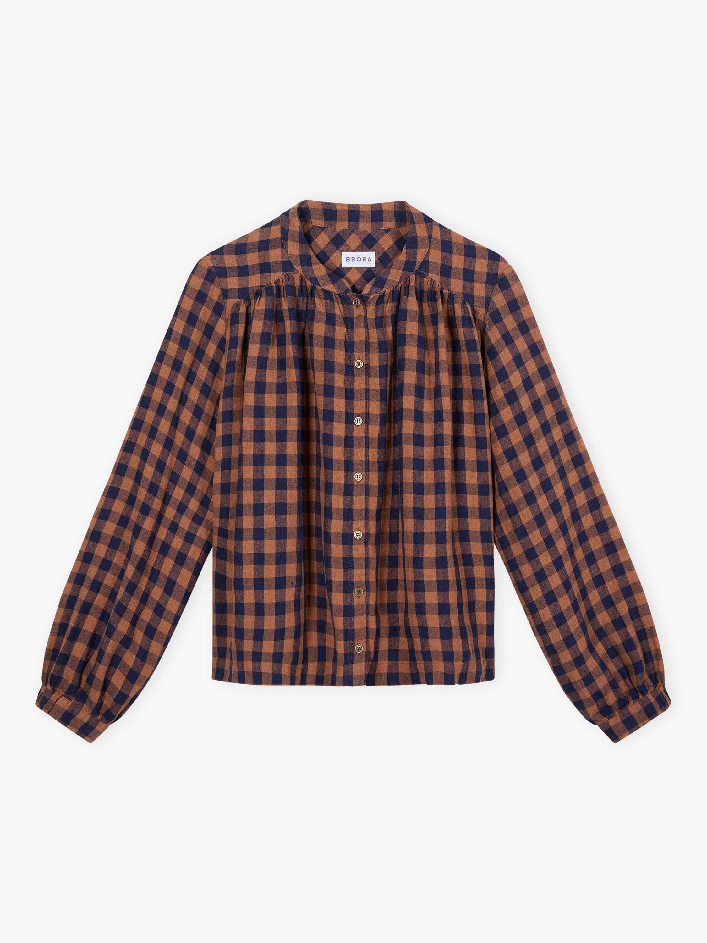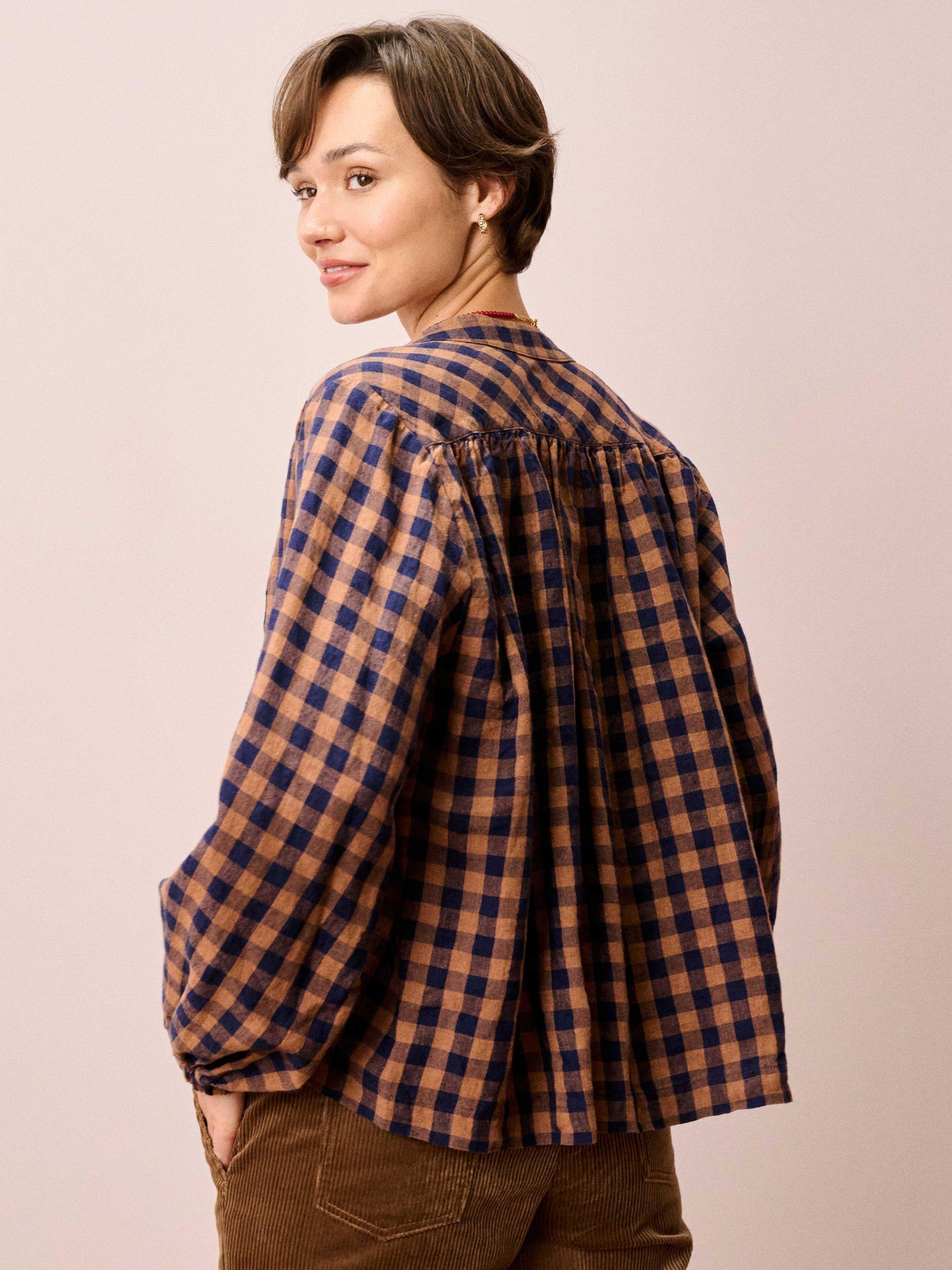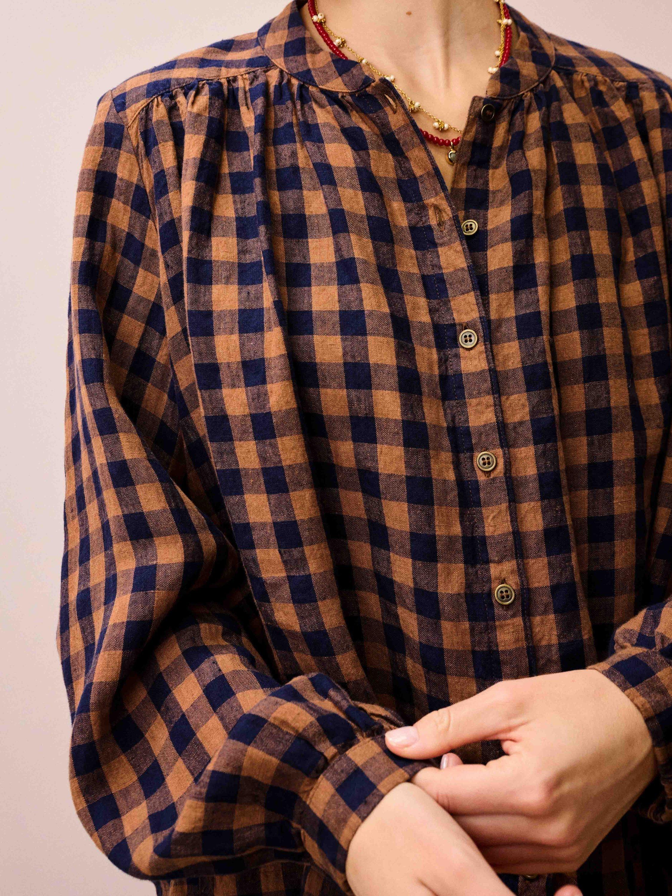 Made from linen, this gingham smock blouse delivers an authentically Brora heritage twist with a breathable, floaty shape, a rounded neckline, a collar stand, subtle shoulder gathers and side splits.