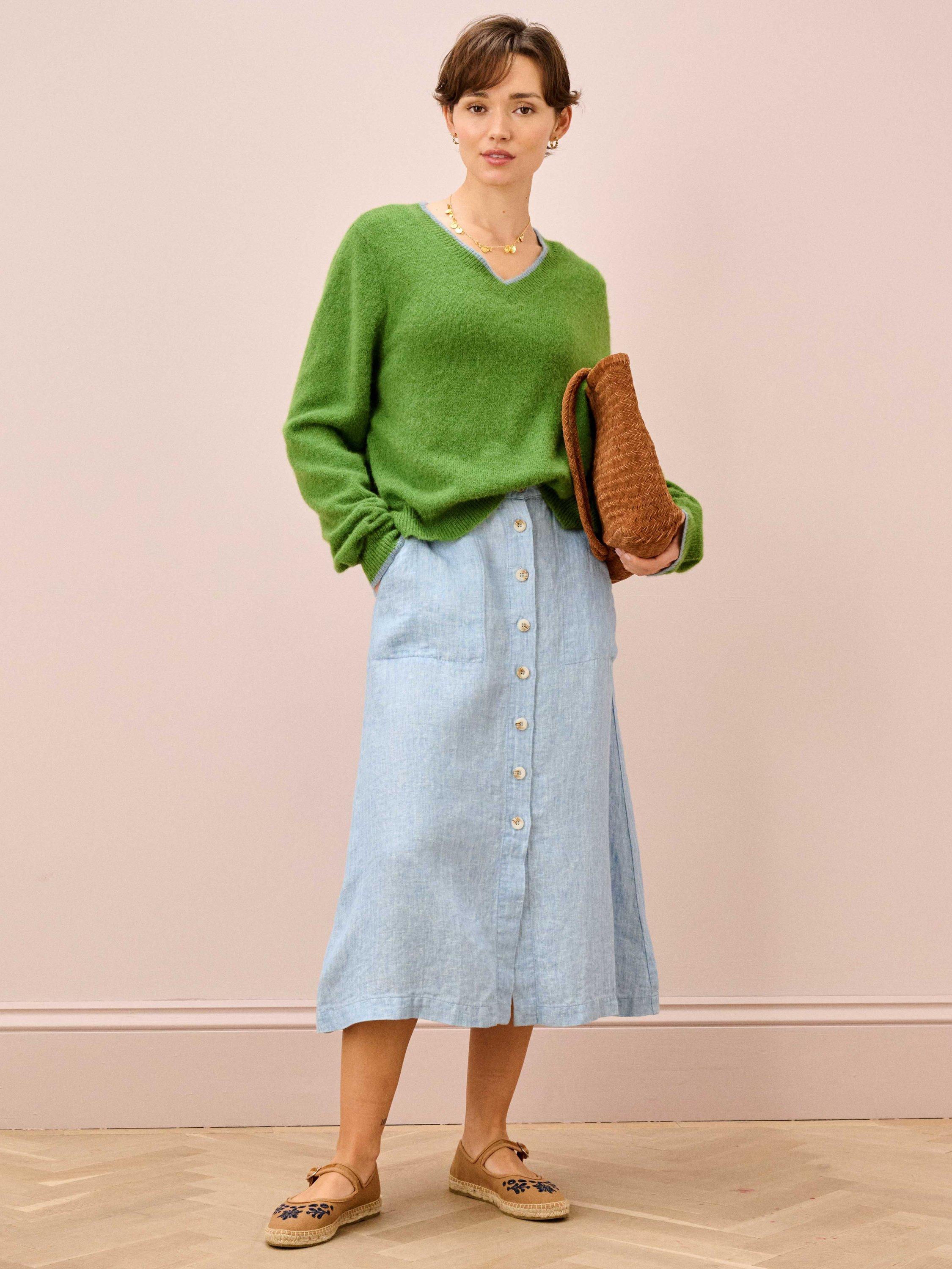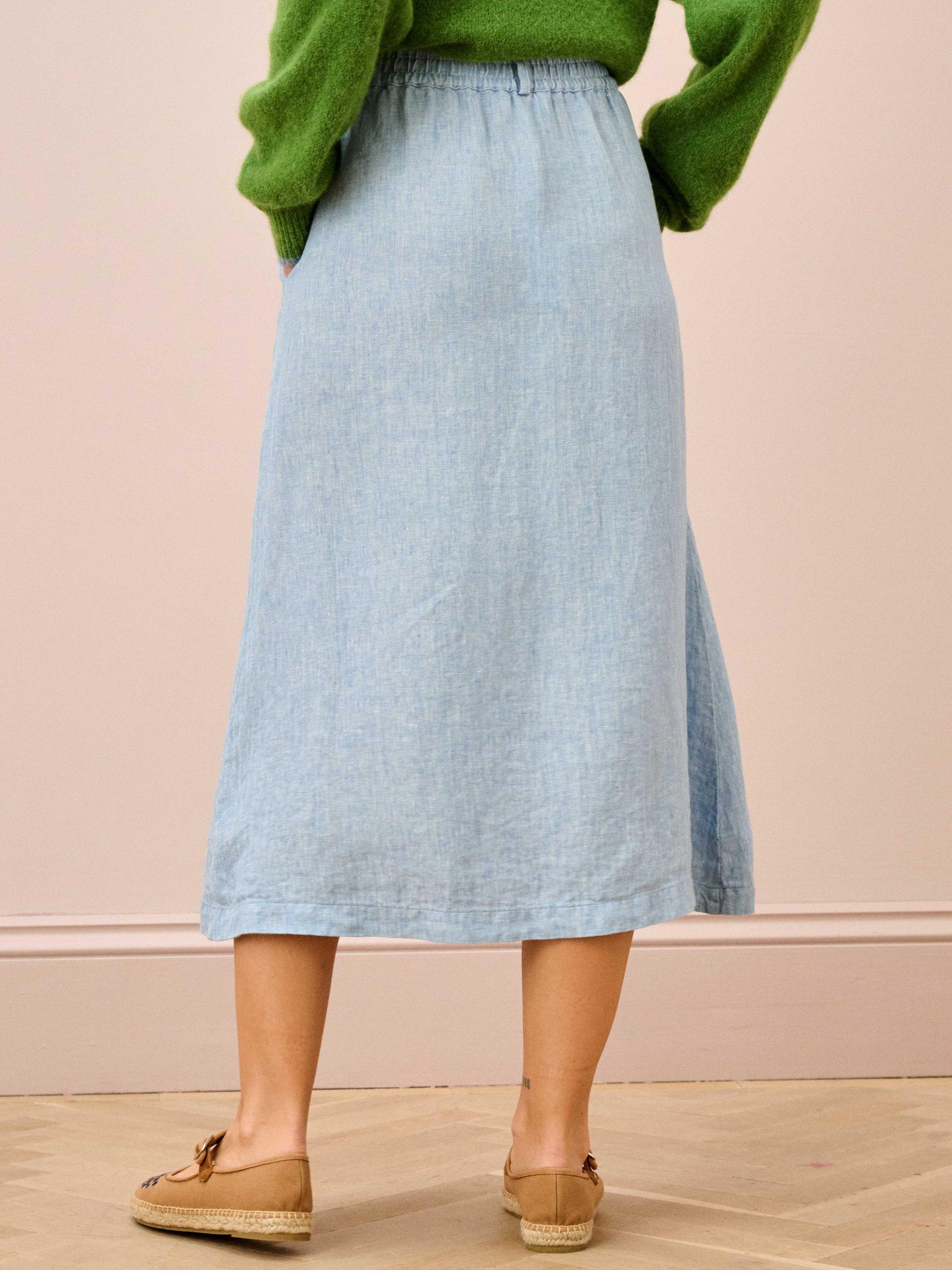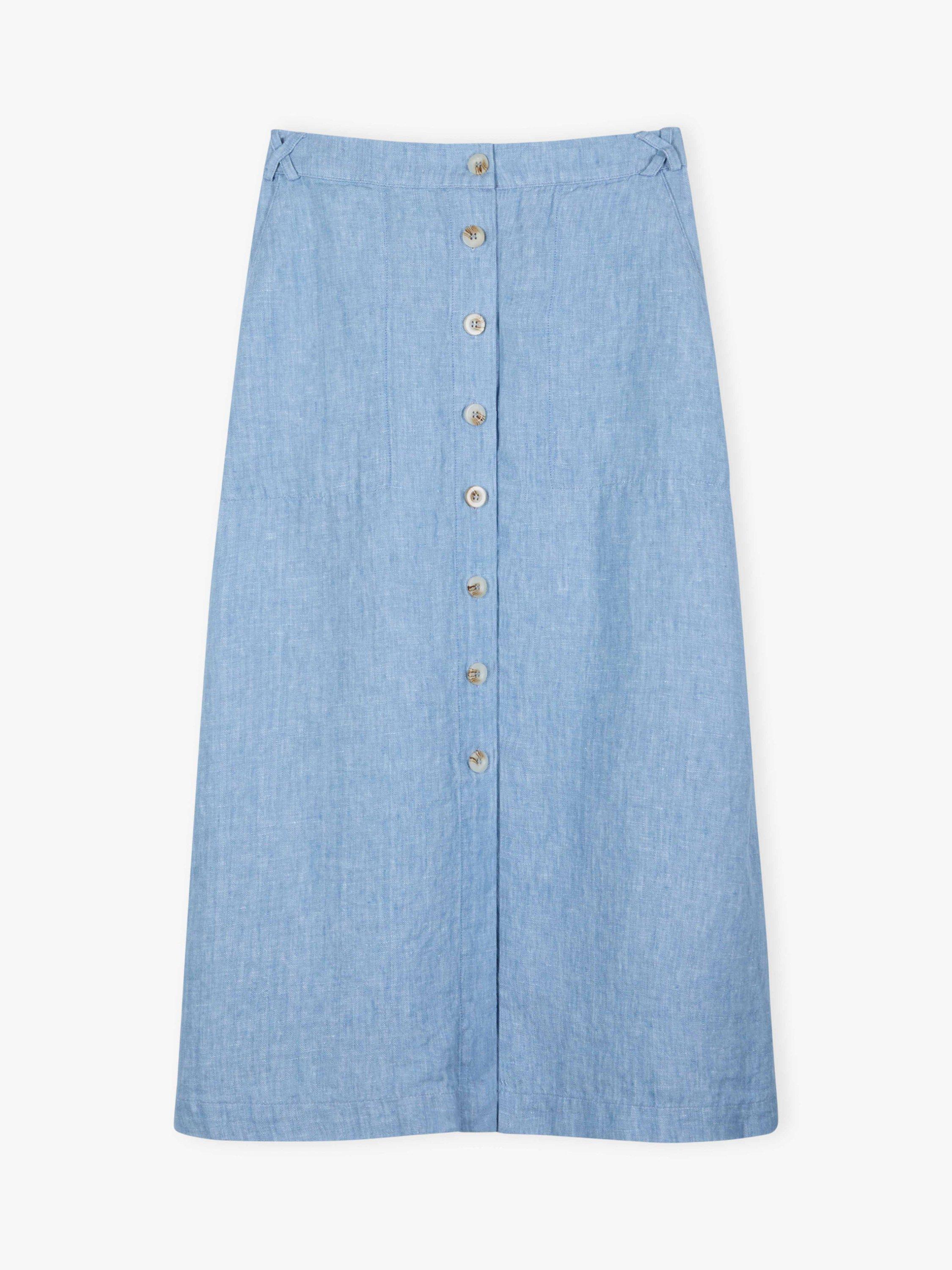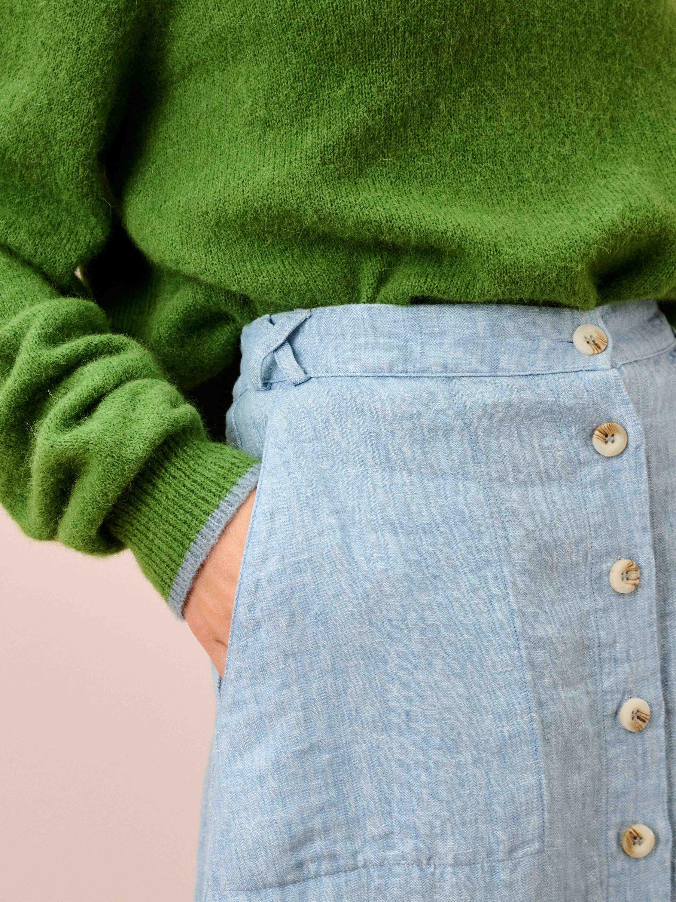 Grown, harvested, spun, dyed, woven and stitched: the entire process of making this button-through skirt has taken place here in Europe using only the finest linen with an appearance that truly rivals denim.