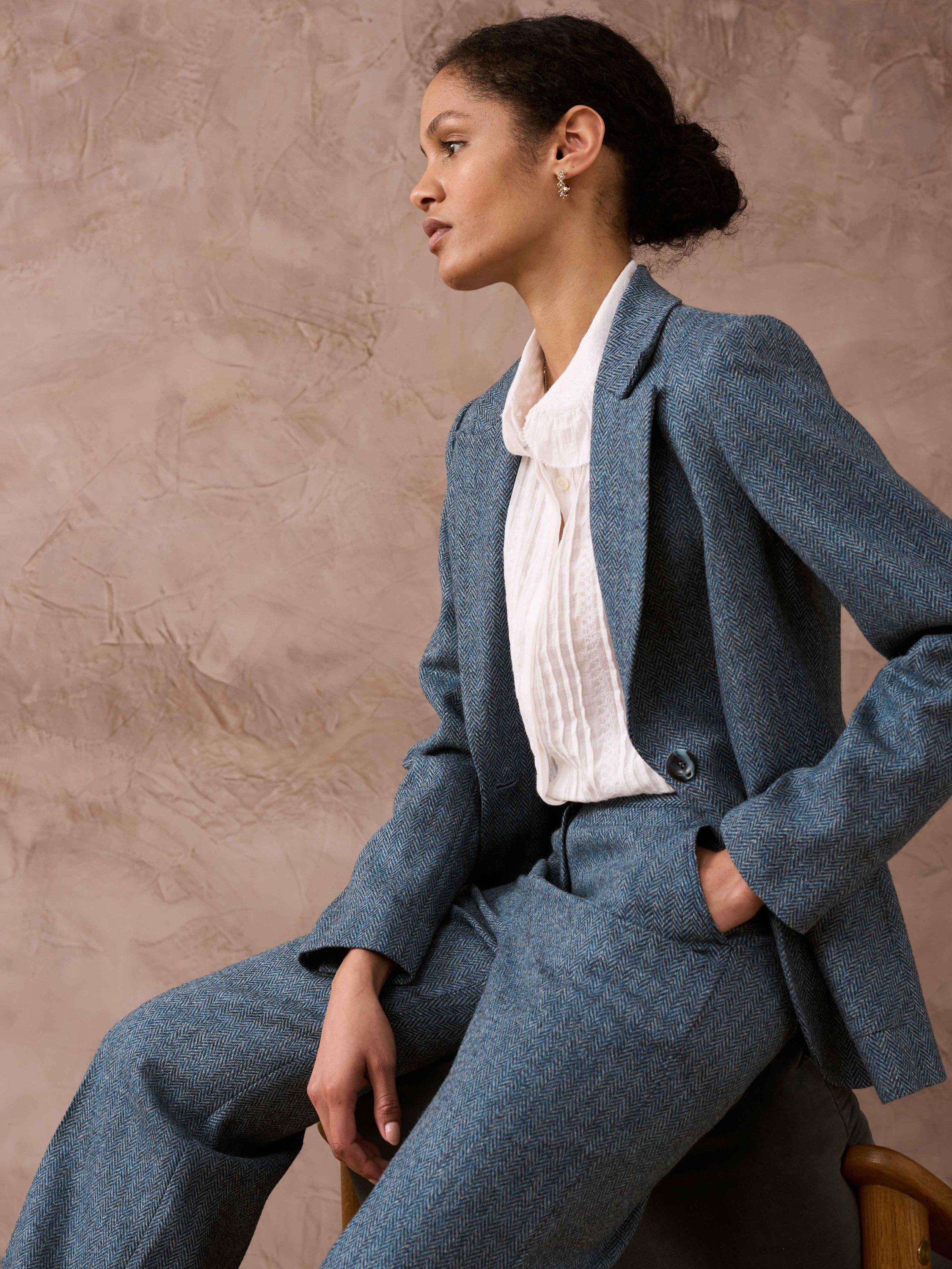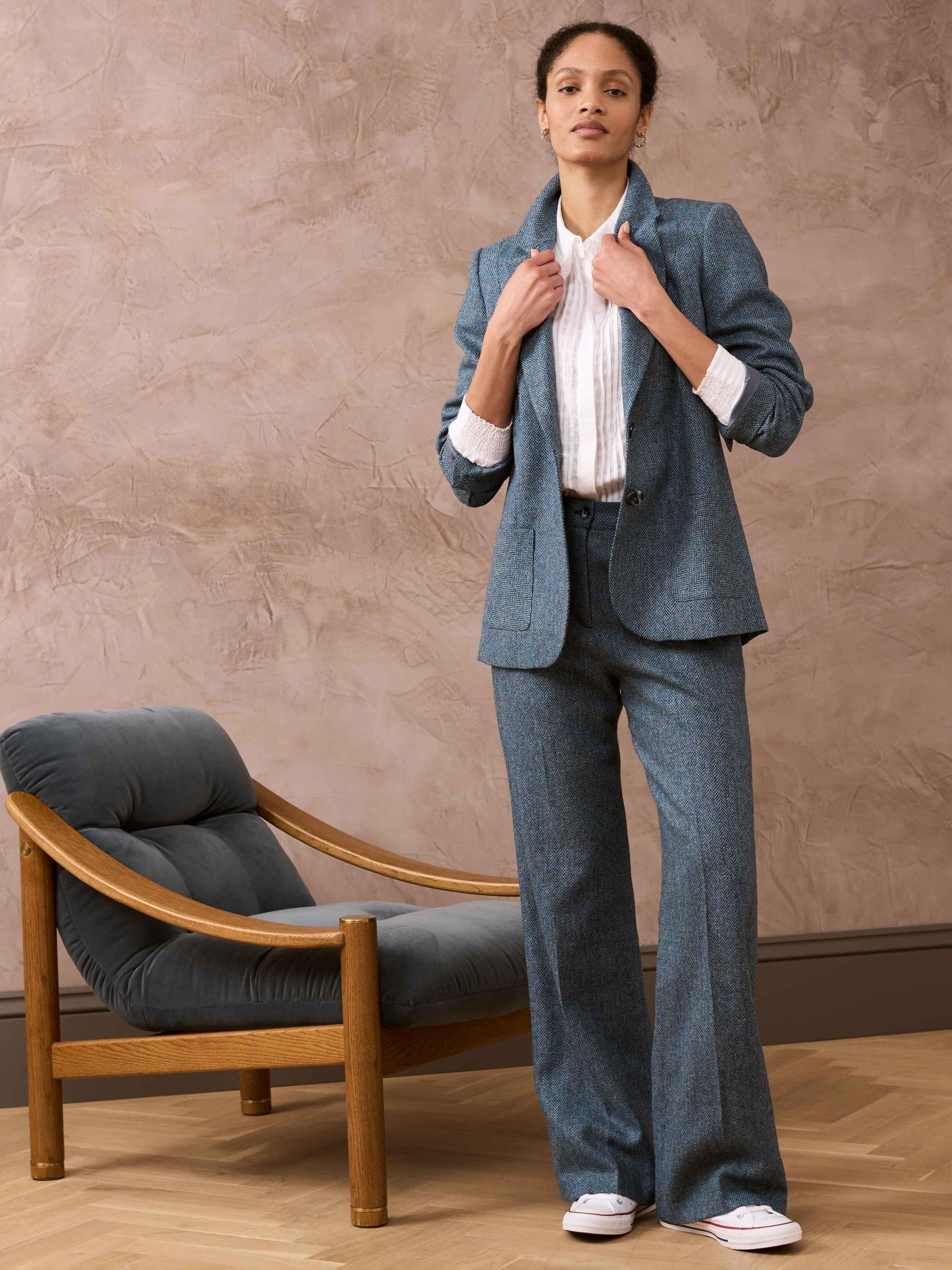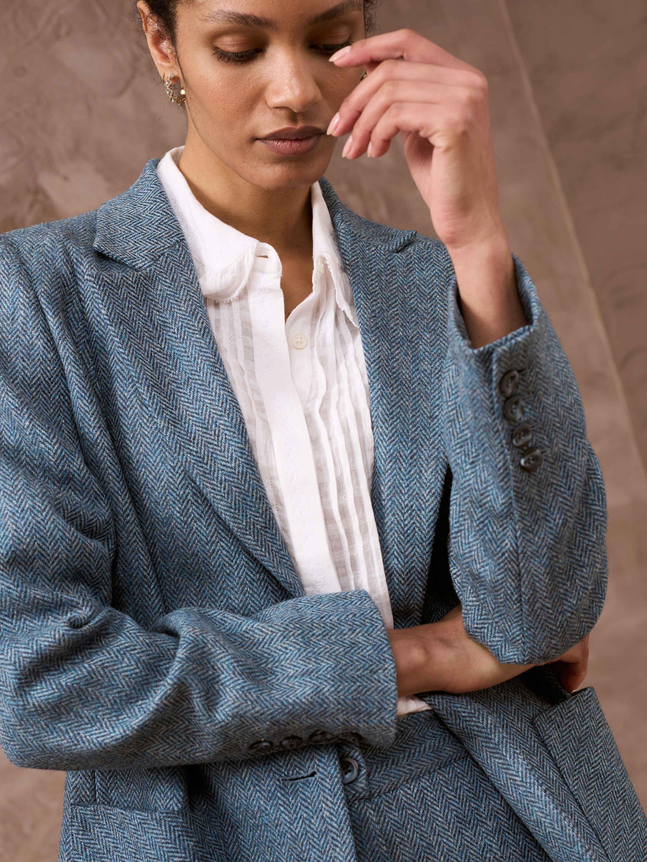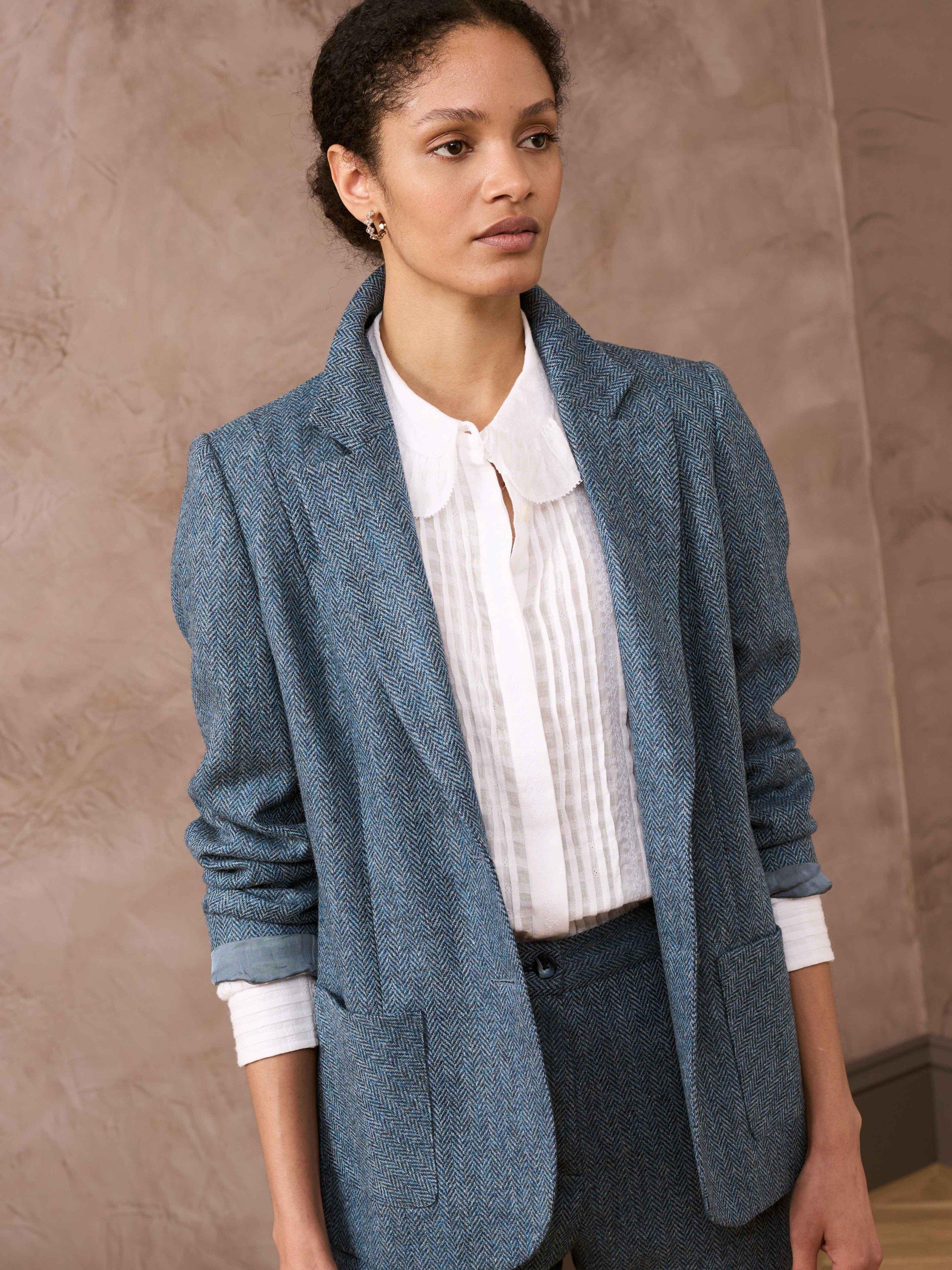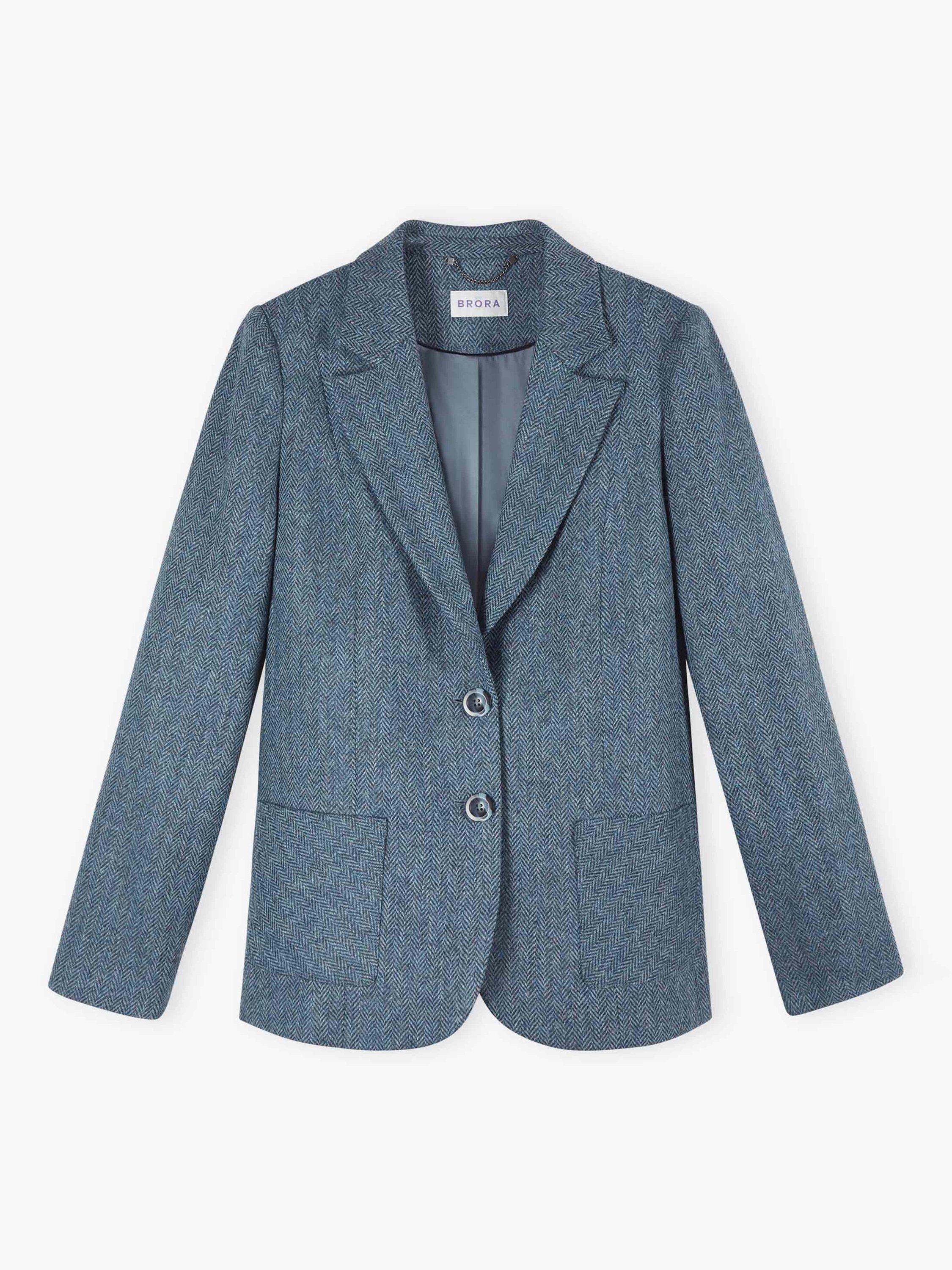 Exclusively made for Brora using a gorgeous herringbone wool cloth woven in Yorkshire, this single-breasted blazer will certainly be a winner this season, featuring a classic shape, updated with an open neckline, buttoned cuffs and patch pockets.