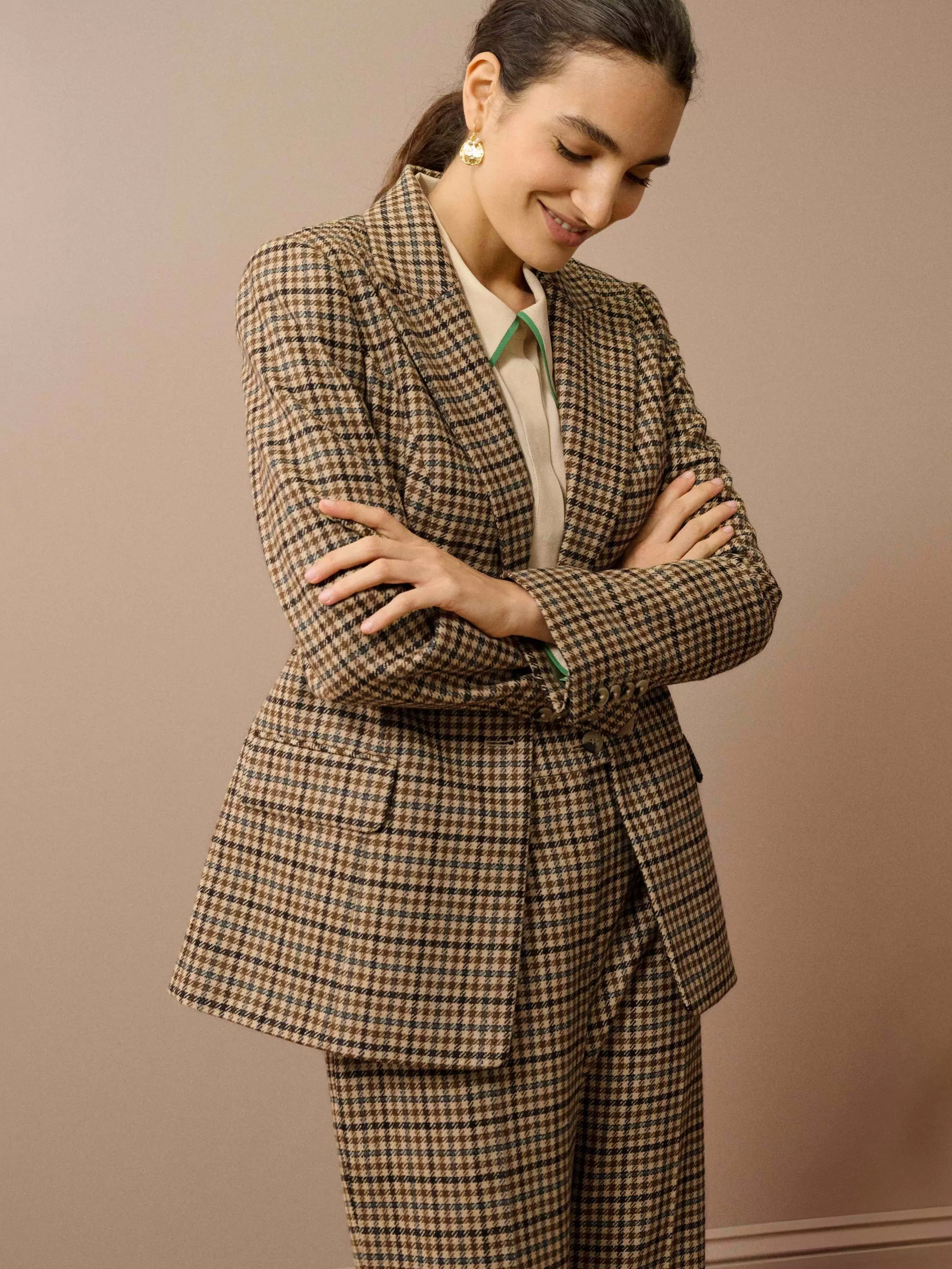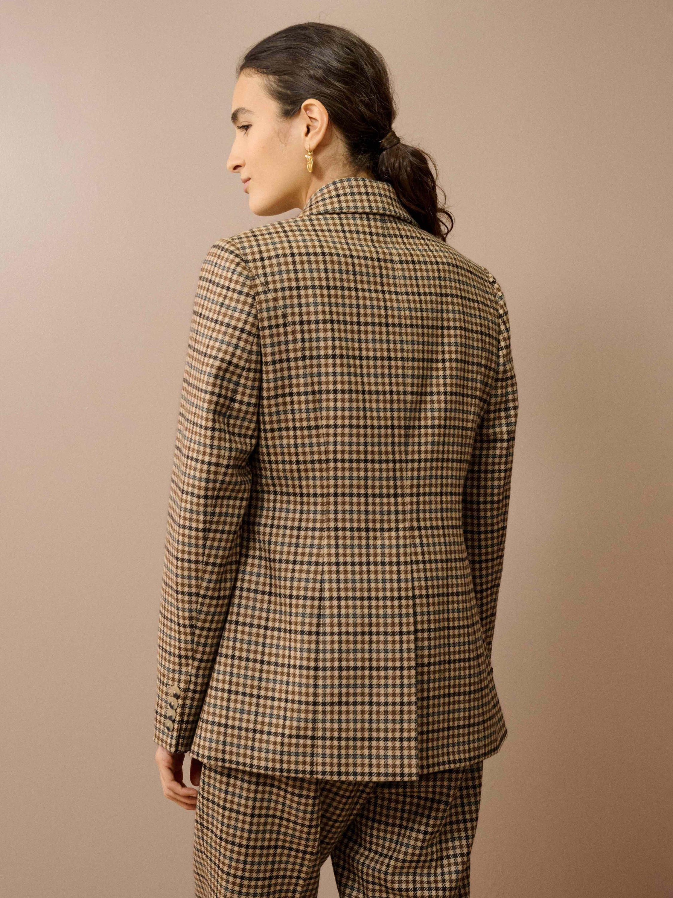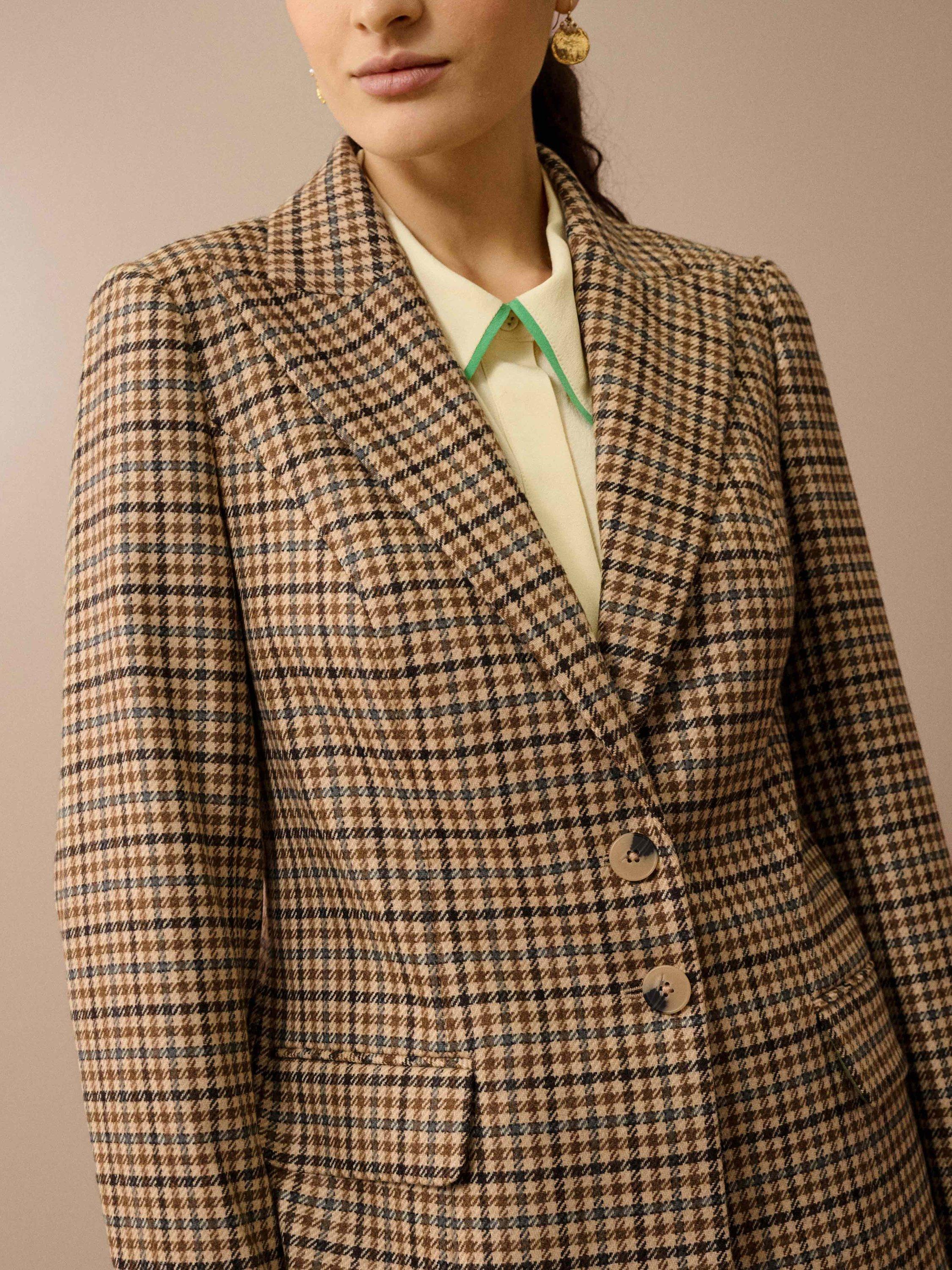 This single-breasted jacket has been made using only the finest Yorkshire-woven wool cloth with a heritage-inspired houndstooth design and meticulously tailored to Clodagh’s taste, taking inspiration from 1970s tweed suits.