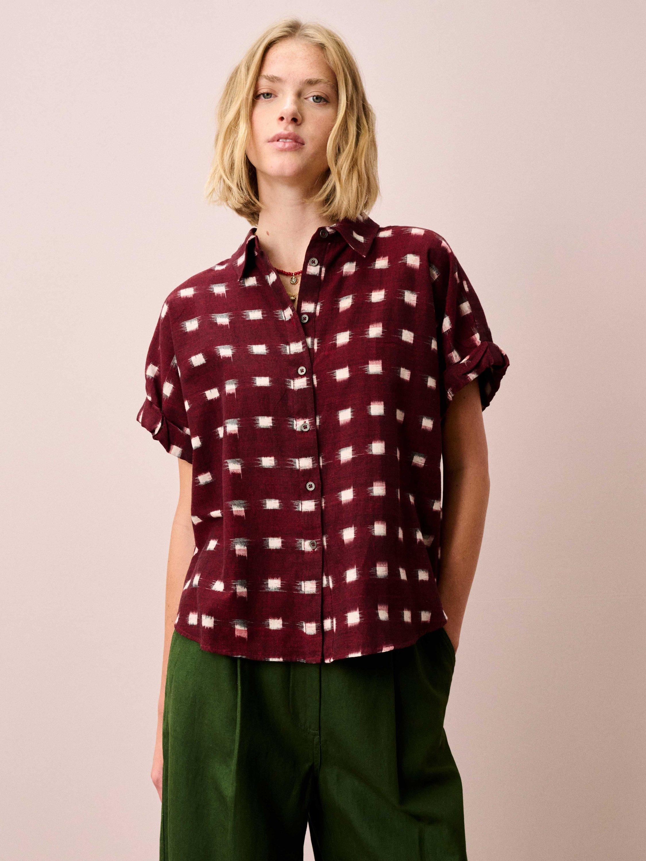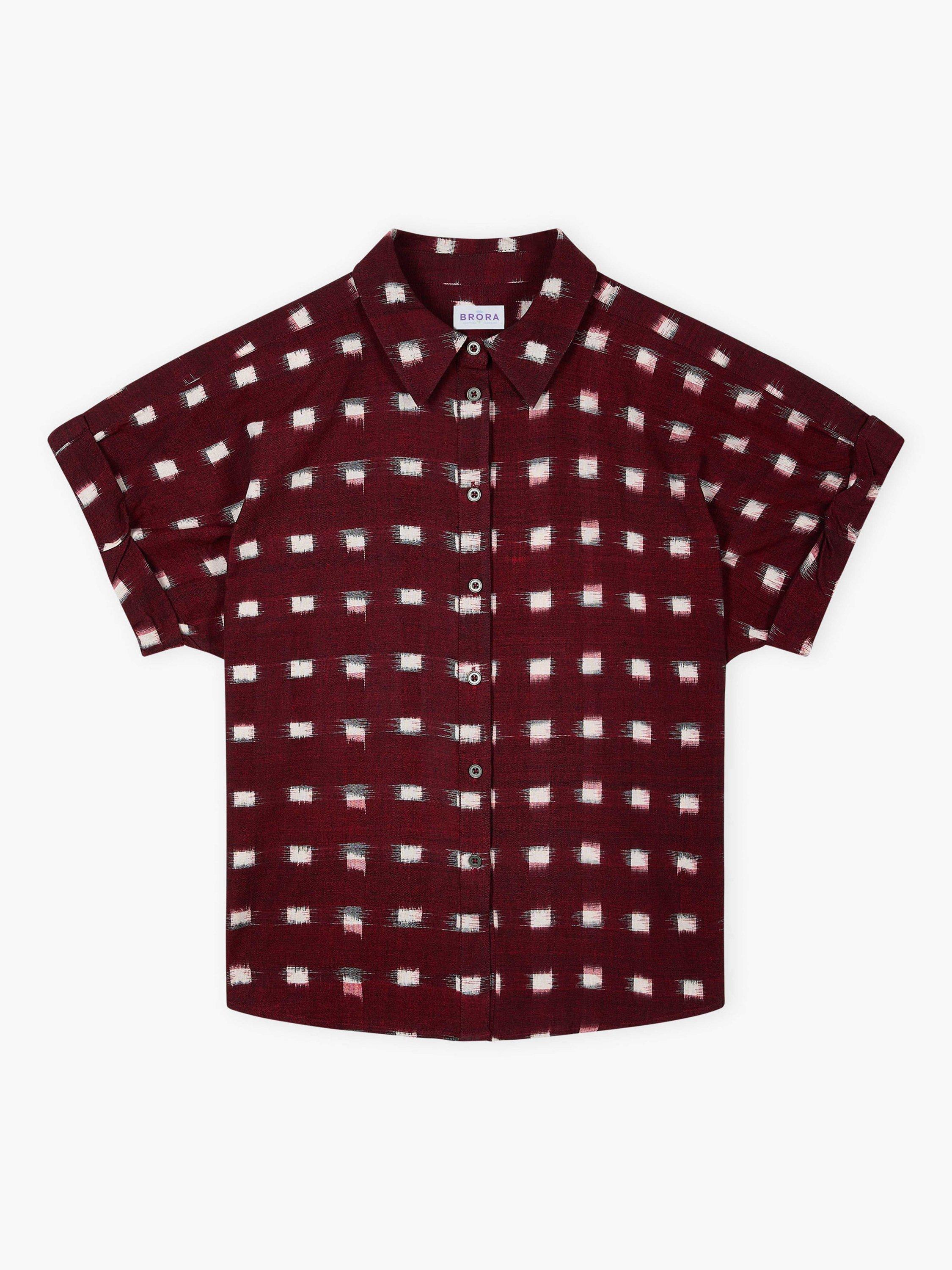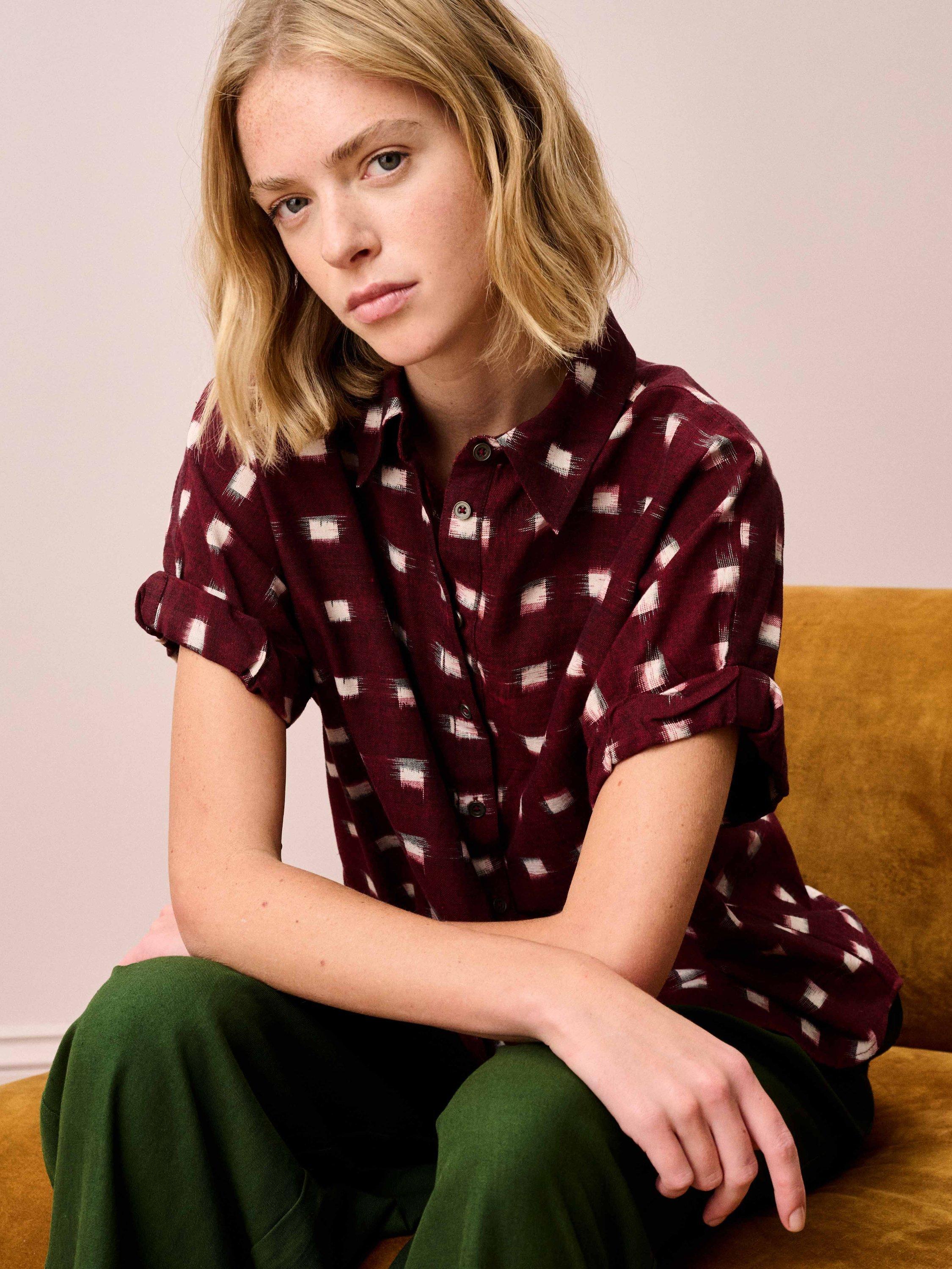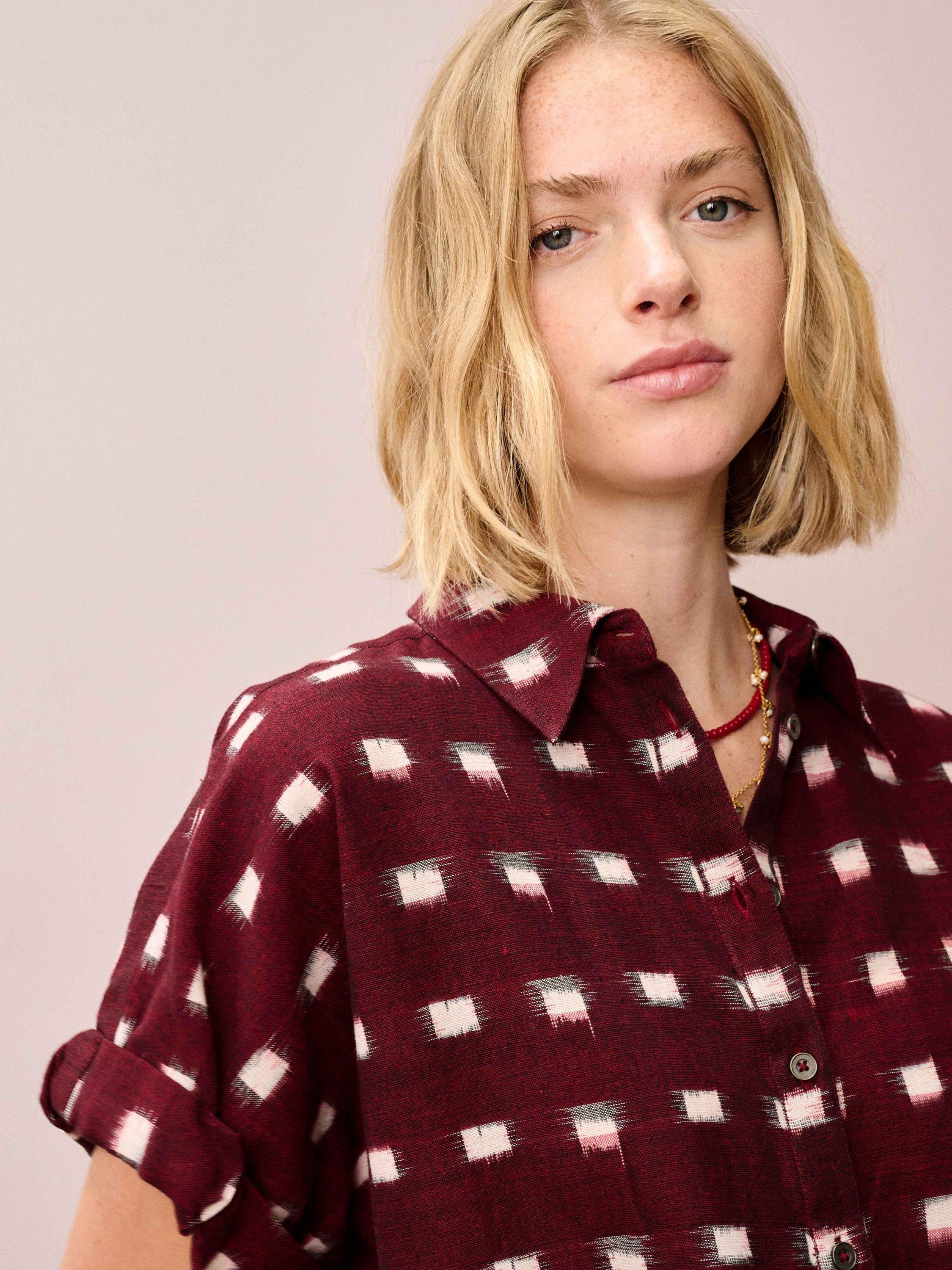 This fresh twist on a utility shirt features rolled-hem sleeves, small metal buttons and a chic pointed collar, made from pure cotton woven with an ikat motif, making each piece unique.