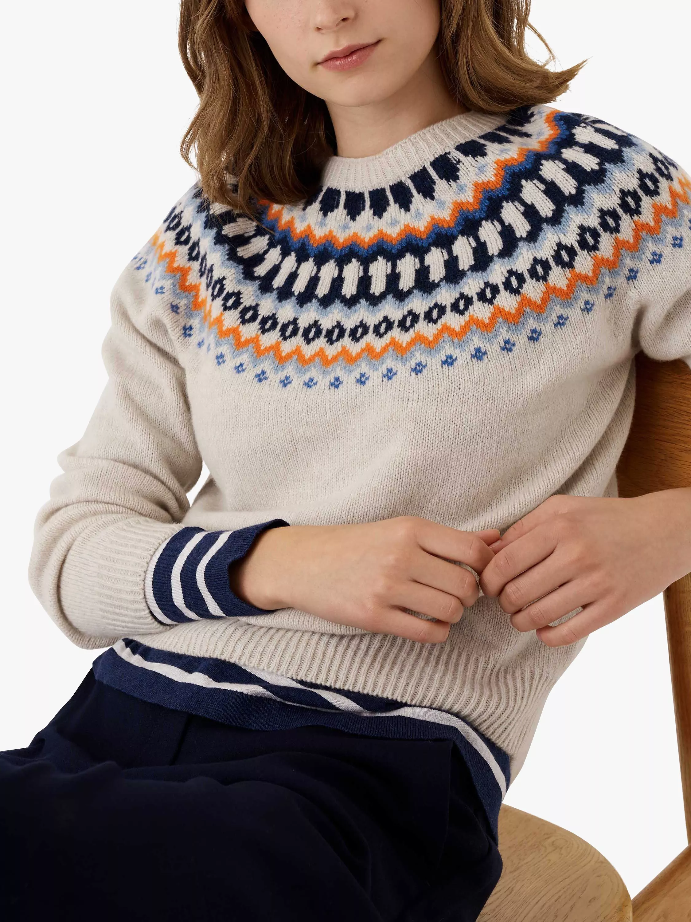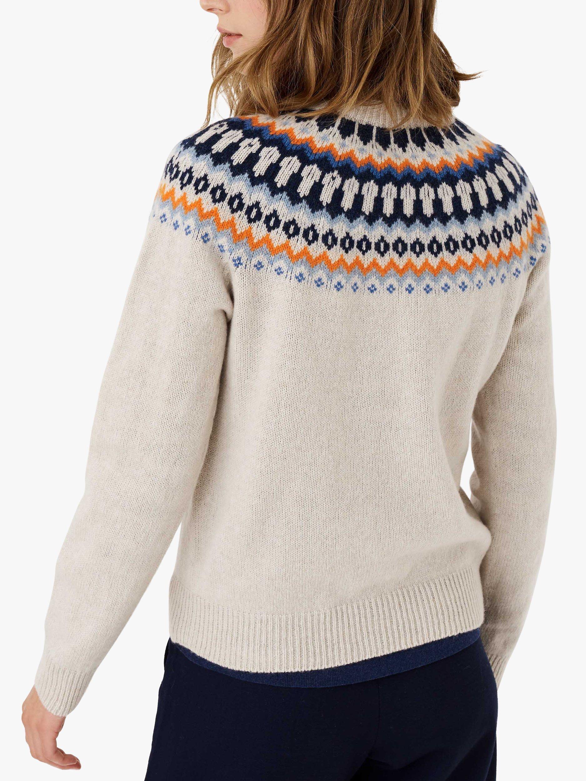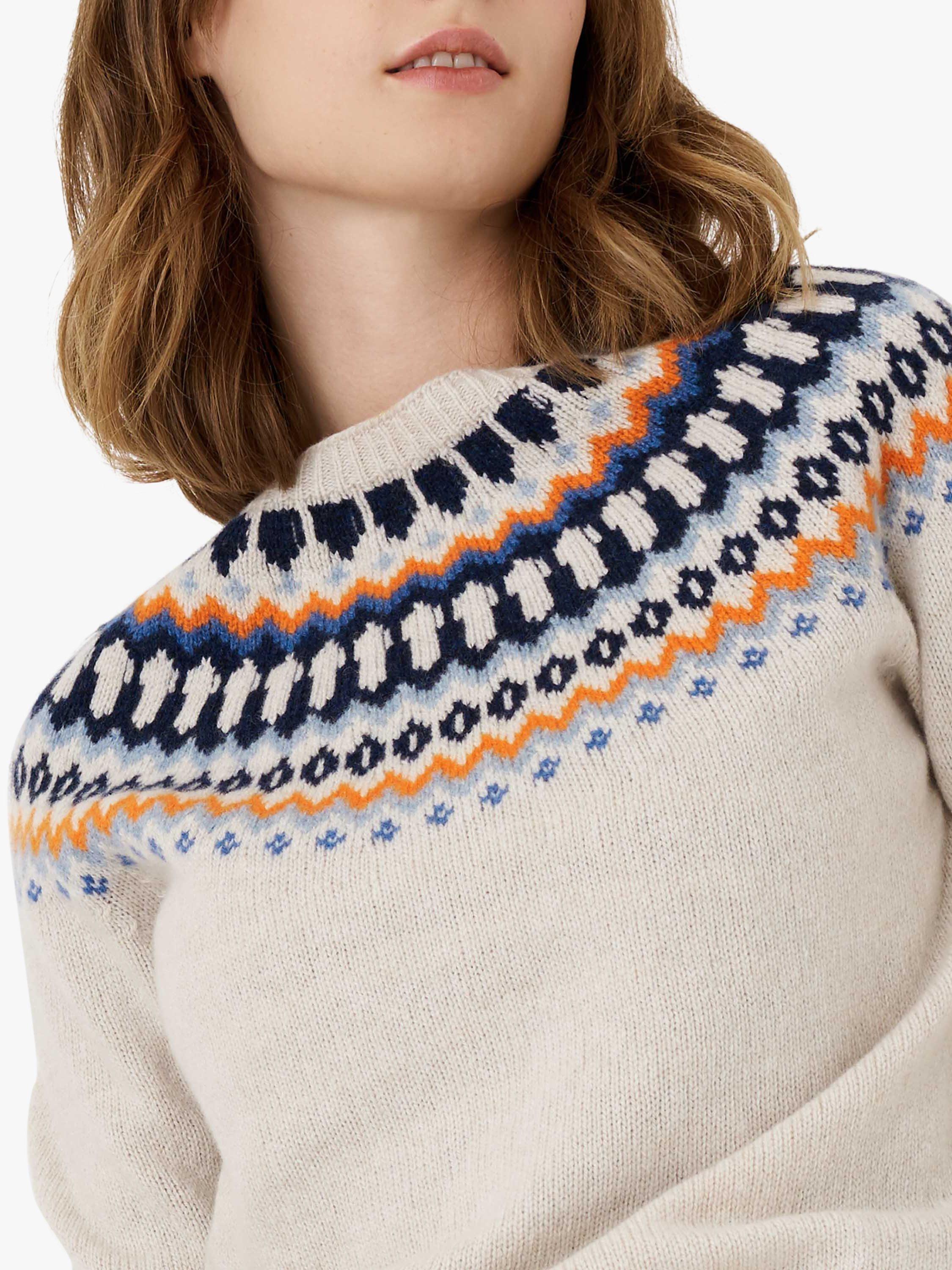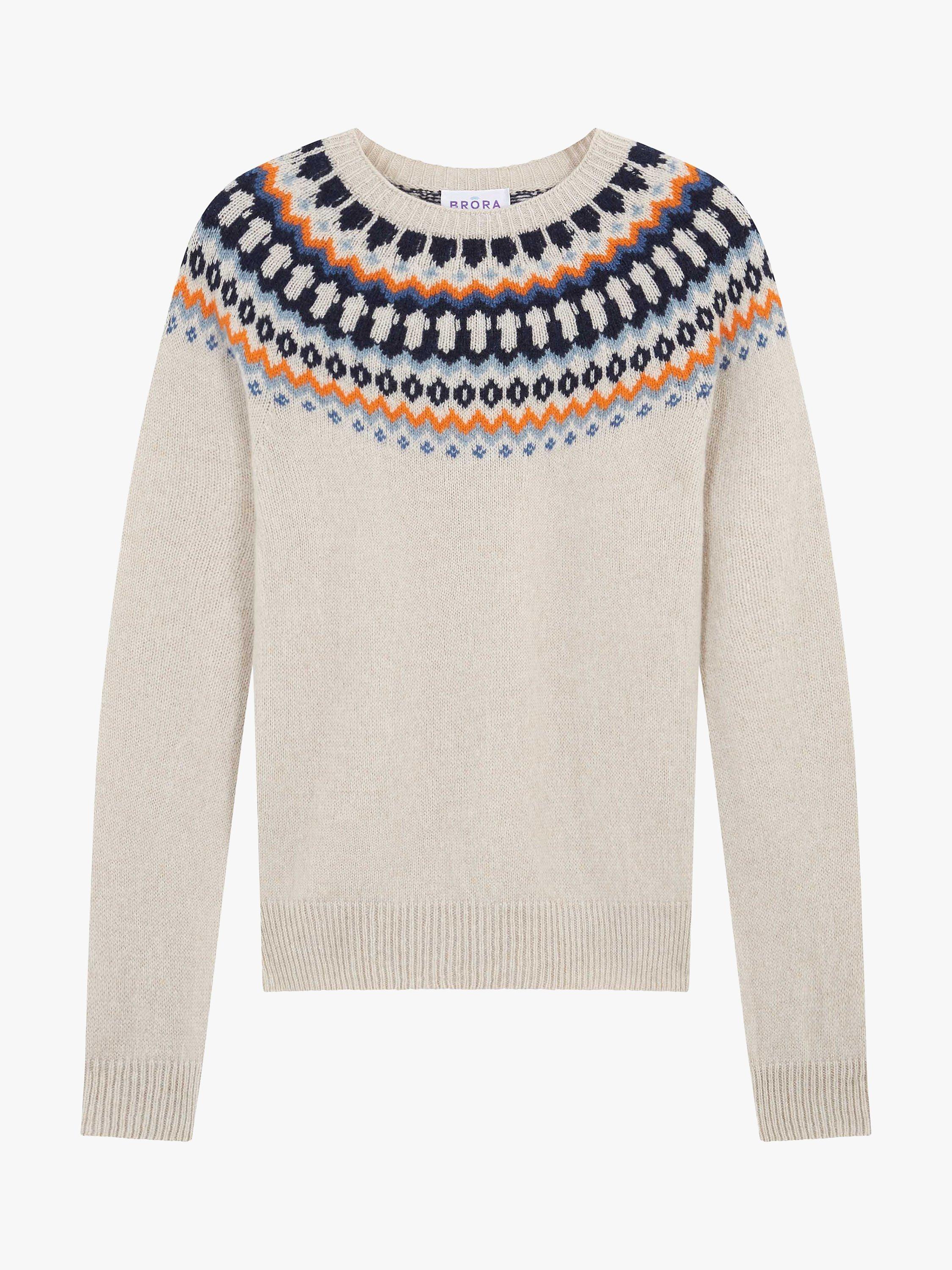 Shaped at the neck by a classic crew, this jumper by Brora comes in the label's signature Fair Isle print and is made from pure wool for a luxe warm handle.
