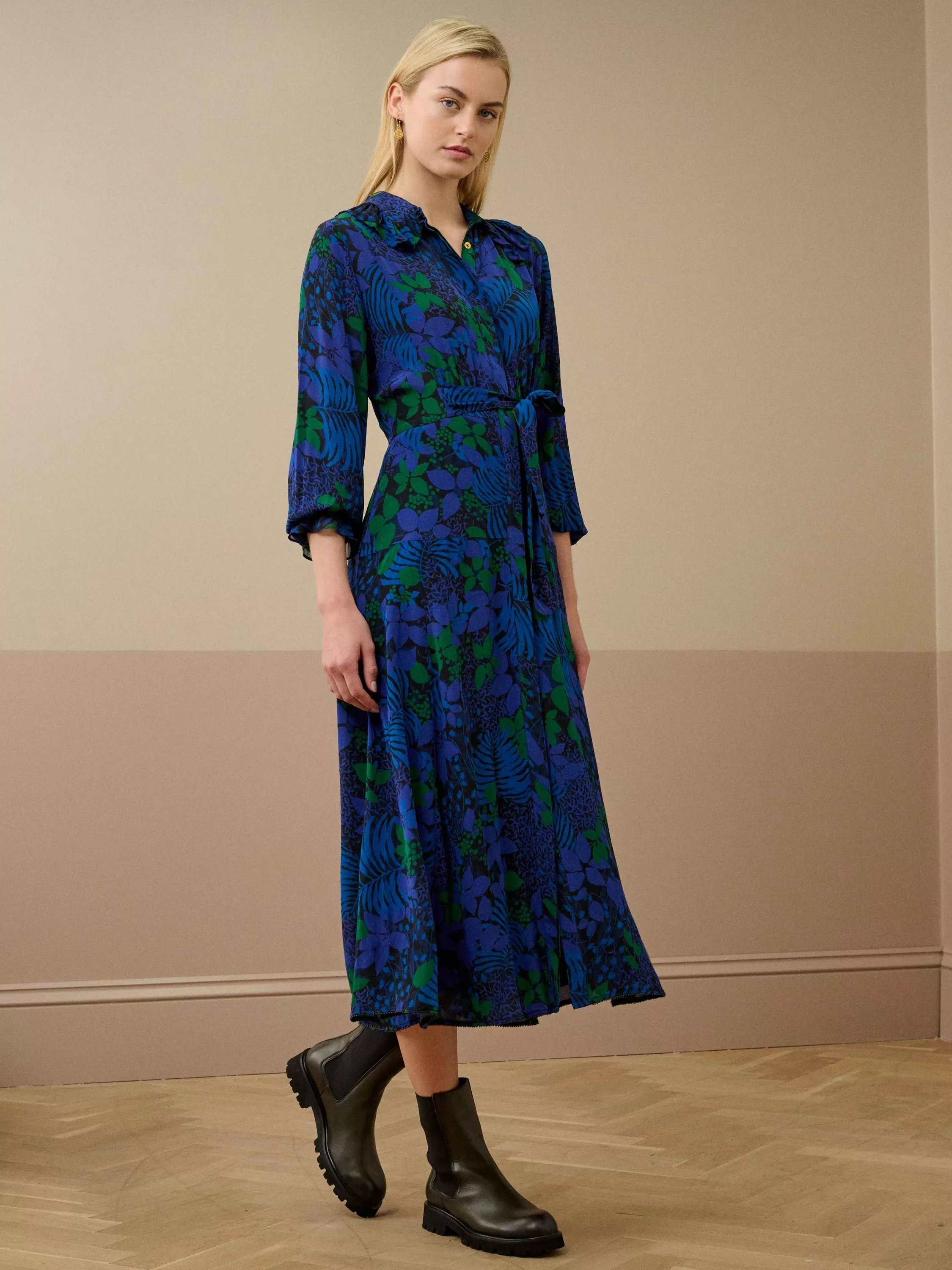 This dress style will certainly turn heads. Featuring a striking botanical pattern, a flattering belted waist, a copper-beaded hemline, elasticated cuffs and a large frill collar with an exposed metal top button.