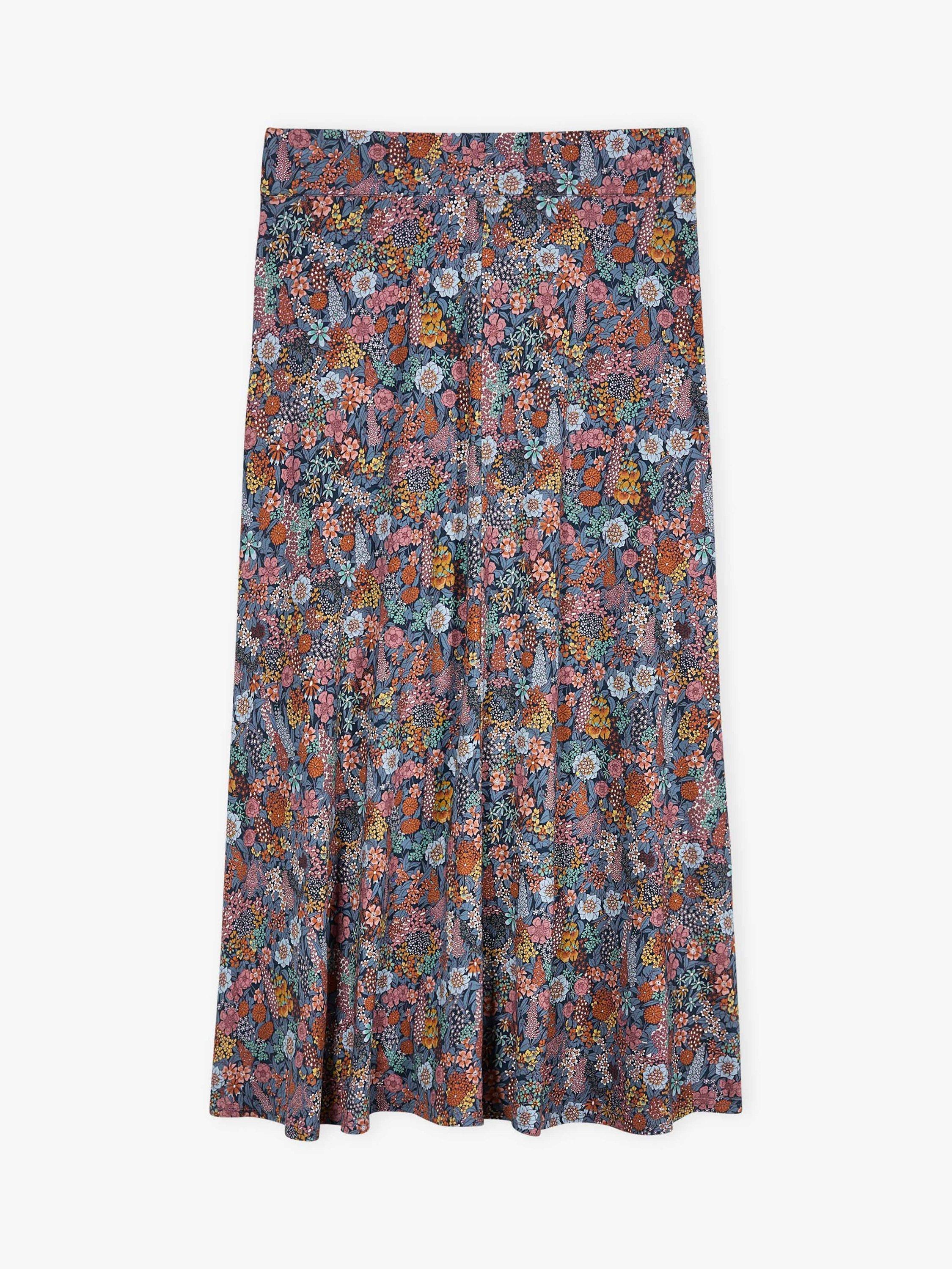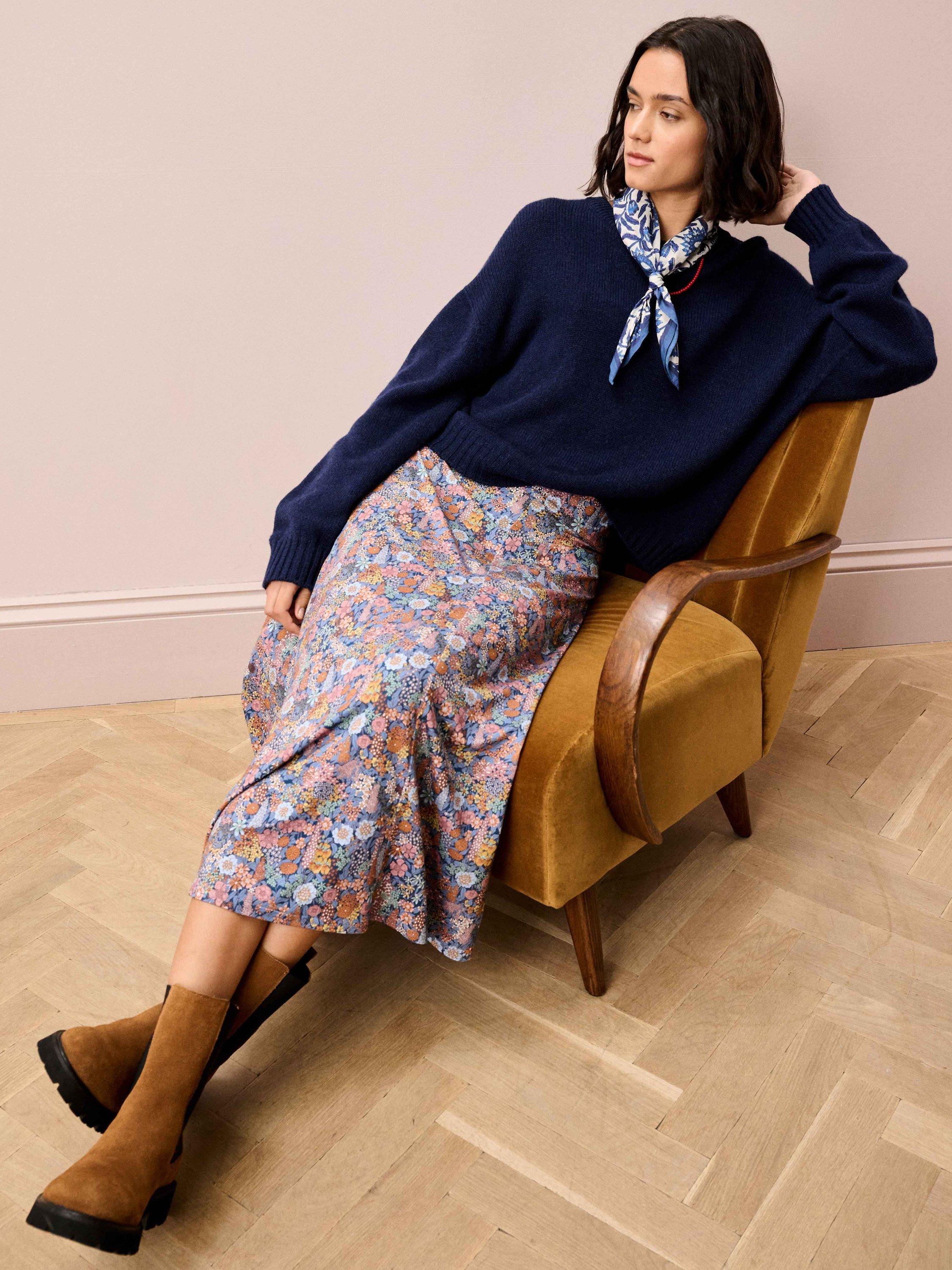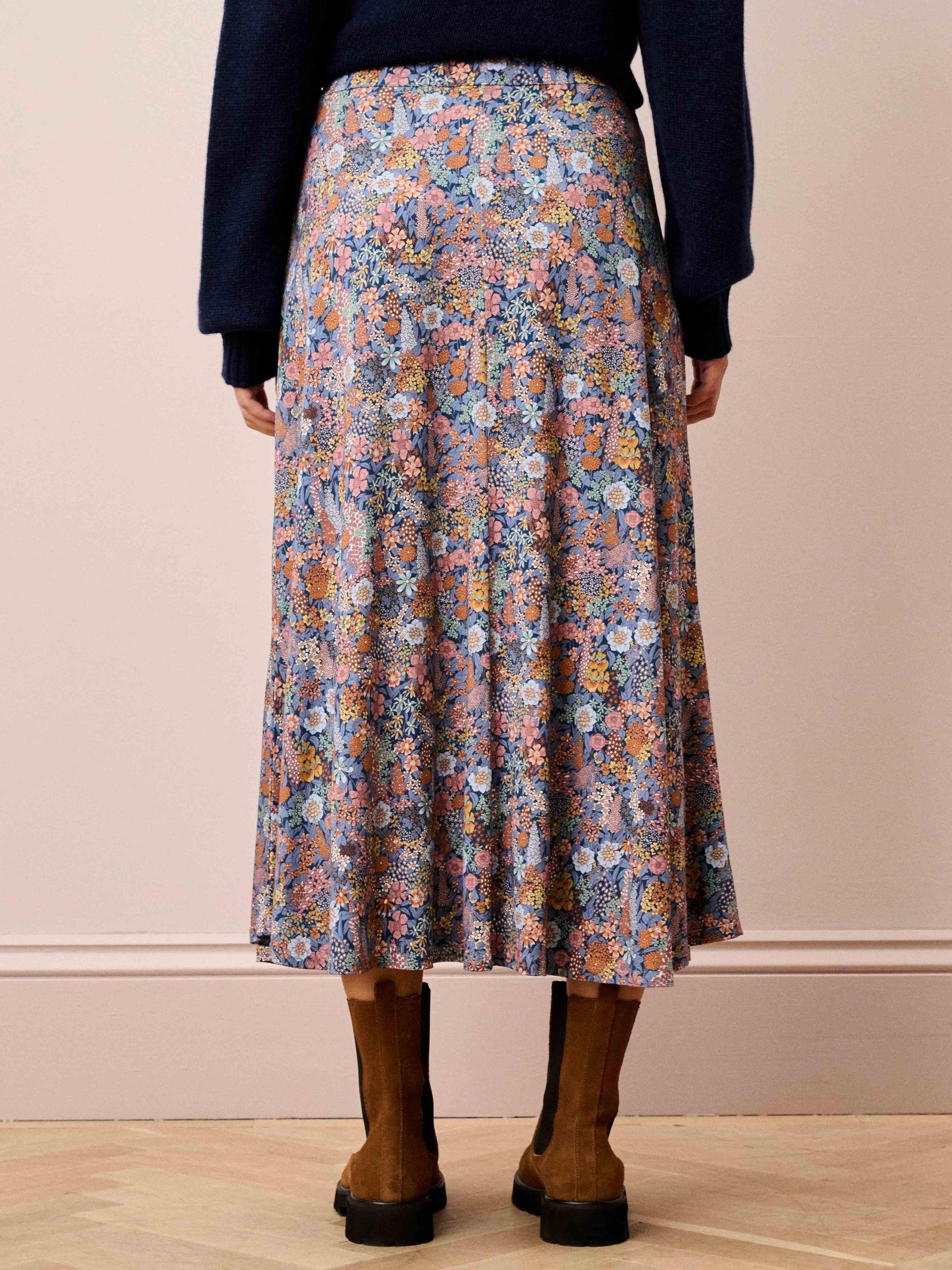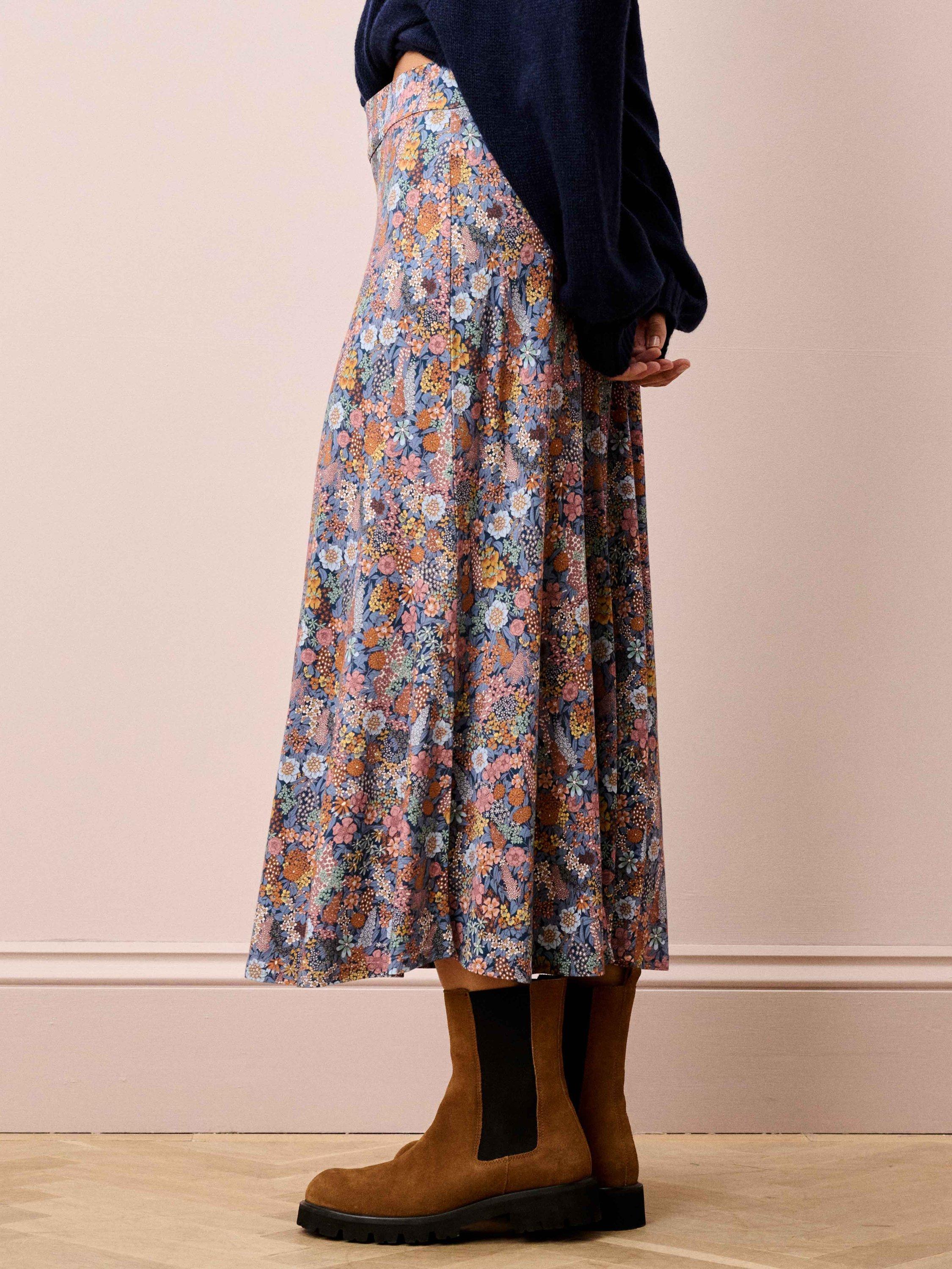 Made by talented local seamsters in Leicestershire, England, this jersey midi skirt is a firm favourite due to its winning fit-and-flare shape, beautiful drape, fitted waistline, and striking seasonal Liberty Print.