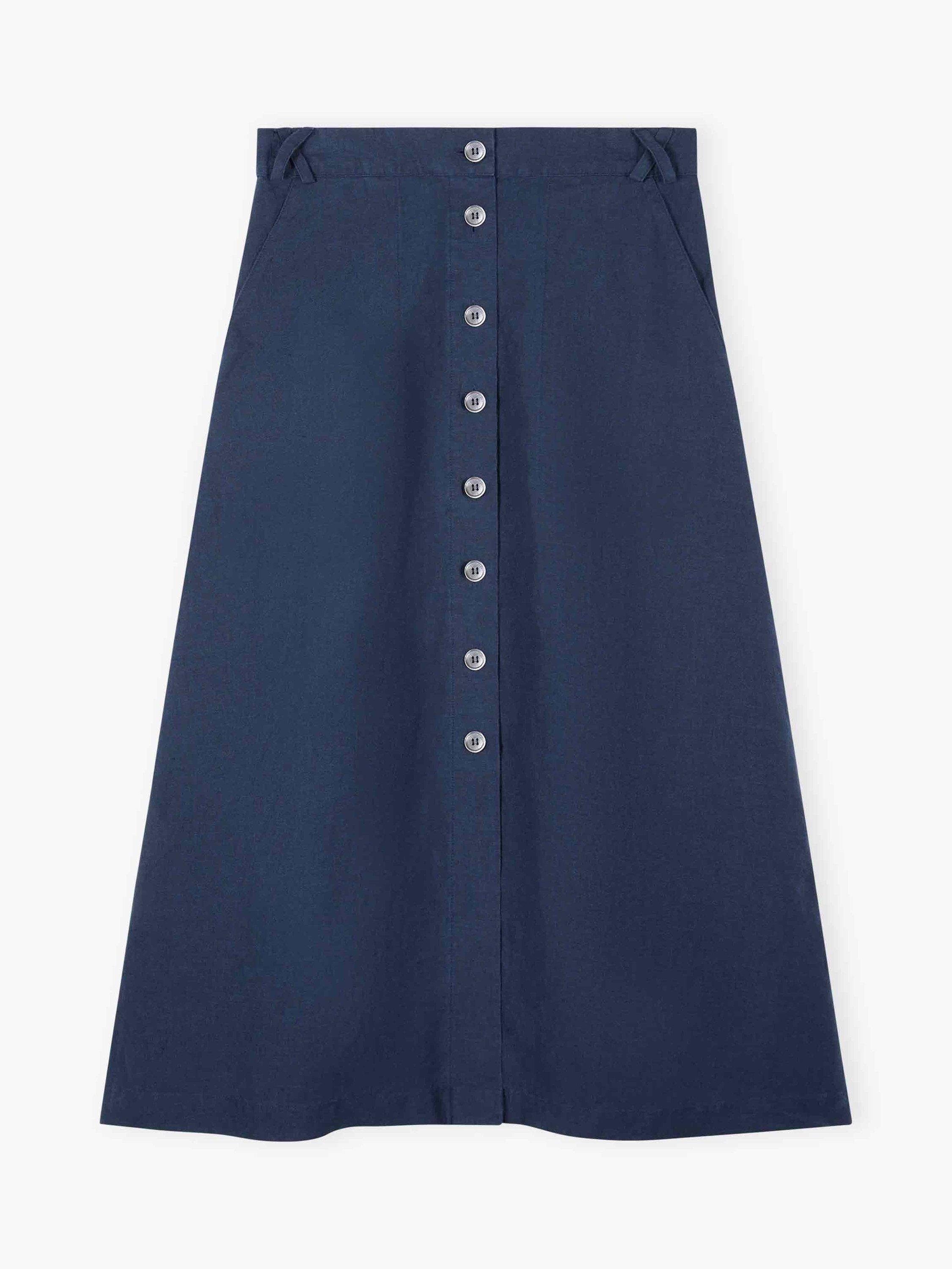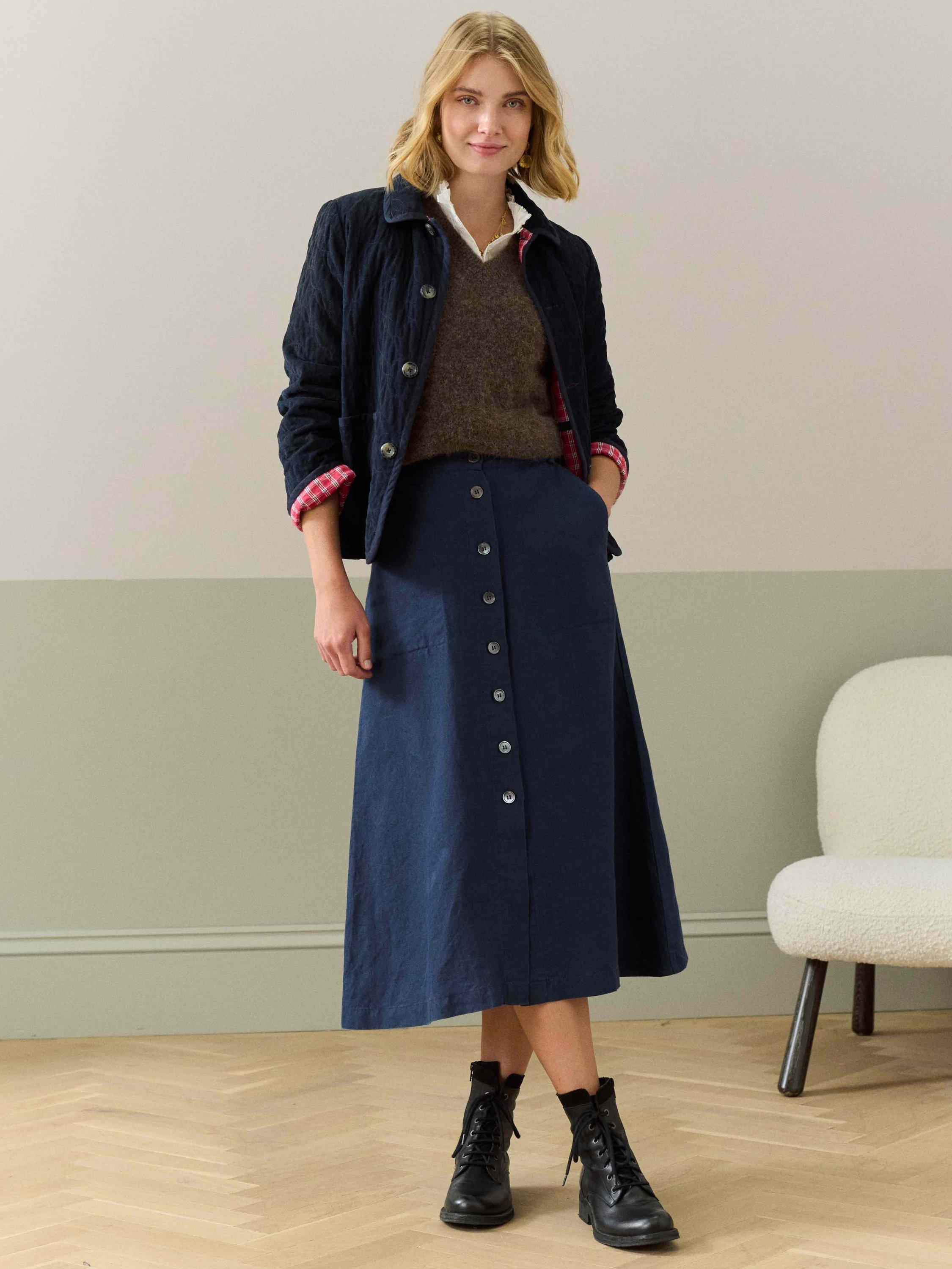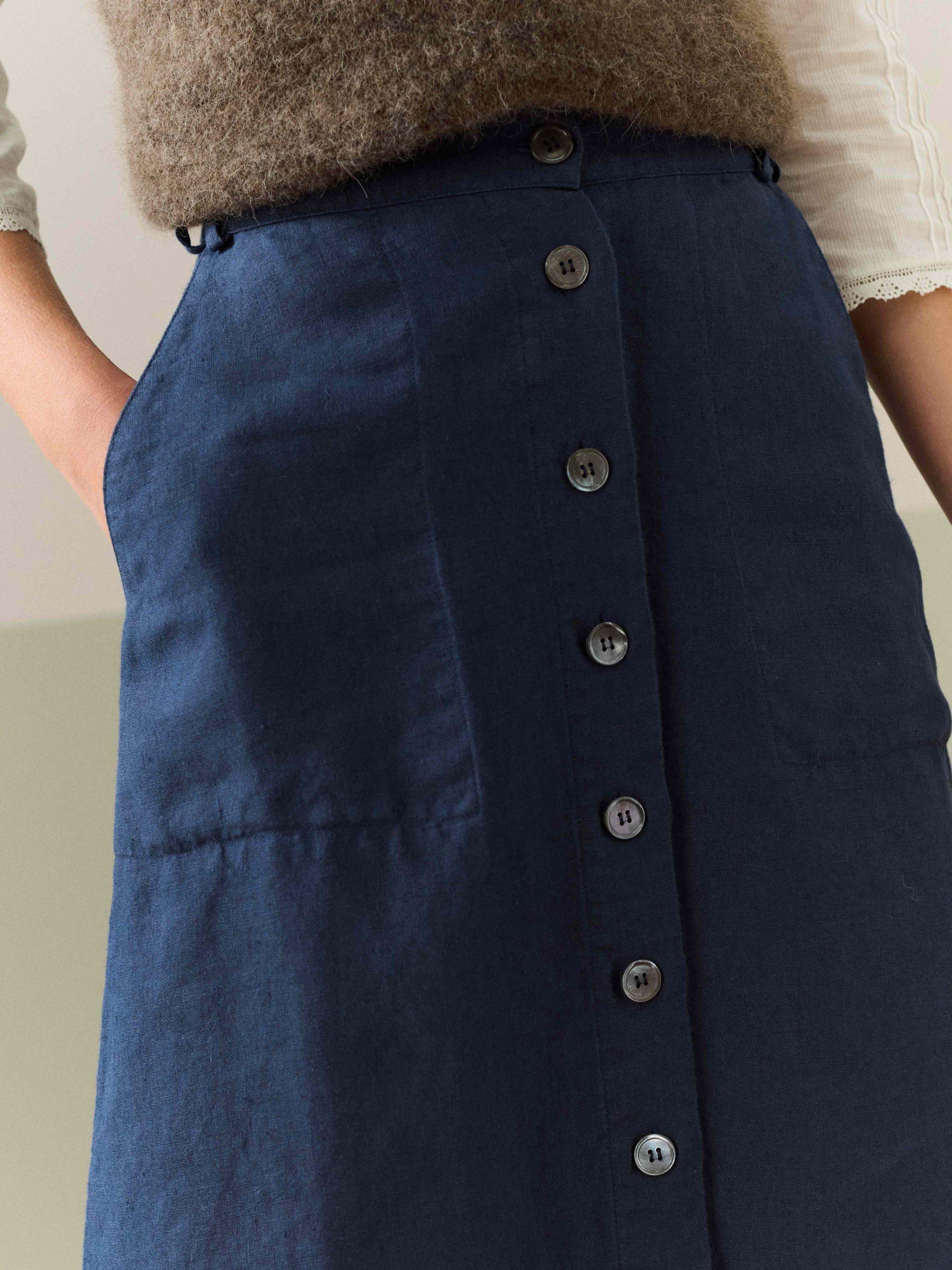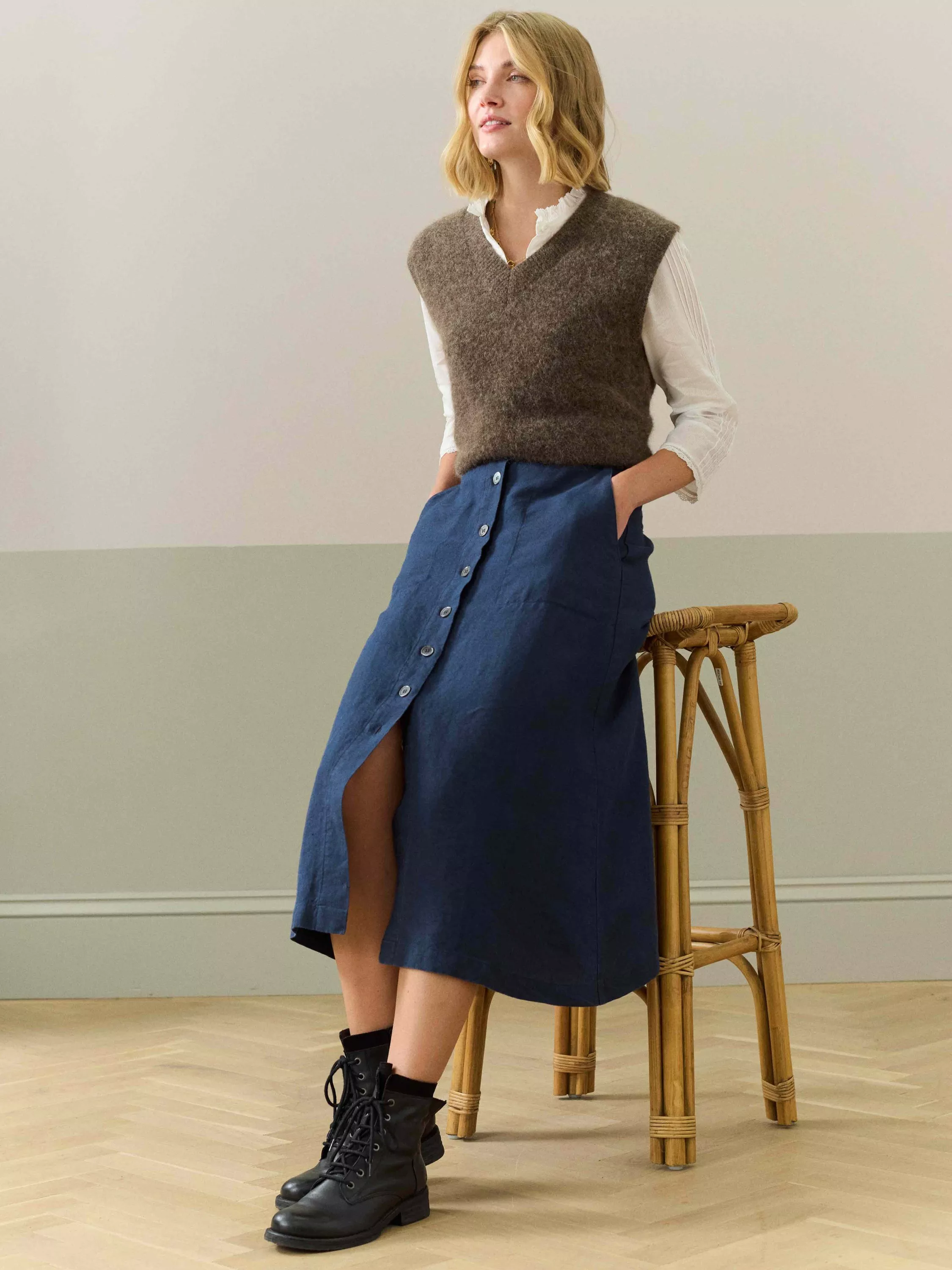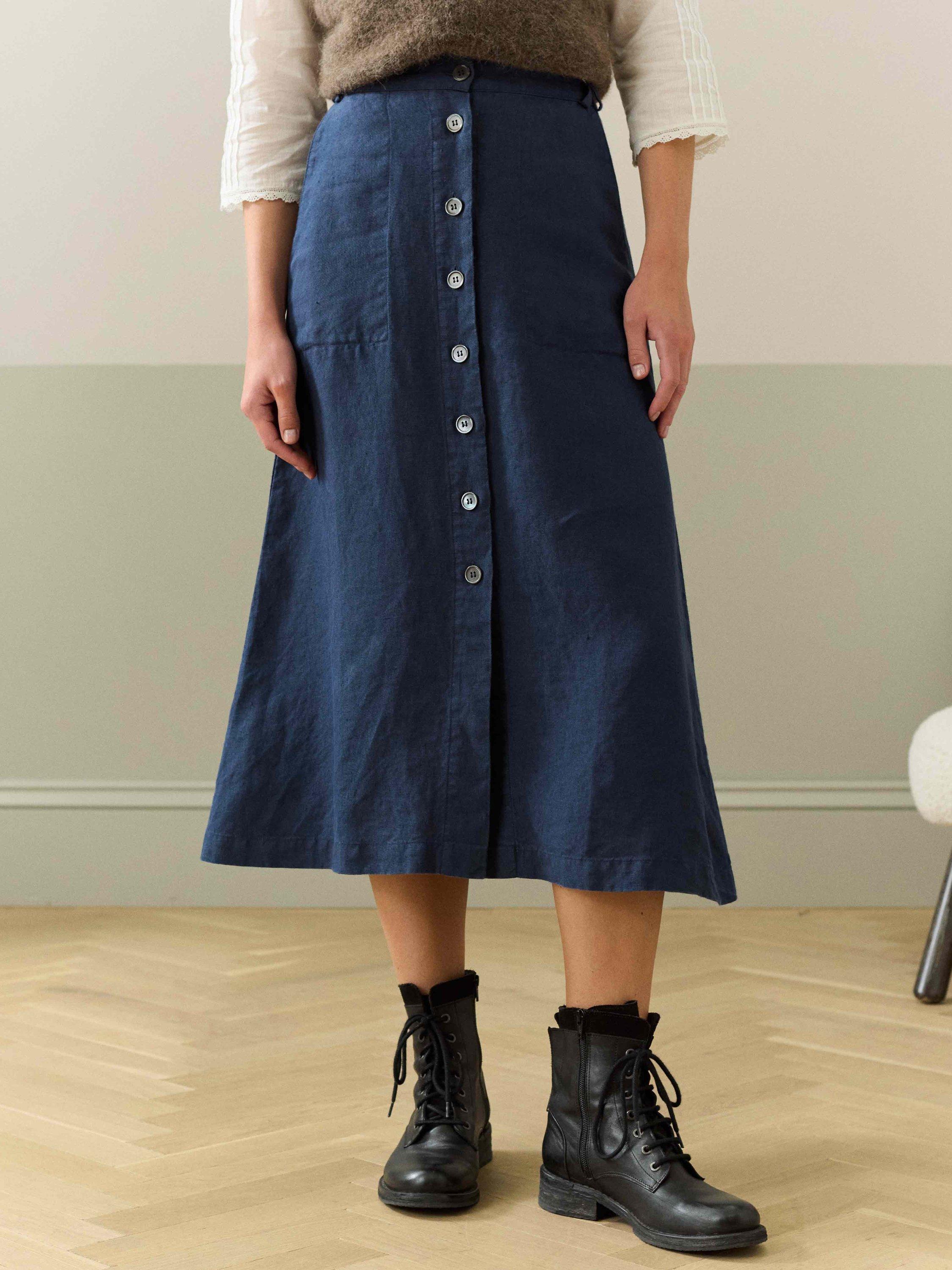Made from start to finish in Europe, this button-through linen skirt from Brora features a classic A-line shape, functional pockets, belt loops and an easy, part-elasticated waist, destined to be a winner.