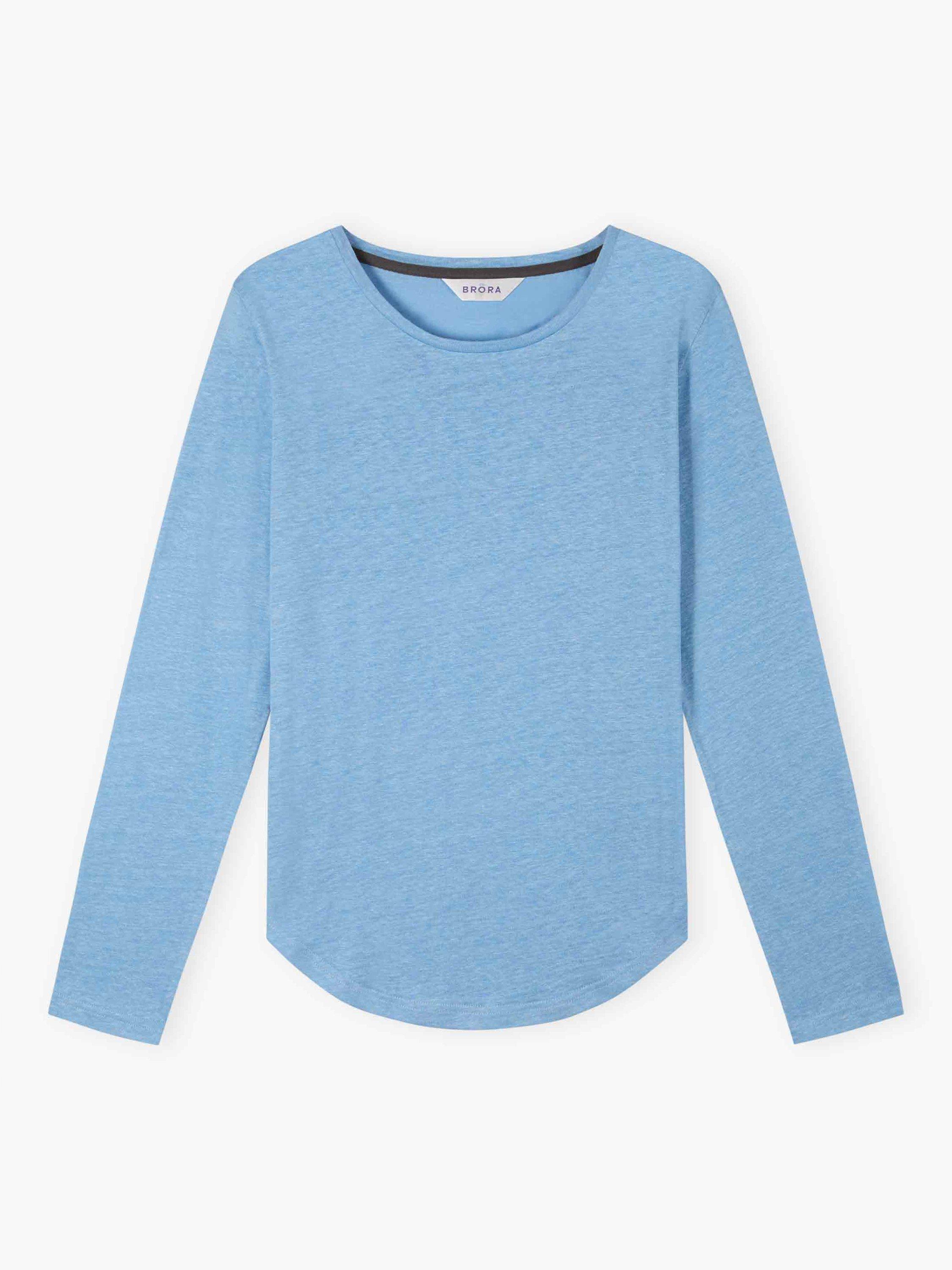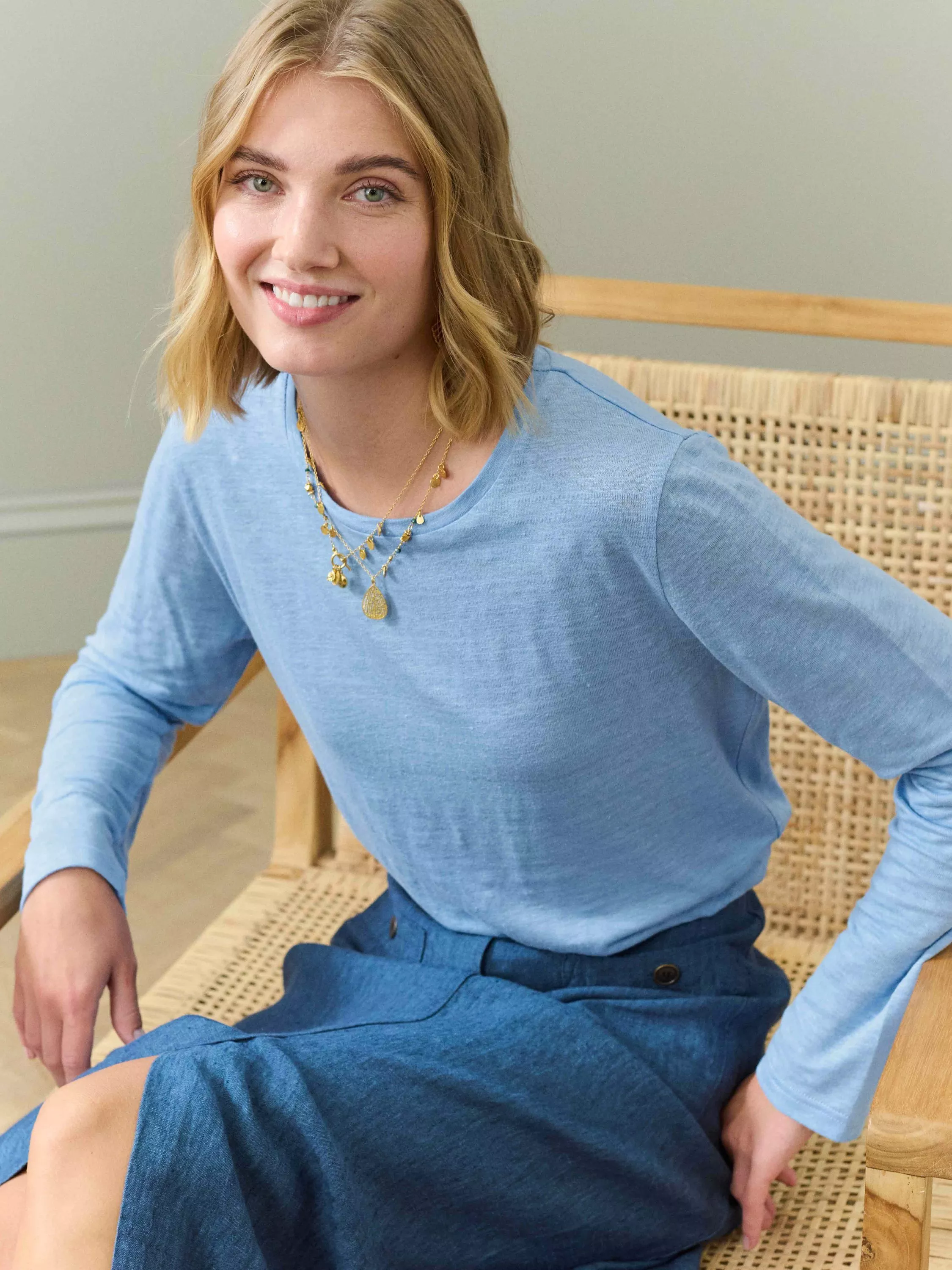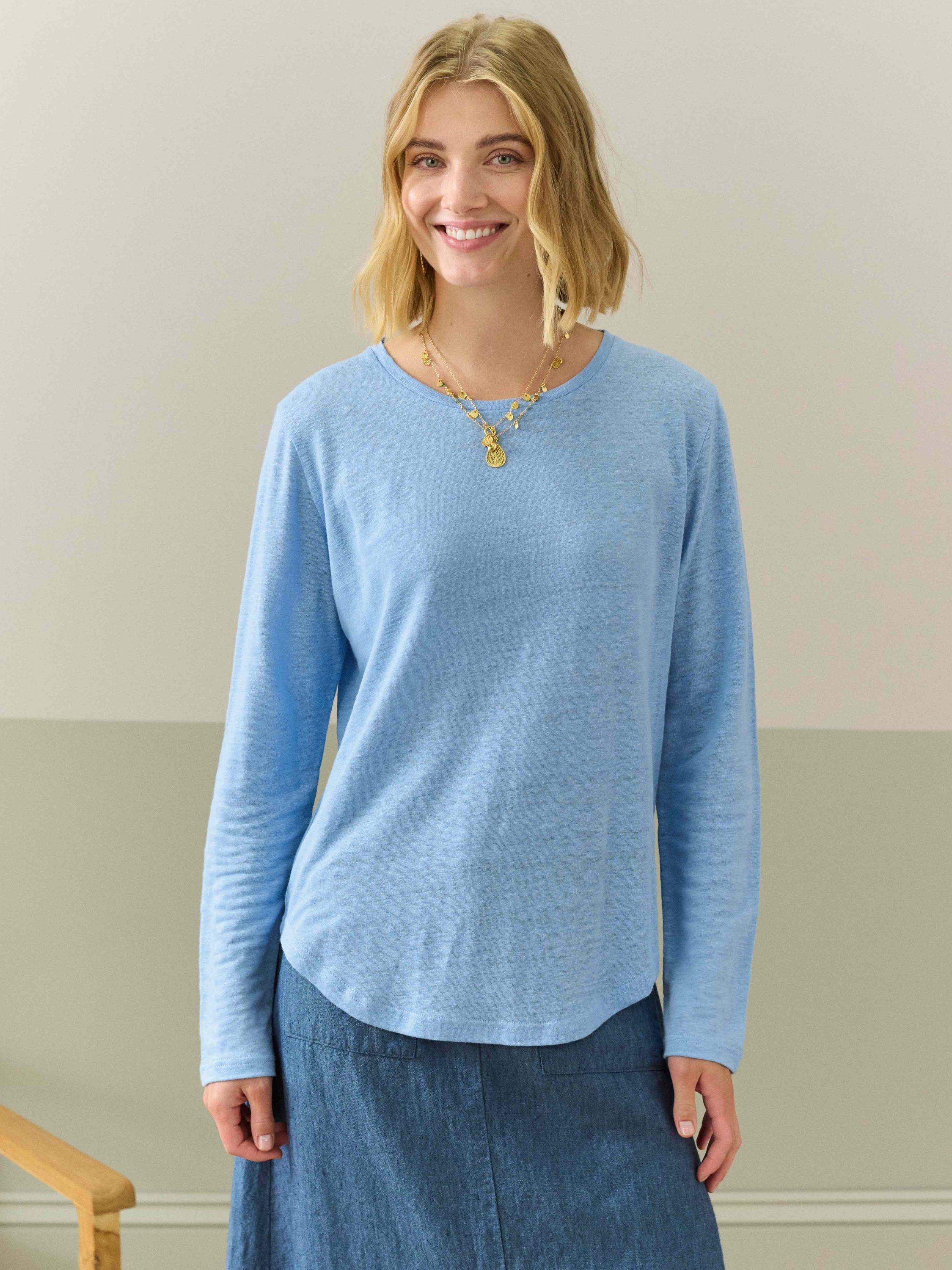 Made by a team of specialists in Europe, Brora's linen knit tees are back by popular demand and must-haves for stylish, sustainable year-round outfitting, featuring a flattering boat neckline, long sleeves and curved hemline.