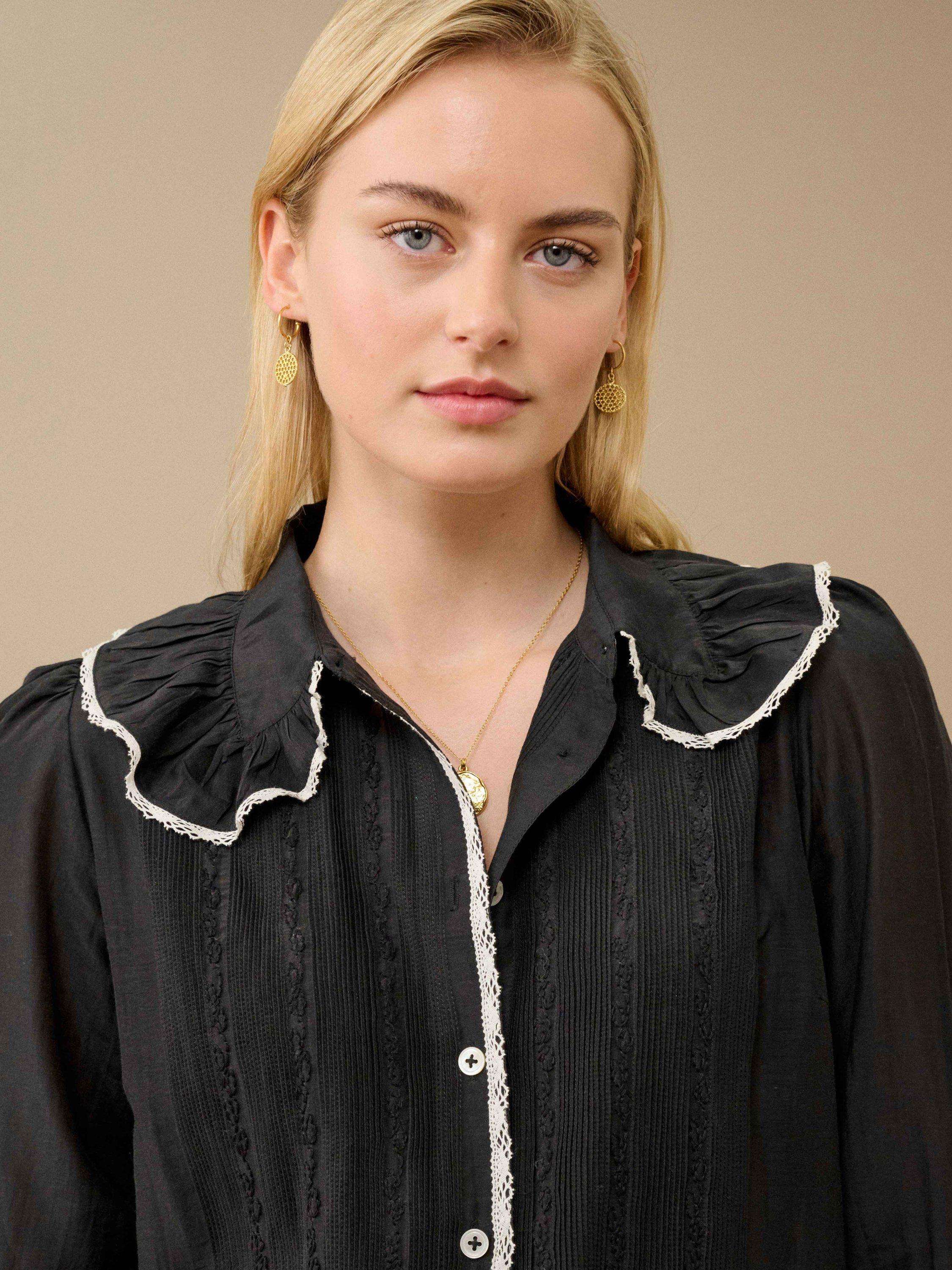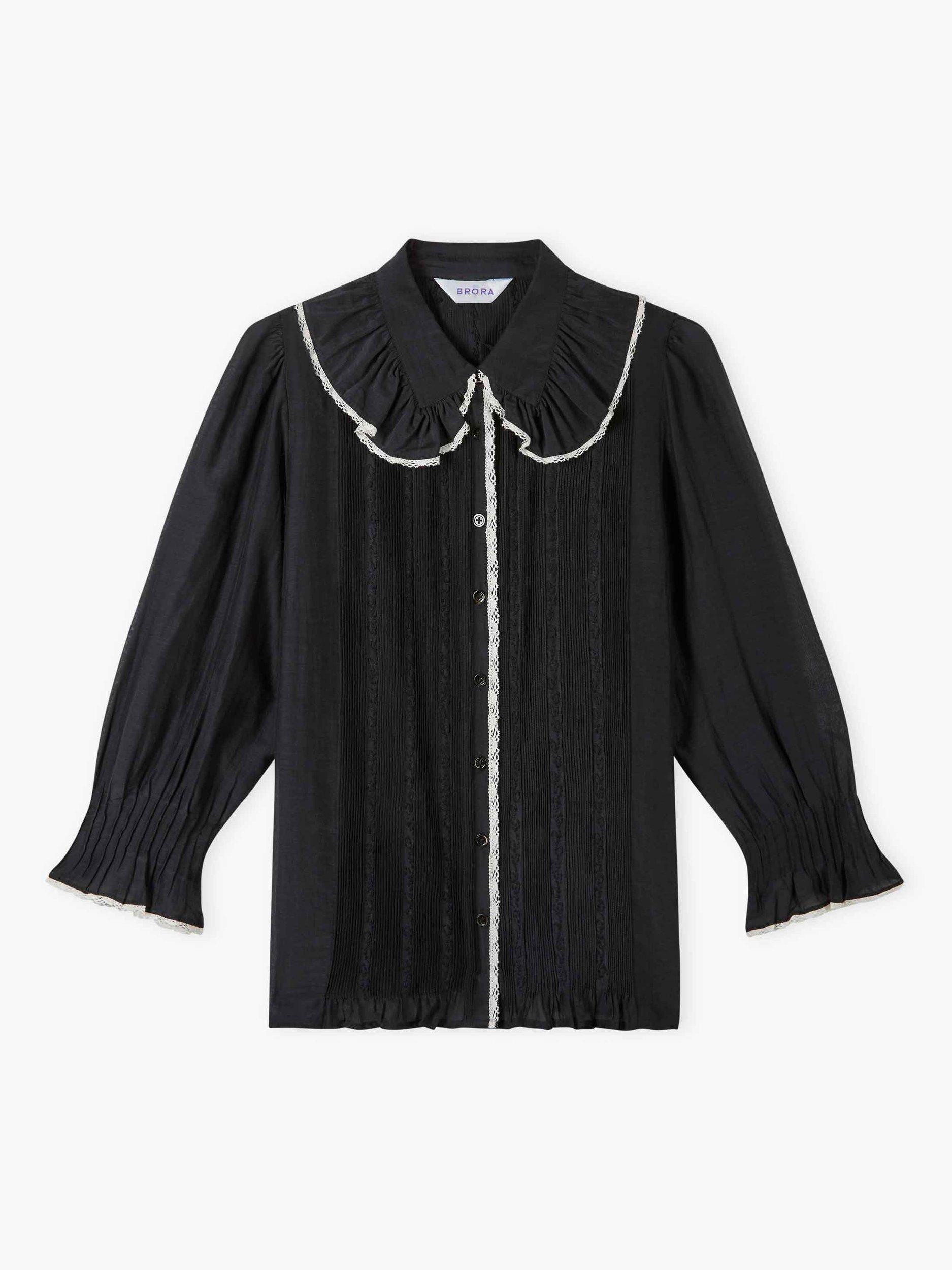 Brora have created this cotton-silk beauty, which combines intricate micro pintucks, embroidery, contrasting lace trims and a large, showstopping frill collar.