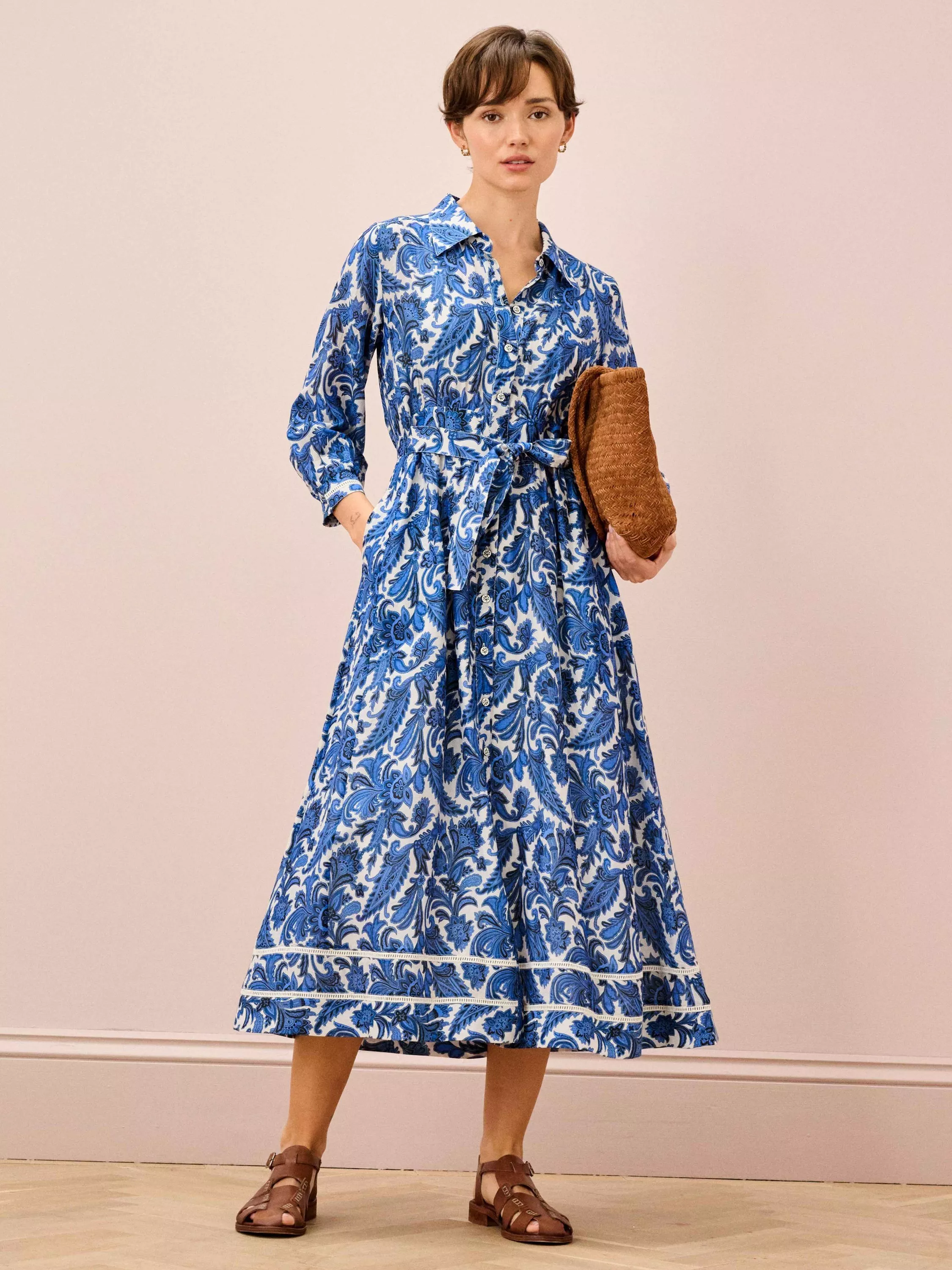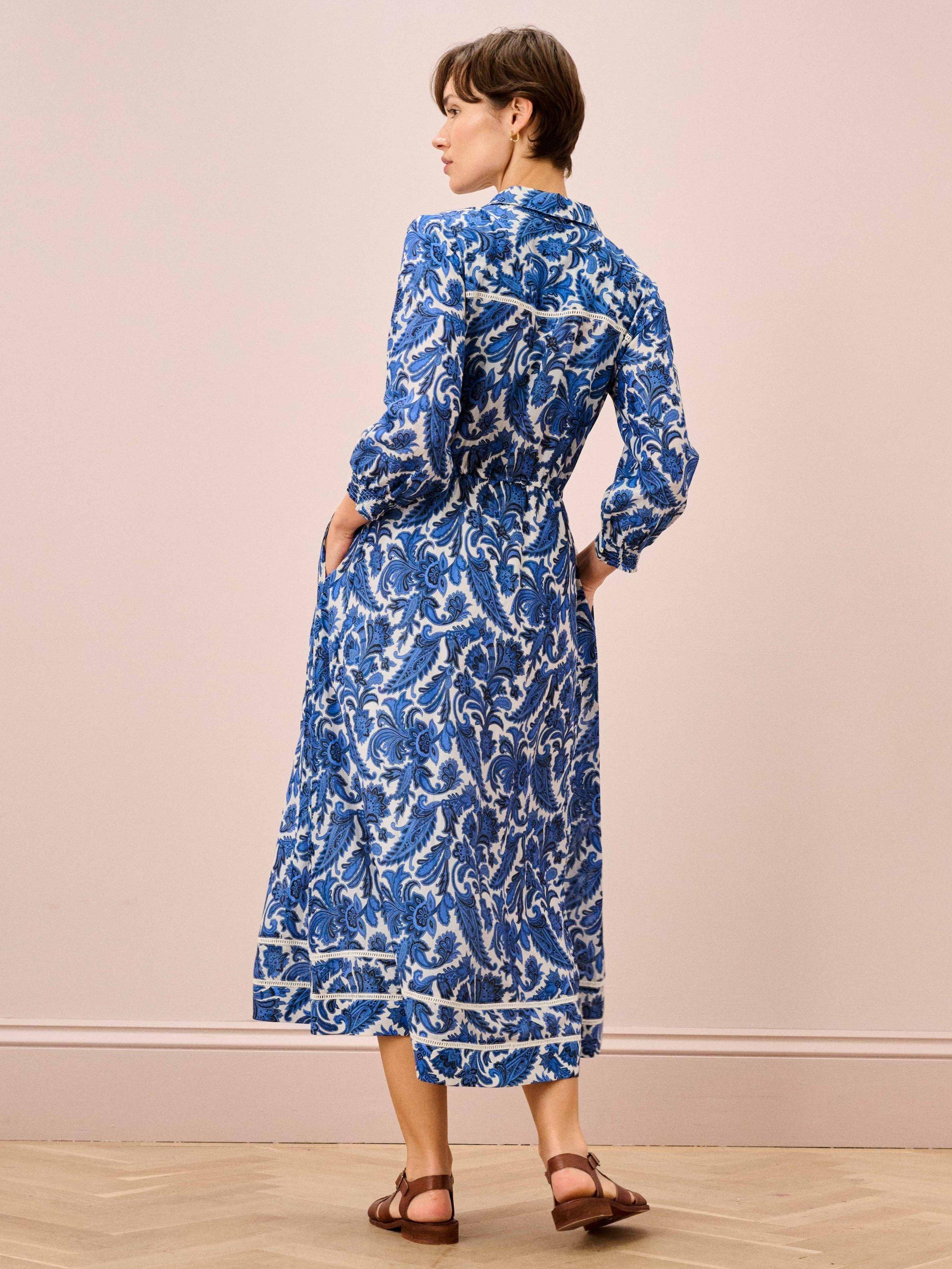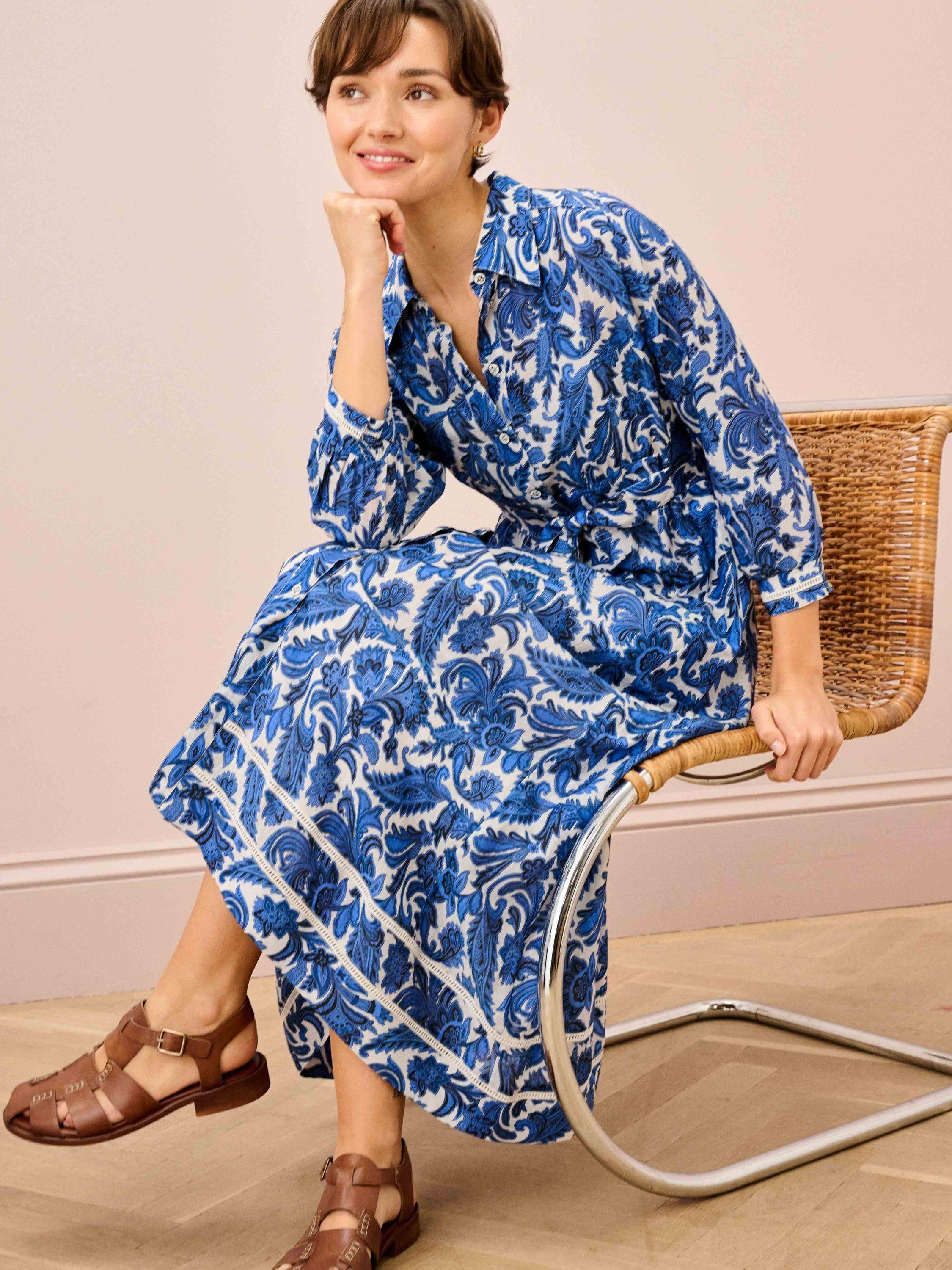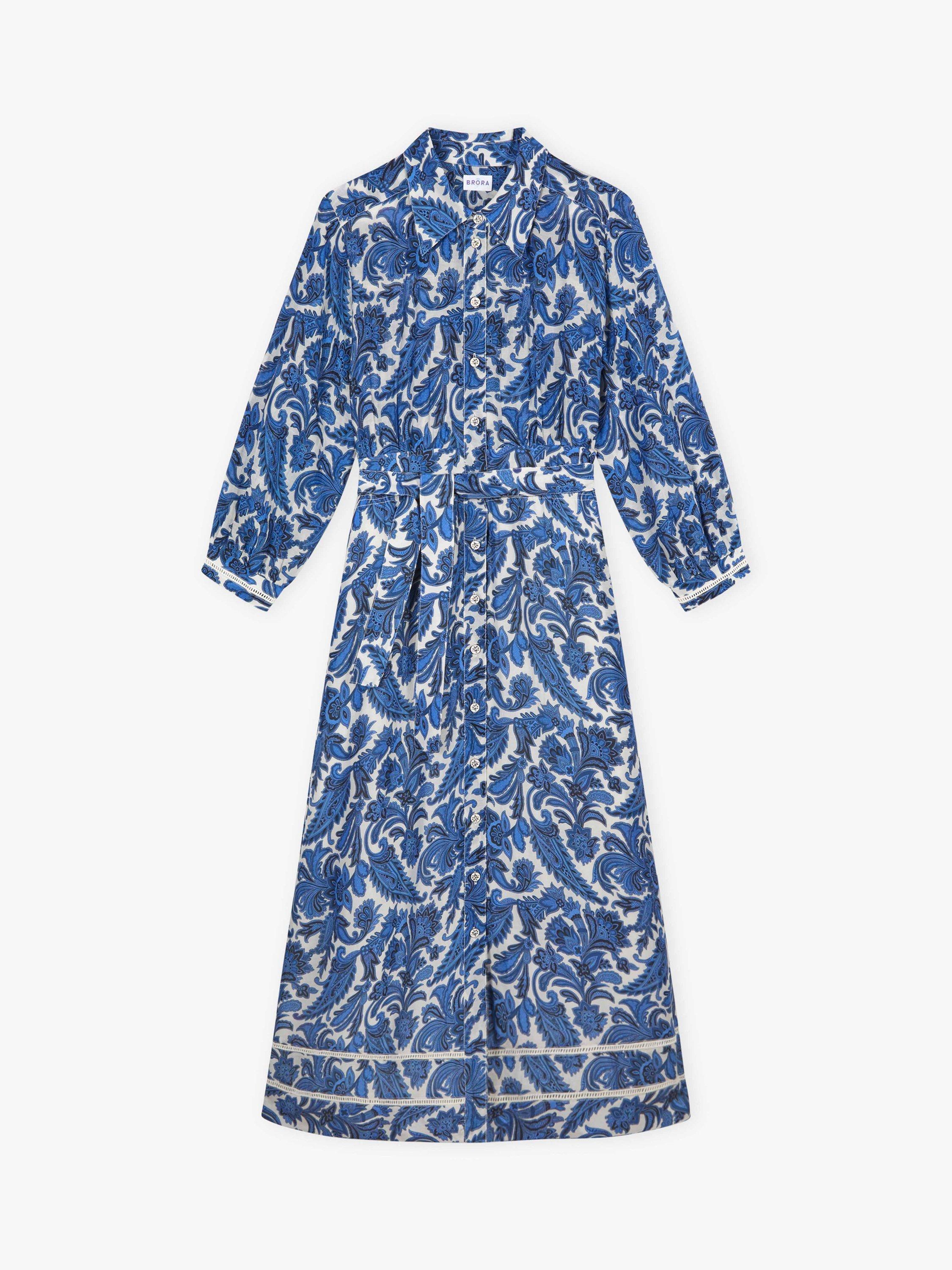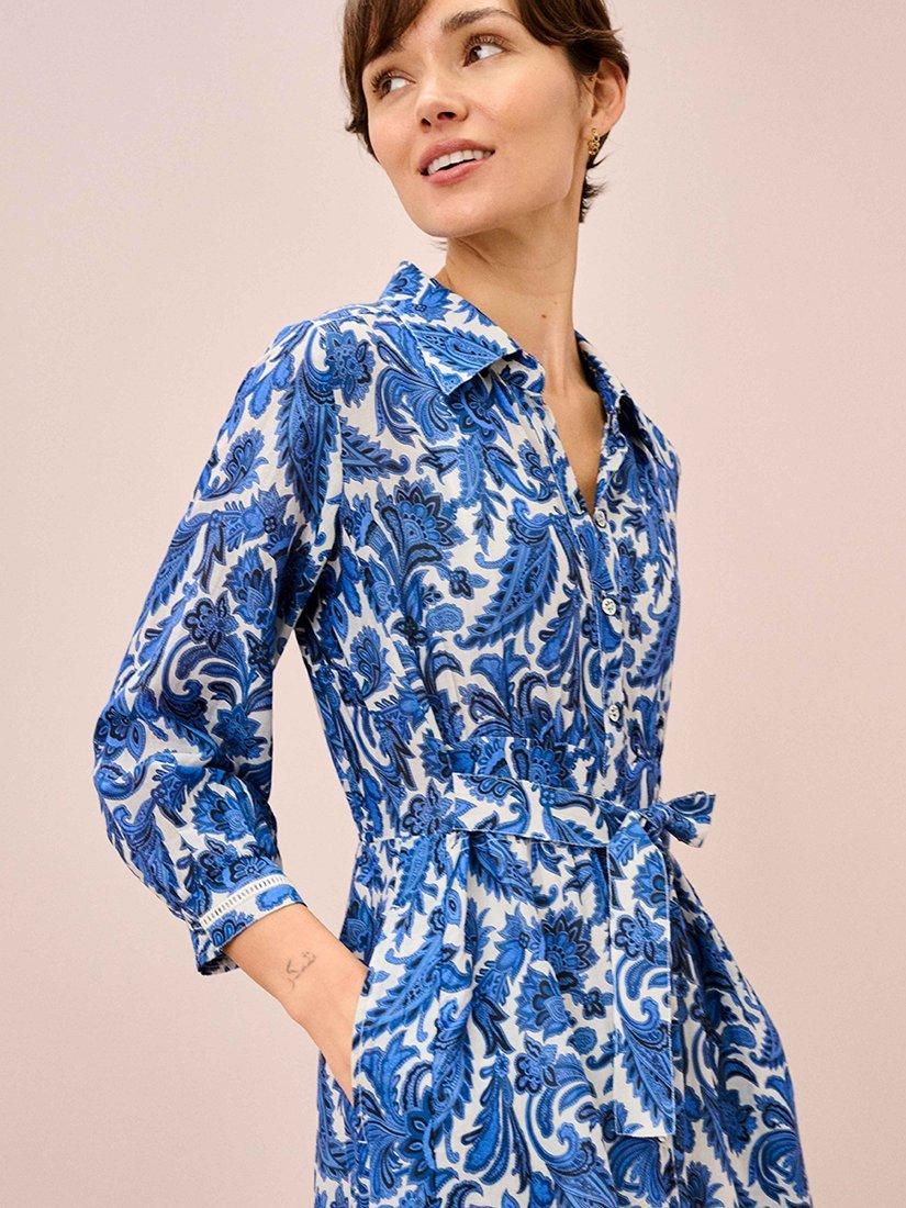 Made from a cotton blend with a luxurious handle, this pointed-collar paisley dress features small metal buttons down the front and a cinching waist belt, setting bold, mood-boosting florals against a soft, neutral base.