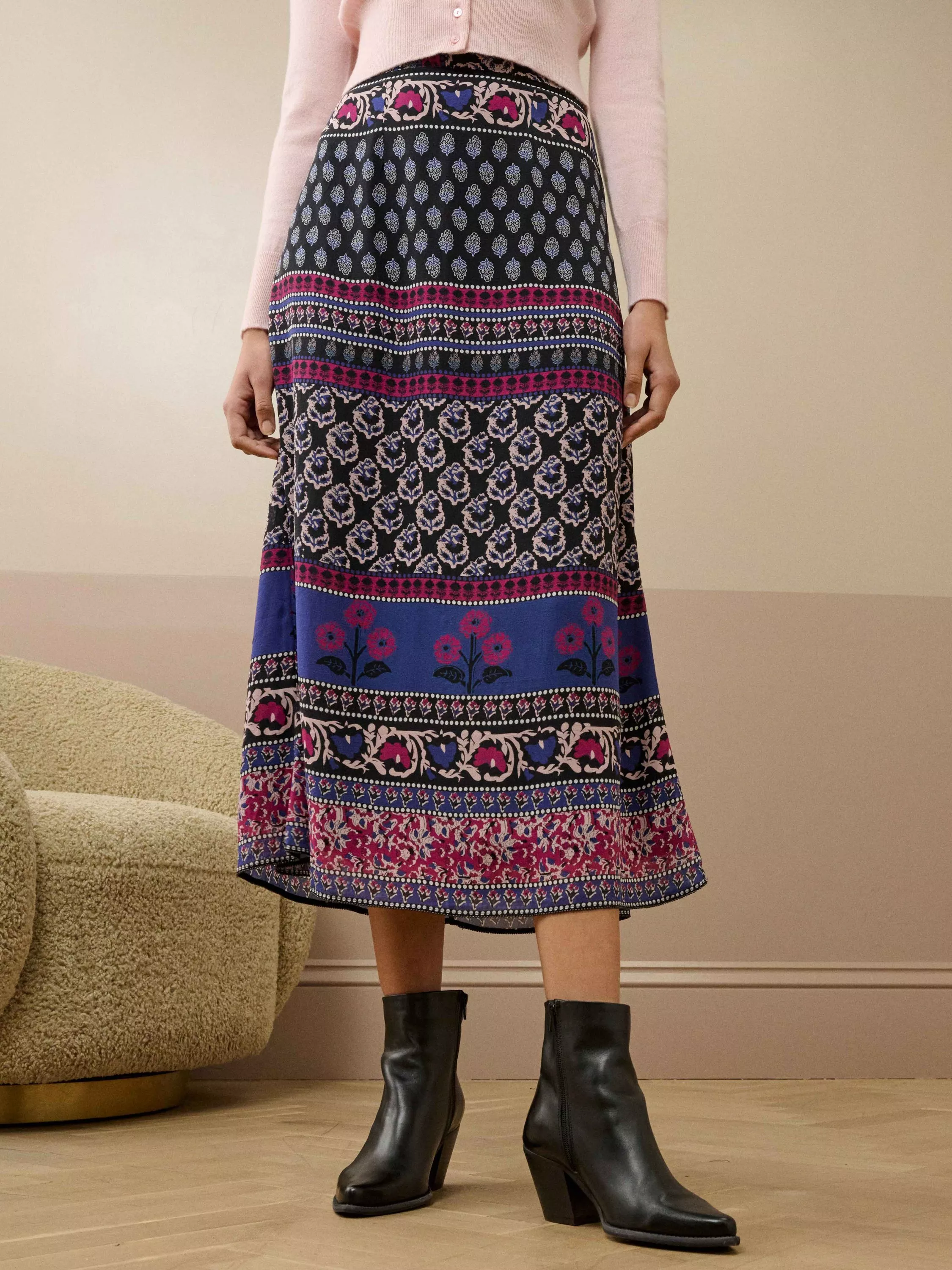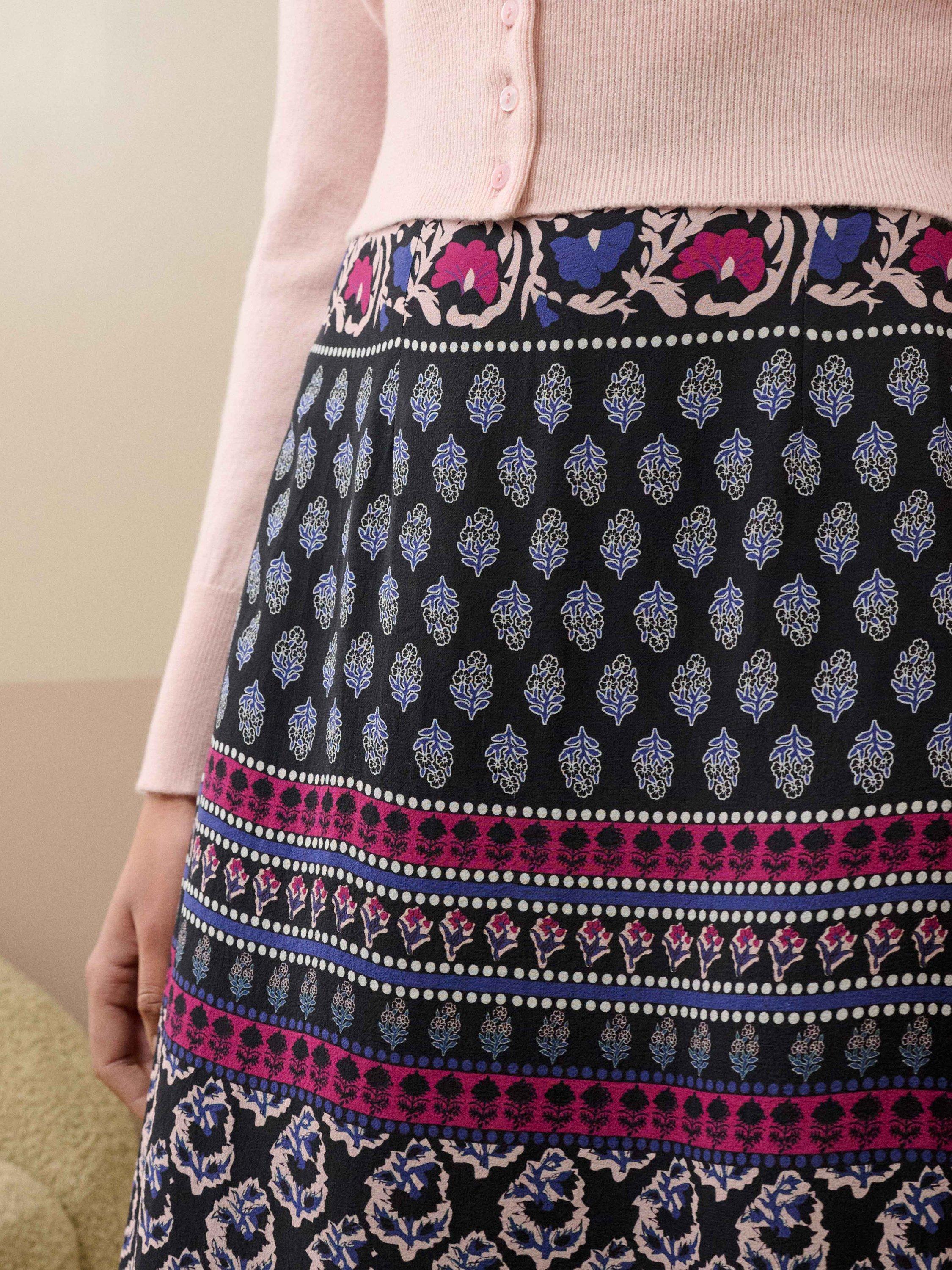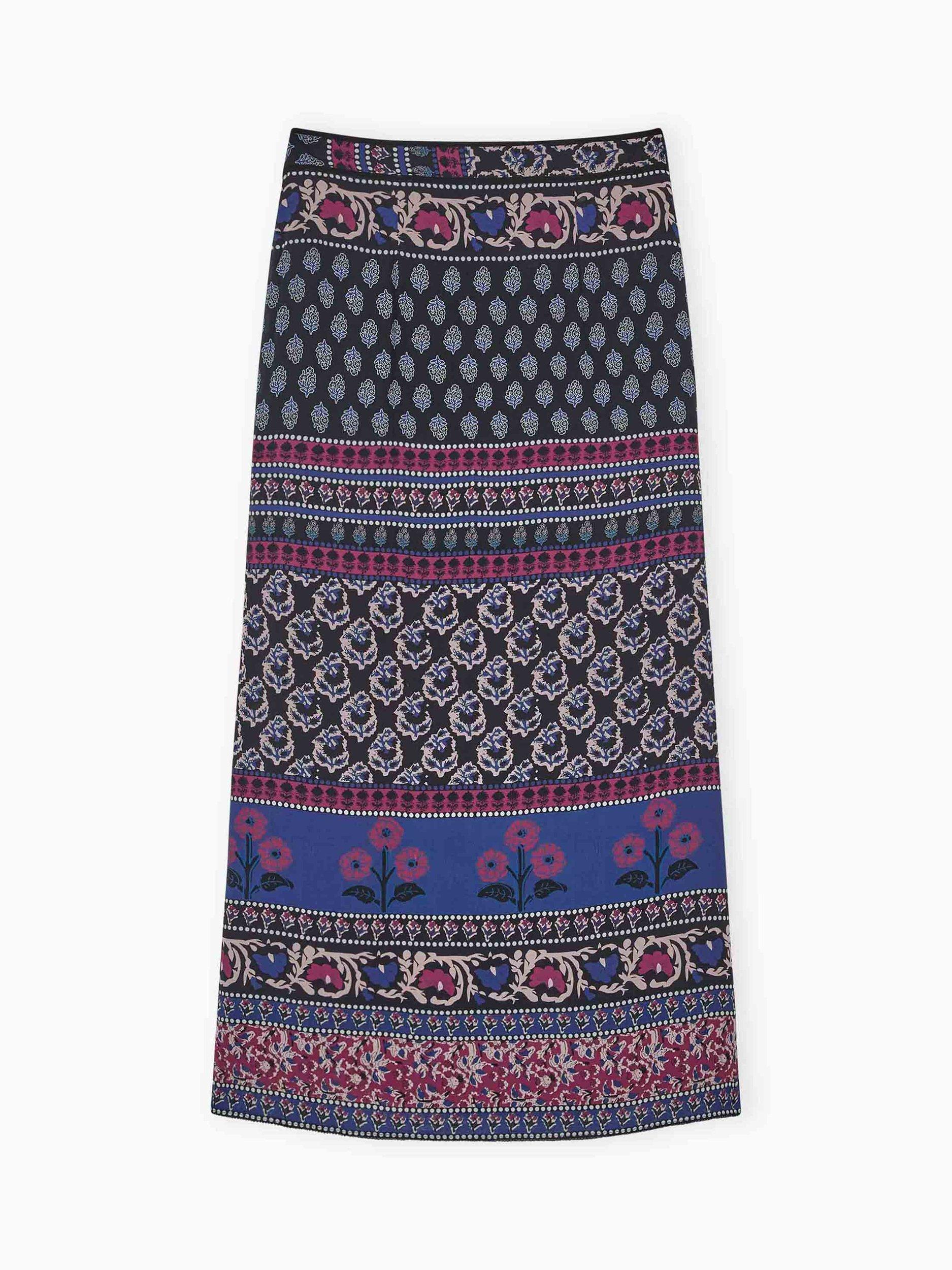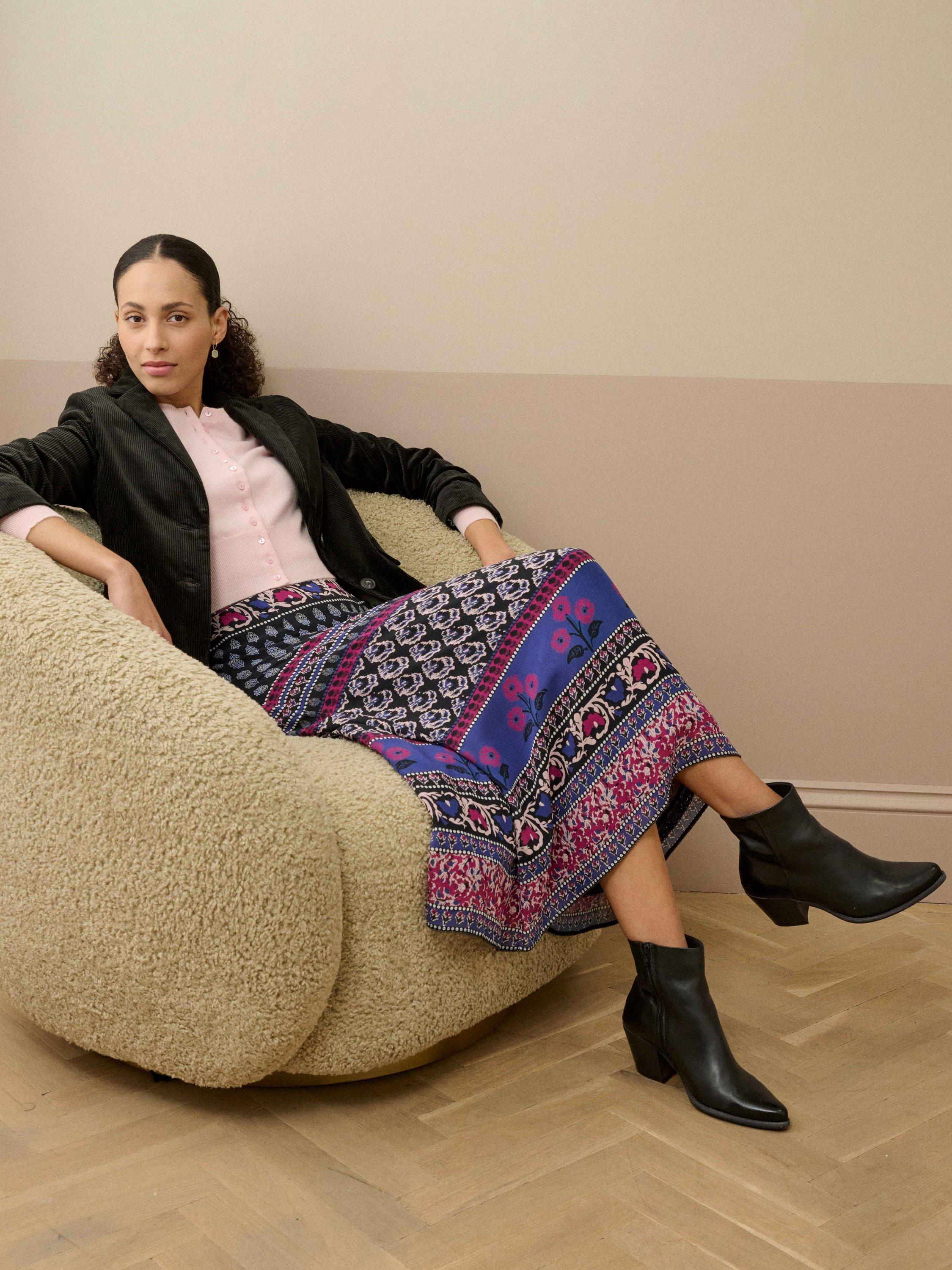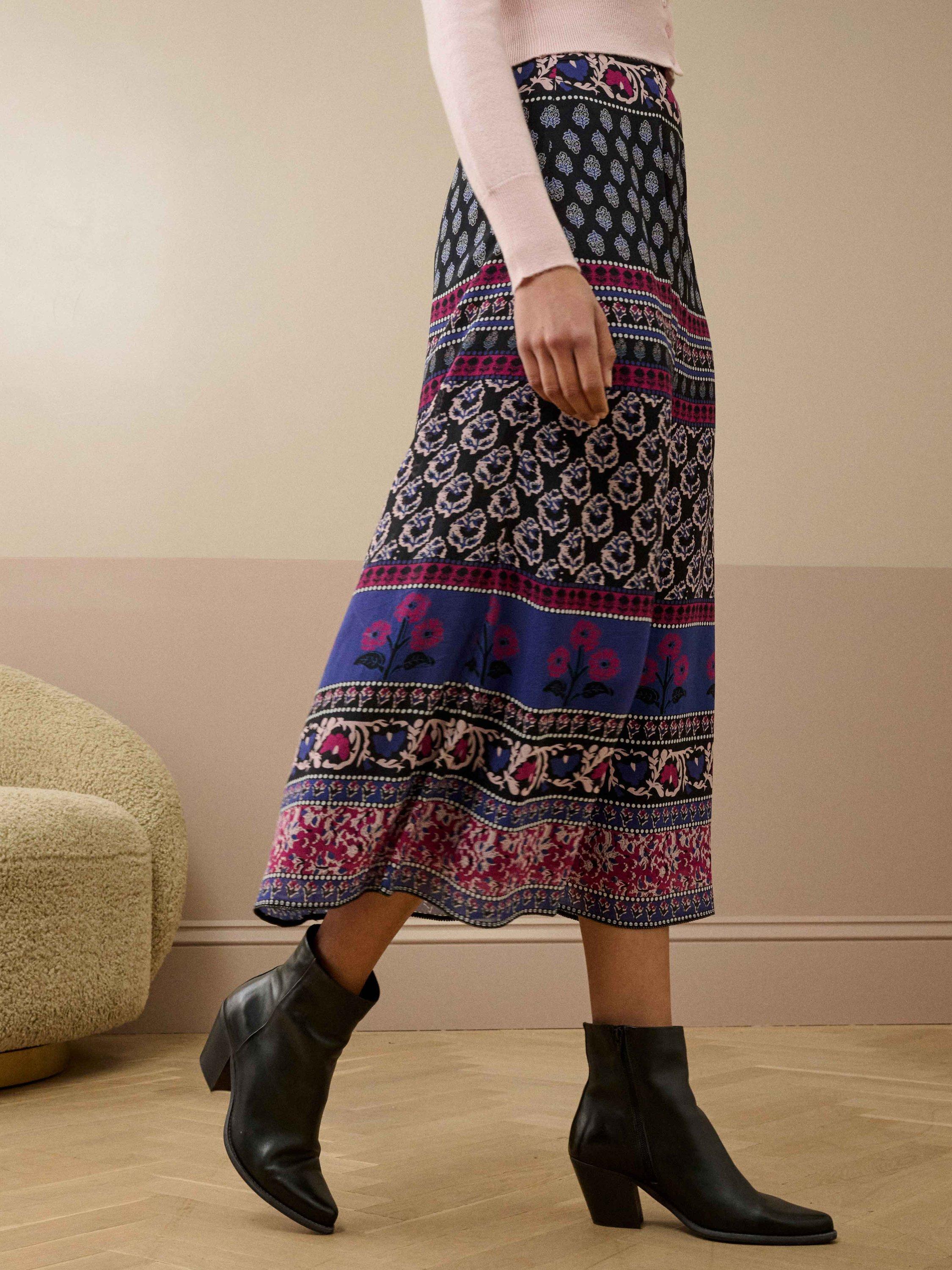 This fashion-forward skirt, designed in-hous at Brora, patchworks together recoloured vintage floral block prints onto a luxurious silk base, exquisitely finished with an invisible zip fastening and a hand-sewn copper beaded hem.