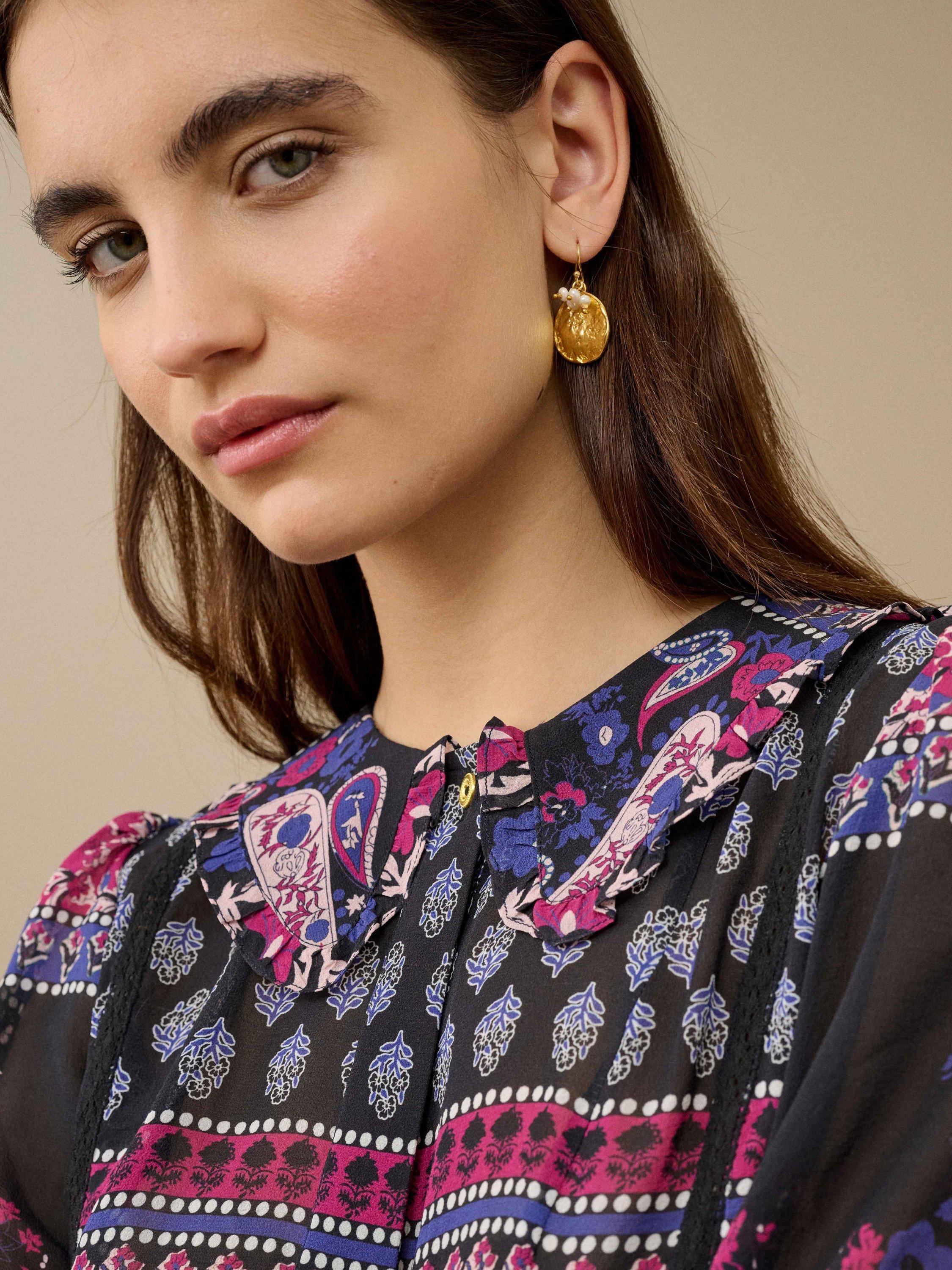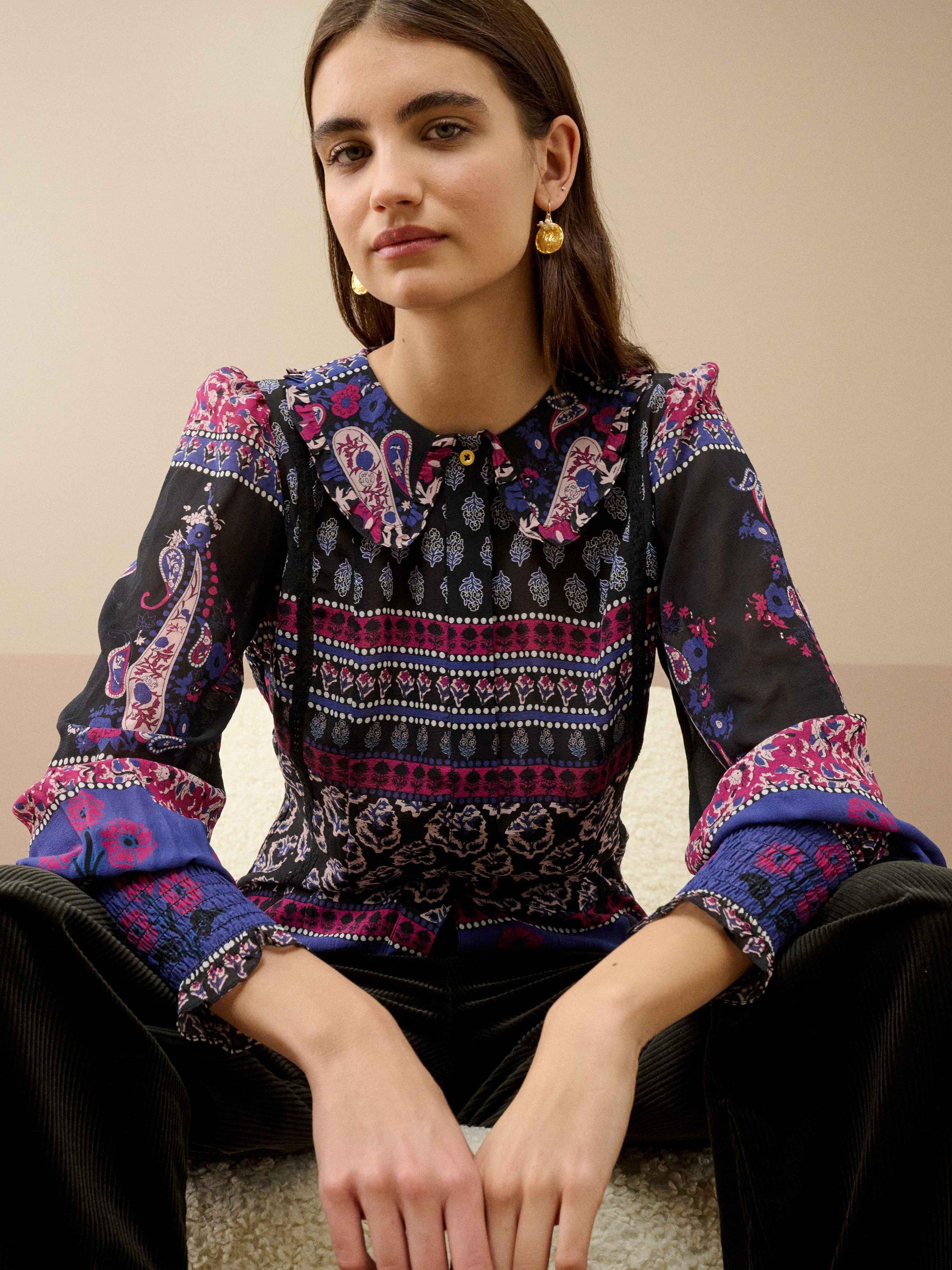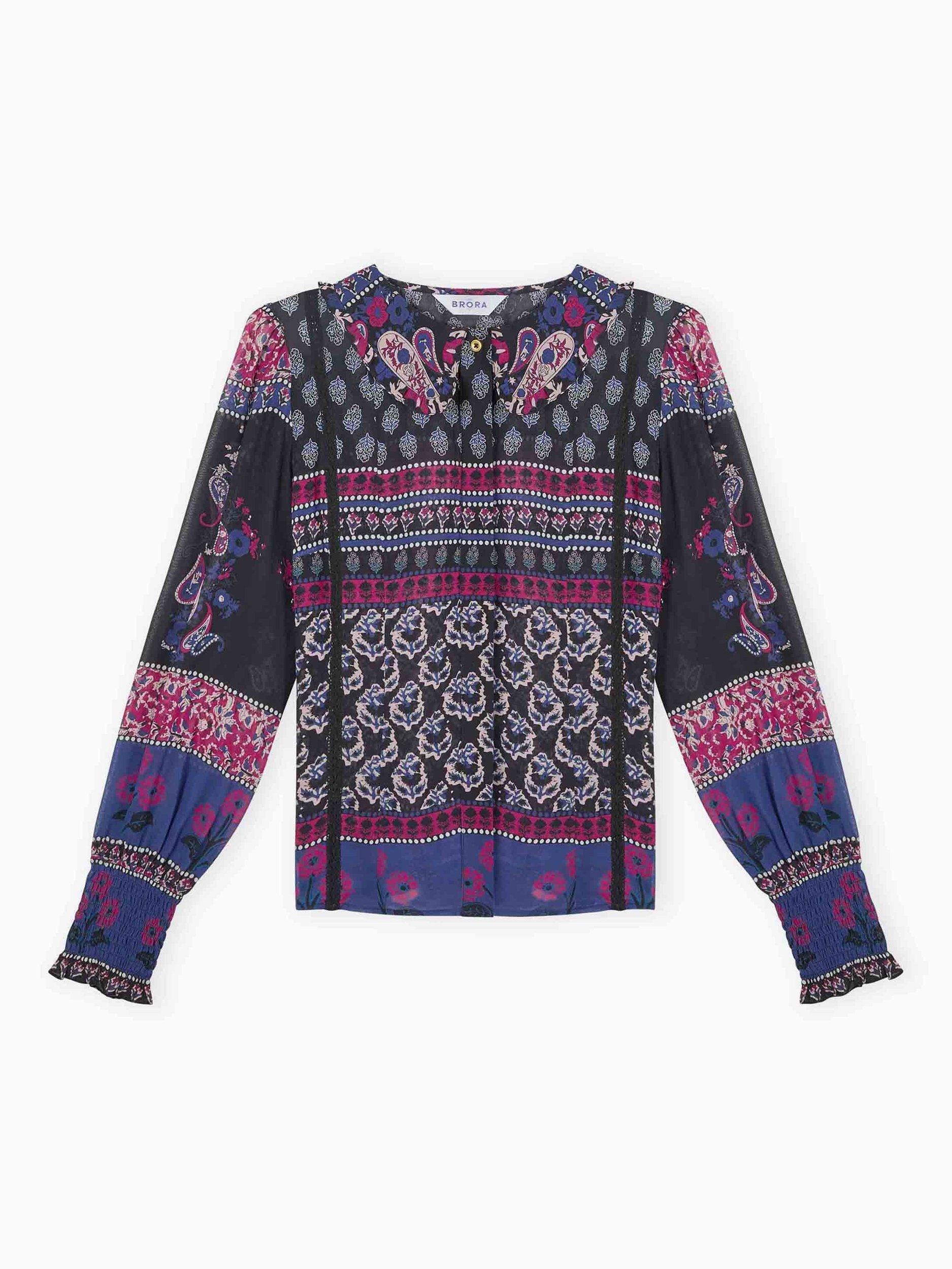 Ready to make a serious style statement? Brora have got you covered with this sumptuous silk blouse, featuring a colour-clashing patchwork design, shirred cuffs, concealed placket, lace inserts and a feminine frill collar.