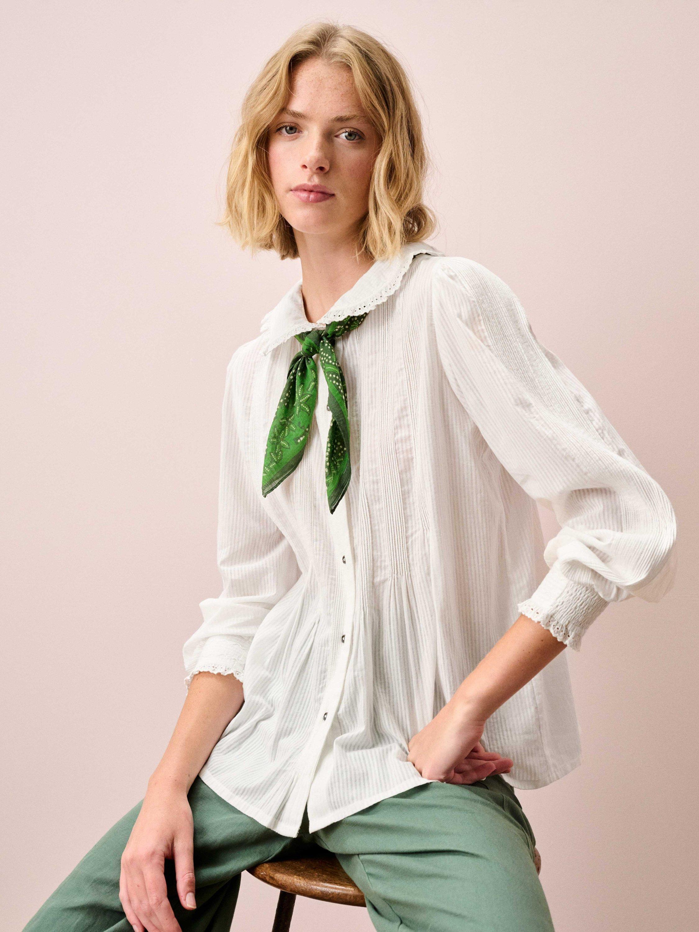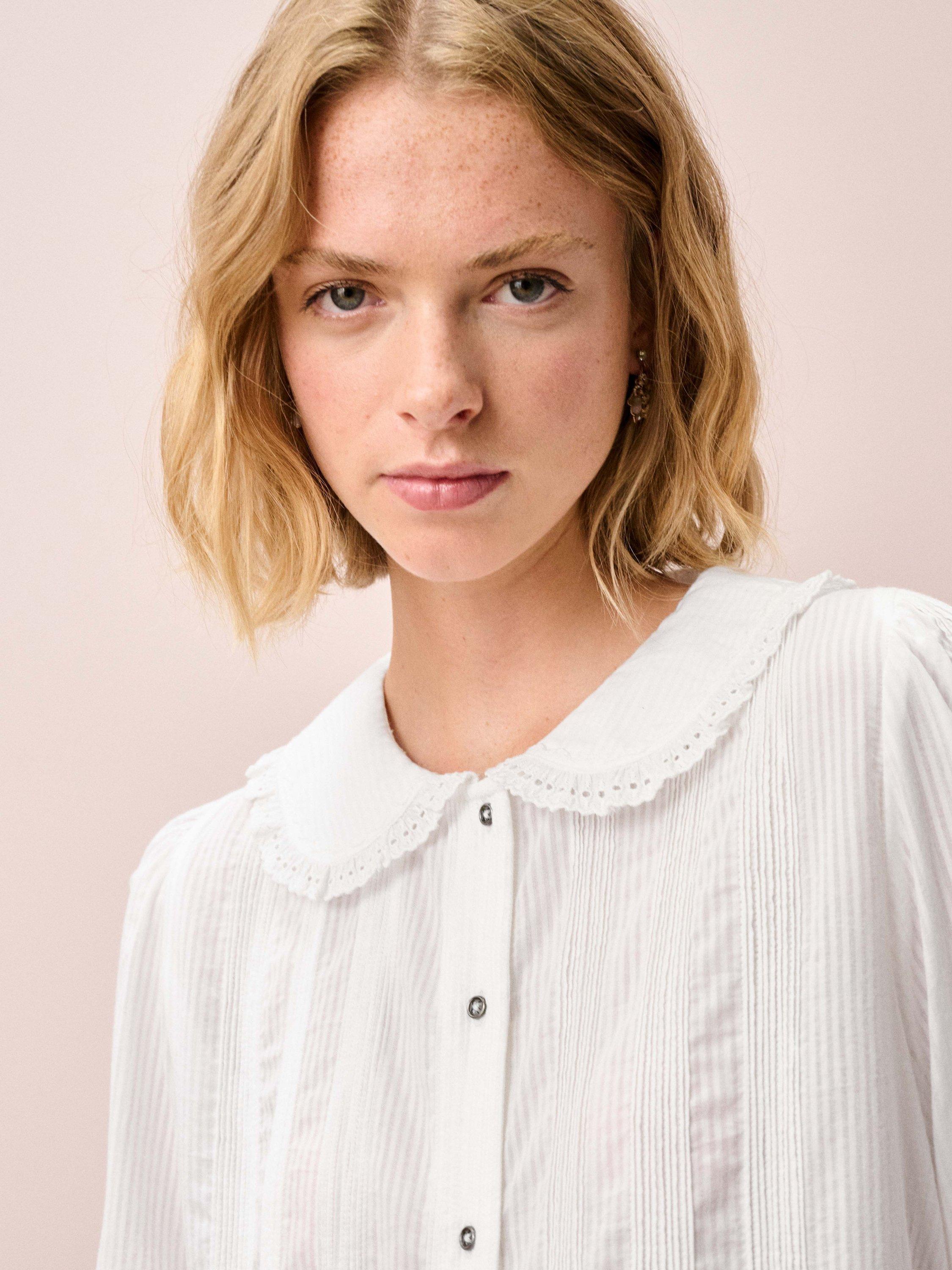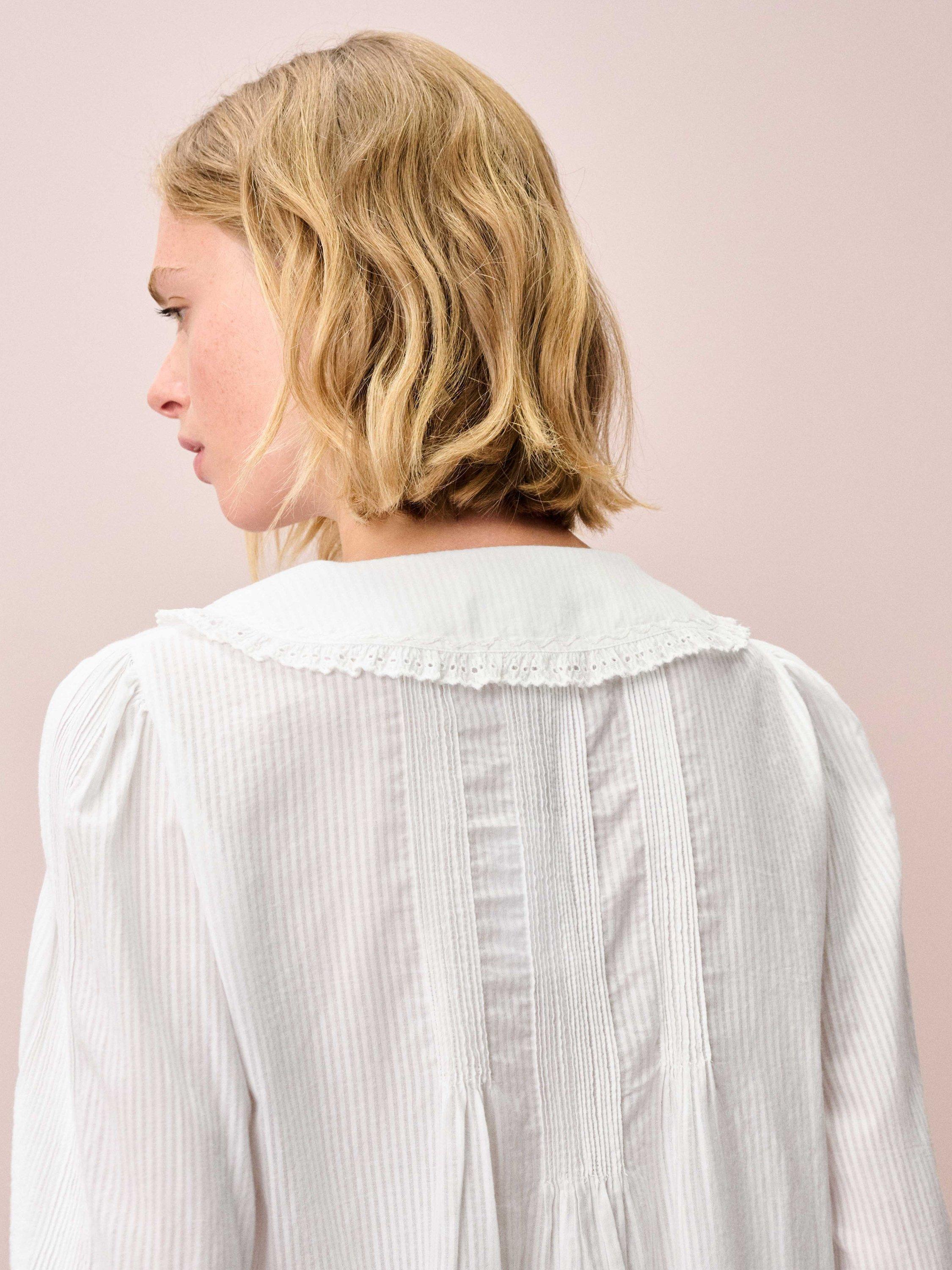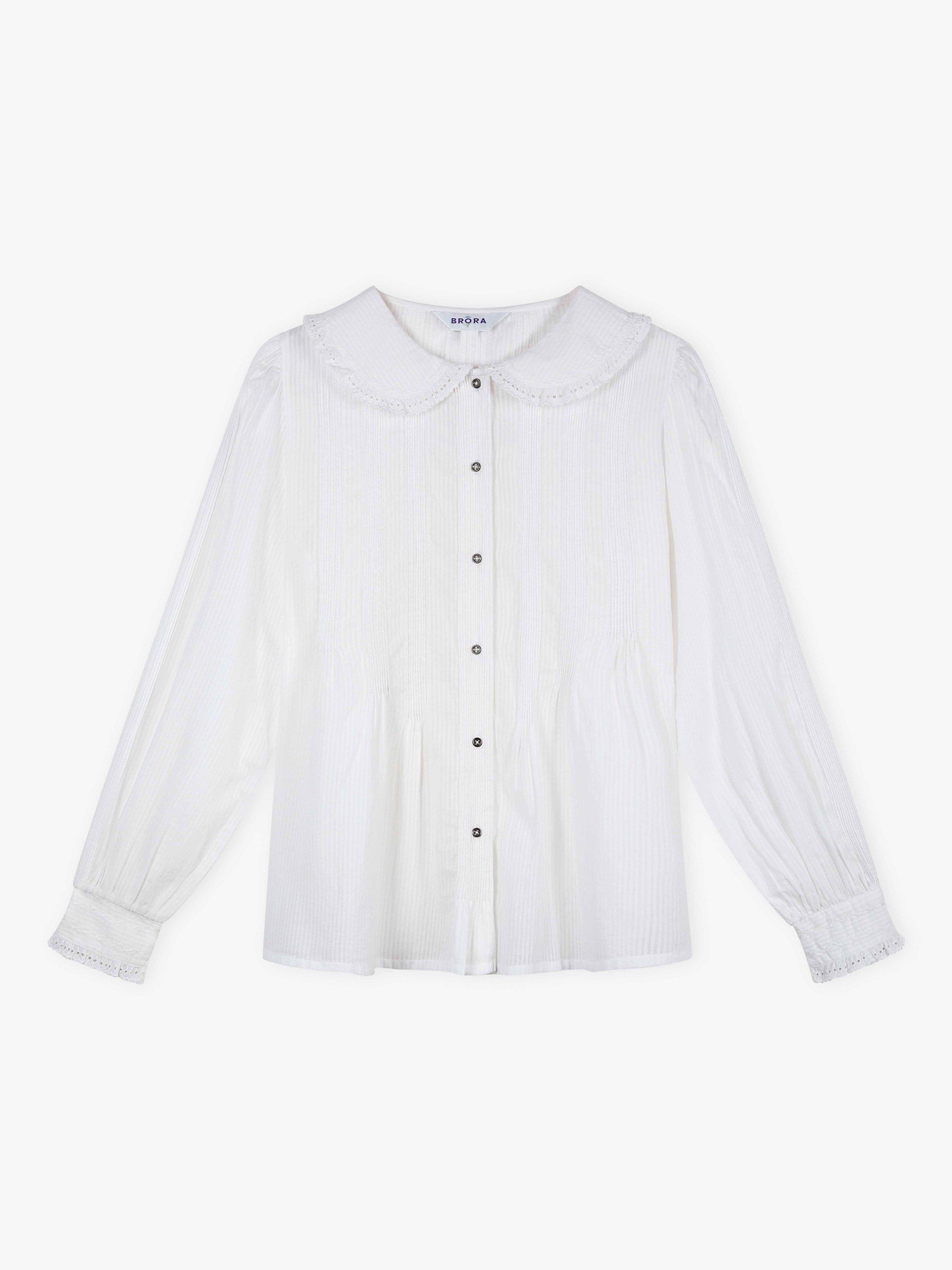 This gorgeous blouse, made from finely striped cotton, combines a rounded collar with chain-stitch embroidery and broderie anglaise trims, small metal buttons on its placket and an abundance of micro pintucks.