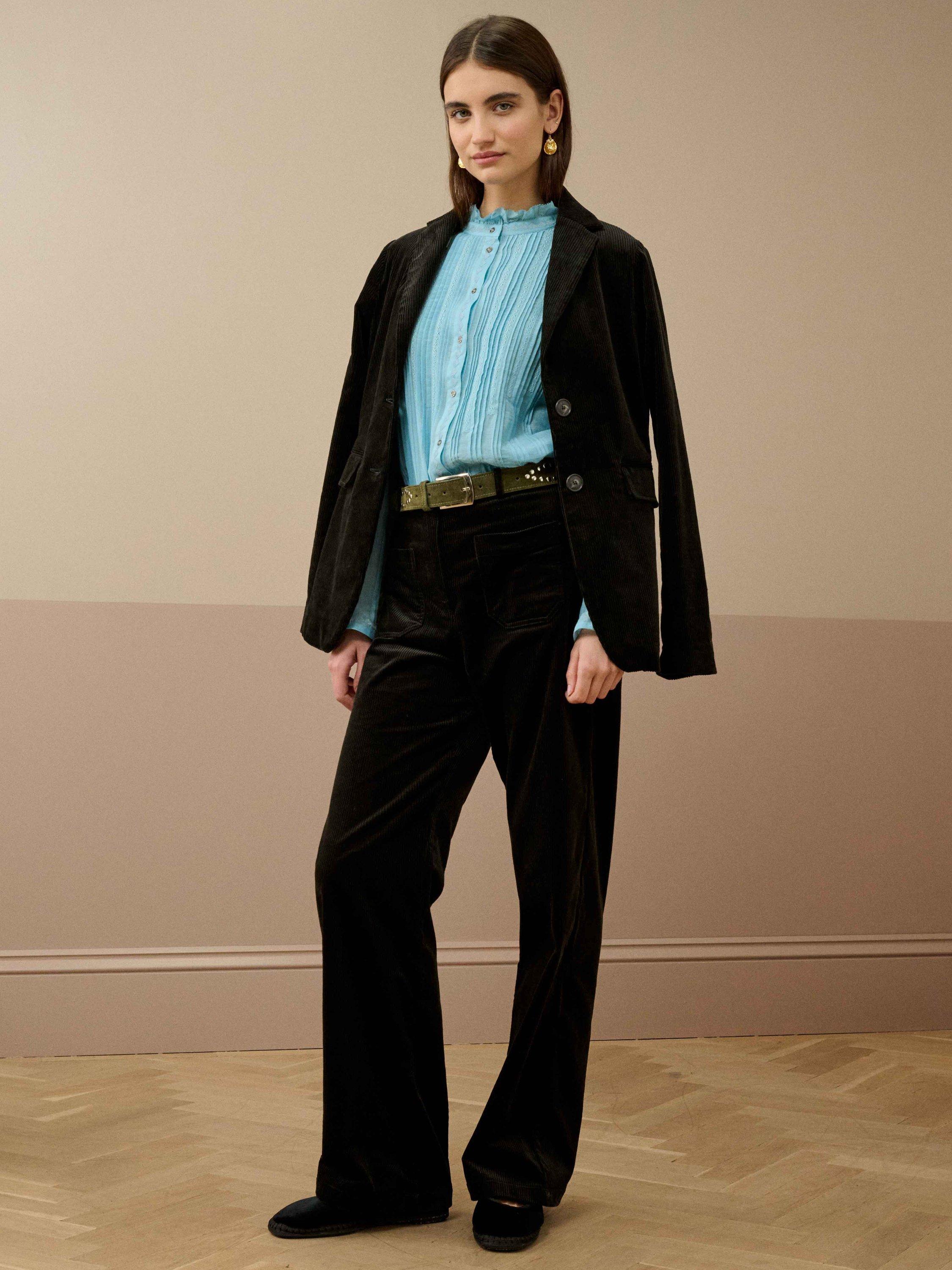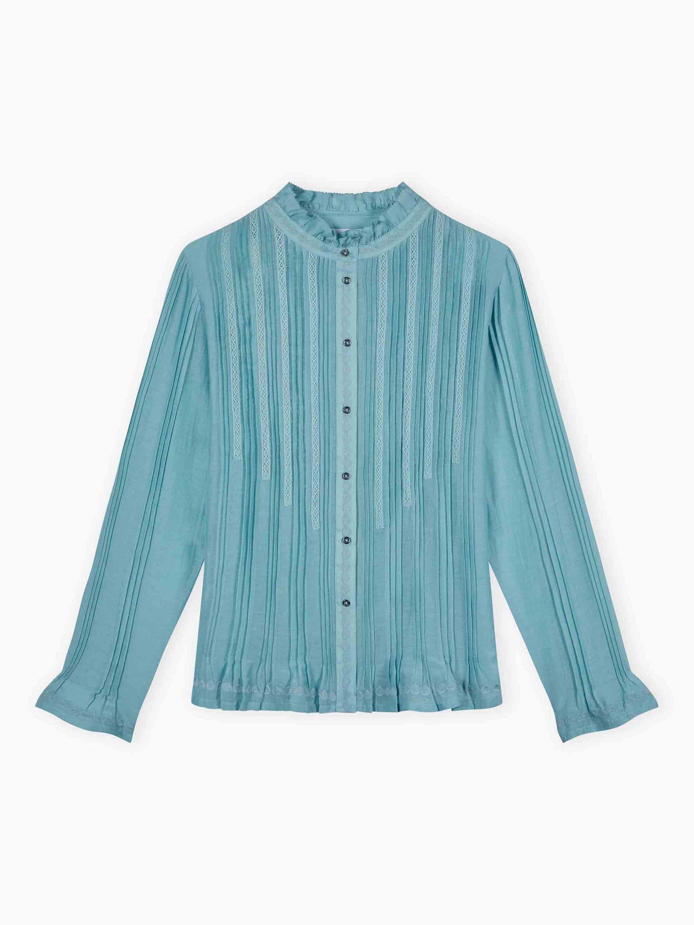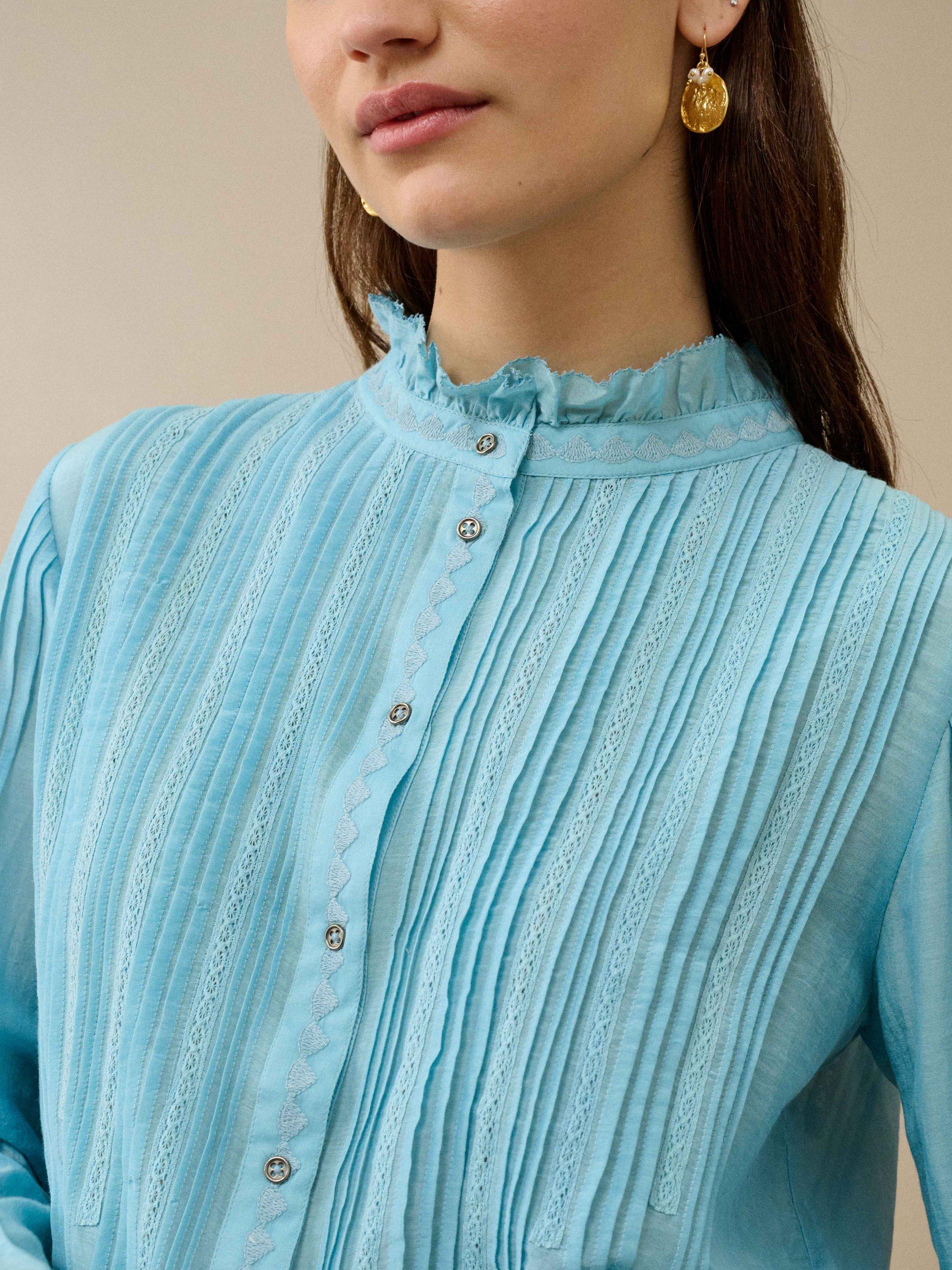 Exclusively developed for Brora and showcasing their penchant for thoughtful details, this silk-cotton blouse features intricate embroidery, an array of micro pintucks, small metal buttons and an eyelash-edge frill neckline.
