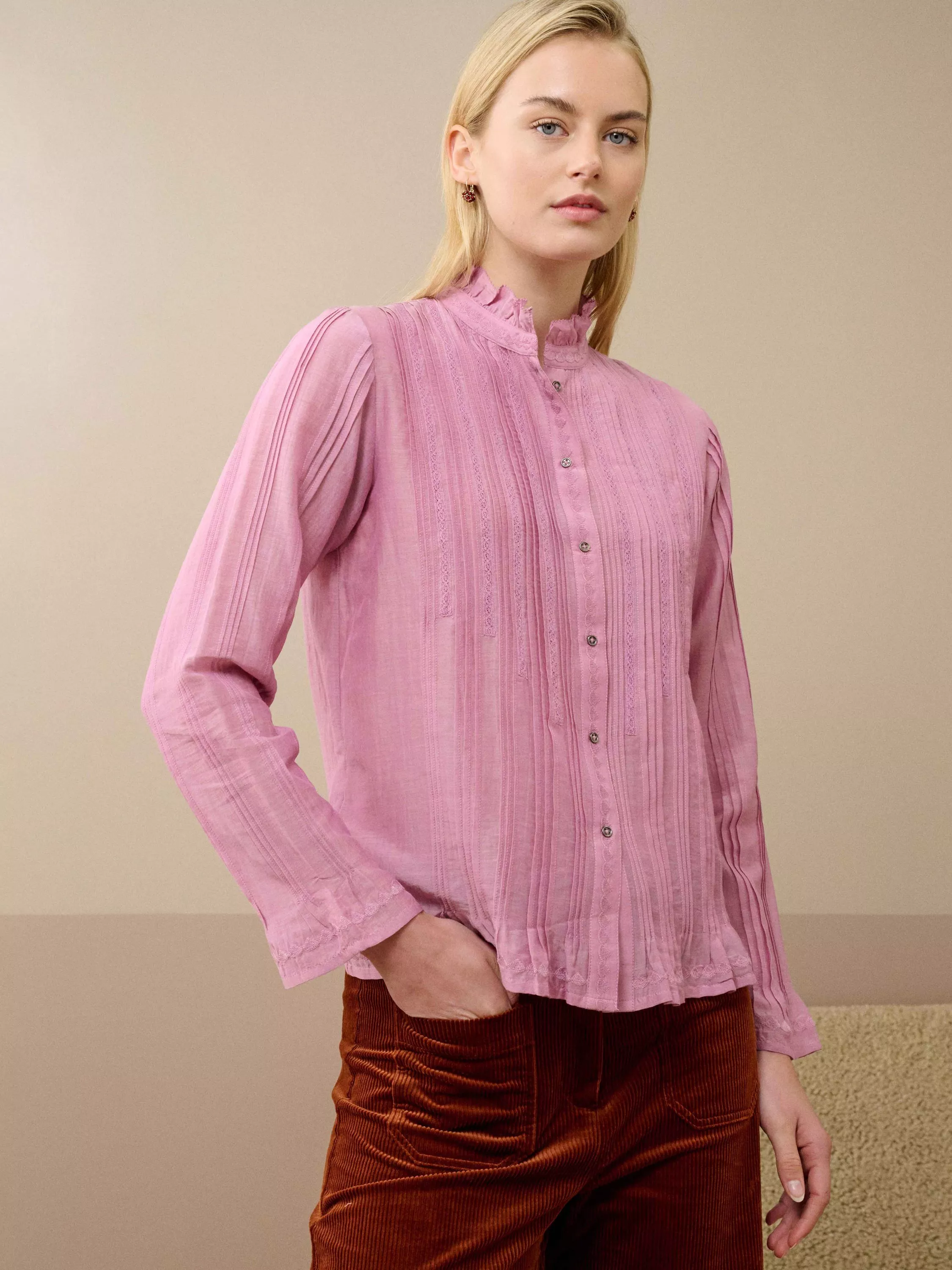Exclusively developed for Brora and showcasing their penchant for thoughtful details, this silk-cotton blouse features intricate embroidery, an array of micro pintucks, small metal buttons and an eyelash-edge frill neckline.