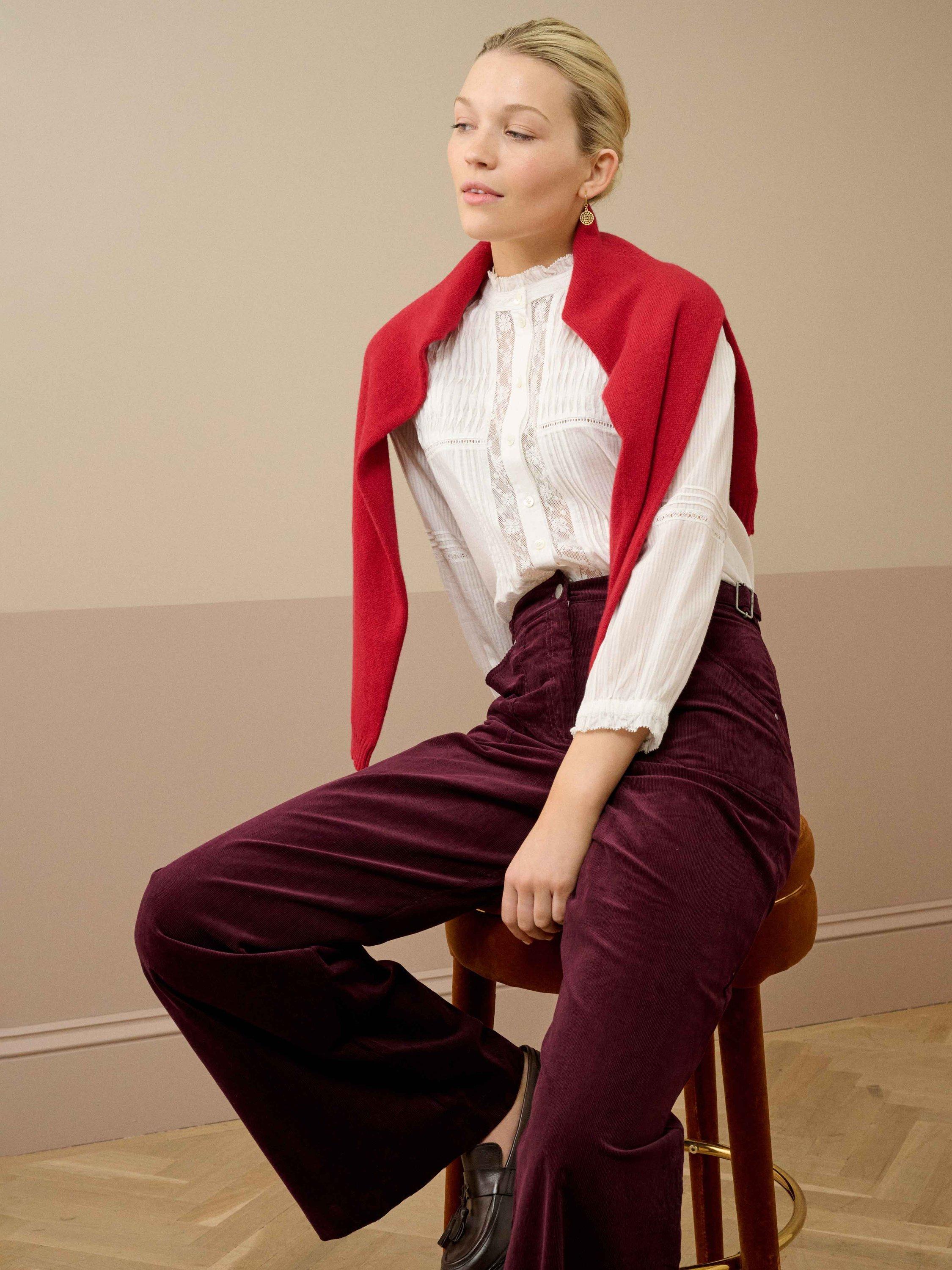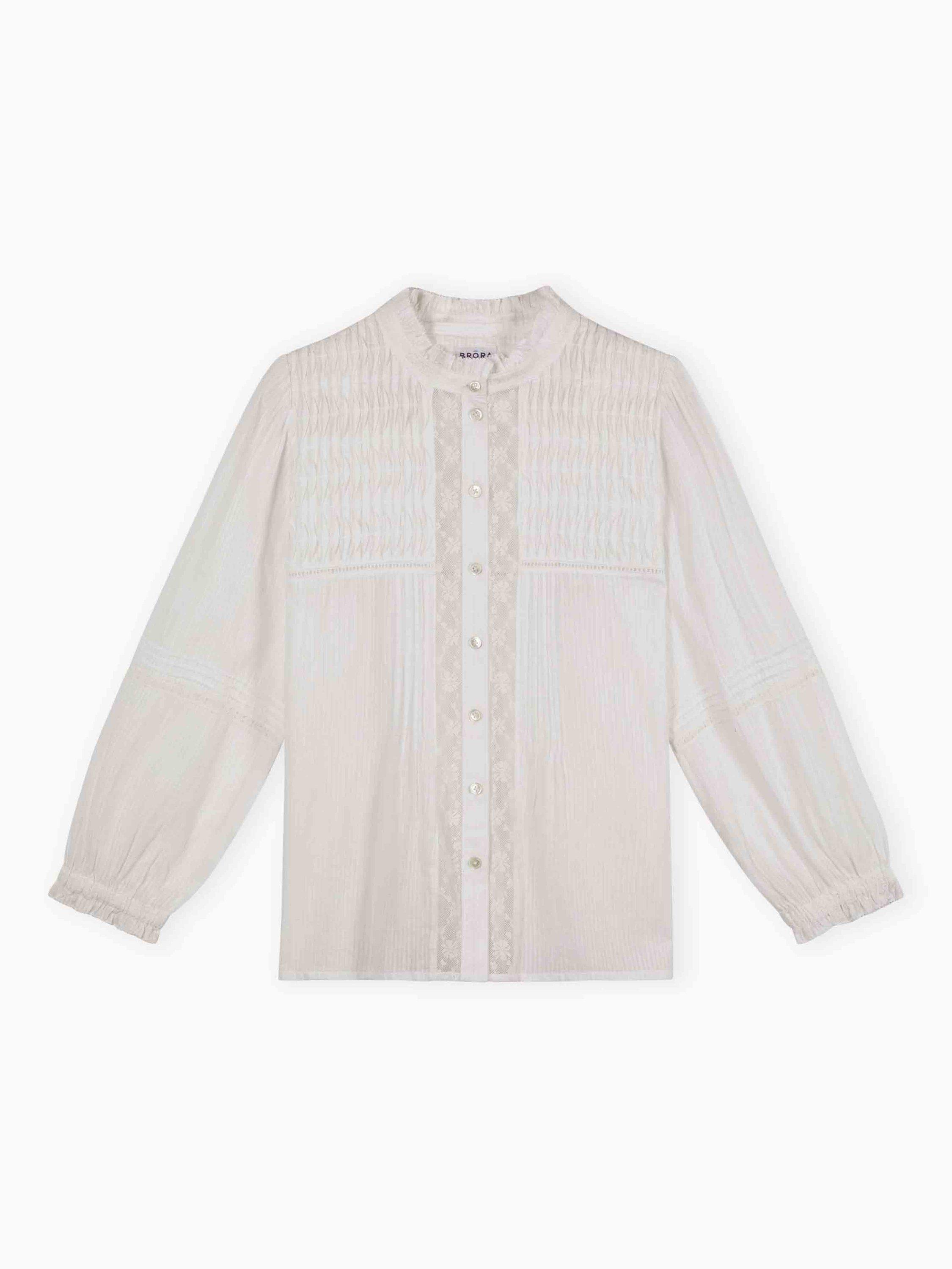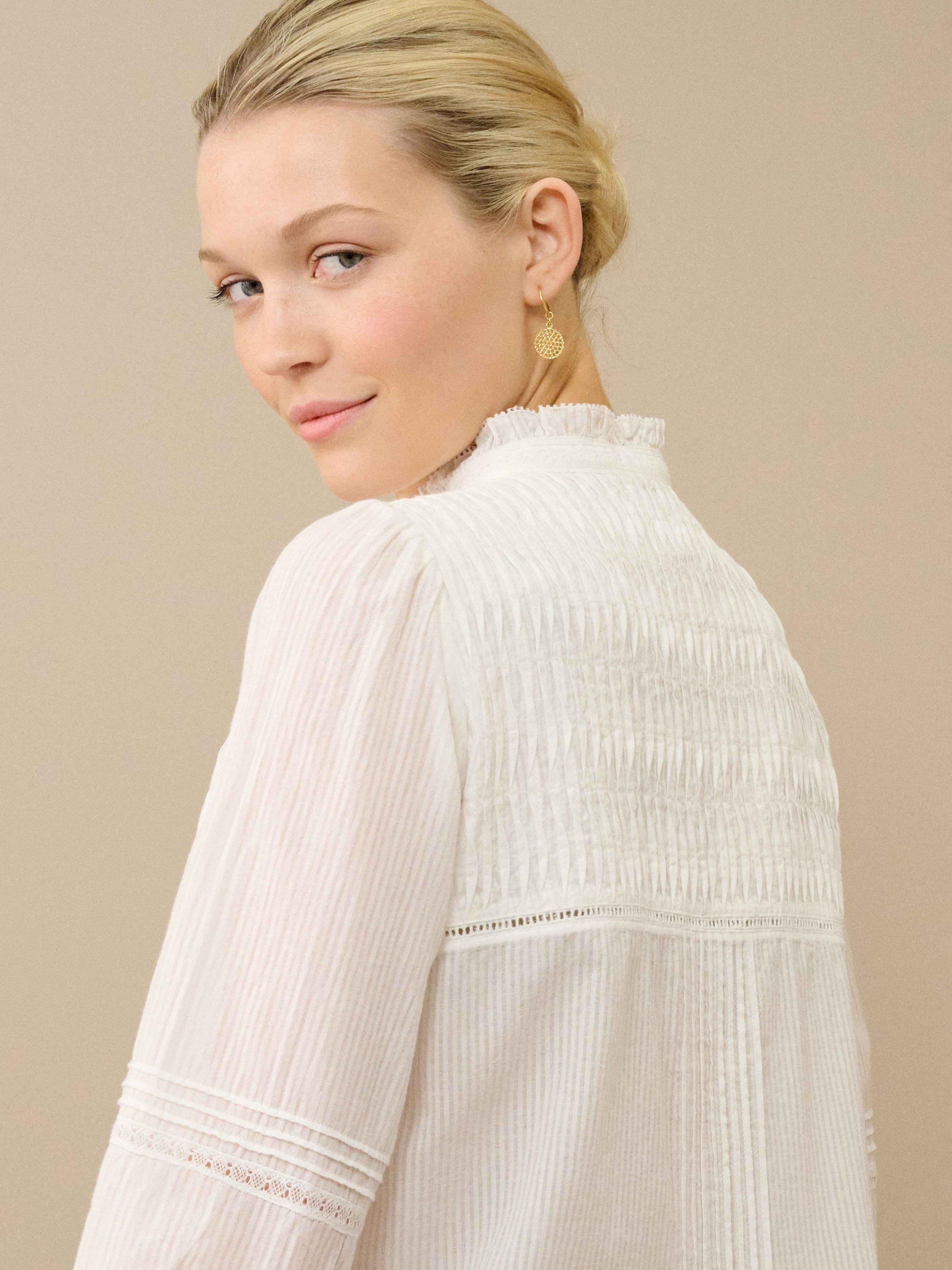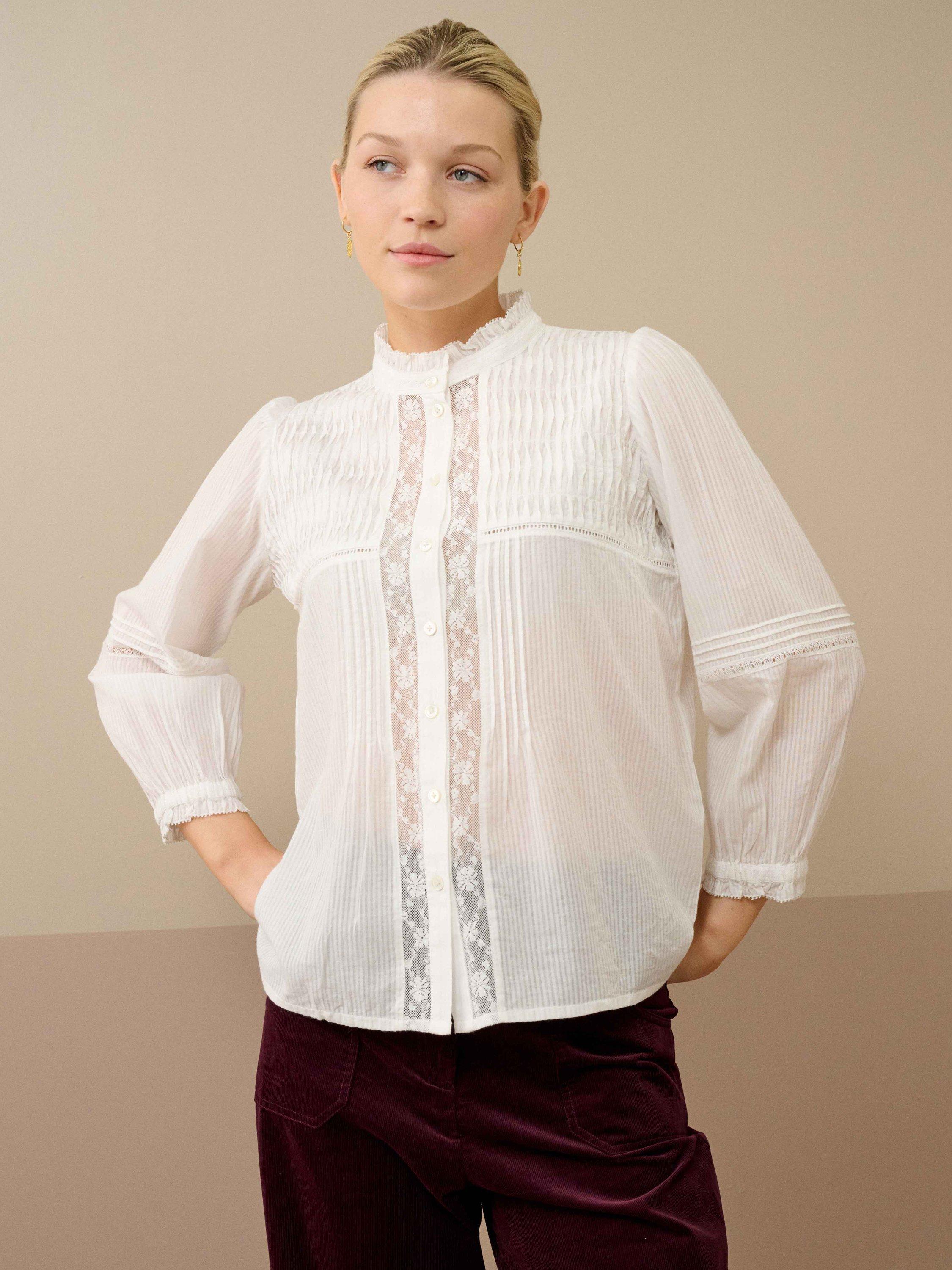 Made from breathable cotton fabric with a subtle stripe, this feminine blouse beautifully combines horizontal, vertical and twisted pintucks with statement, vintage-inspired lace panels and eyelash-trim frills.