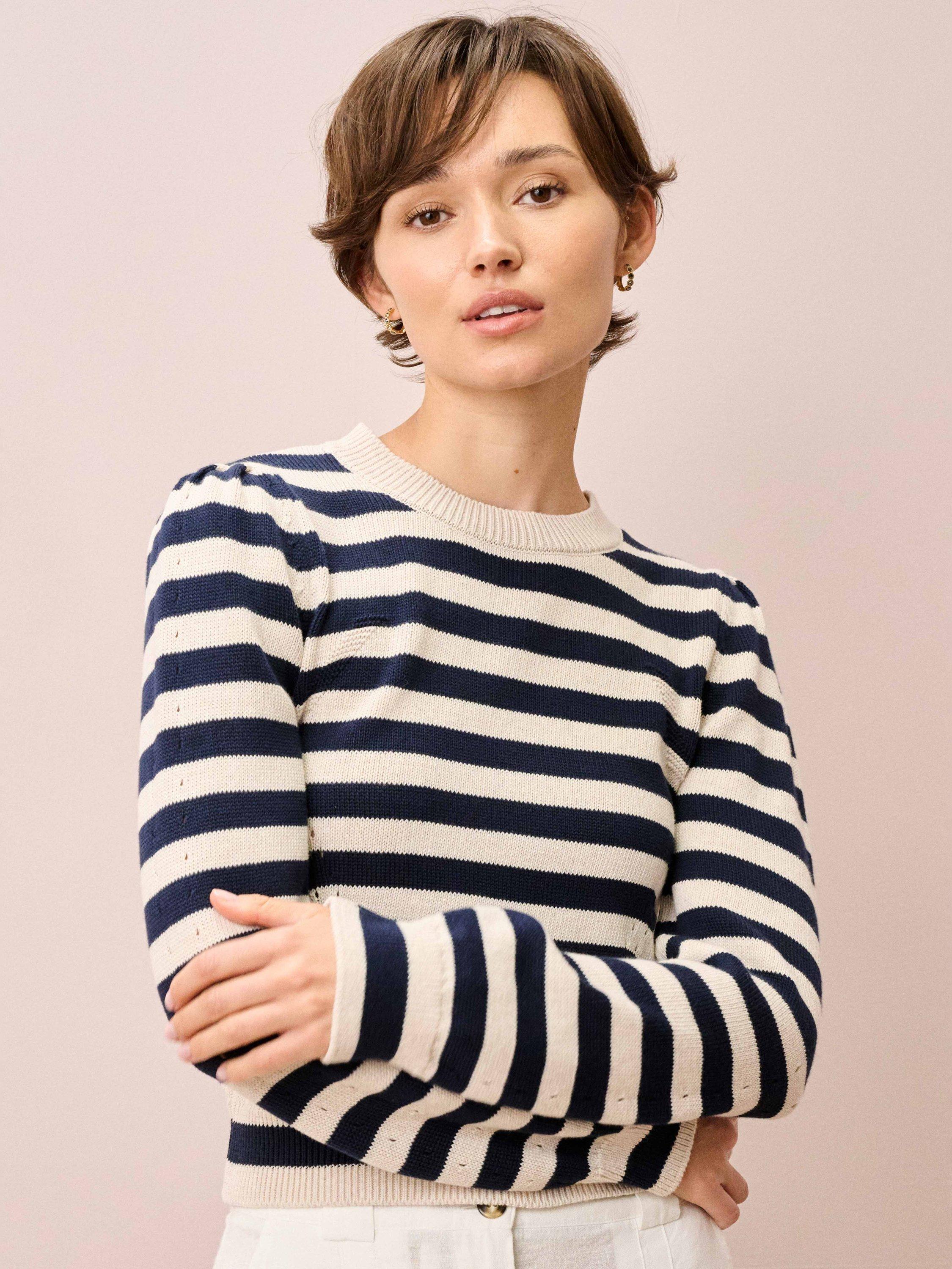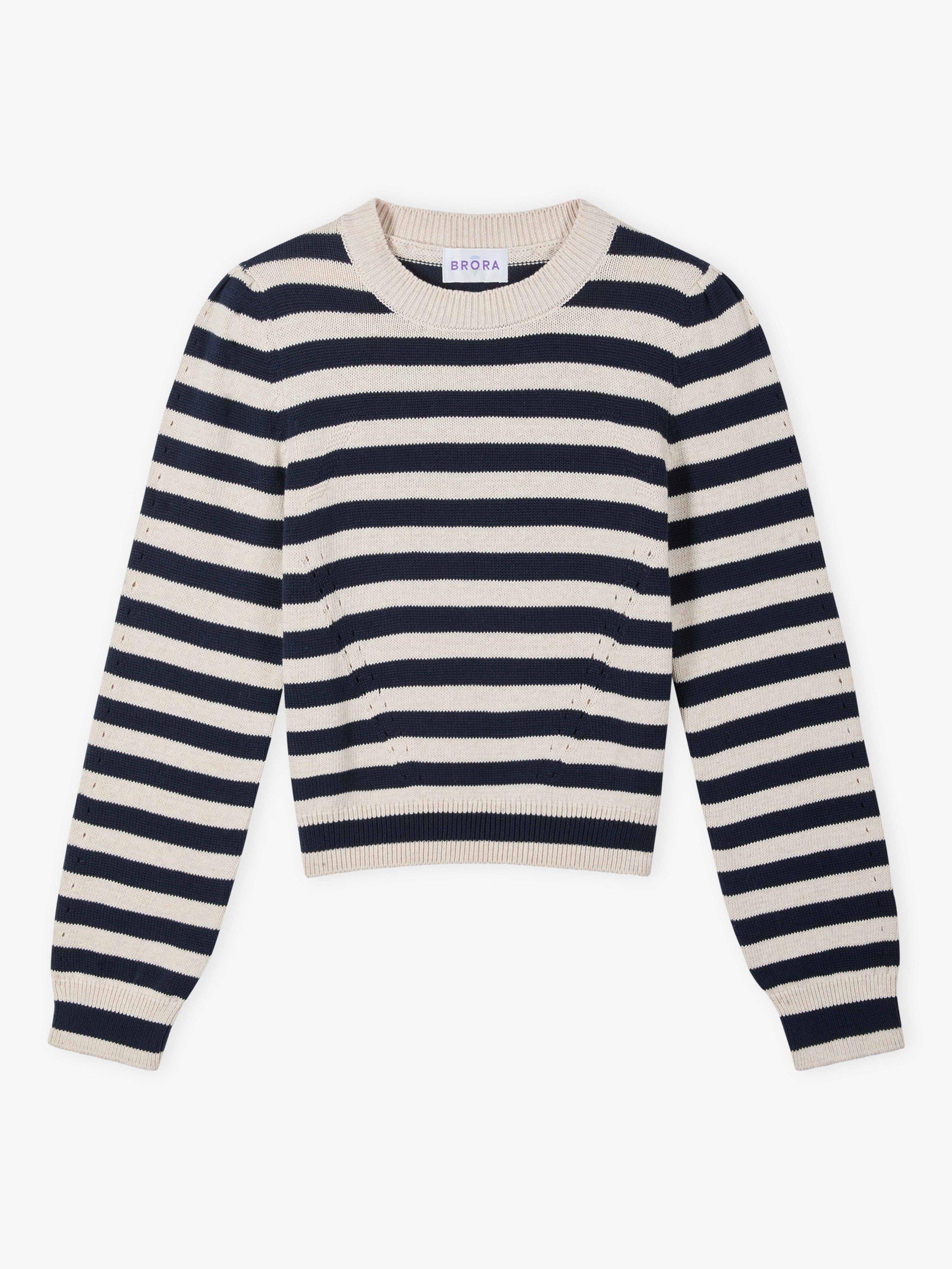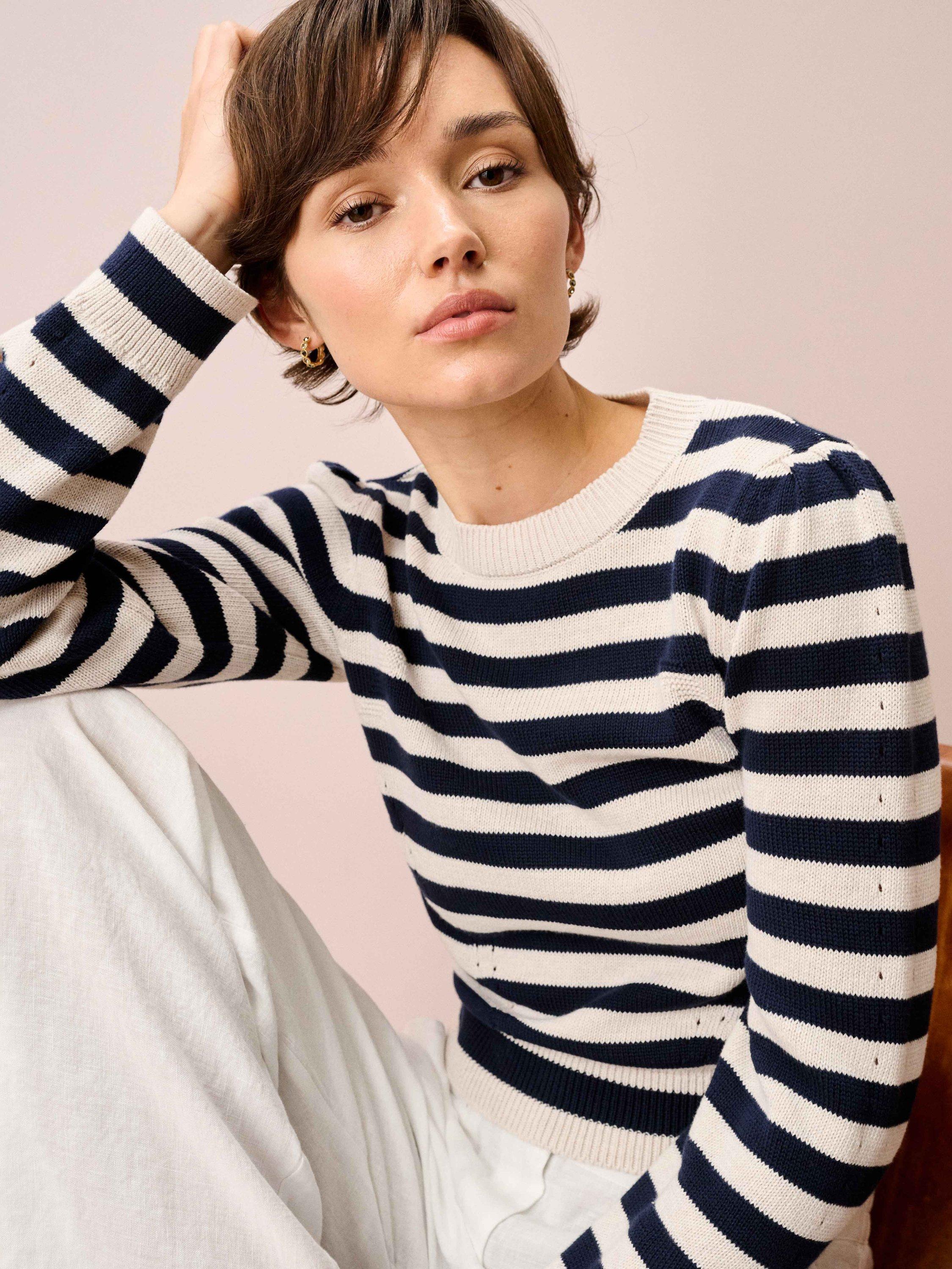A timeless staple with a Brora twist, this jumper has been spun and knitted in Portugal from fine-gauge cotton, with a Breton-esque stripe design, colour-block trims and pointelle details.