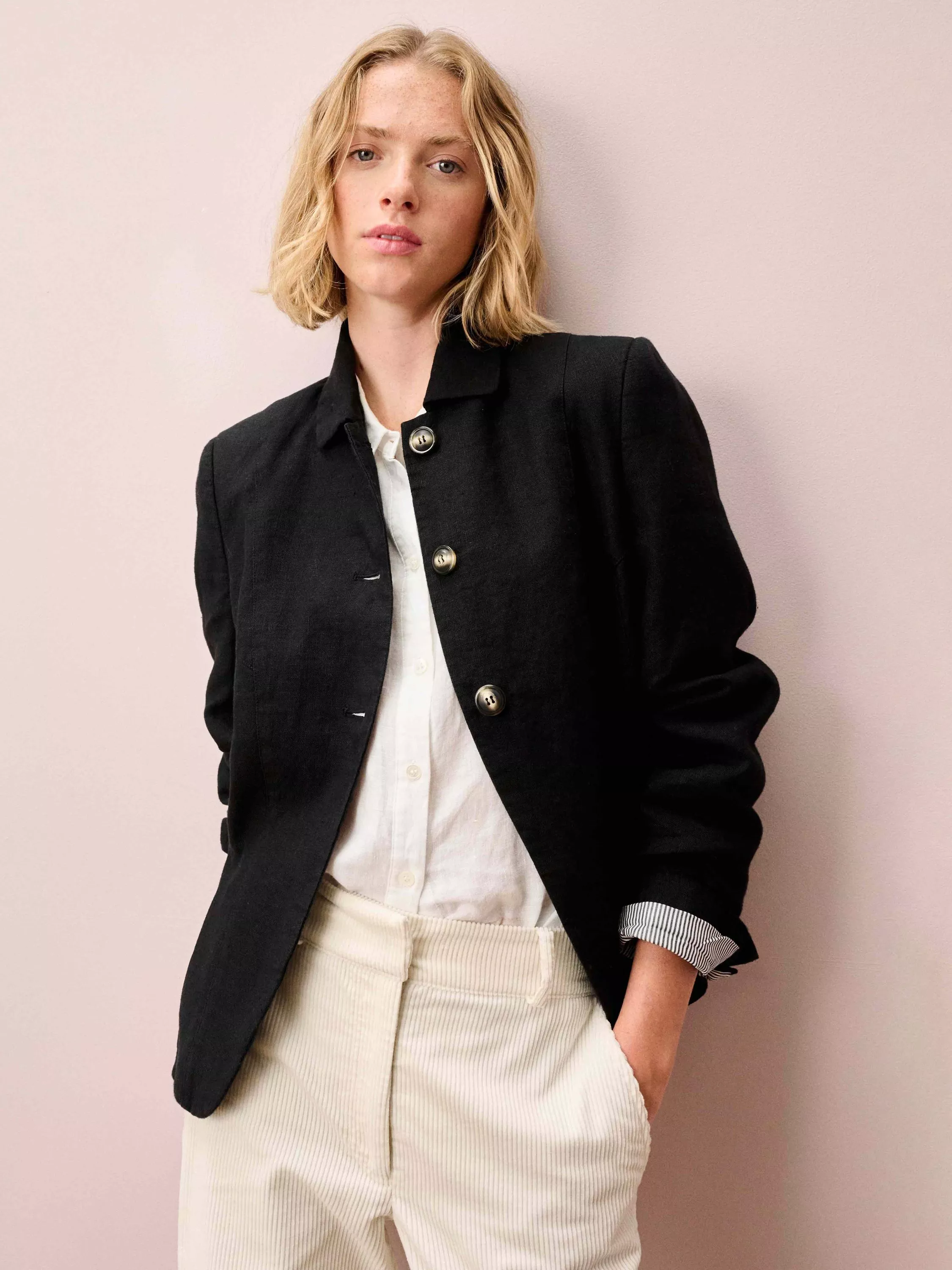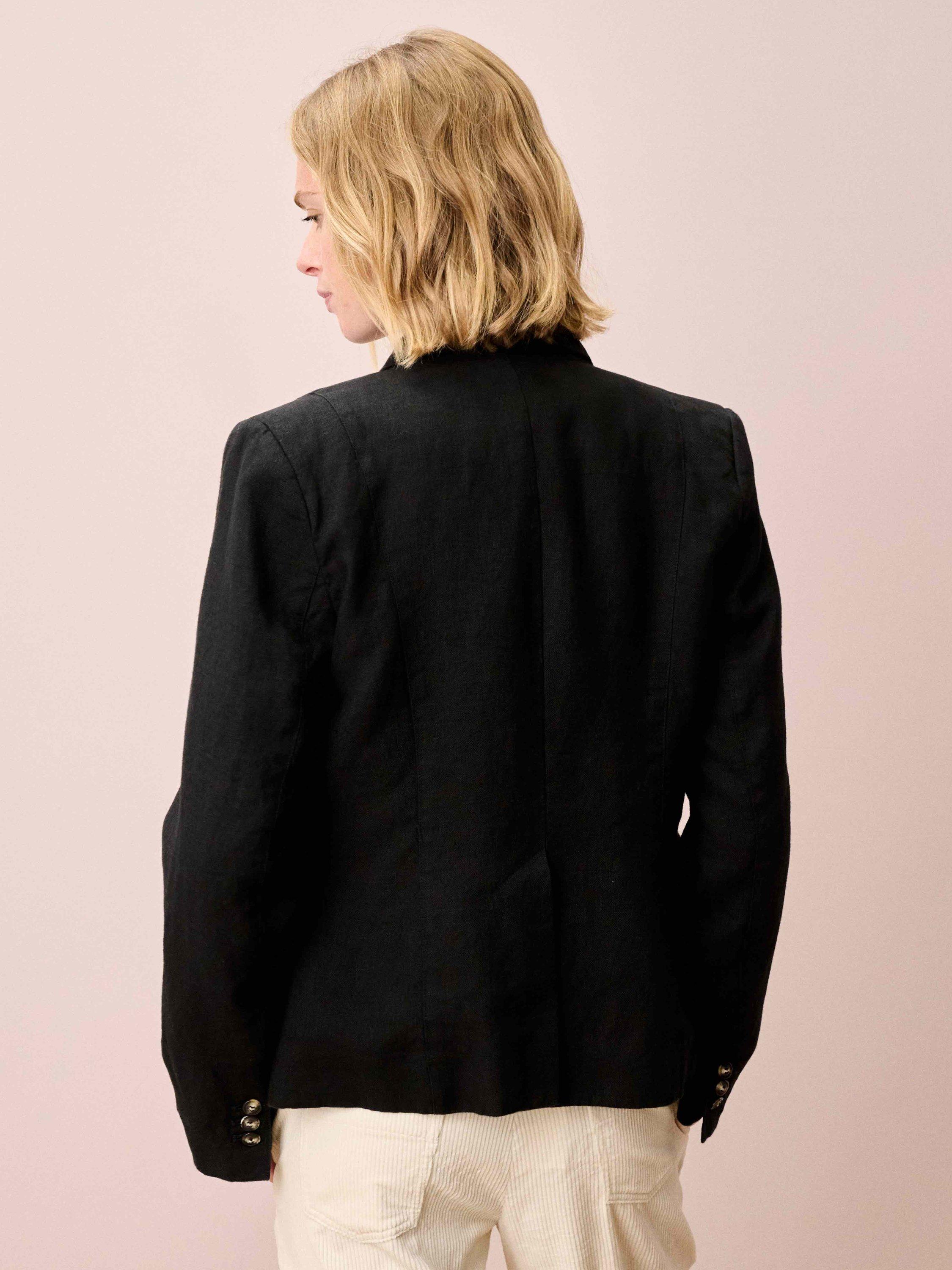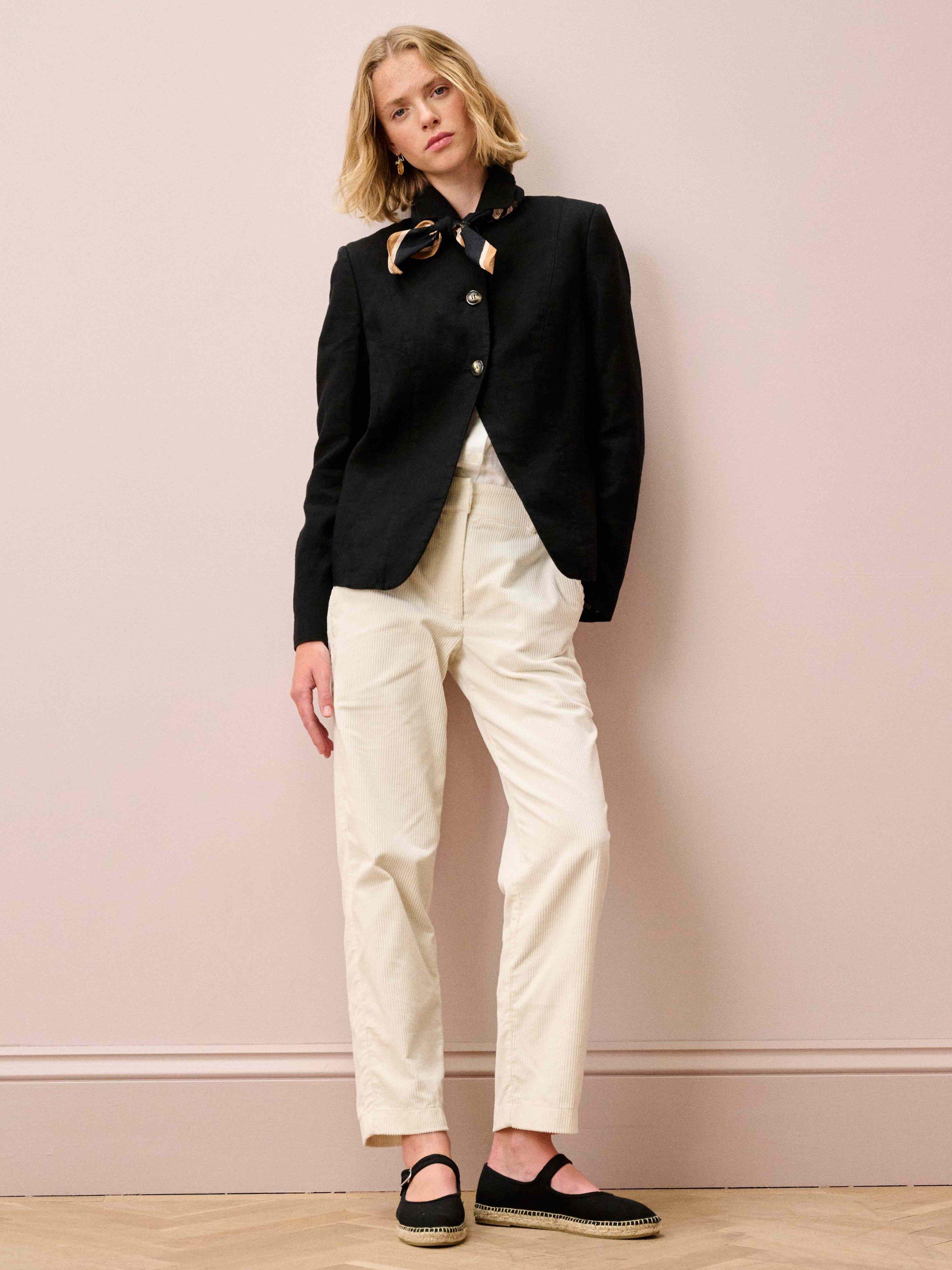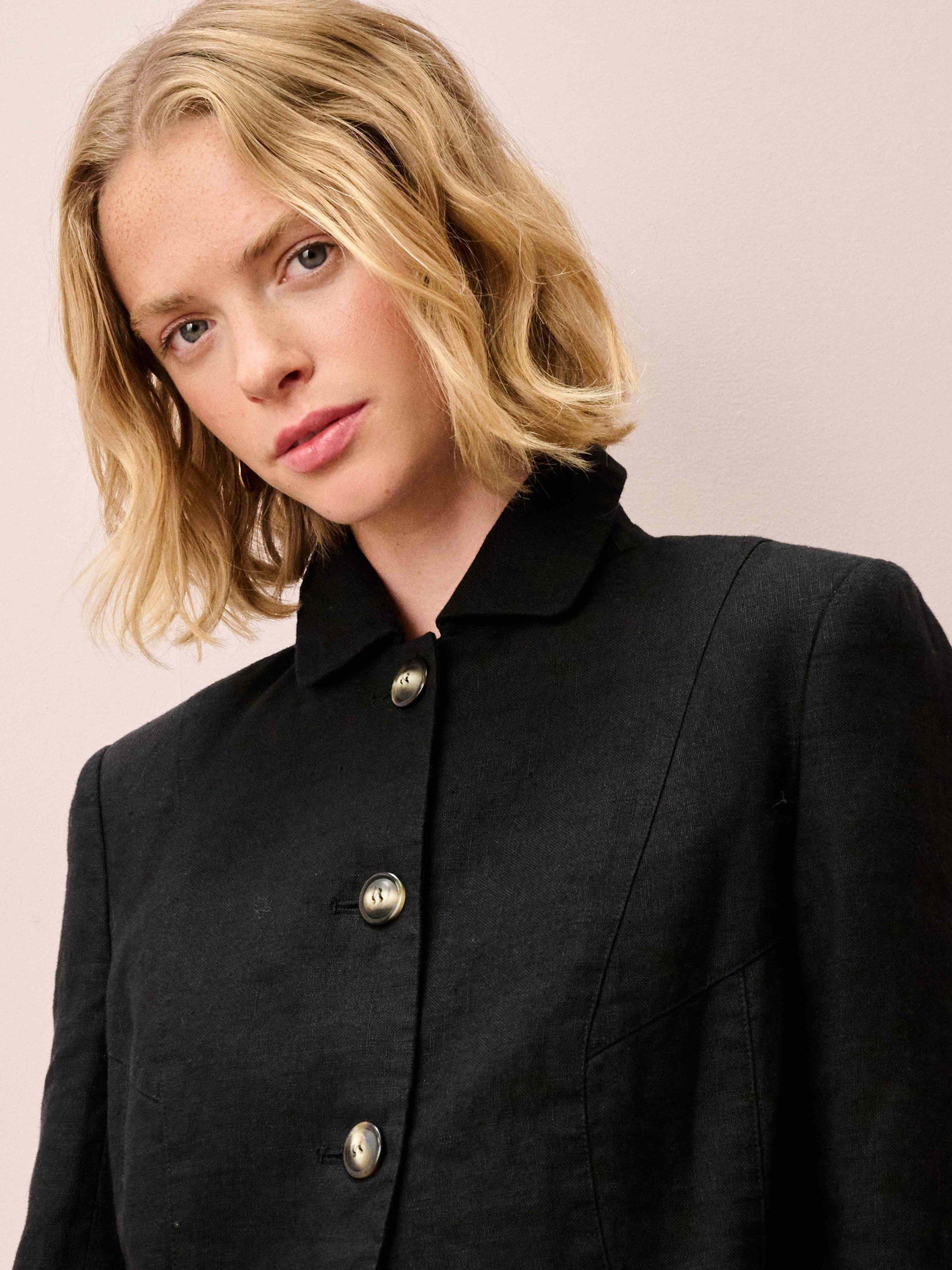 This Washed Linen Jacket features a unique, Brora-exclusive shape with a curved front hem.