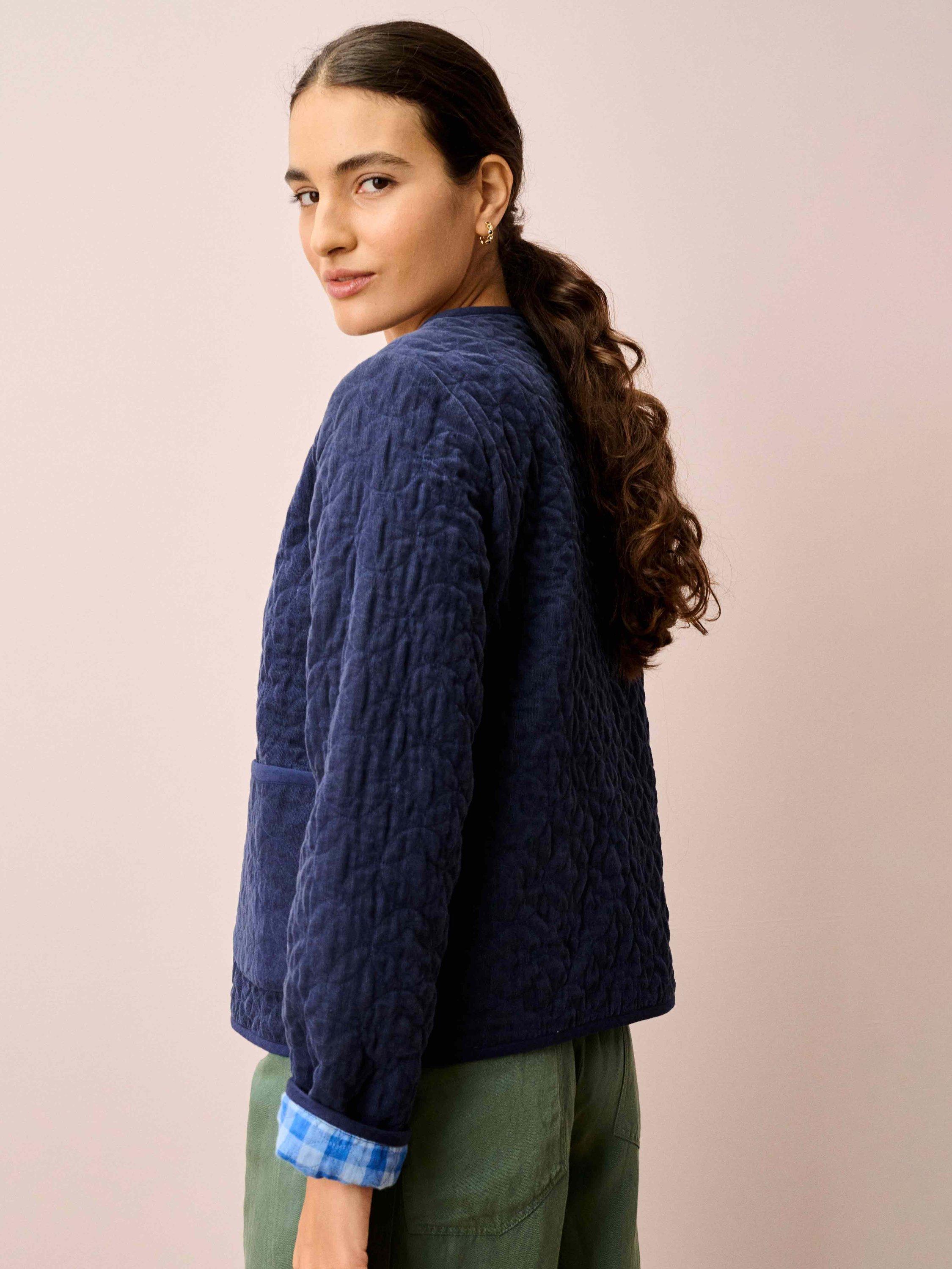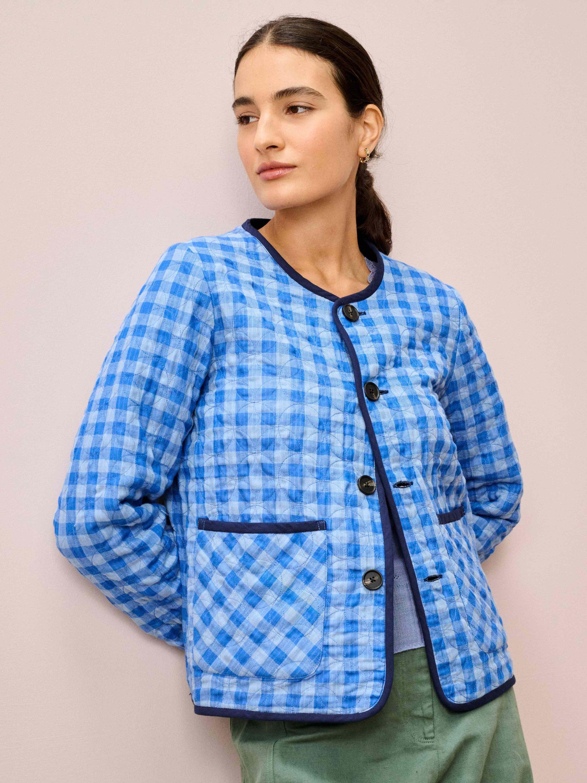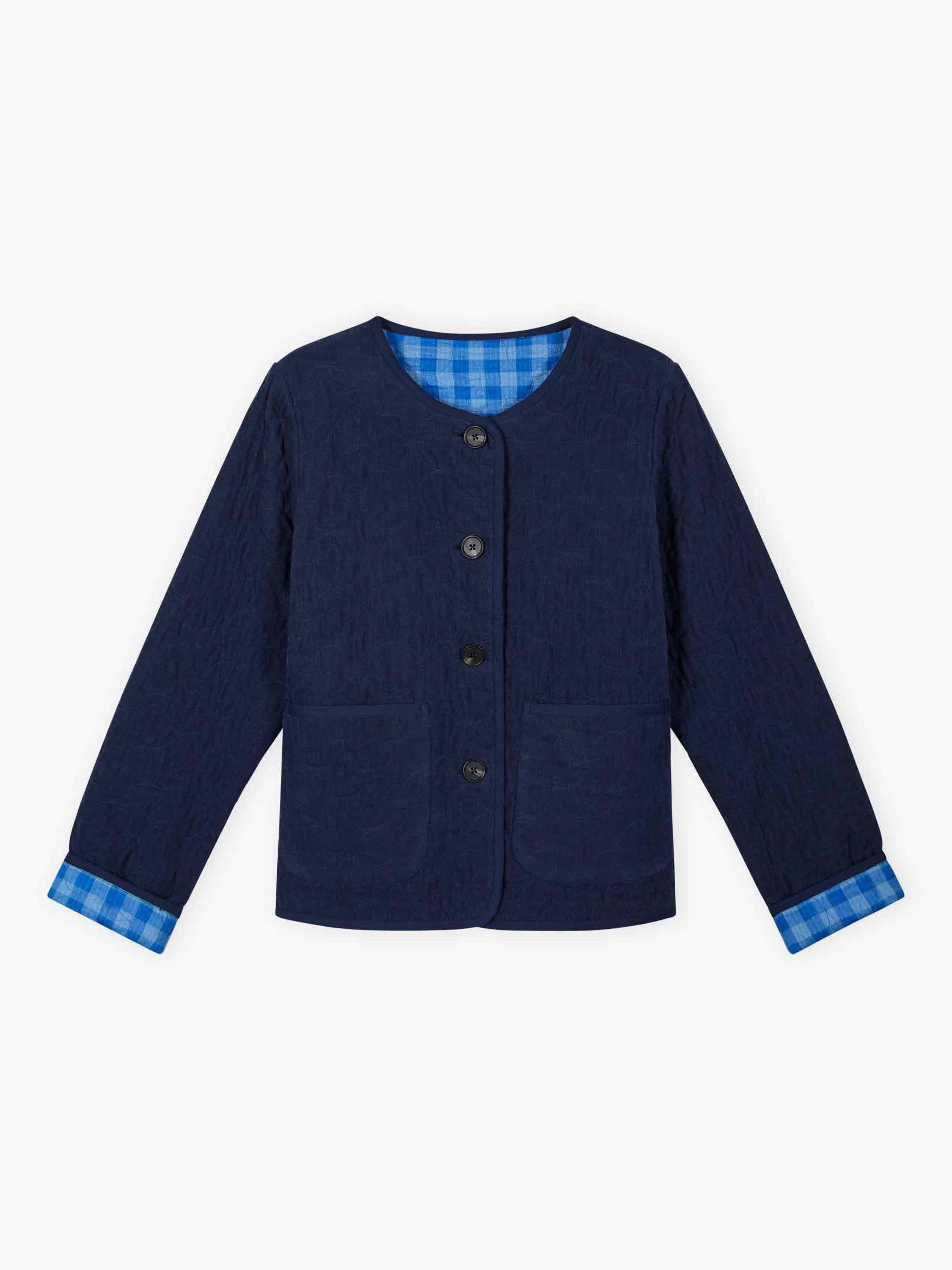 This cotton jacket features an all-over cord with circular quilting, binding on the edges and patch pockets, but with the added twist of being fully reversible, sporting a colourful gingham check on the other side.