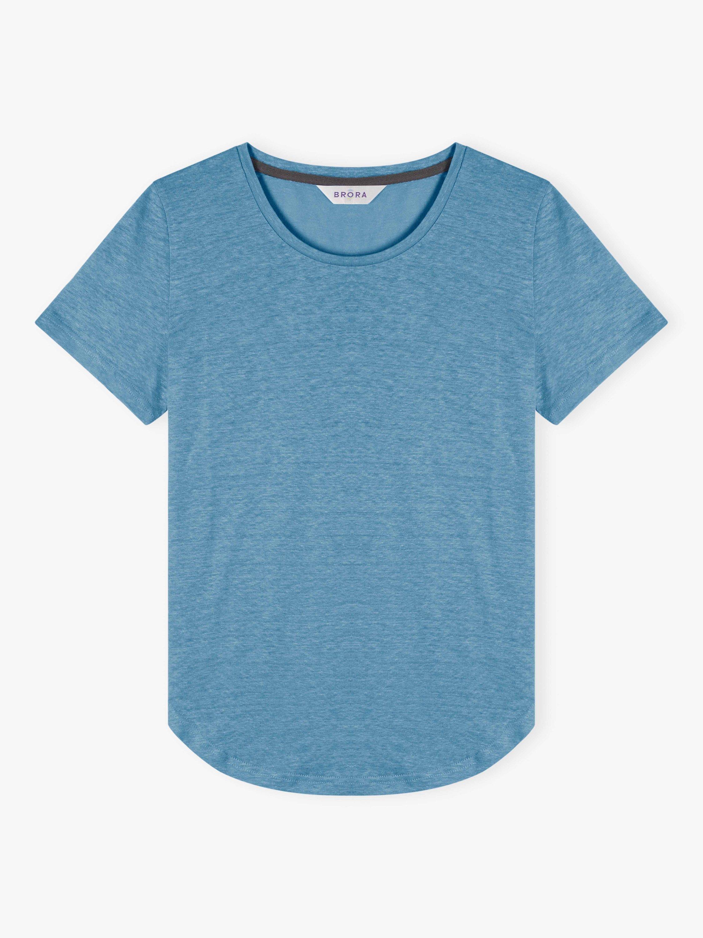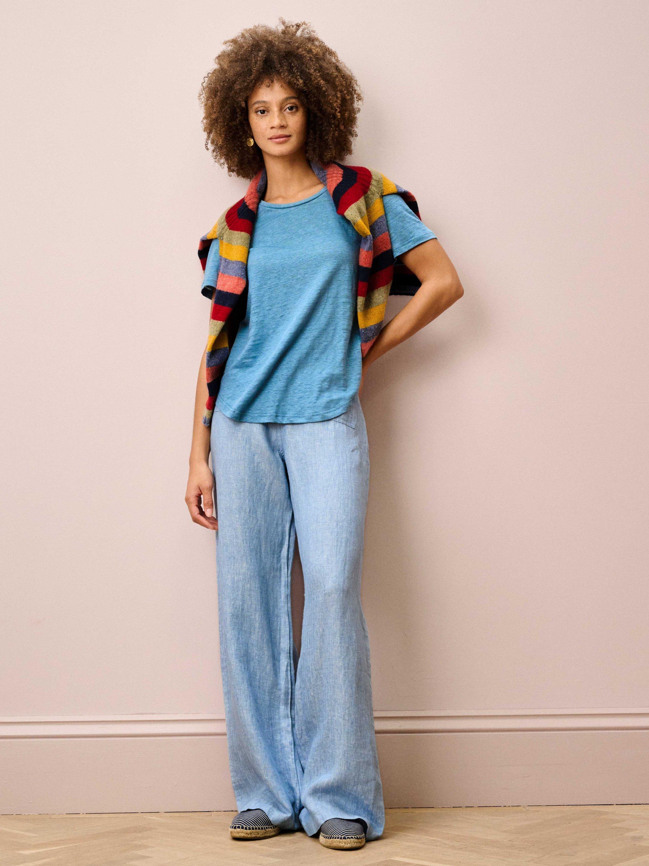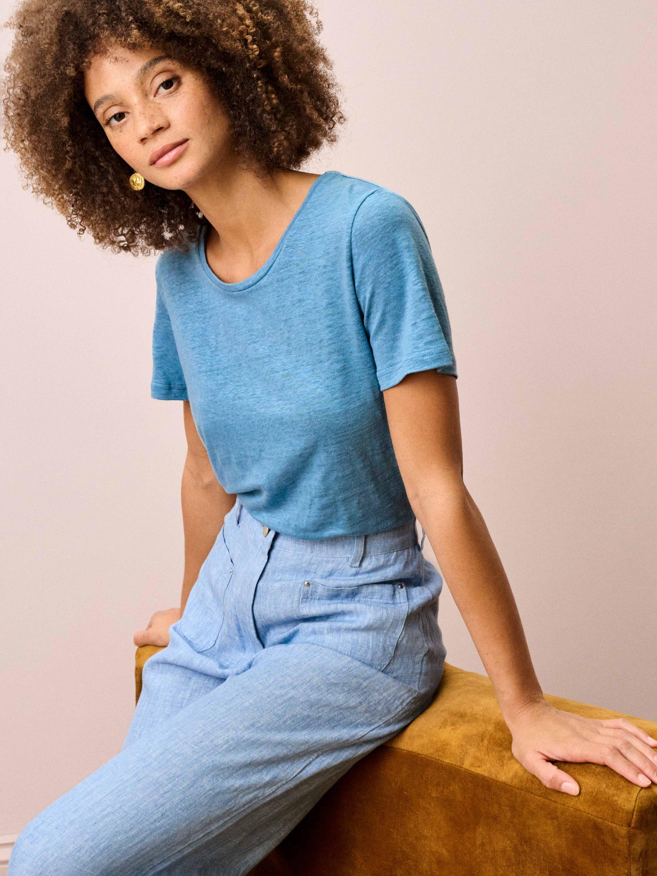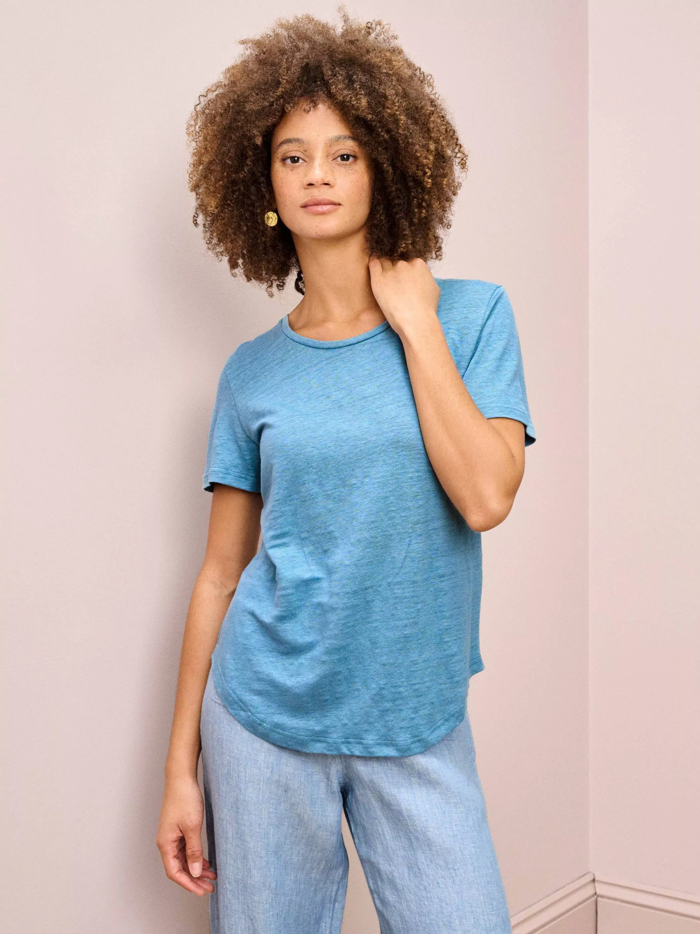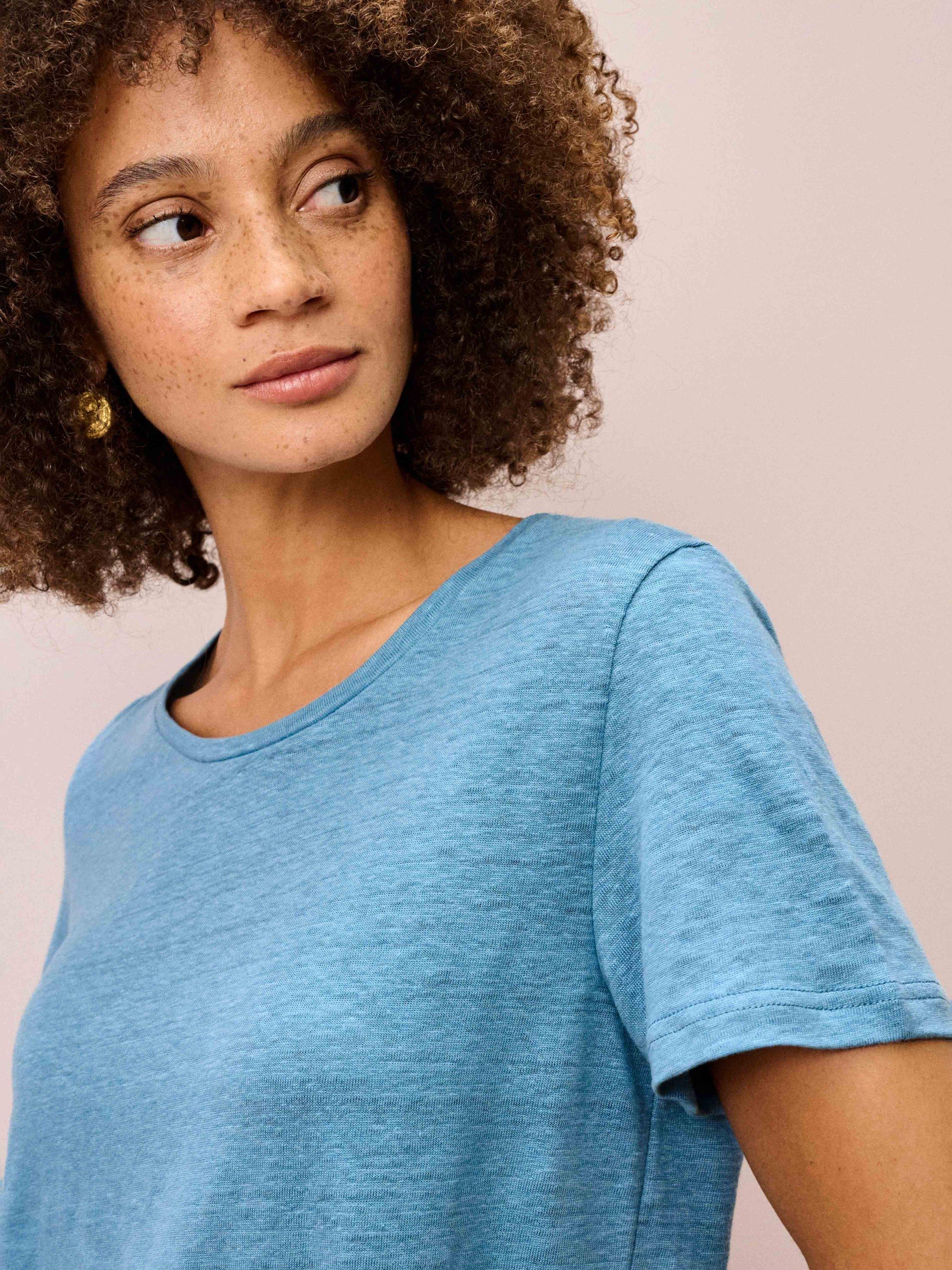 A pure linen t-shirt featuring a rounded neckline, short sleeves and a curved hemline.