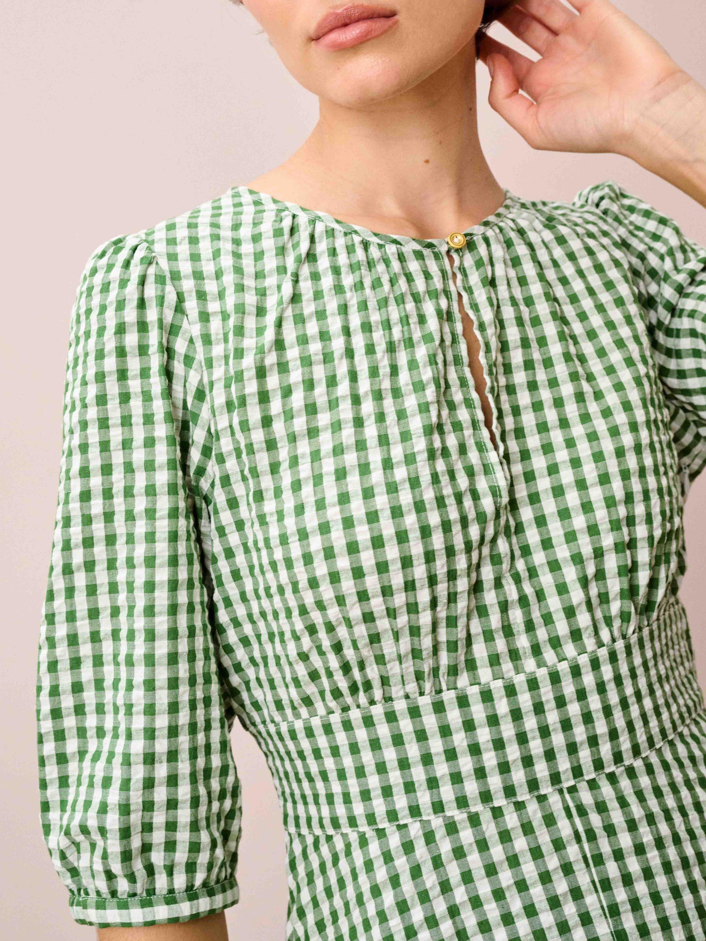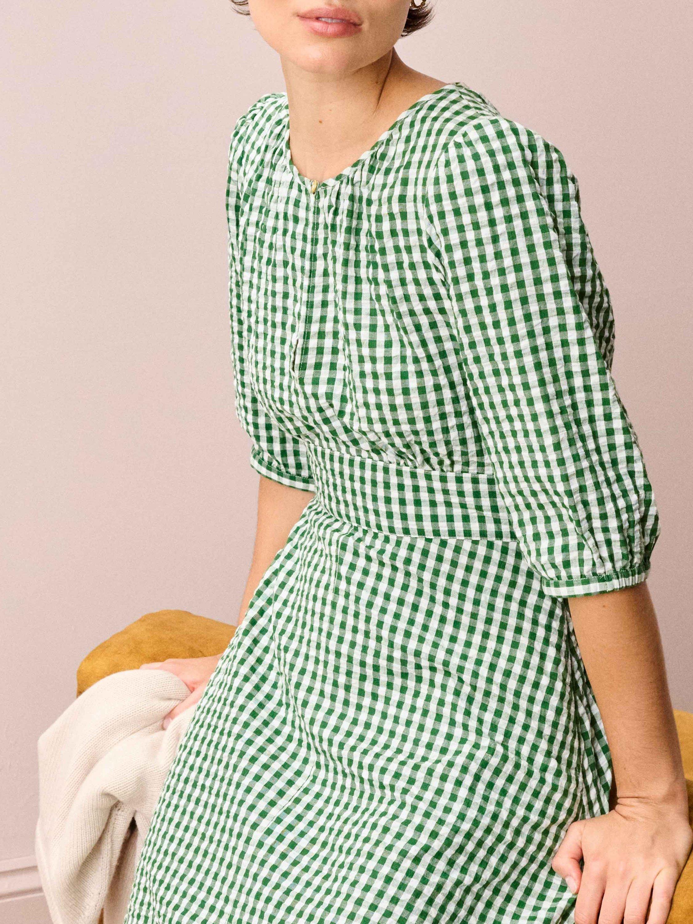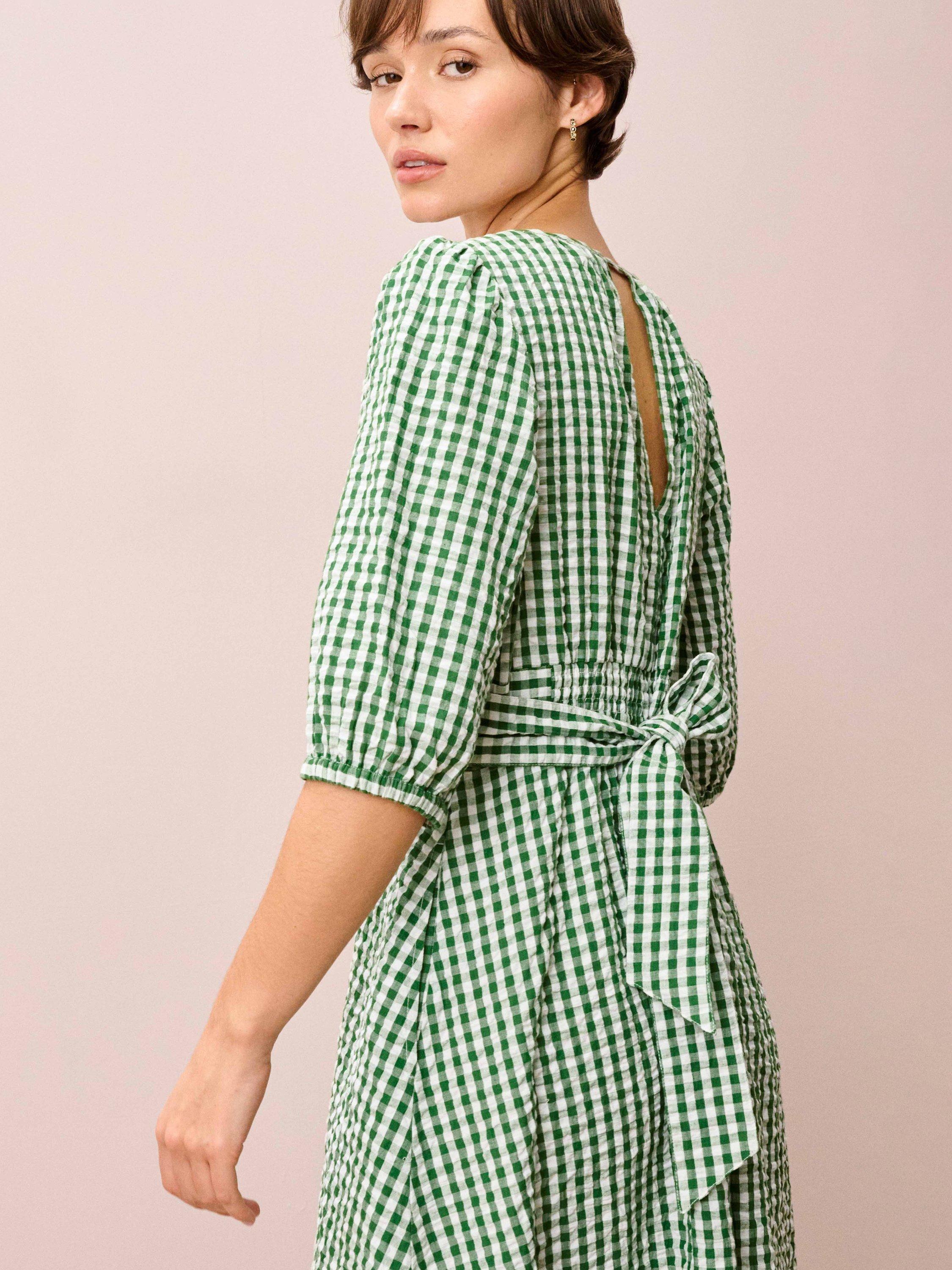 This cotton seersucker dress is destined to win you over with its gingham pattern, flattering belted waist, three-quarter-length sleeves, accent button and keyhole details on both the front and back.