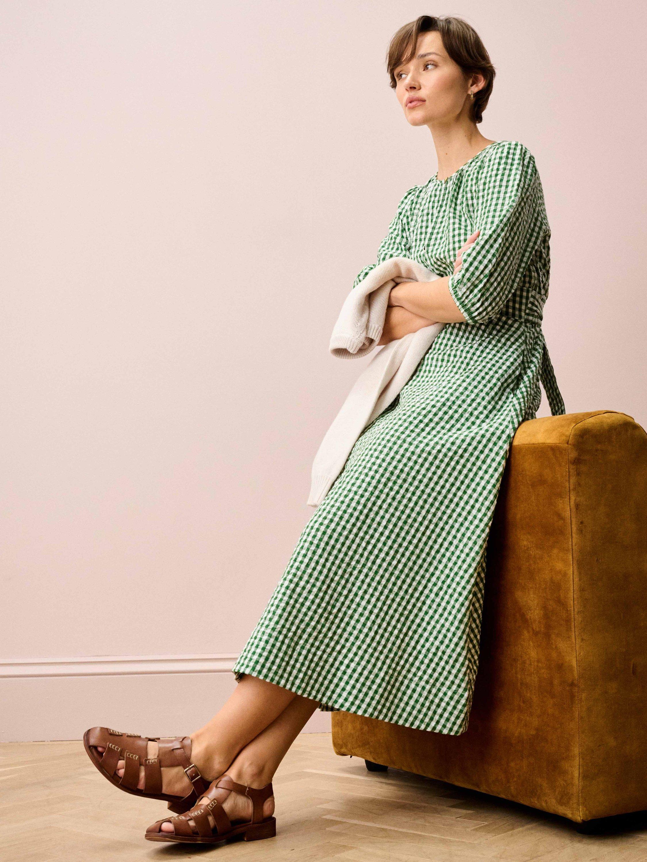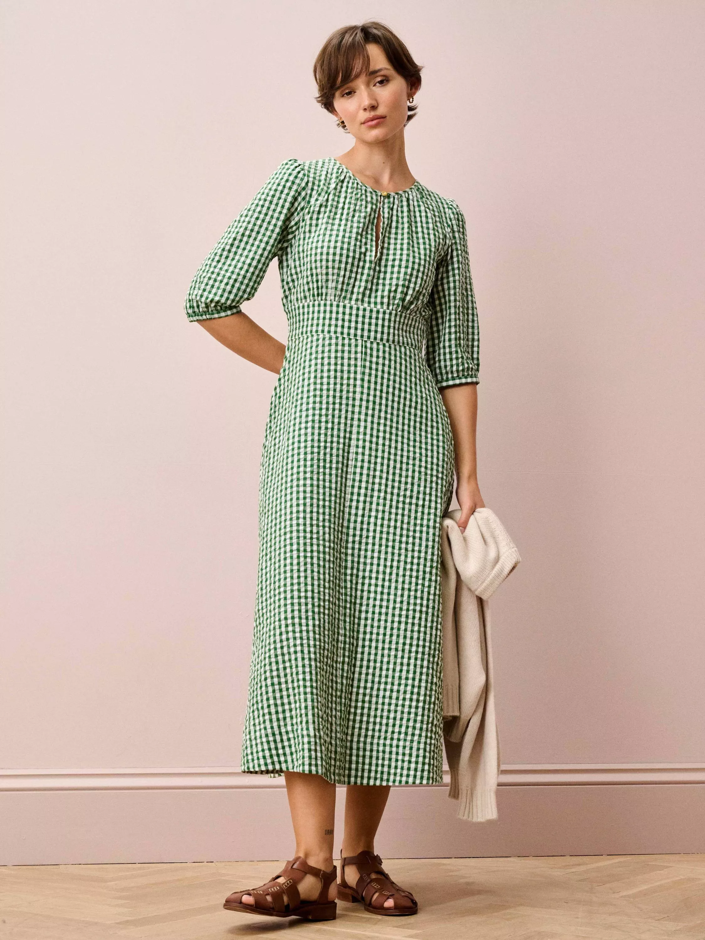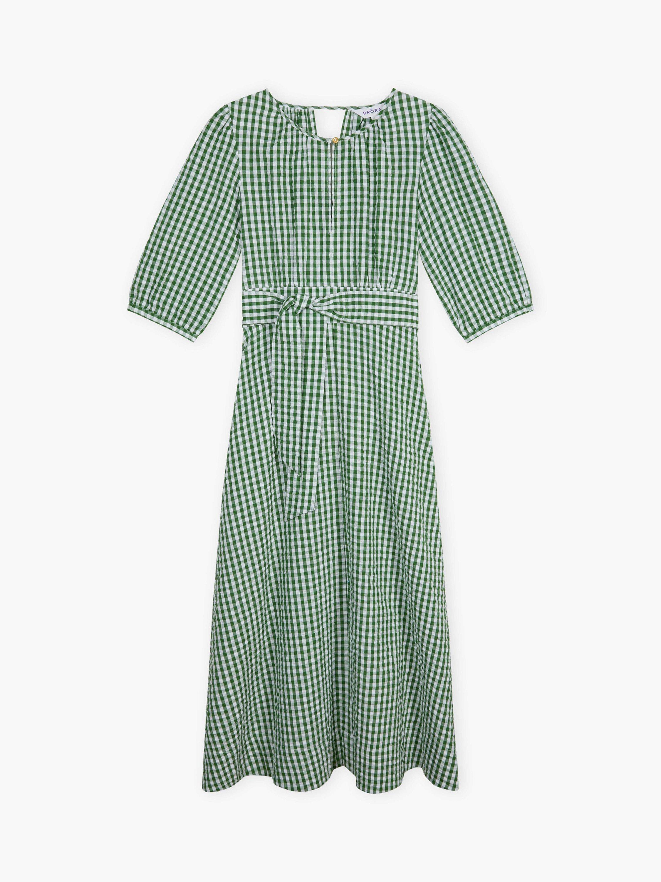This cotton seersucker dress is destined to win you over with its gingham pattern, flattering belted waist, three-quarter-length sleeves, accent button and keyhole details on both the front and back.