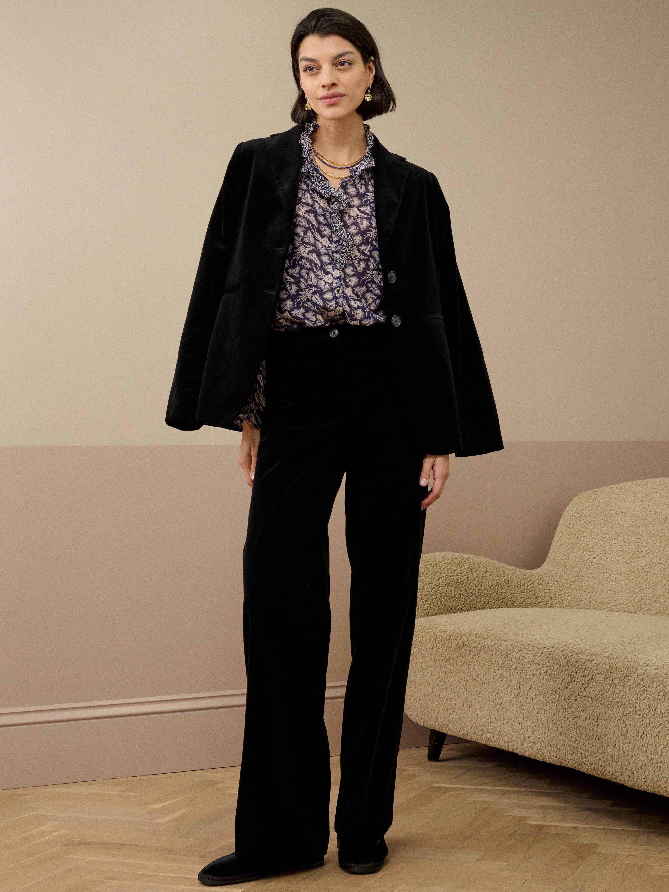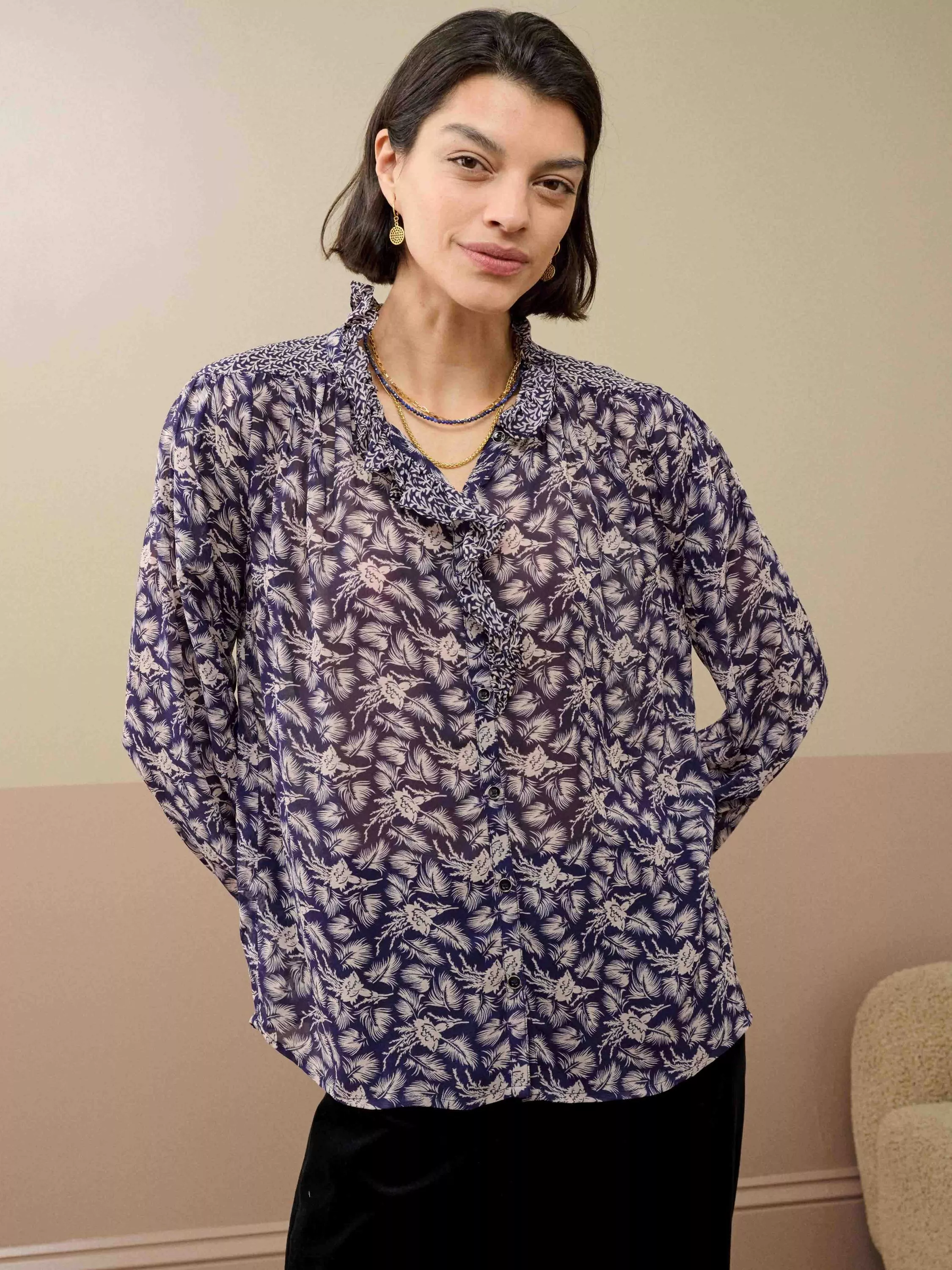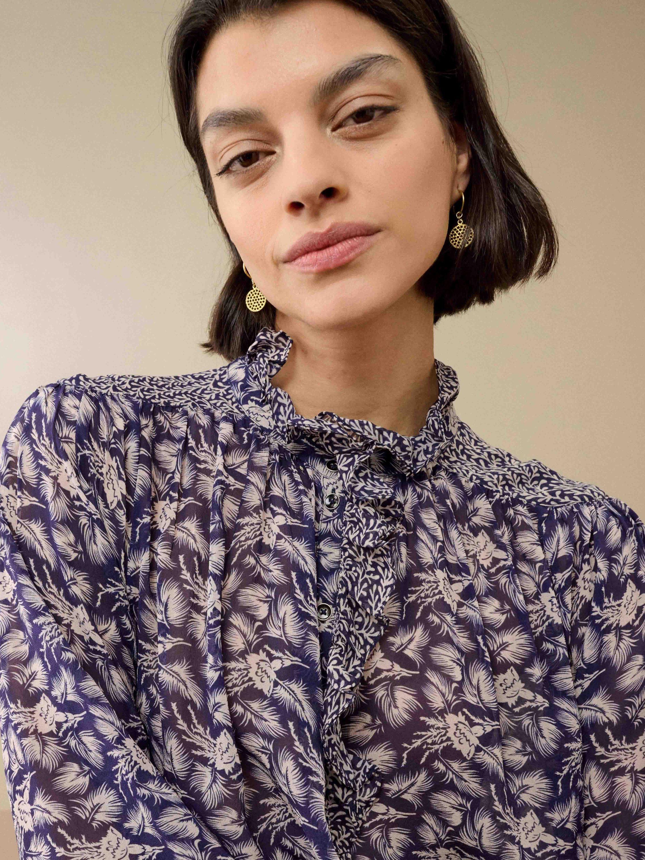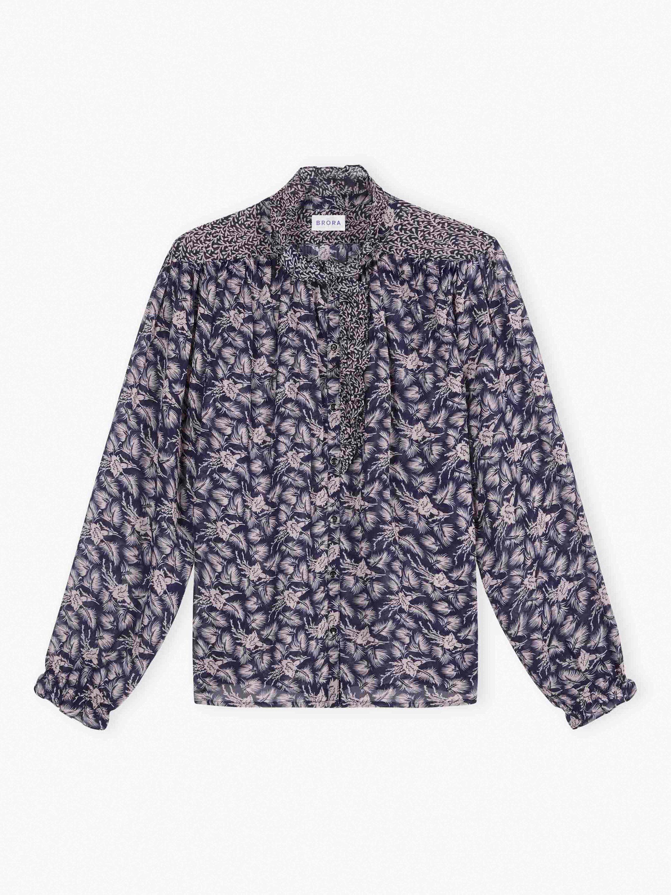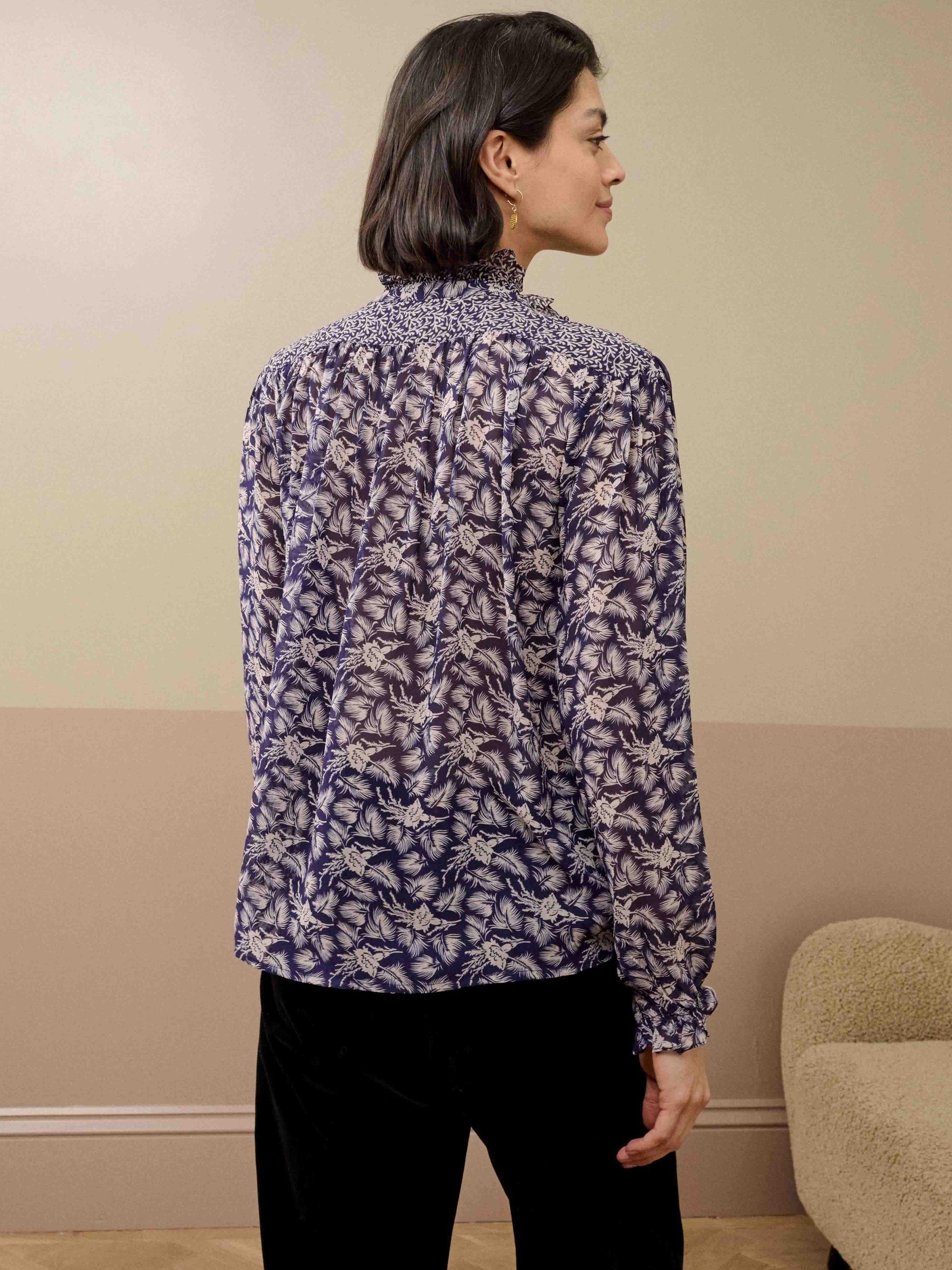 Made from sumptuous silk, this popular blouse is back in a colour-clashing patchwork design, with elasticated cuffs, charming metal buttons and a contrasting print on the frilled neckline and placket.