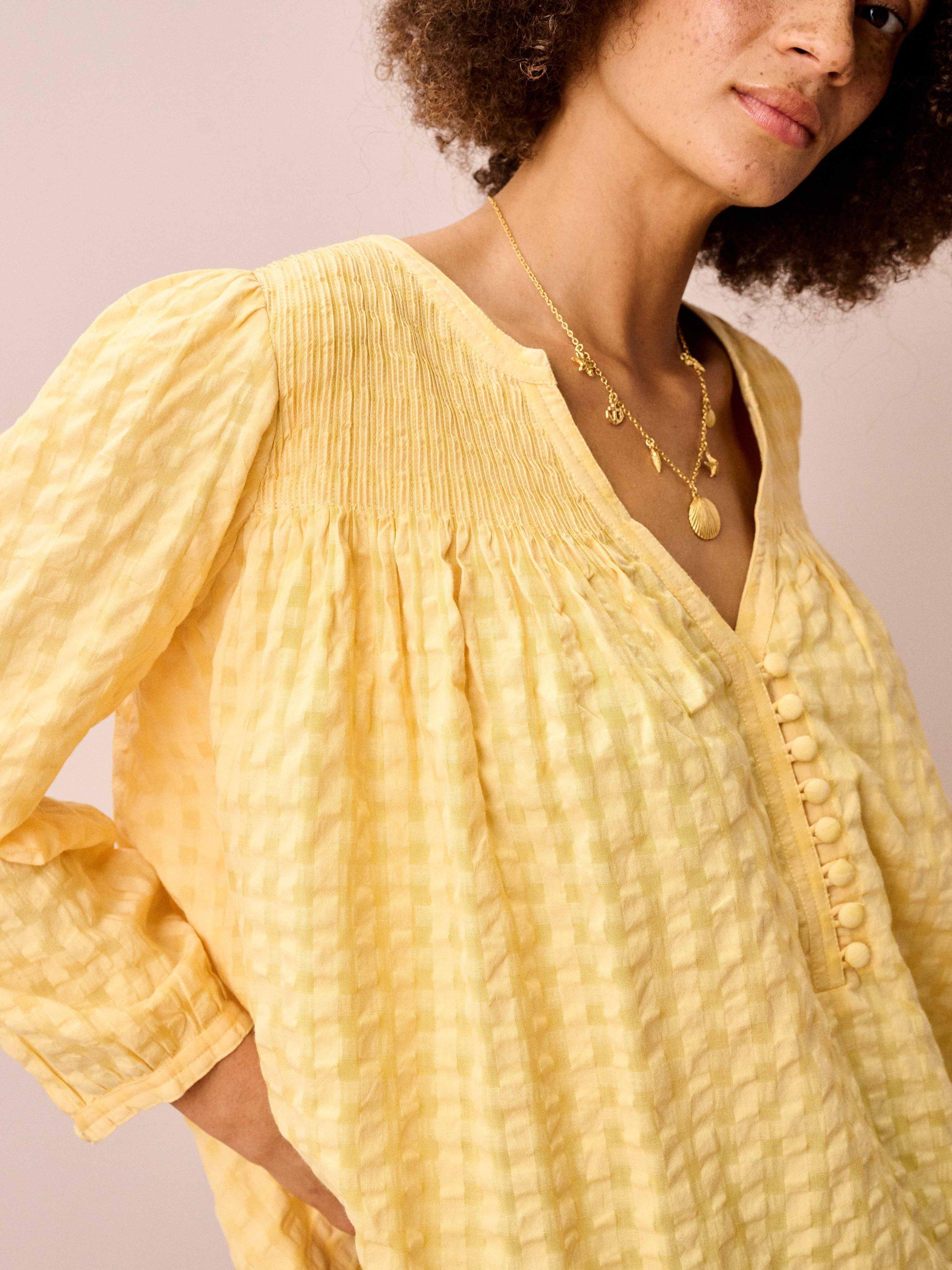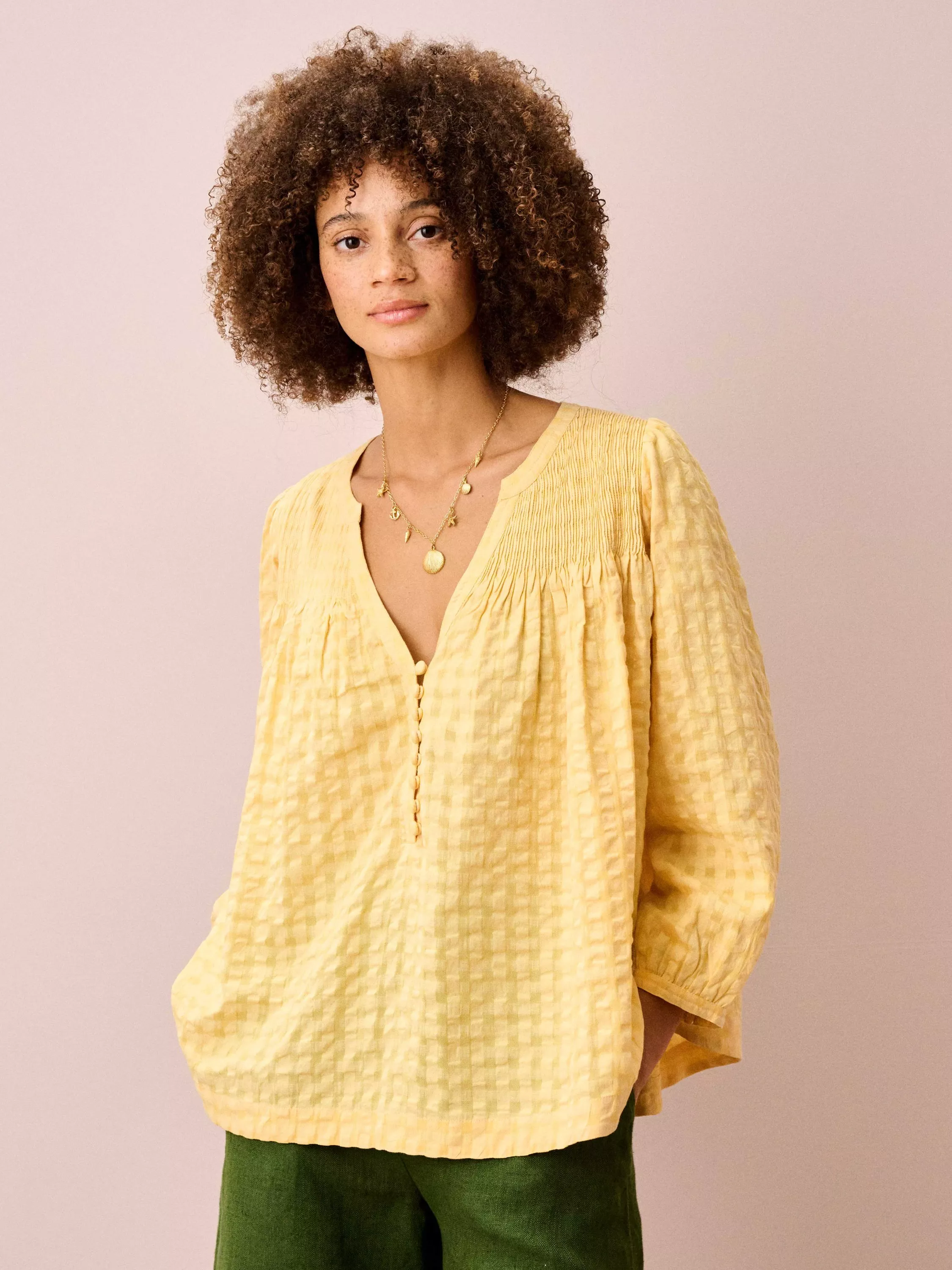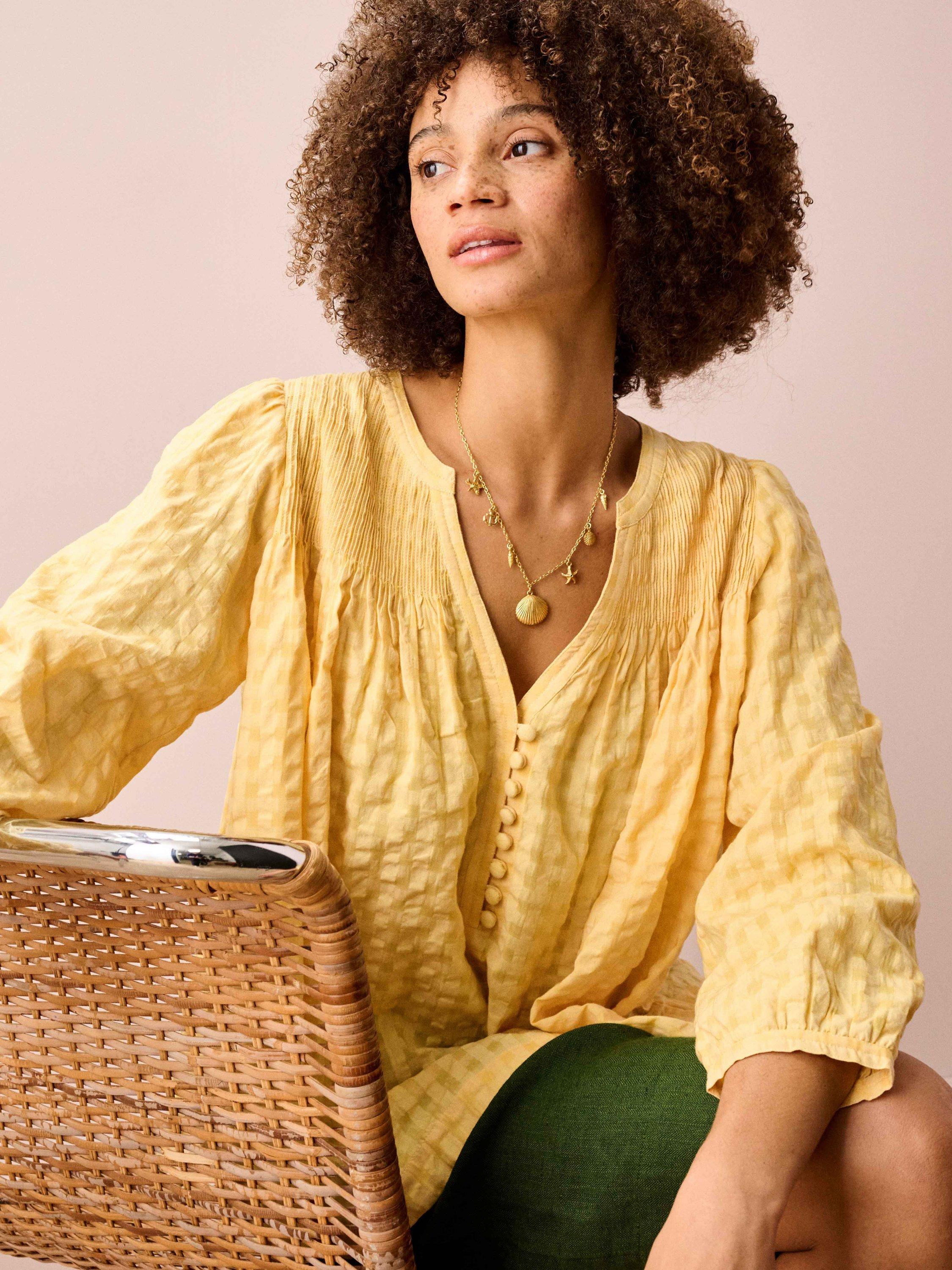 With a softly textured check finish and a relaxed V-neck, this floaty blouse brings an easy, breathable feel to warm summer days, while three-quarter sleeves add light coverage for in-between temperatures.