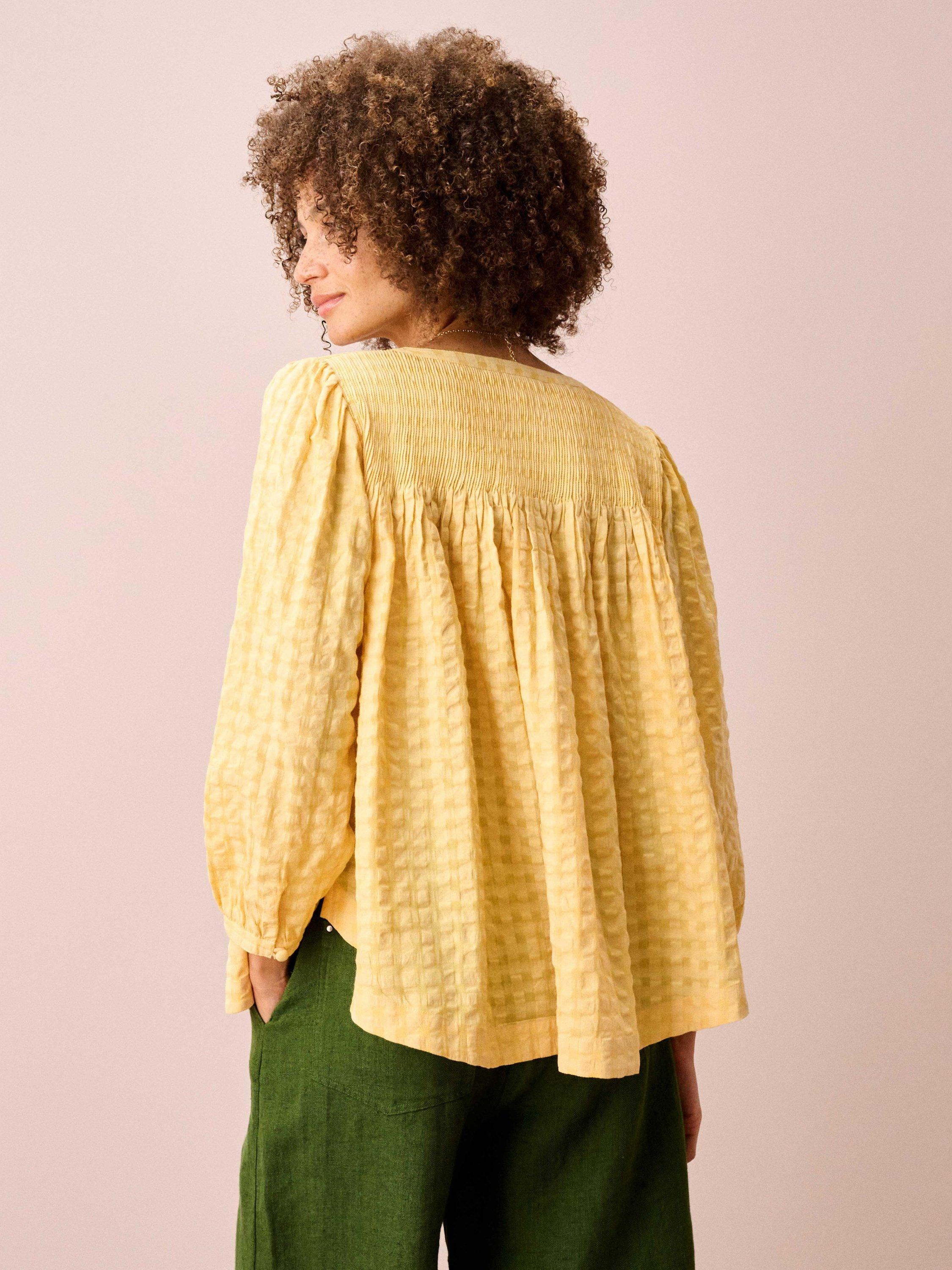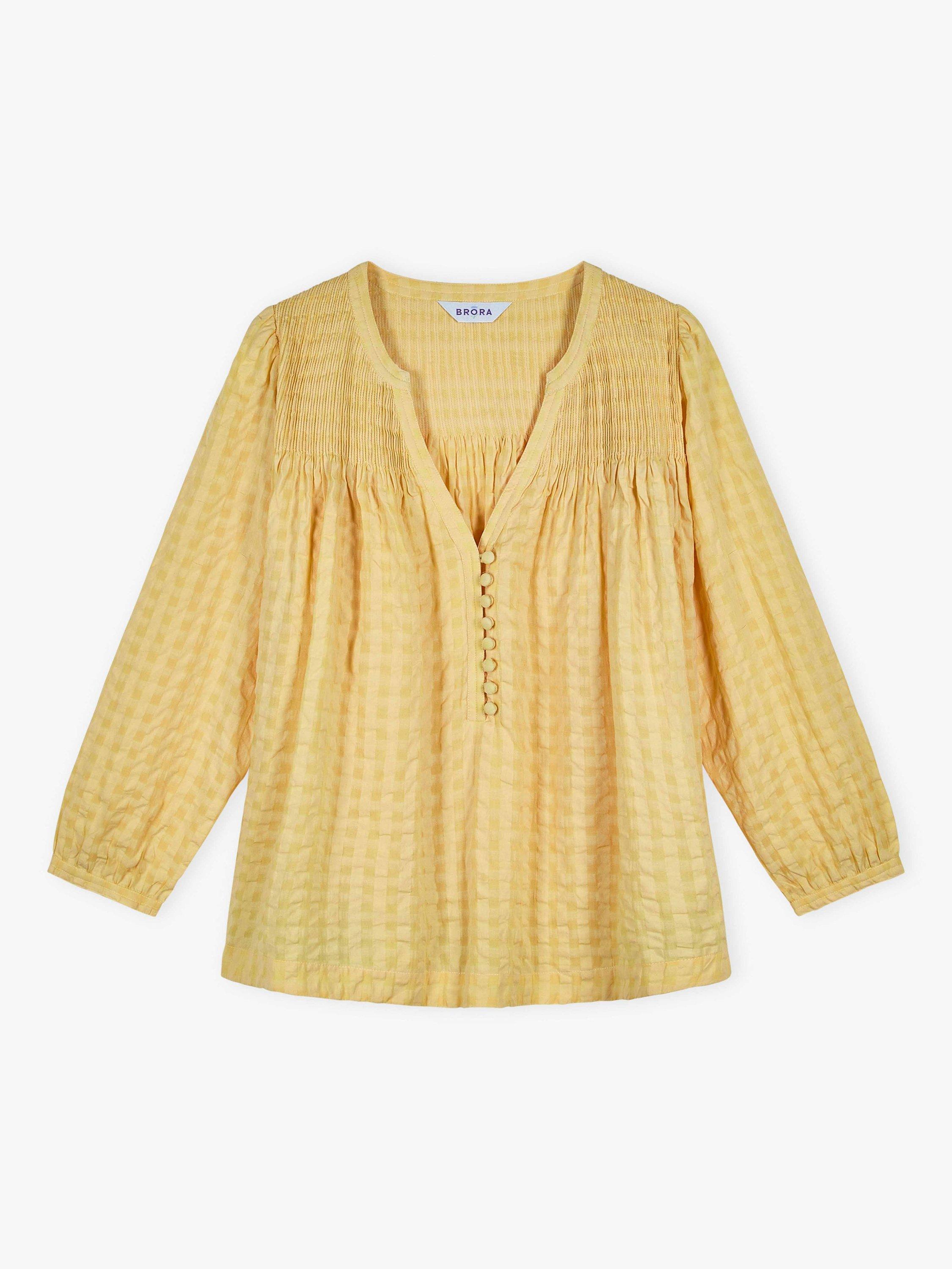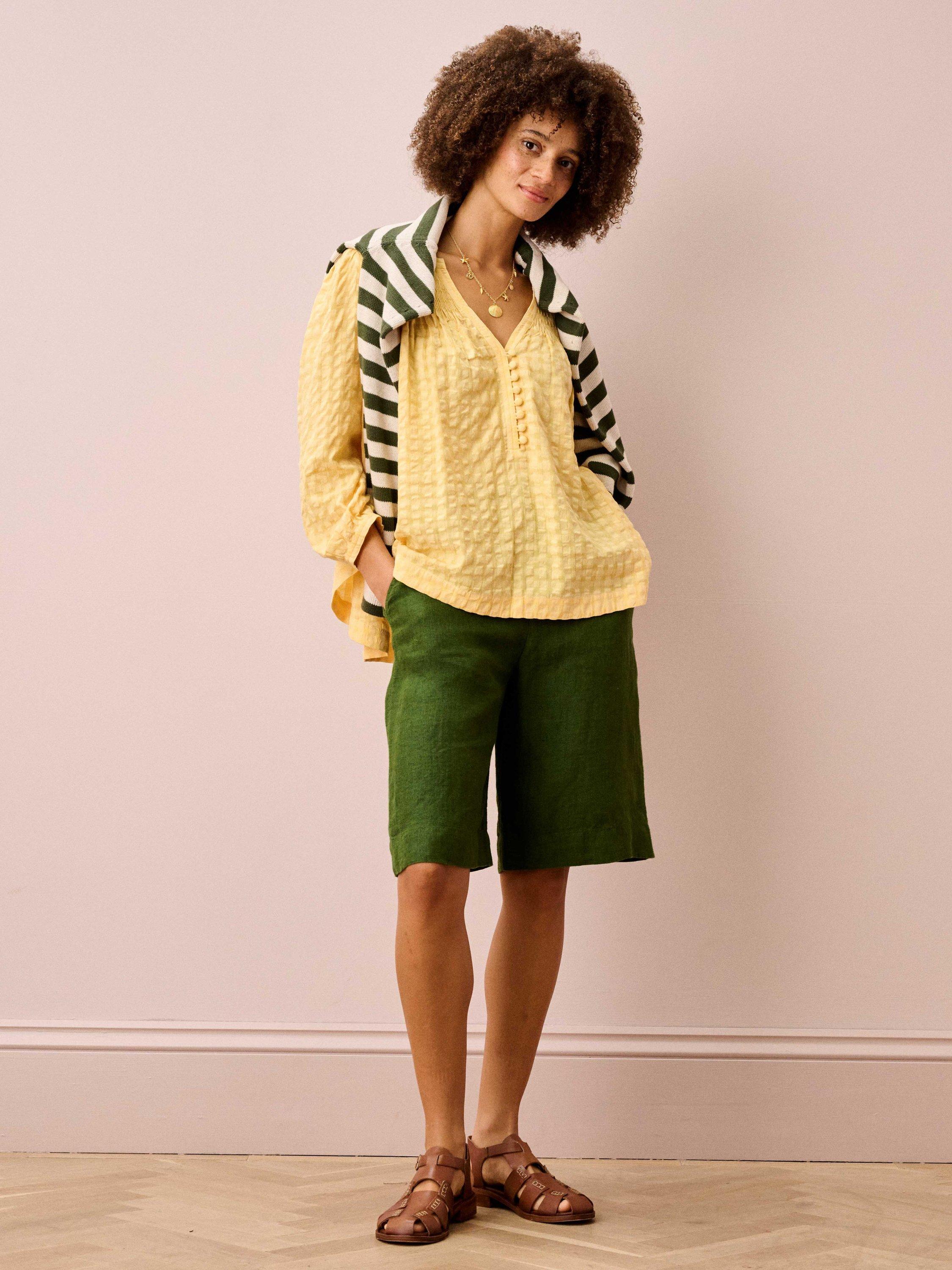 With a softly textured check finish and a relaxed V-neck, this floaty blouse brings an easy, breathable feel to warm summer days, while three-quarter sleeves add light coverage for in-between temperatures.