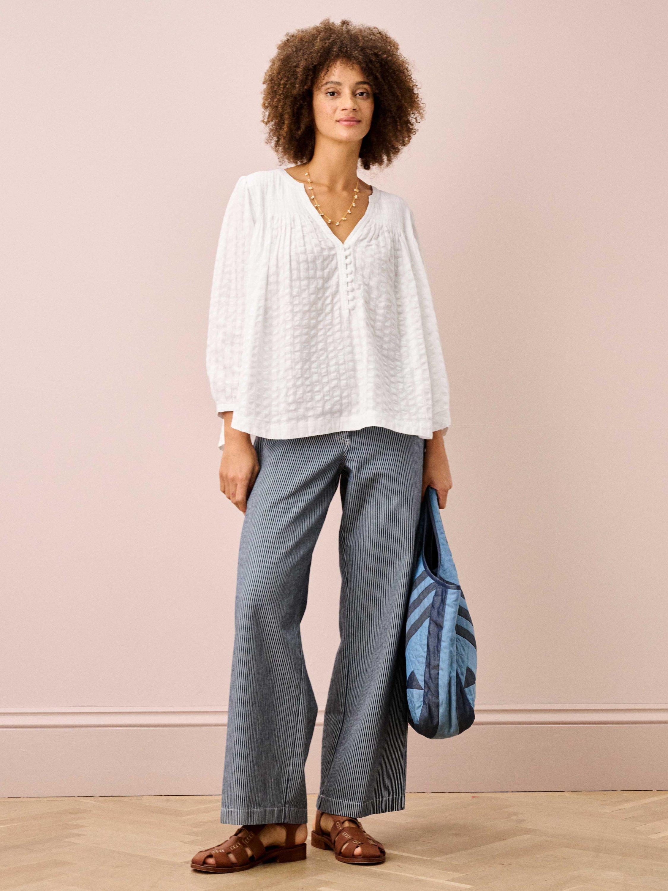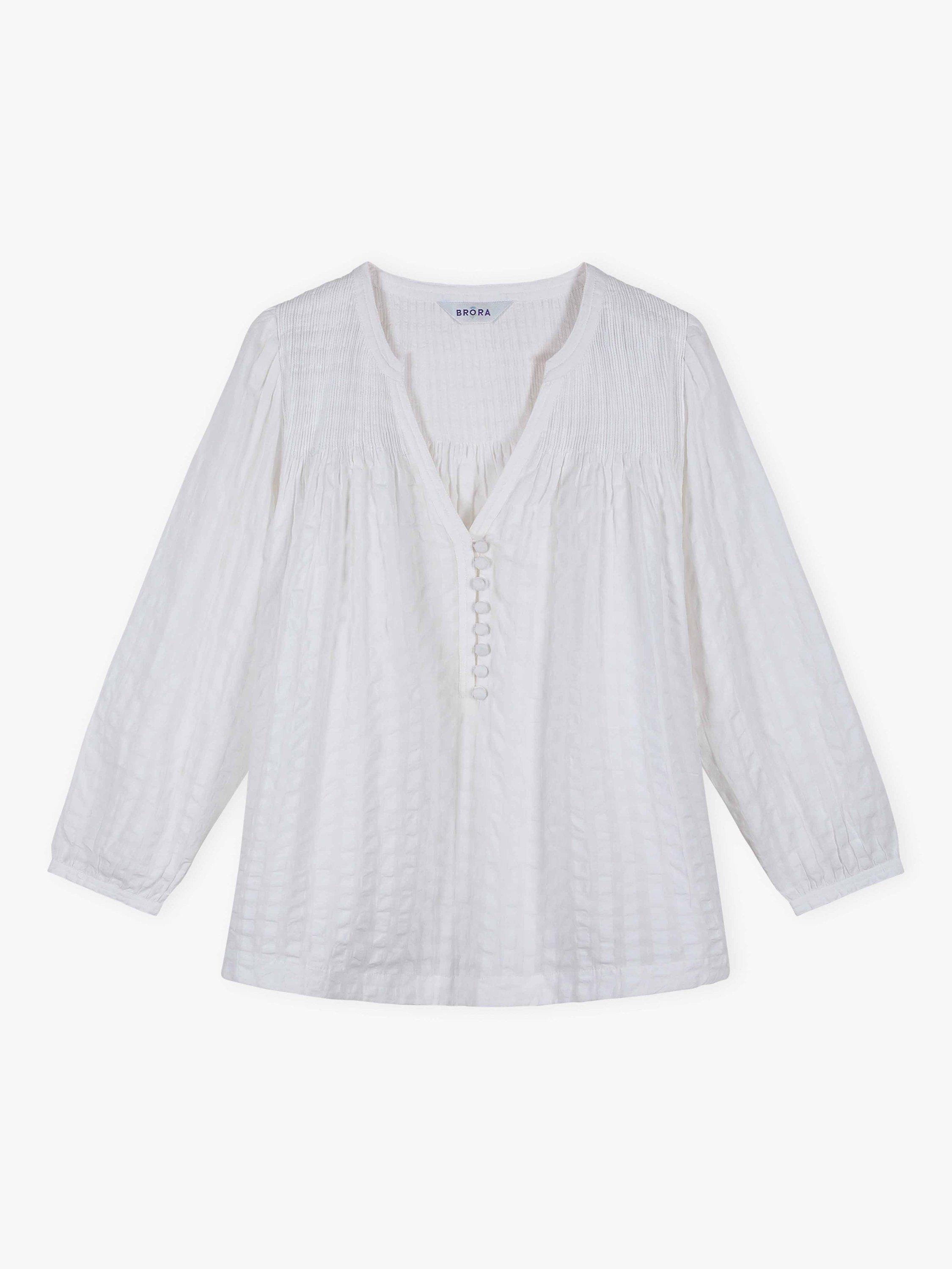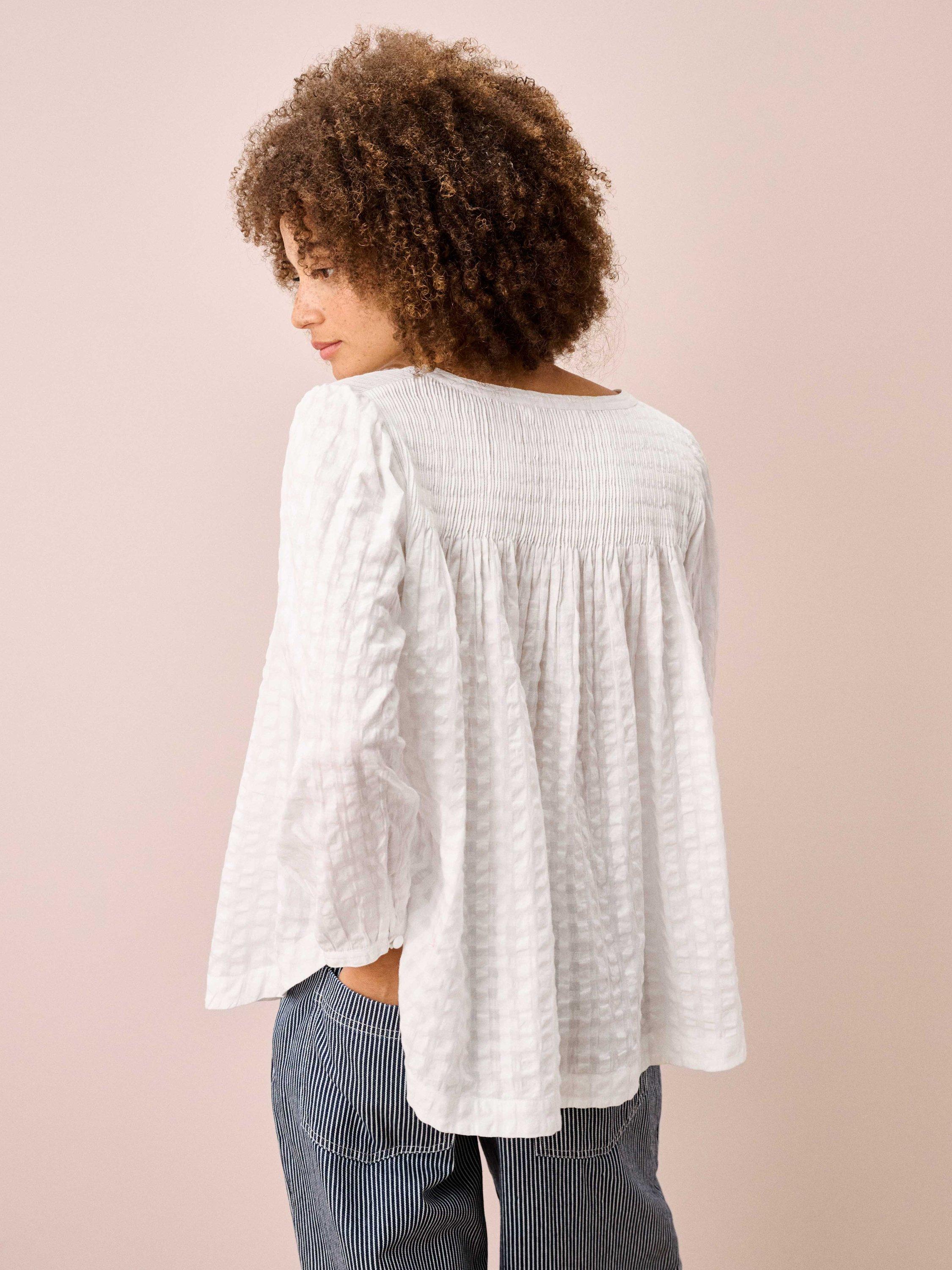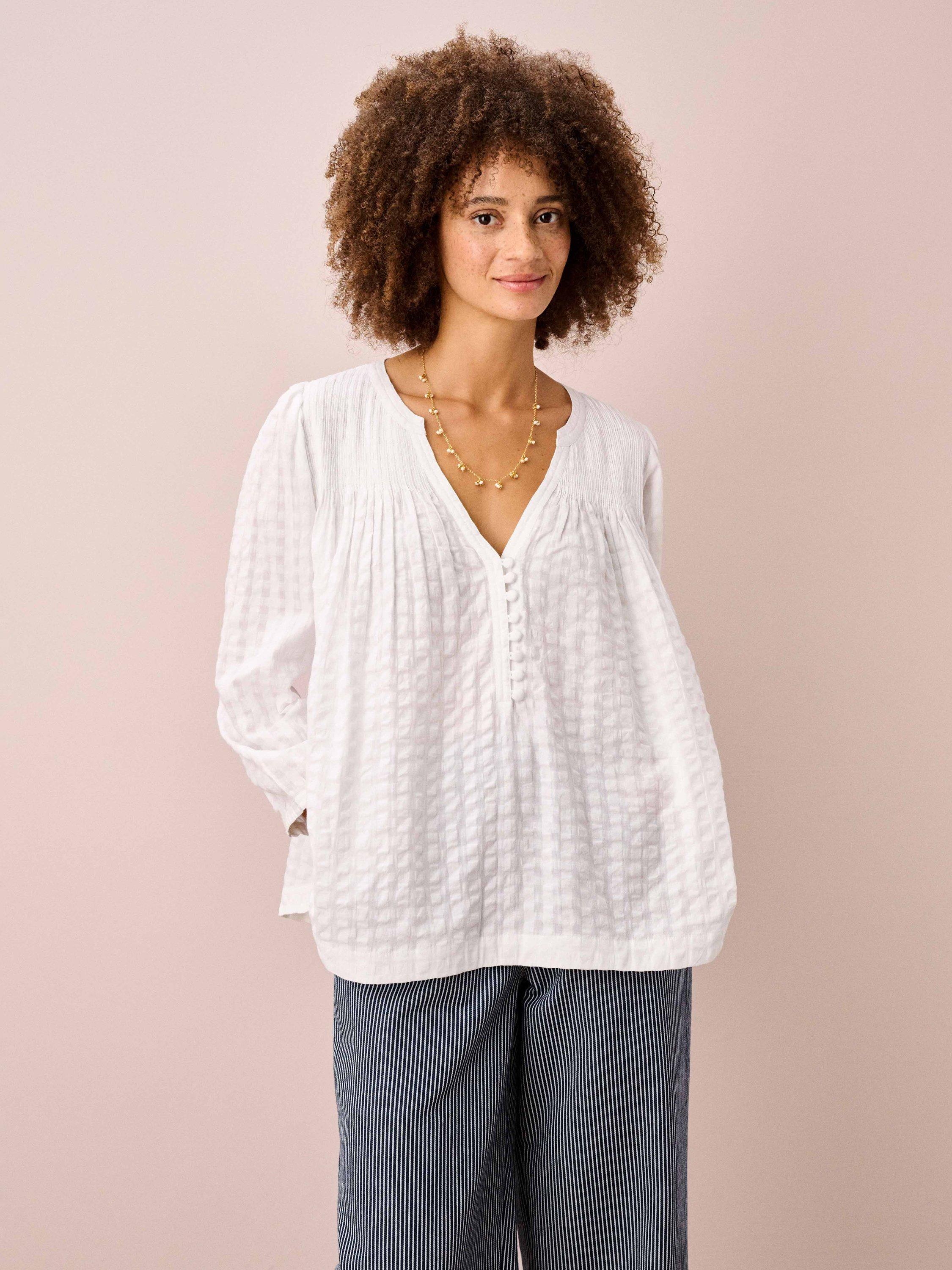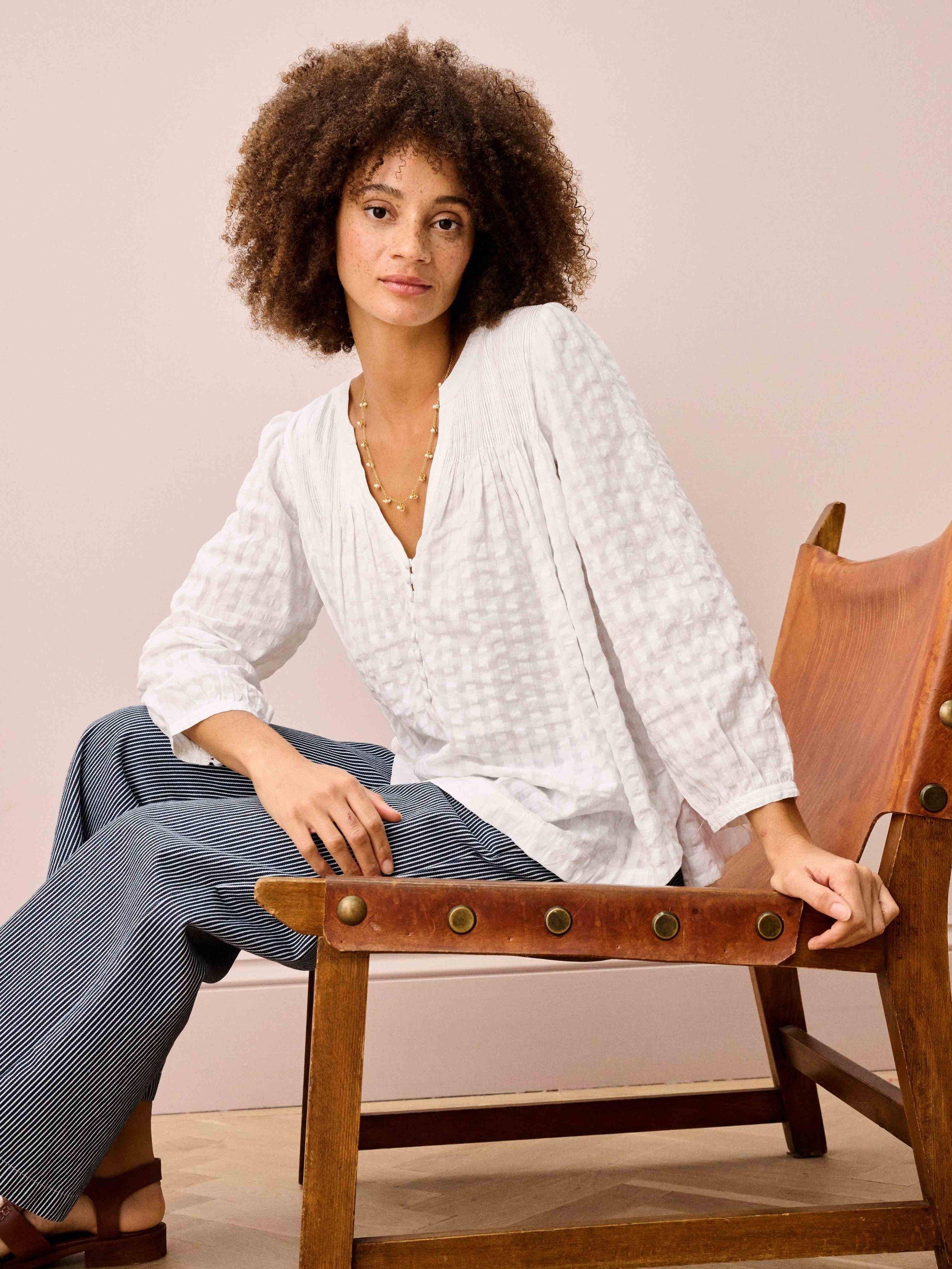 With a softly textured check finish and a relaxed V-neck, this floaty blouse brings an easy, breathable feel to warm summer days, while three-quarter sleeves add light coverage for in-between temperatures.