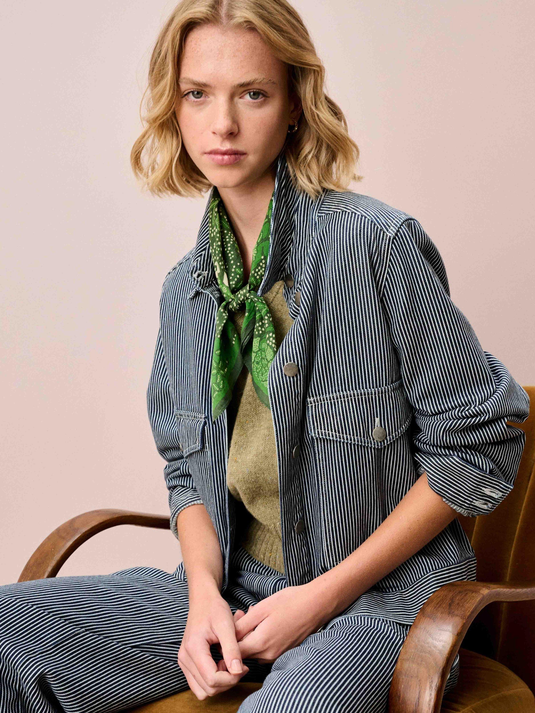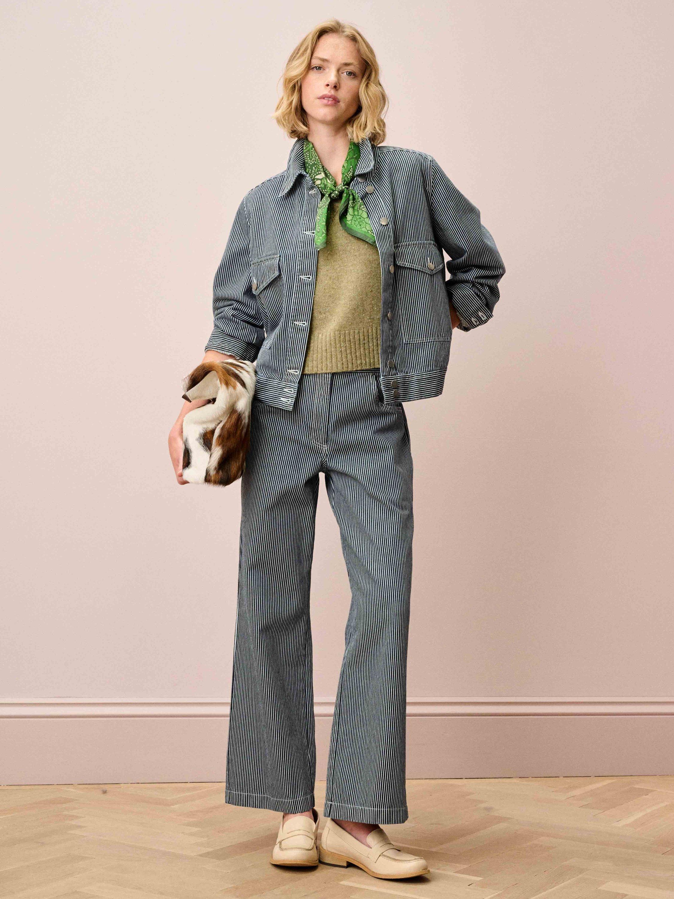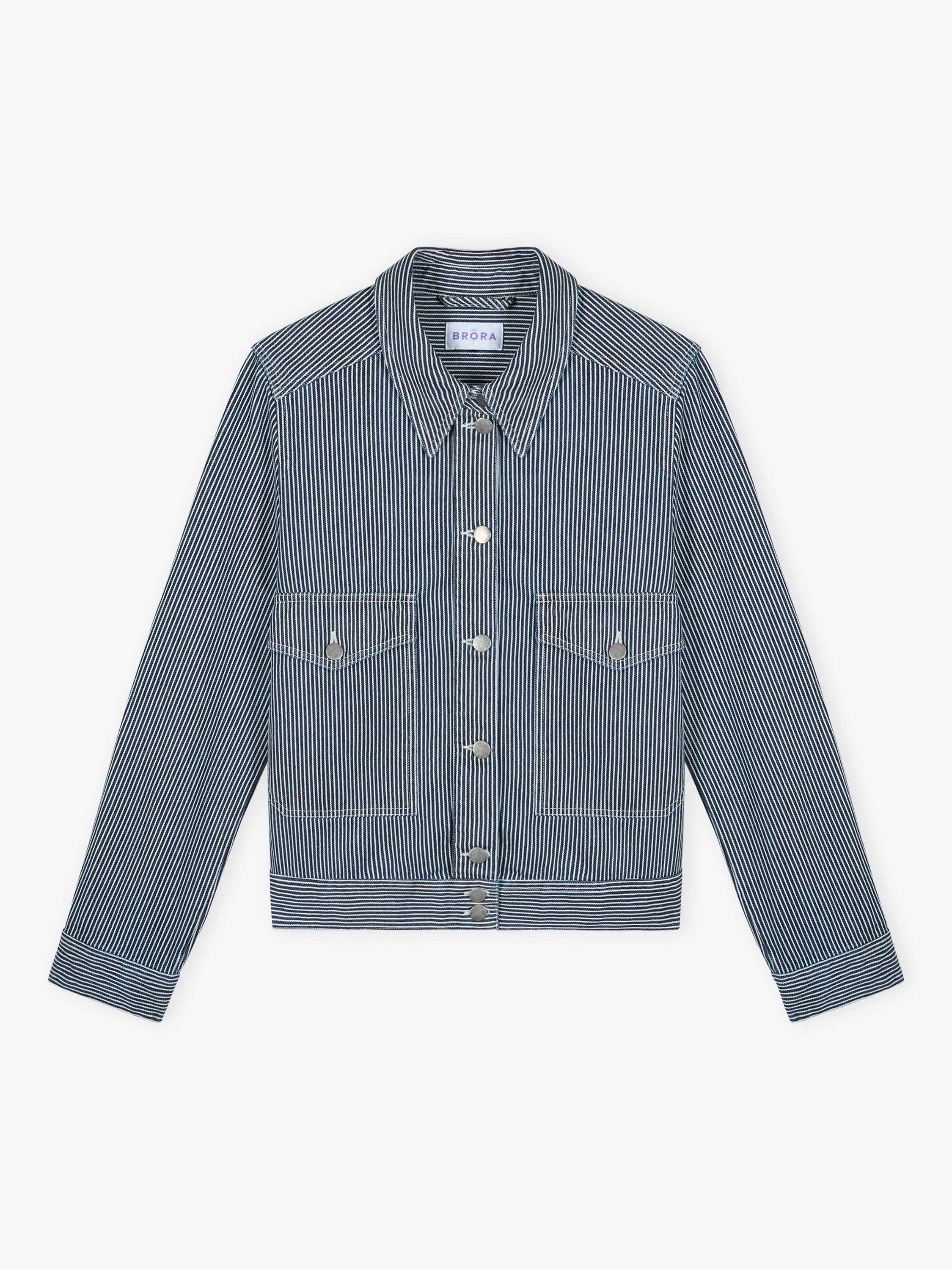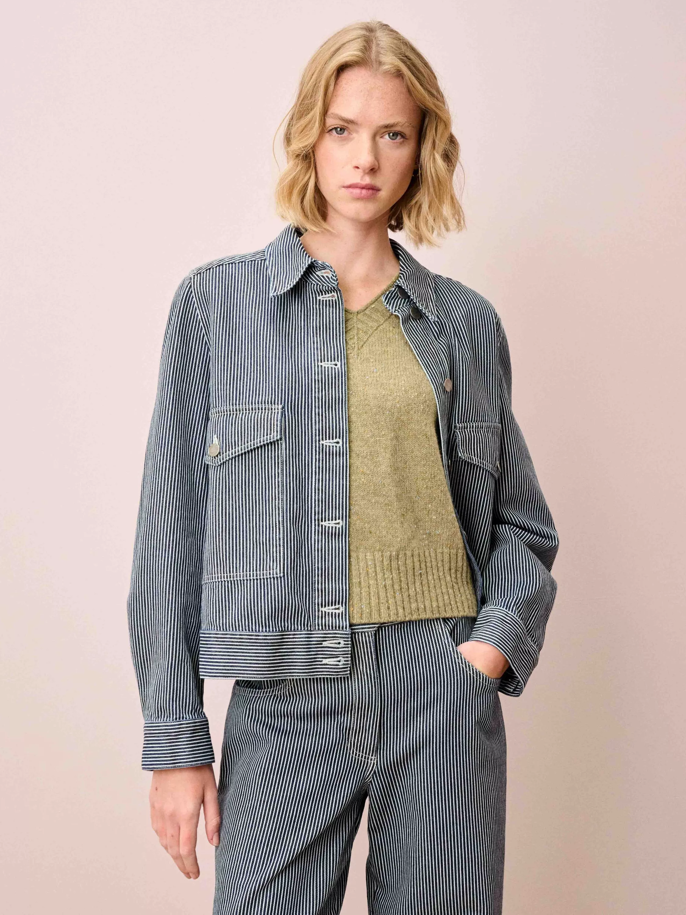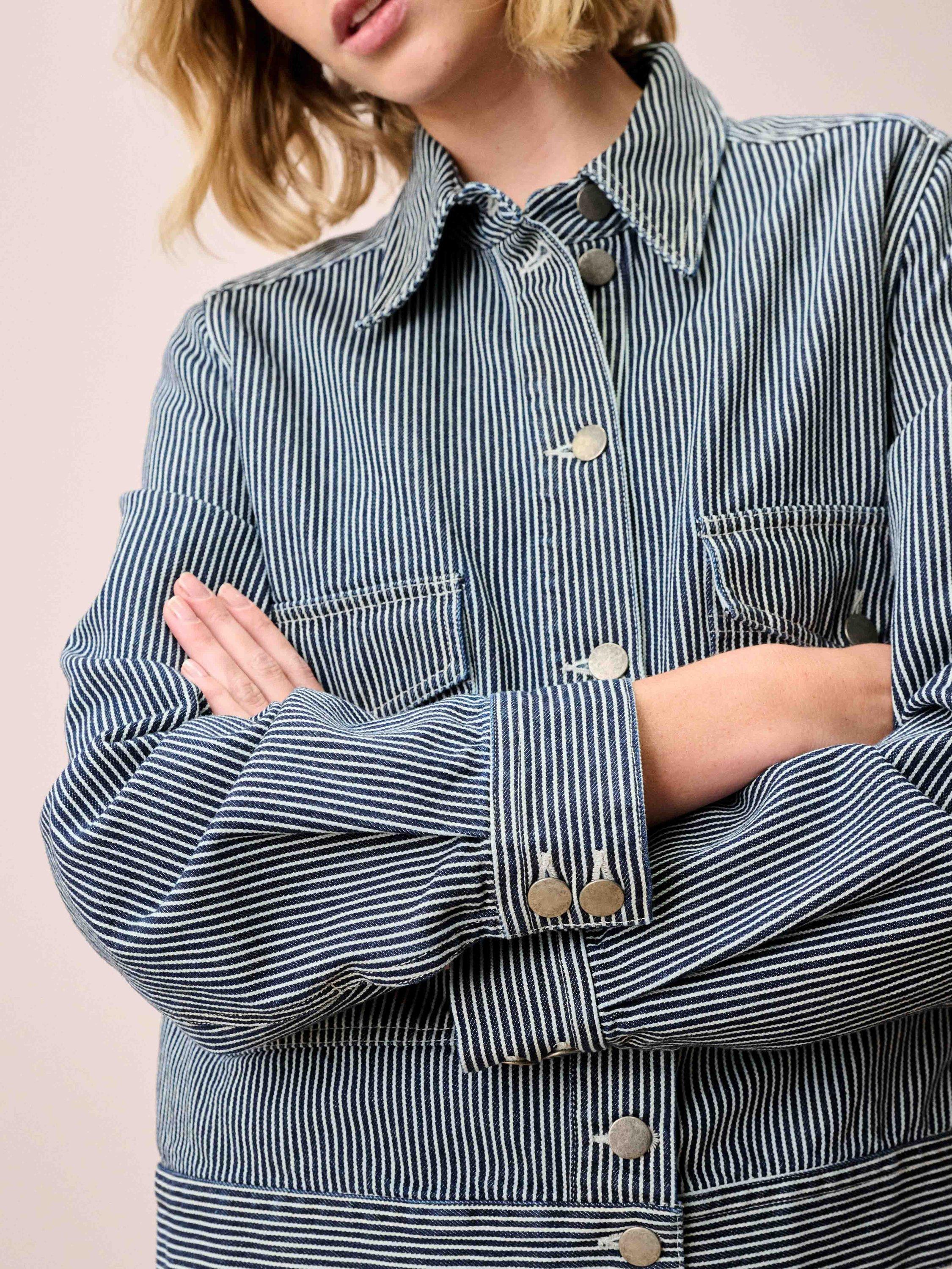 Tailored to offer a generous cut and made in Europe, this cotton canvas pinstripe jacket features a pointed collar, statement metal buttons and front flap pockets.