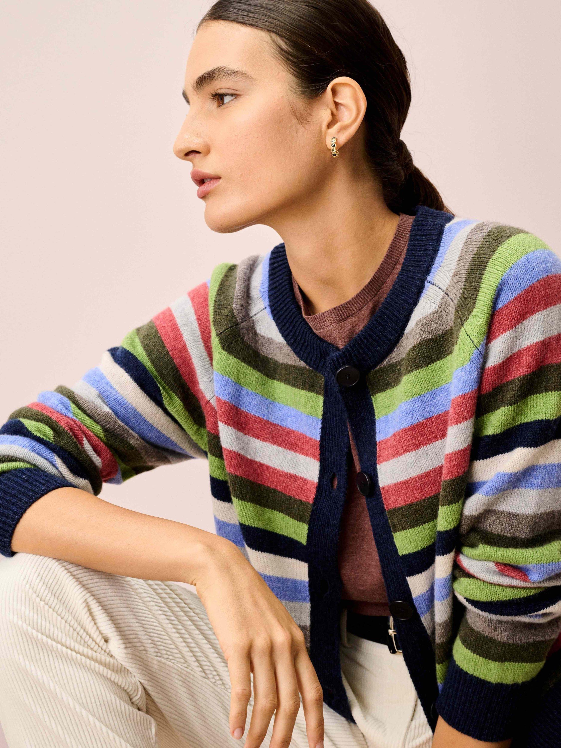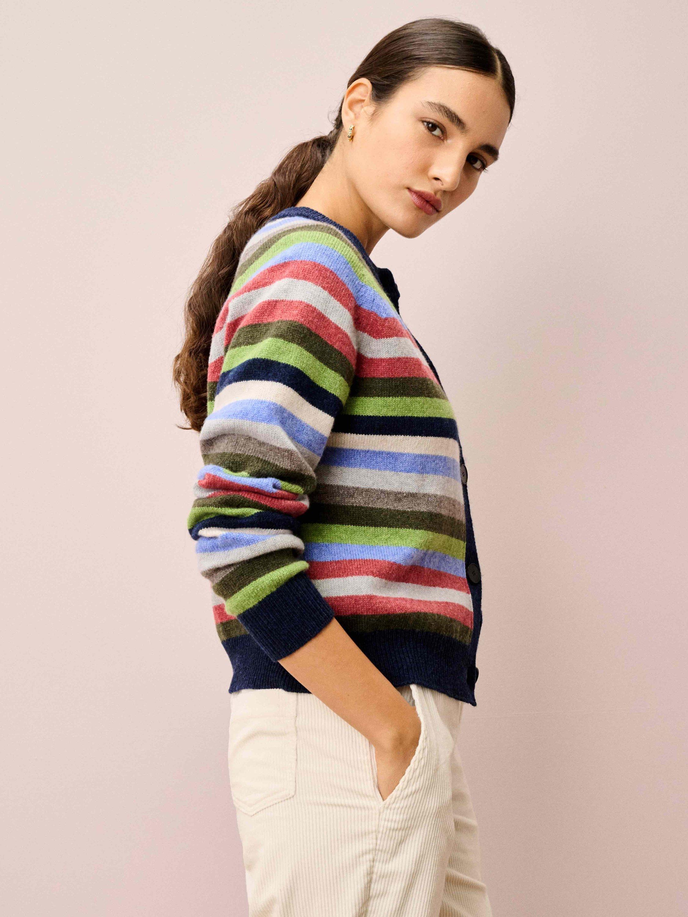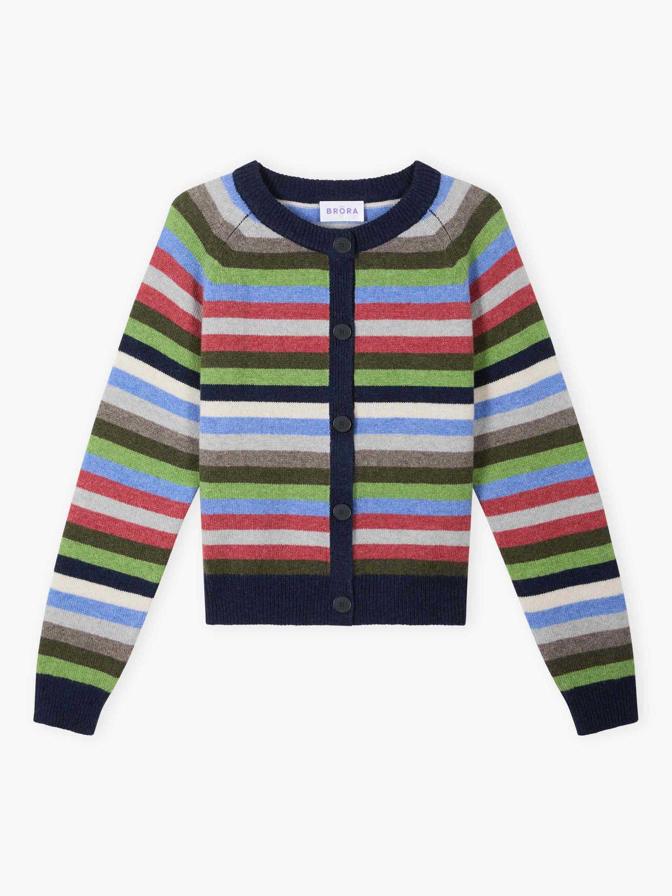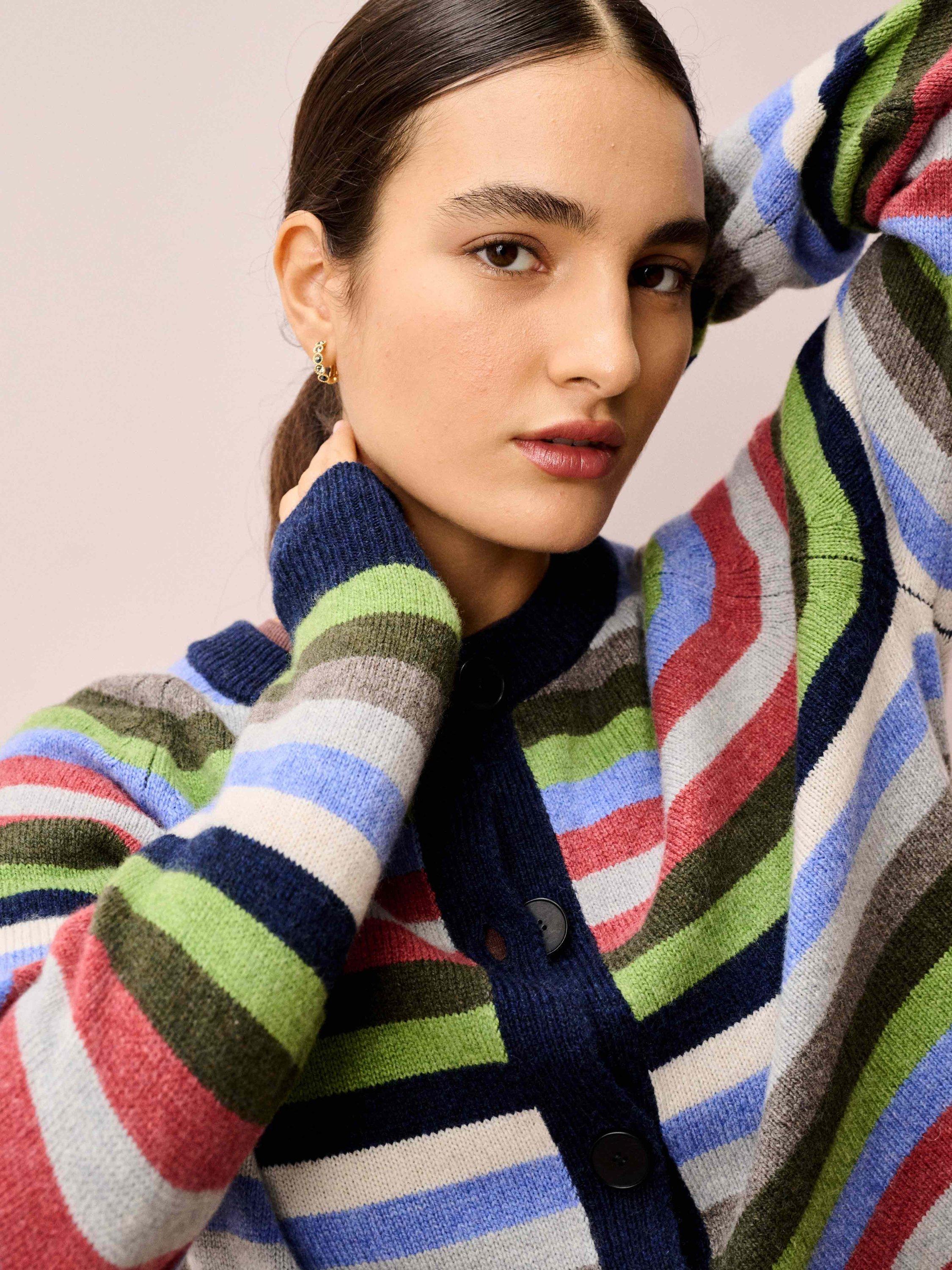 Knitted from super soft lambswool using yarns spun and dyed in Scotland, this vibrant cardigan, with its statement, shade-clashing stripe design and colour-block, ribbed trims, has to be seen to be believed.