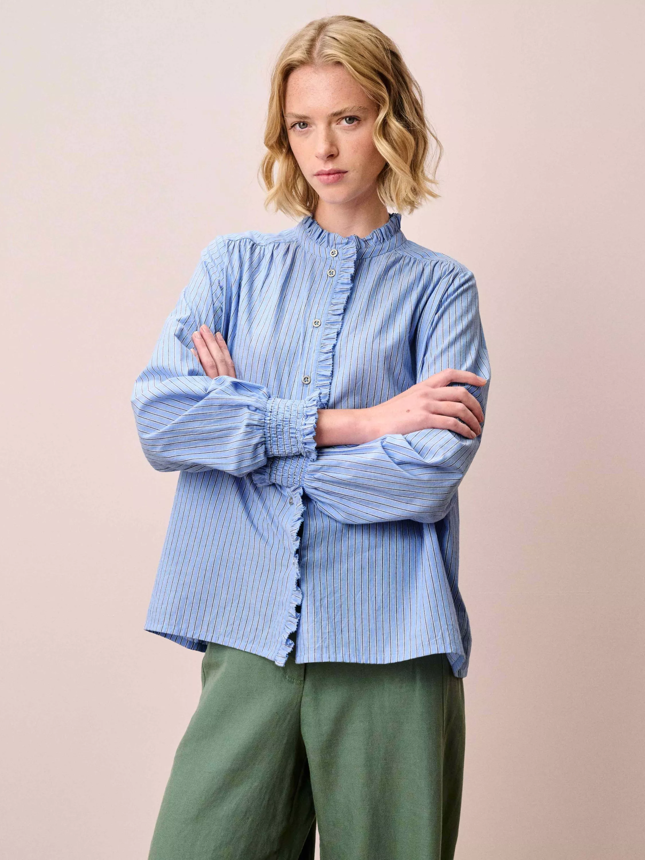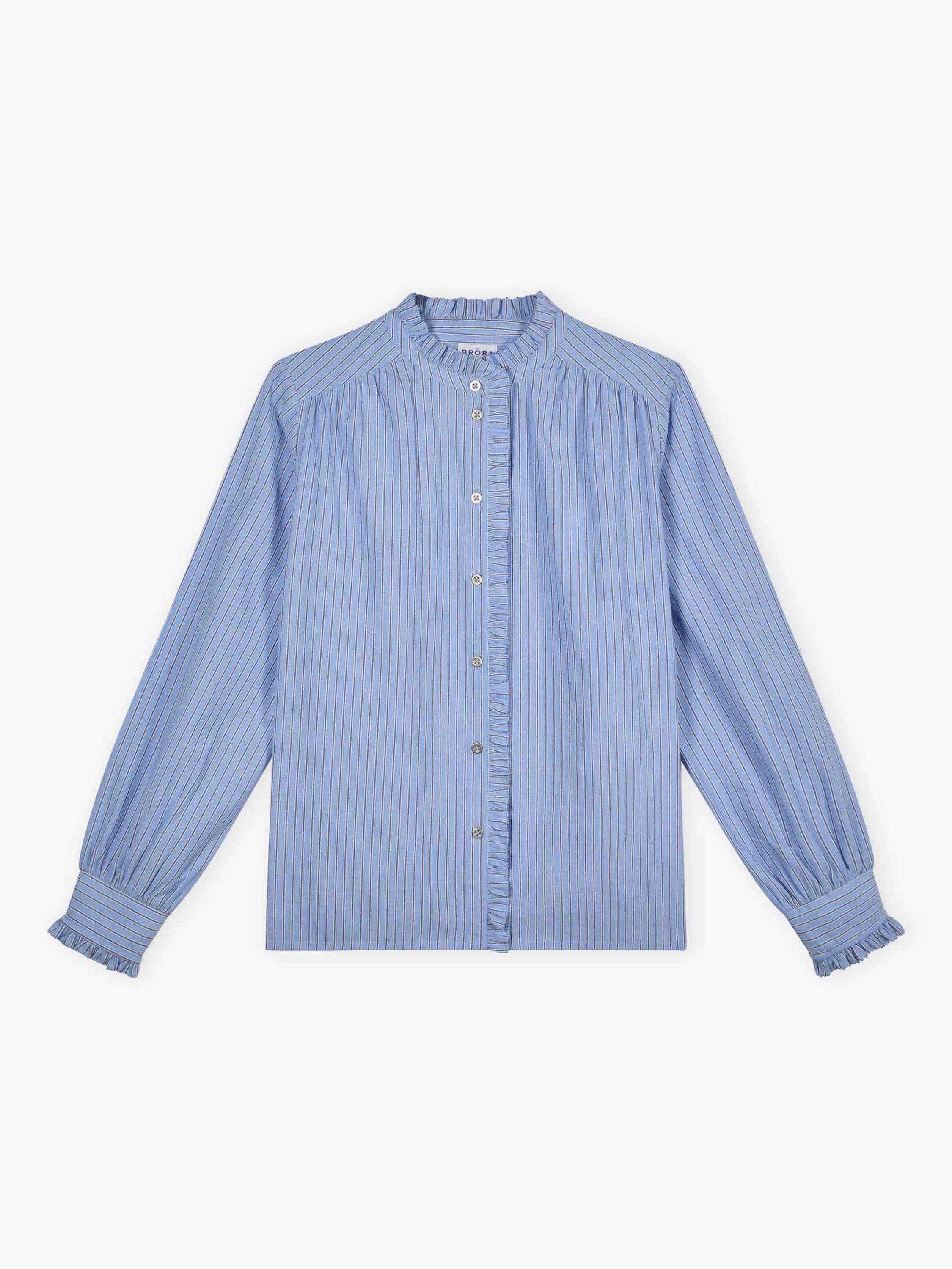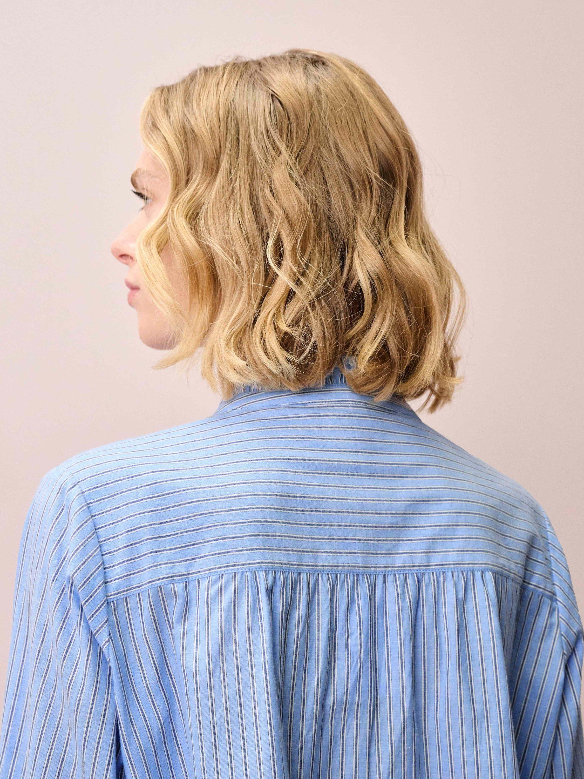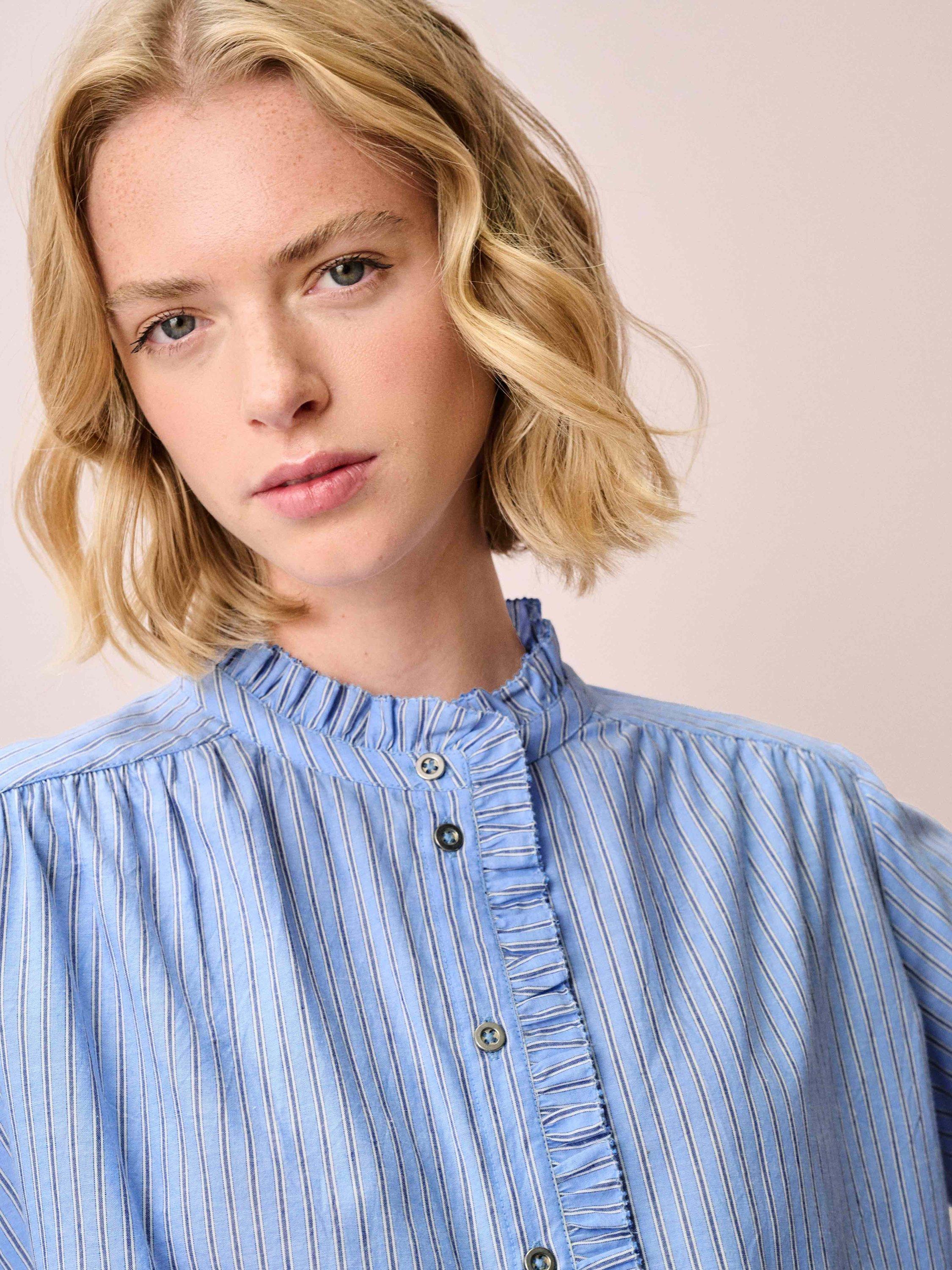 Made from breathable pure cotton, this quirky addition to your shirt collection features a woven stripe design with bias-cut button cuffs and feminine frill trims that trail around the neckline and down the front placket.