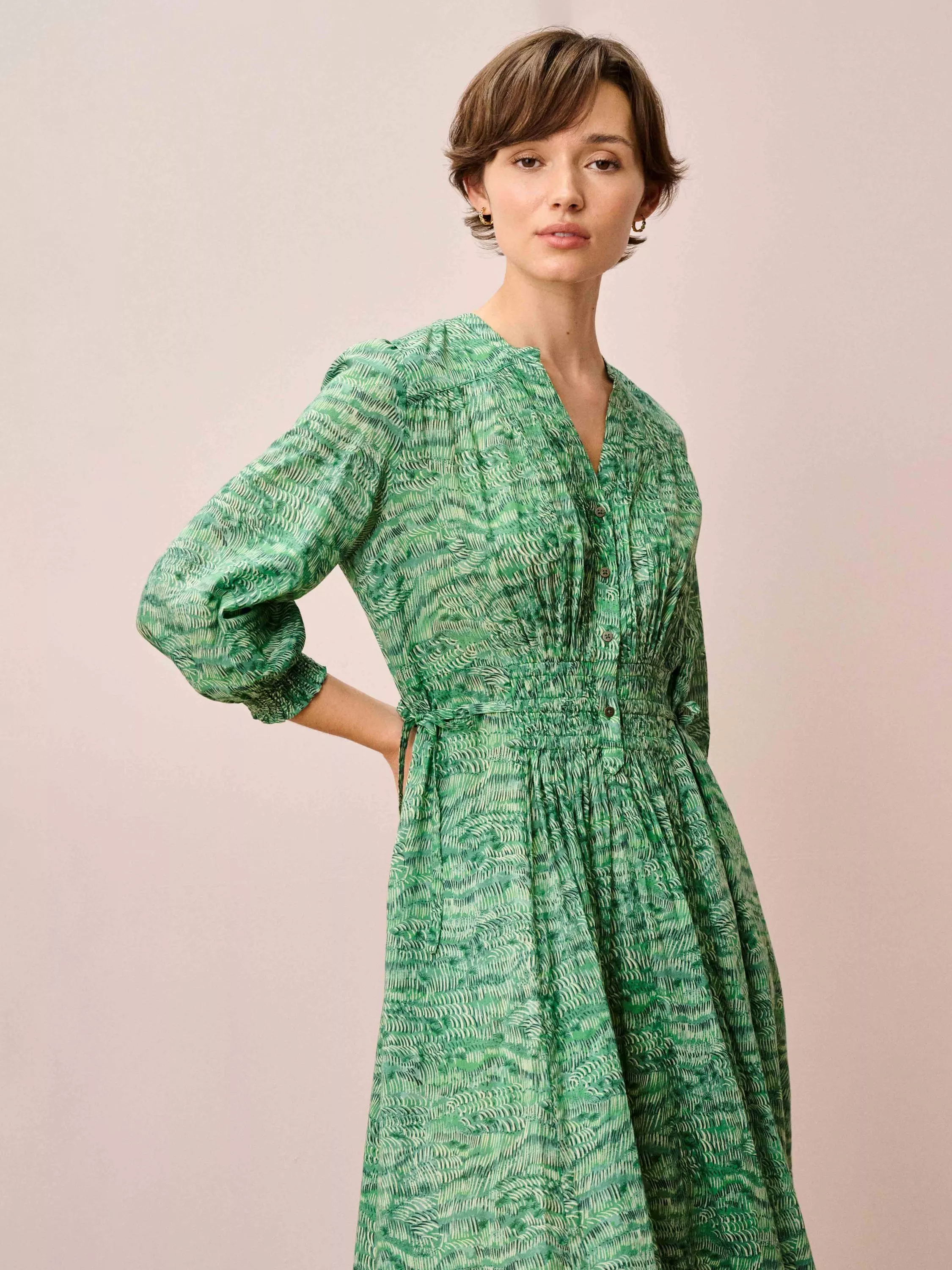 This cotton V-neck dress features an abstract Painterly Print, intricate pintucks, functional pockets, a shirred waist and cinching side ties, delivering visual intrigue and a flattering shape in one fell swoop.