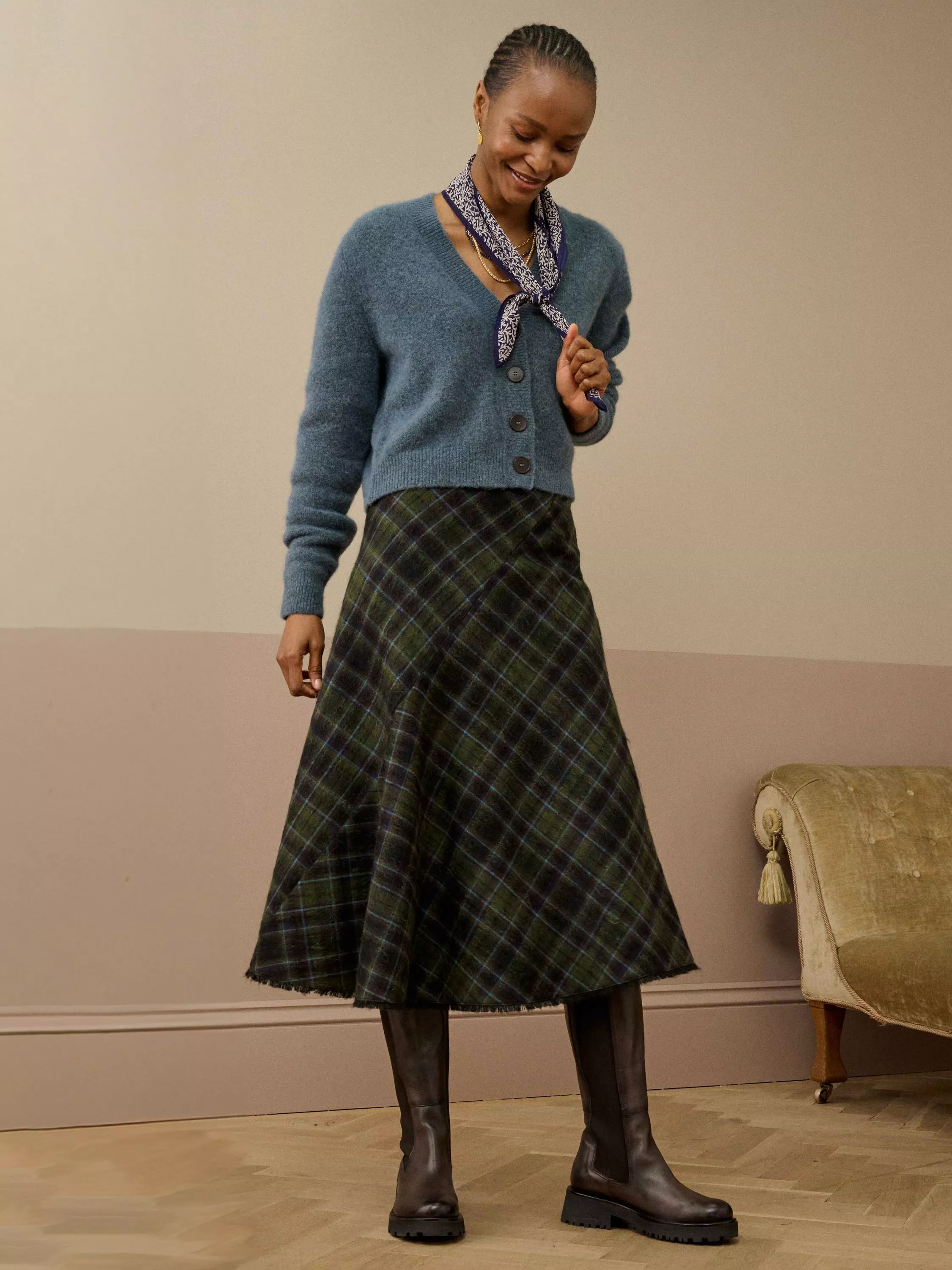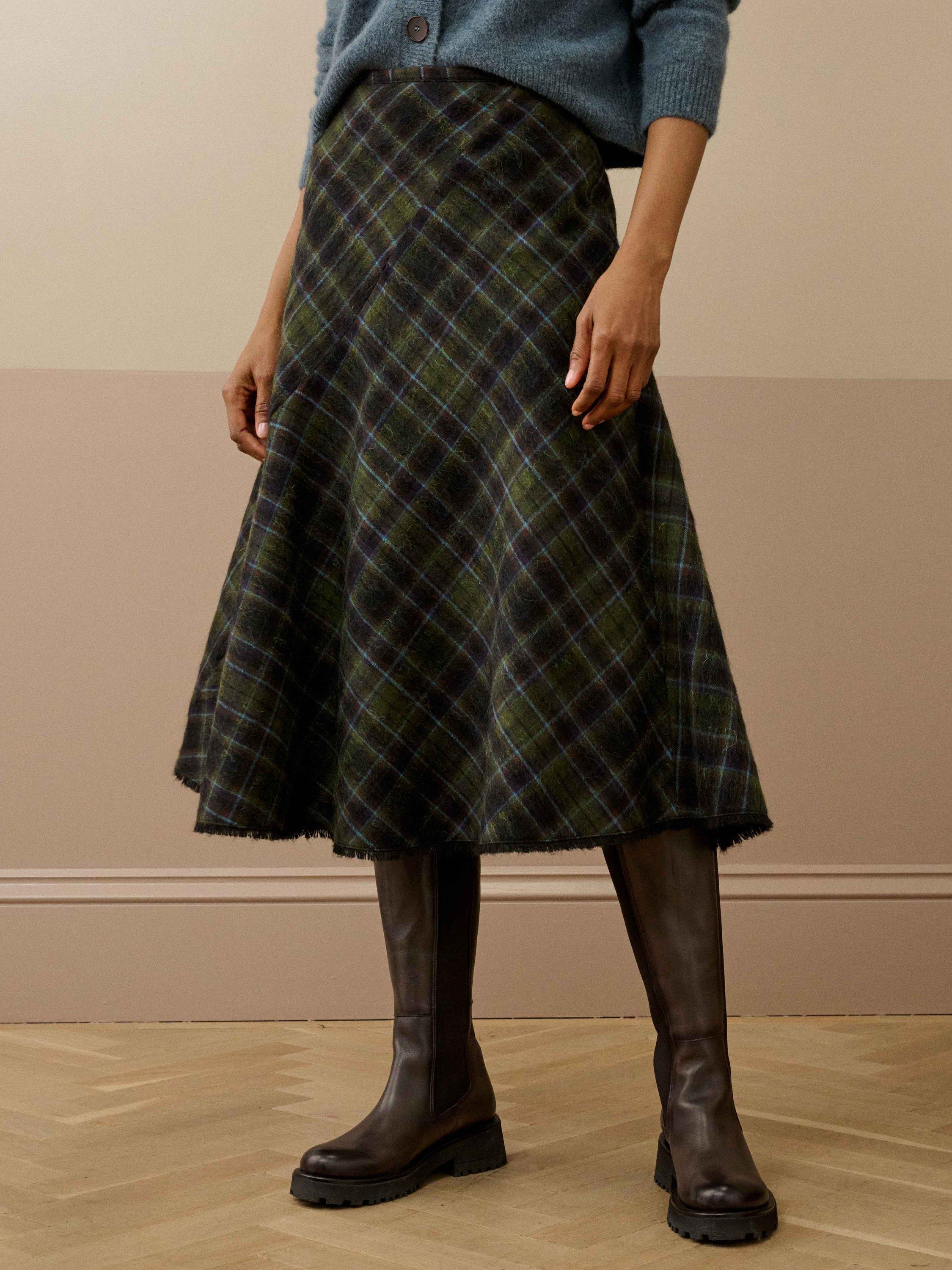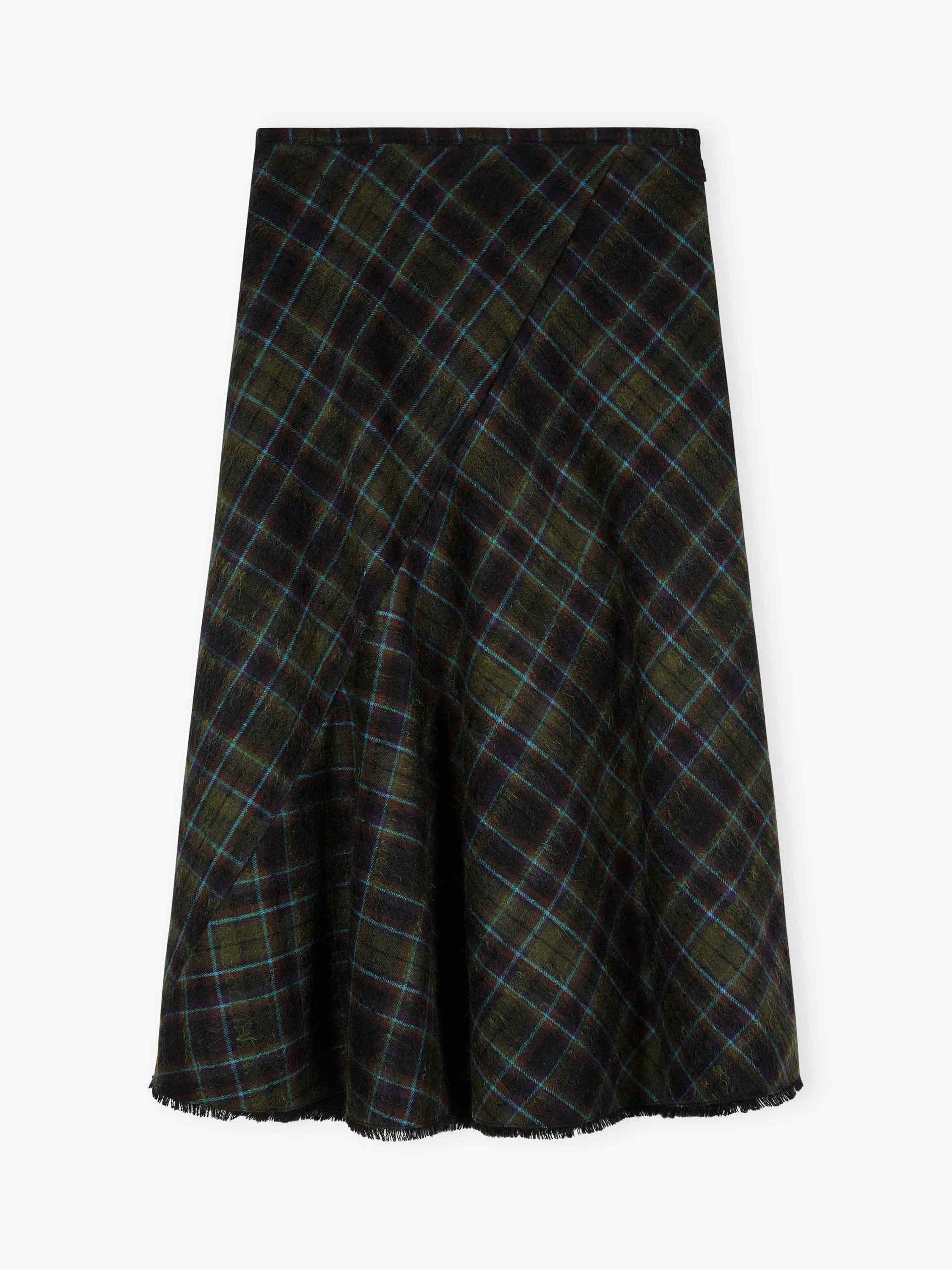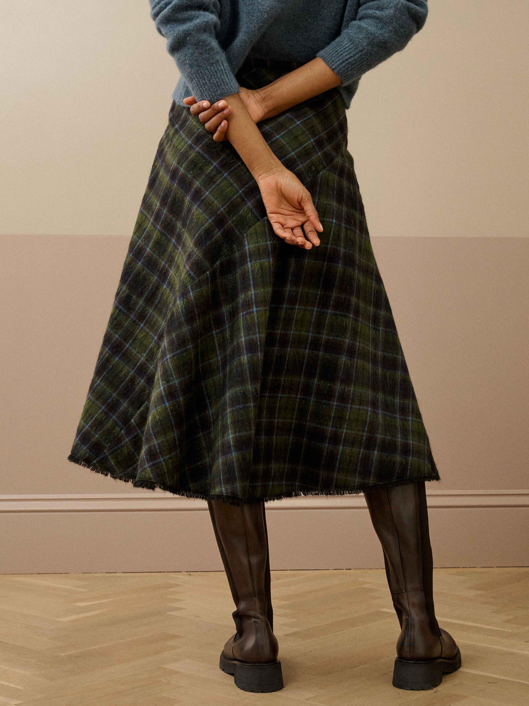 For those that love heritage-check skirts, you'll adore this seasonal, bias-cut addition with its fringed hem, woven from the finest mohair-wool blend in Scotland and tailored to perfection in a Leicester atelier.