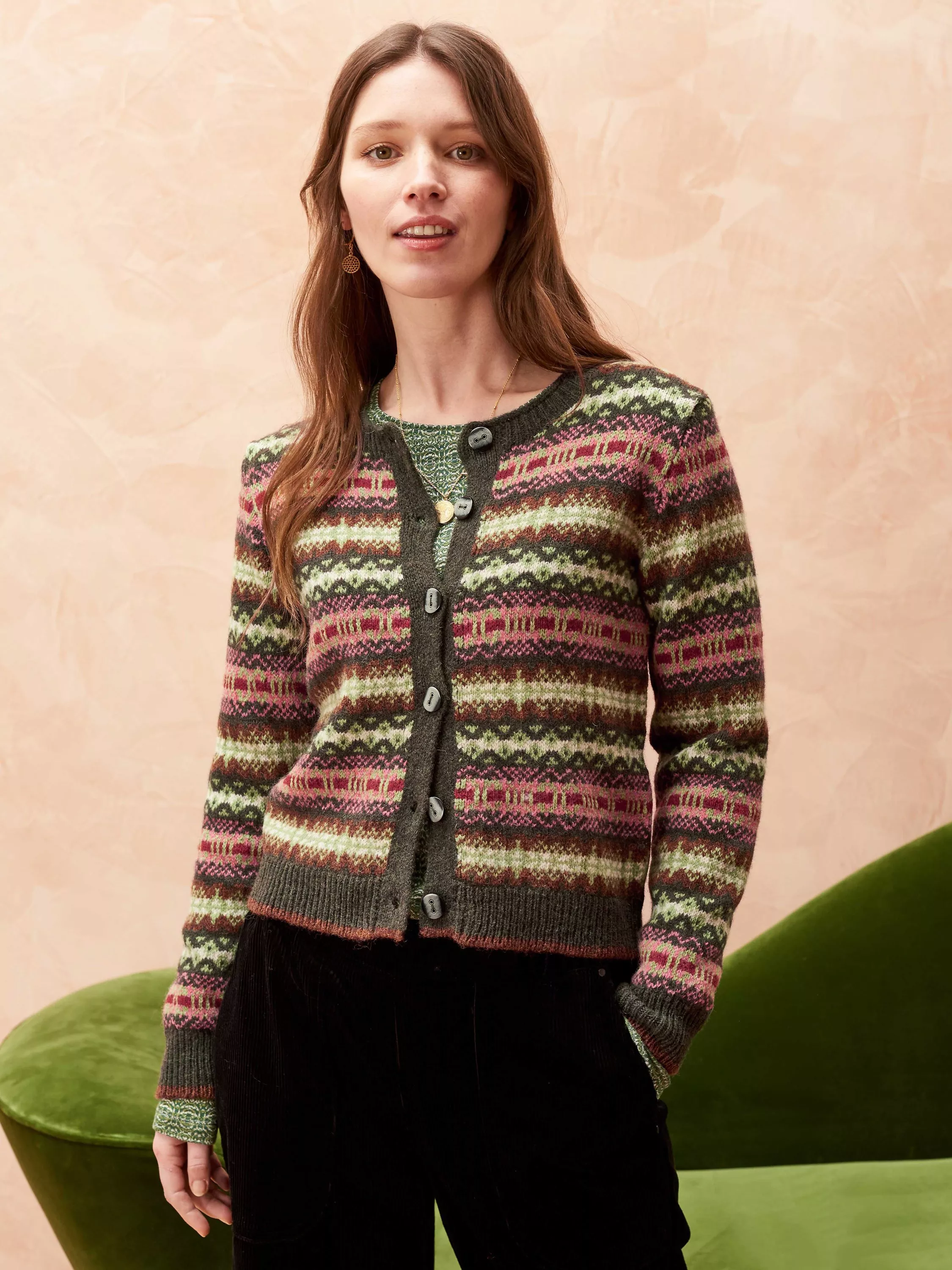 Framed with a neckline that buttons all the way up, this cardigan by Brora is printed with timeless Fair Isle pattern and is knitted from pure wool for a luxe piece that doesn't compromise on comfort.