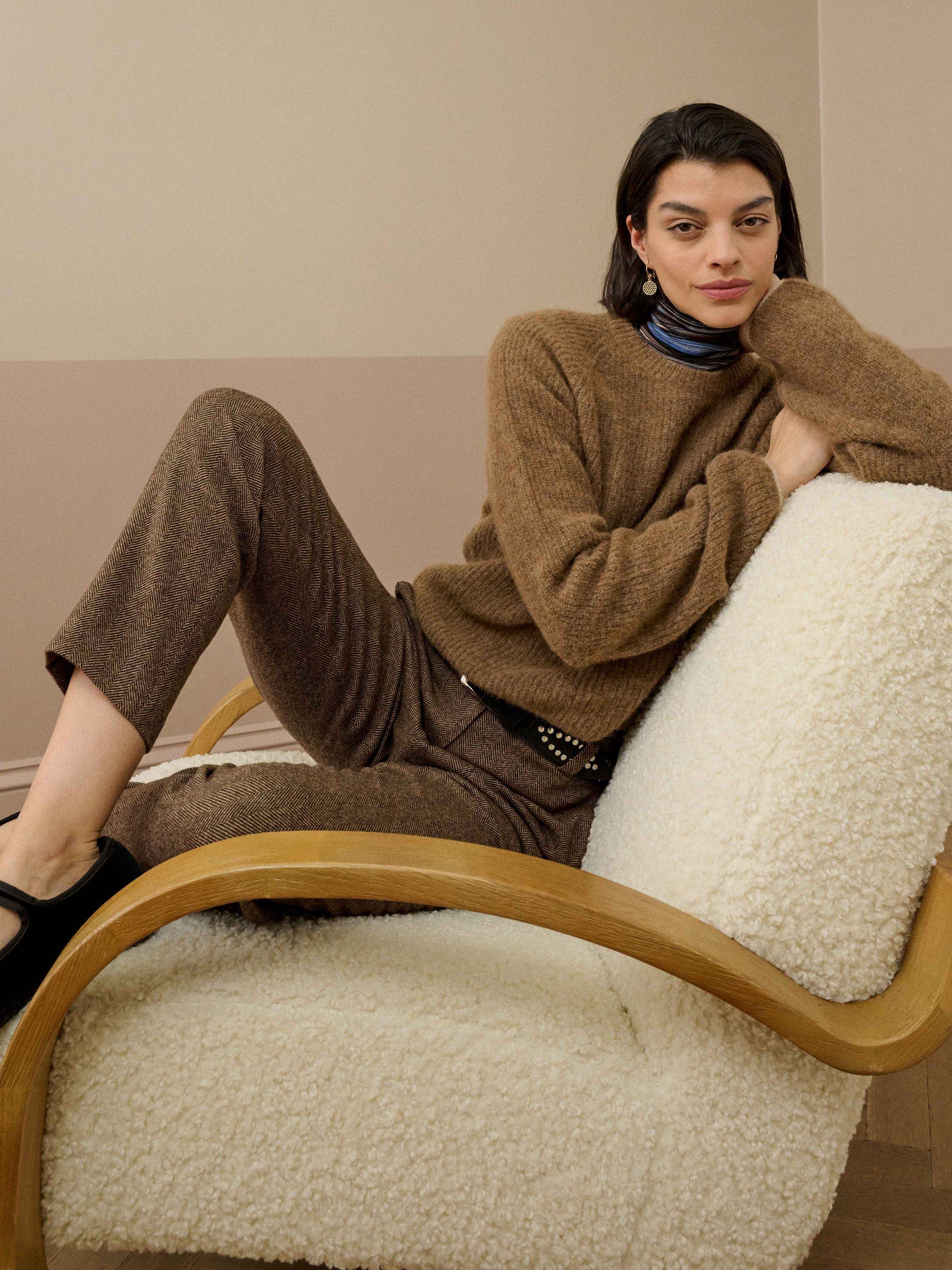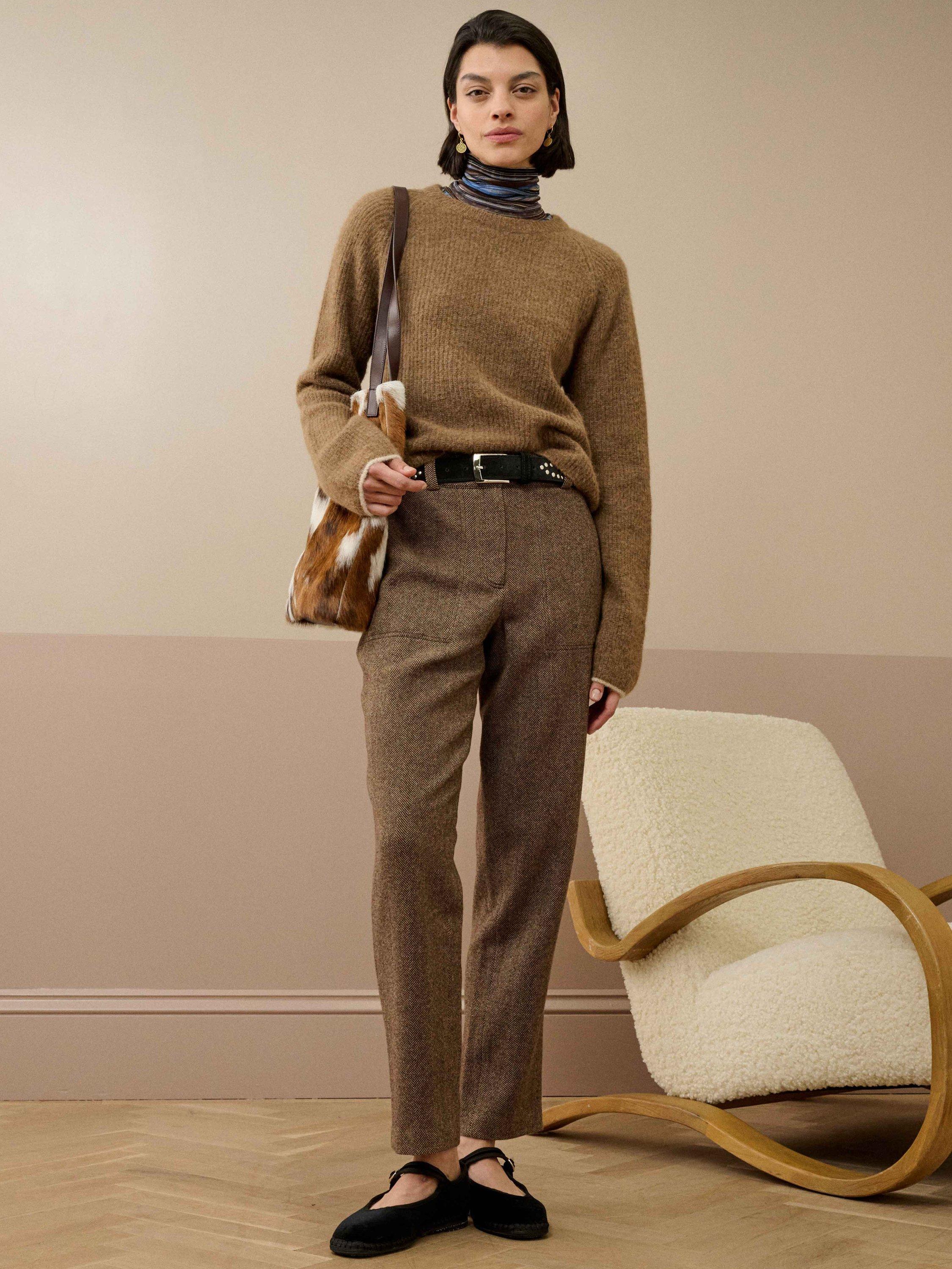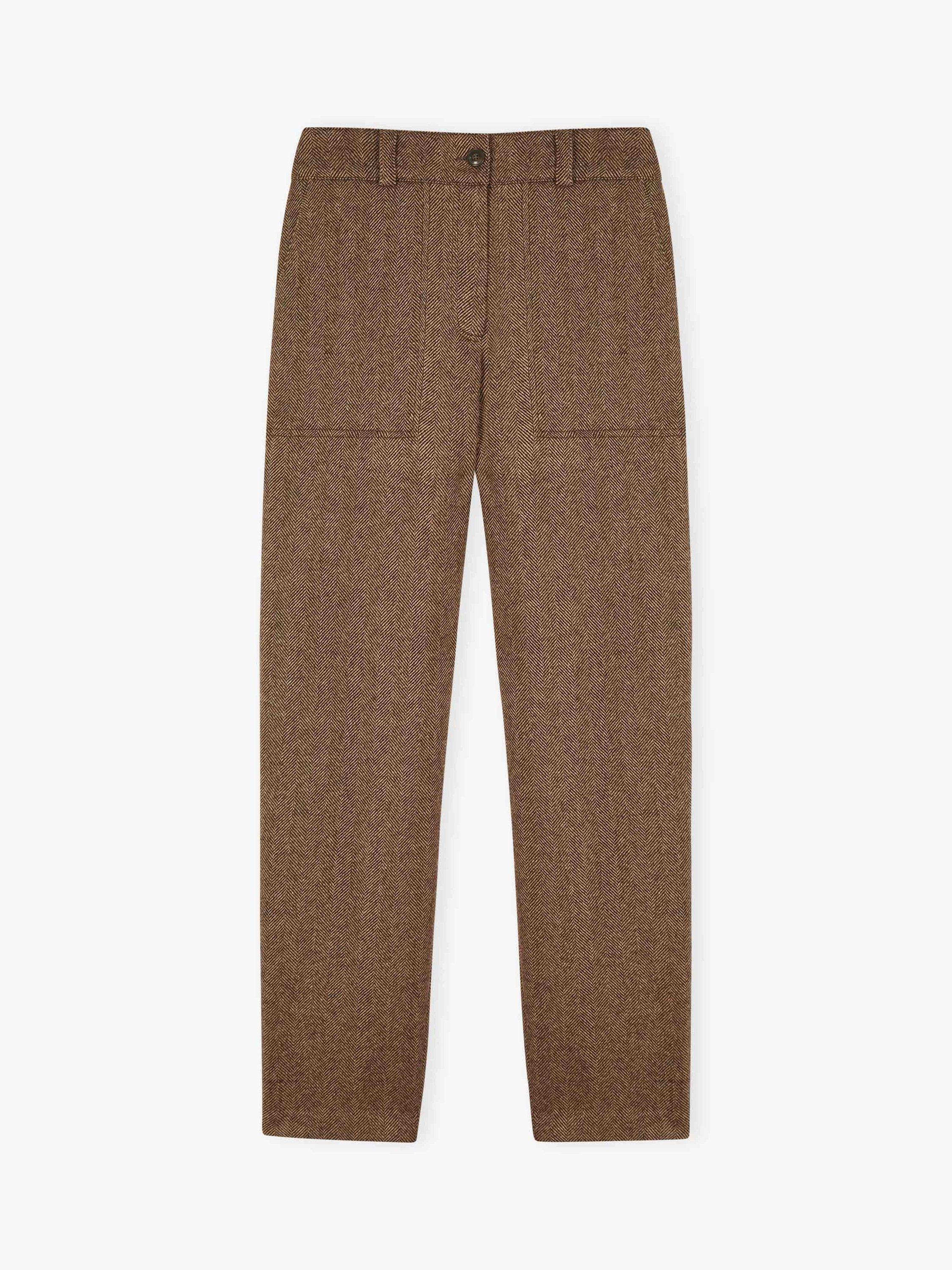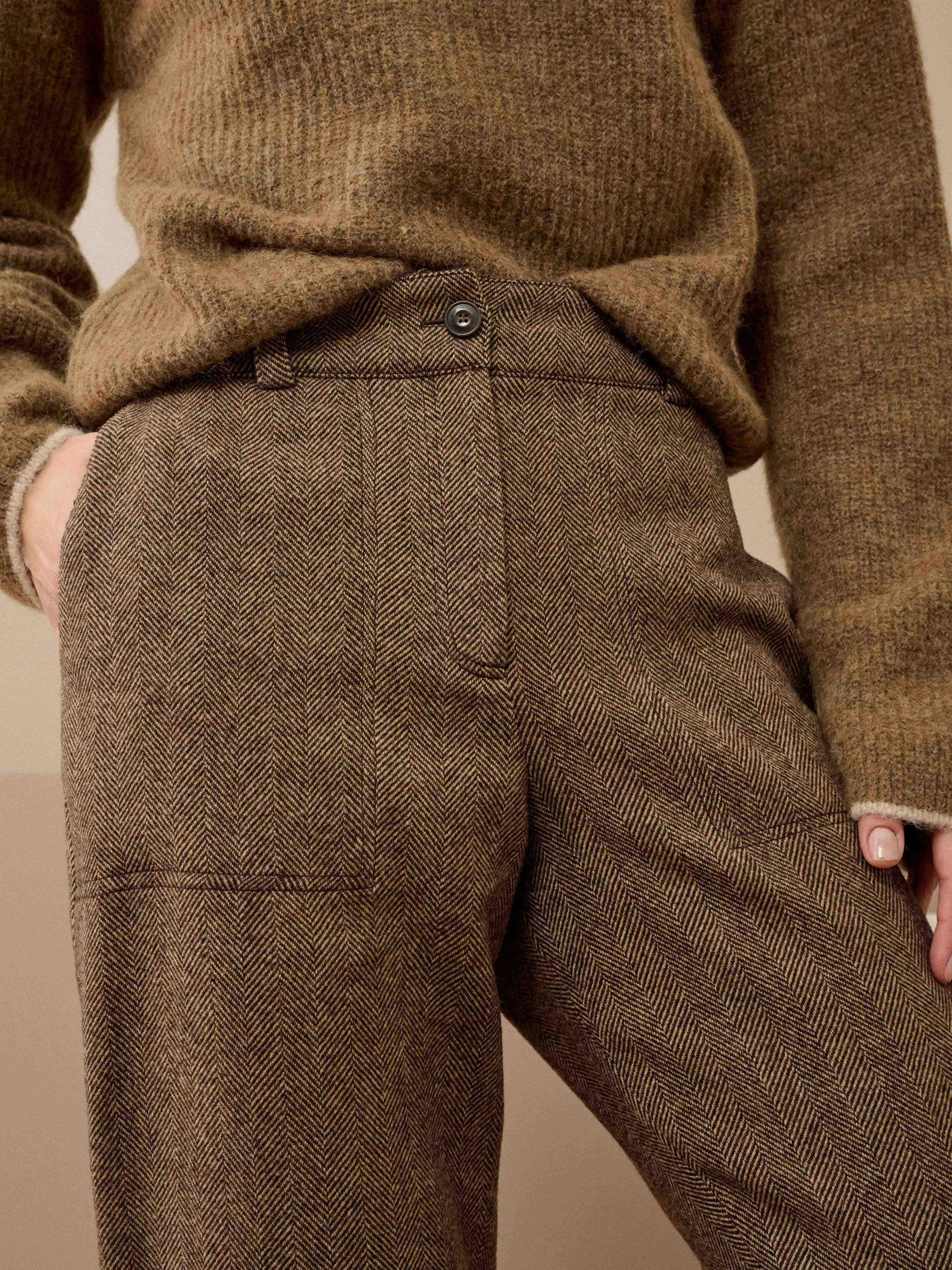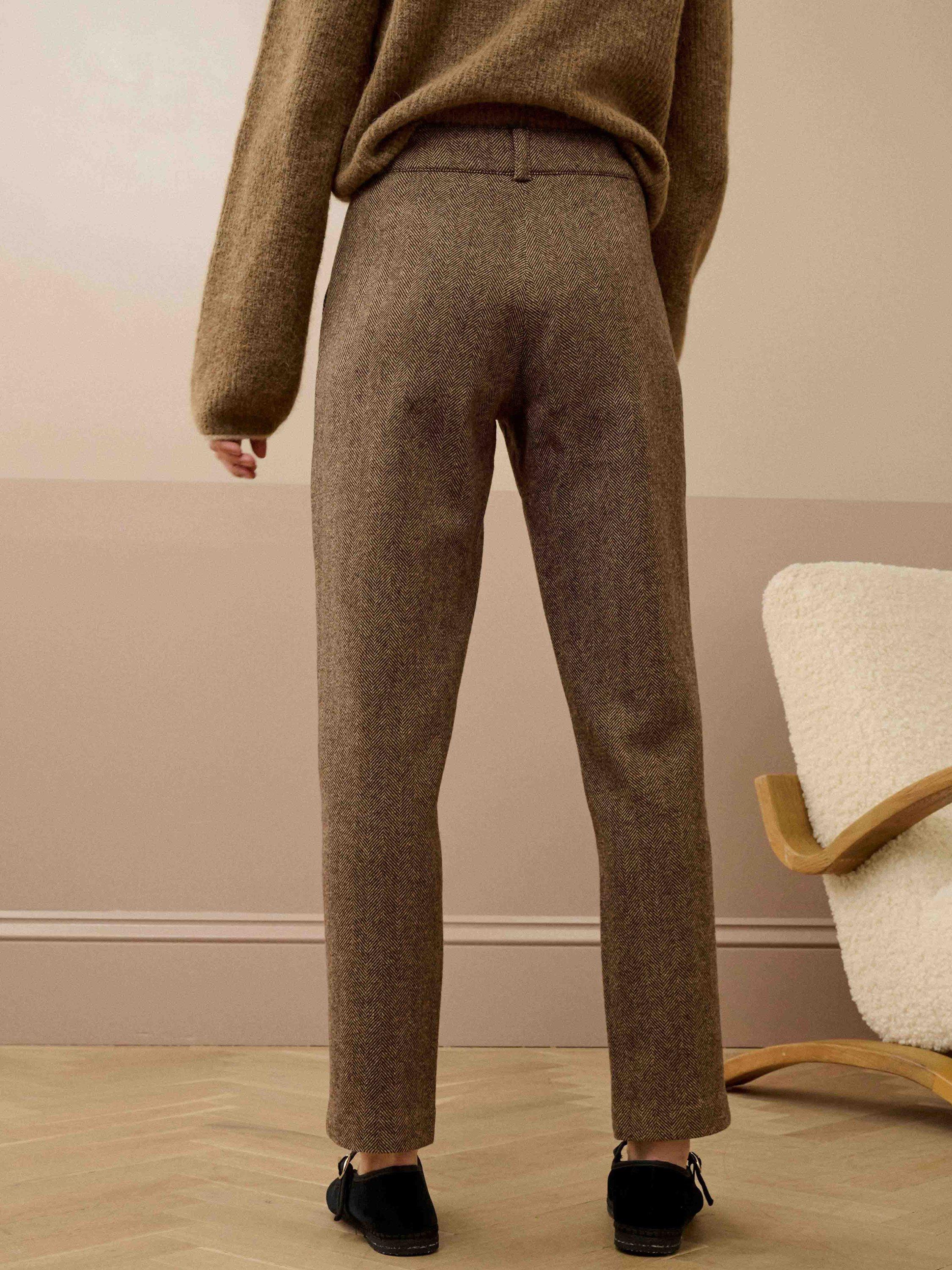 Tapered shape trousers from Brora in quality merino wool. They sit high on the hips with a zip fastening, herringbone checks and hems that fall to a regular length.