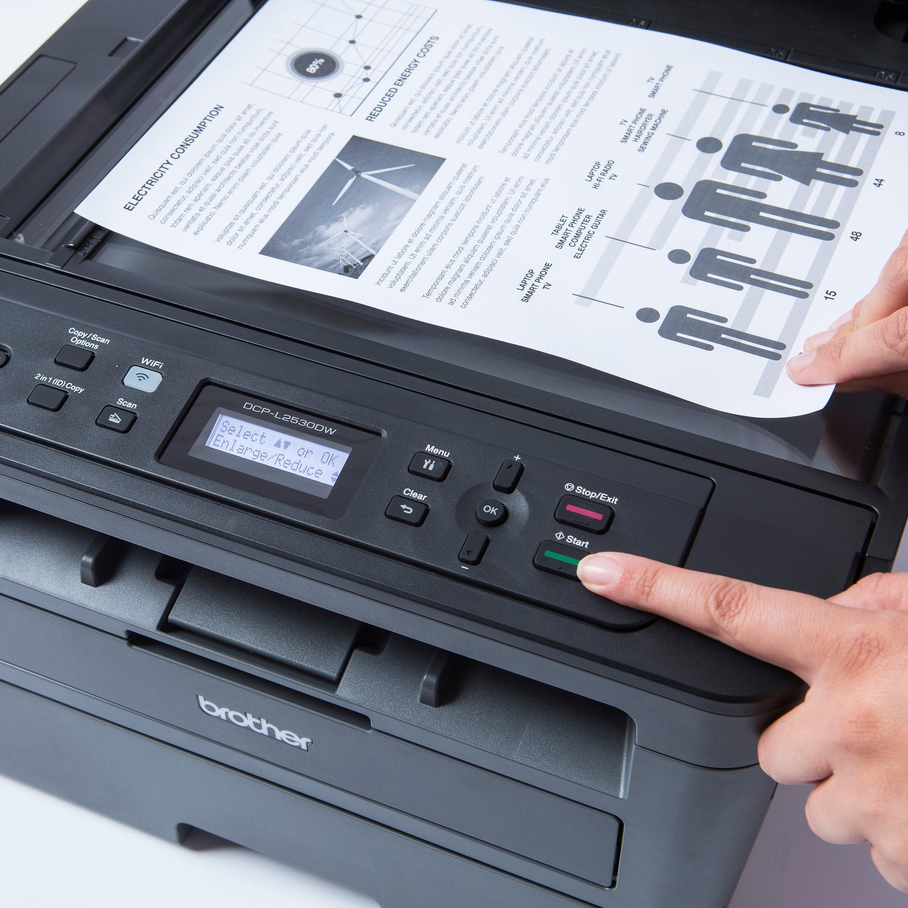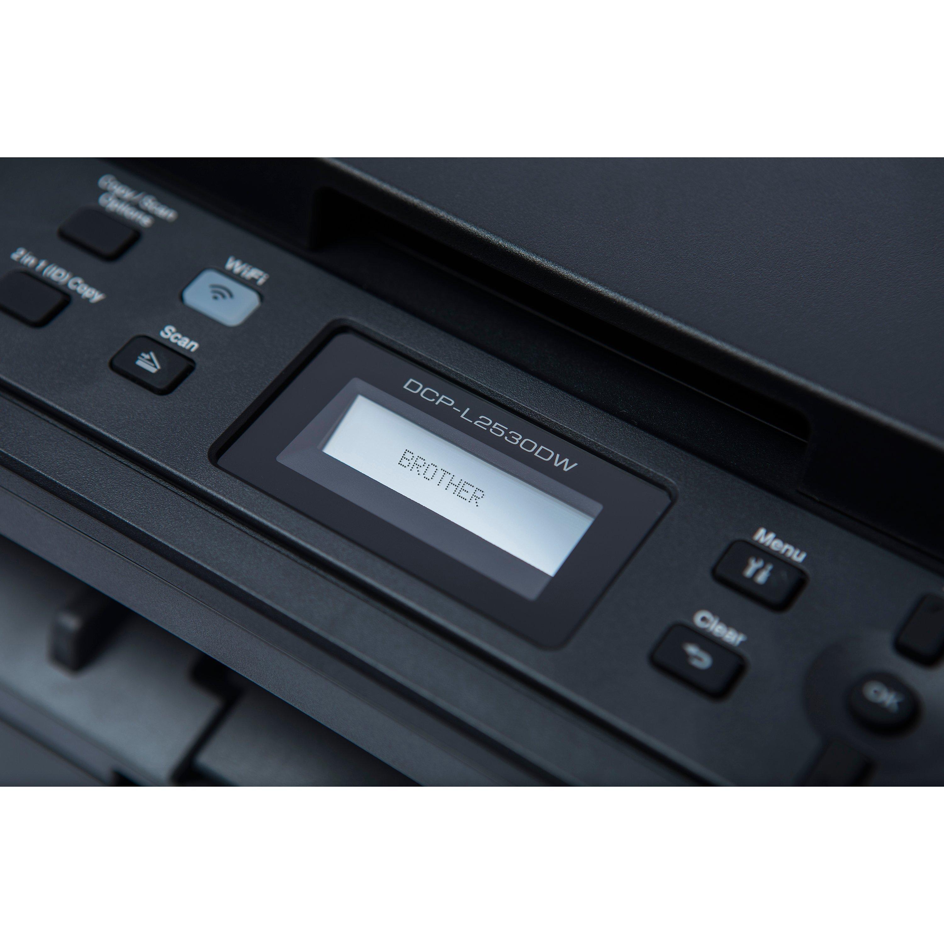Ideal for the busy home or small office, the compact and desktop-friendly DCP-L2510D lets you print, copy and scan with ease. It's got a conveniently small footprint, and it's quiet and economical, with a large capacity paper tray and high yield toner.
