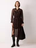 Jigsaw Long Sleeved Feather Print Midi Dress, Brown