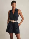 Reiss Anjie Belted Pure Linen Playsuit, Navy