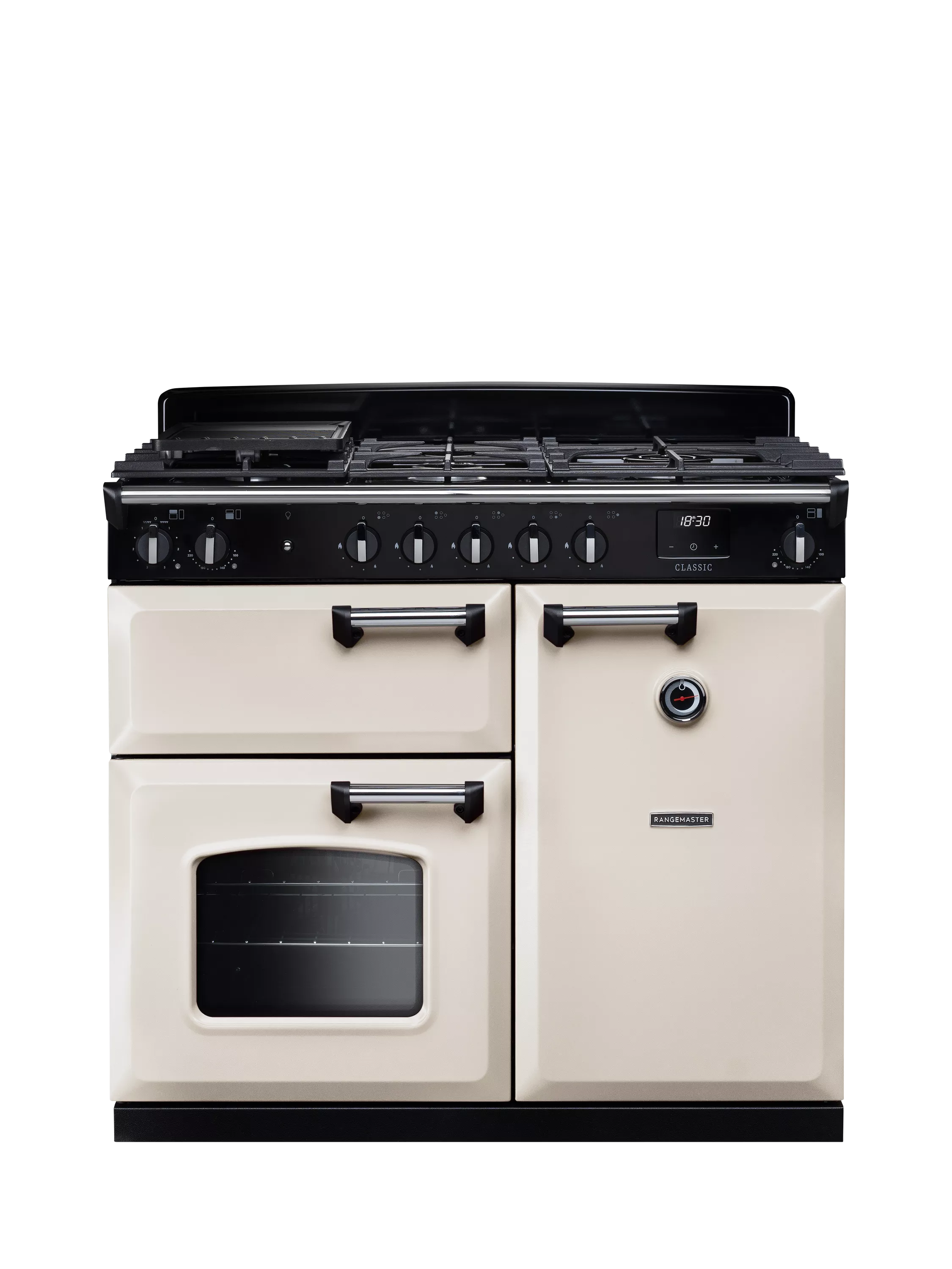 Rangemaster Classic Deluxe CLDL100DFP 100cm Dual Fuel Range Cooker with Gas Hob, Bordeaux/Antique Brass