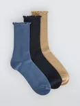 Ribbed Frill Ankle Socks, Pack of 3, Navy/Tan/Blue