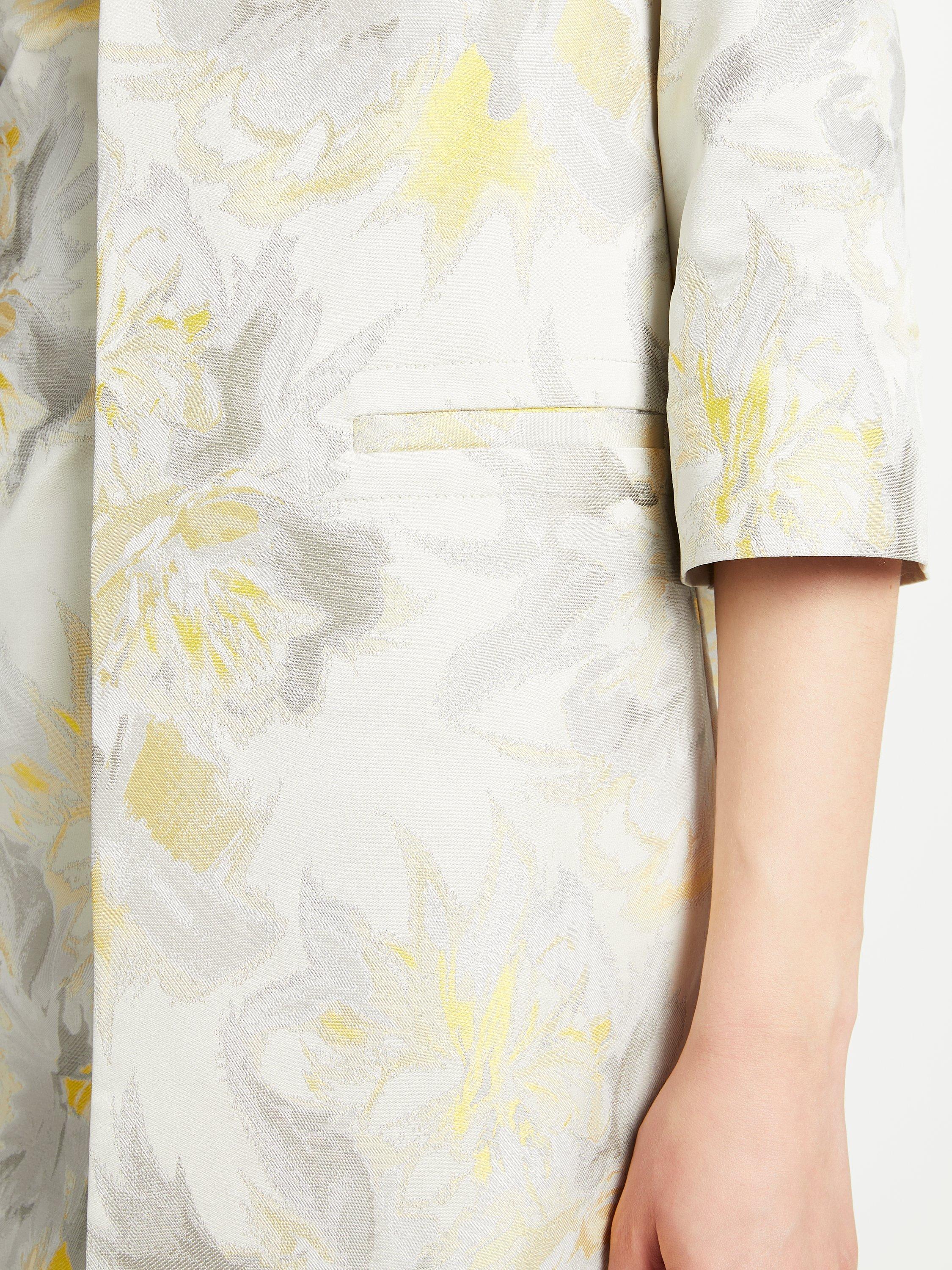 In a beautiful floral jacquard, this piece boasts a subtle lustre and structured silhouette. It's made with a simple, straight cut, featuring a round neckline, 3/4 length sleeves and a large vent at the back for added volume.
