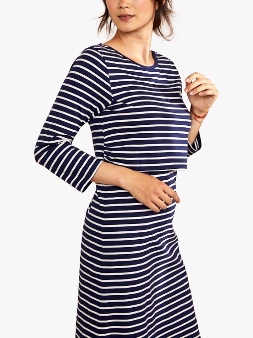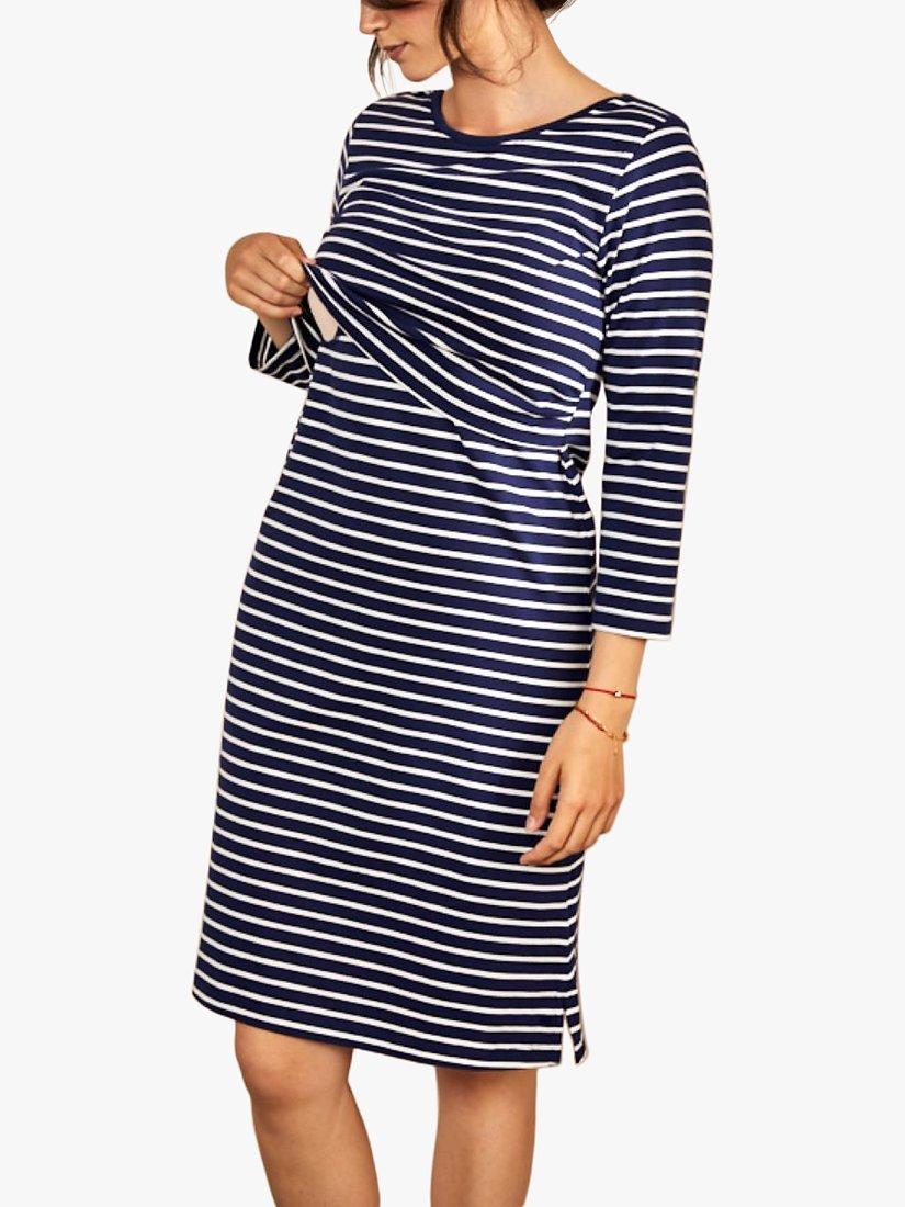 Elevate your nursing wardrobe with this Bshirt nursing dress, where style seamlessly meets functionality. This classic stripe design brings a fresh sophistication to your nursing wardrobe and appeals as a practical yet chic essential. Crafted from luxurious stretch organic cotton fabric, this A-line dress boasts both comfort and elegance. Its 3/4 sleeves provide a touch of sophistication, while the innovative feeding access, akin to Bshirt tops, ensures convenient nursing on-the-go.