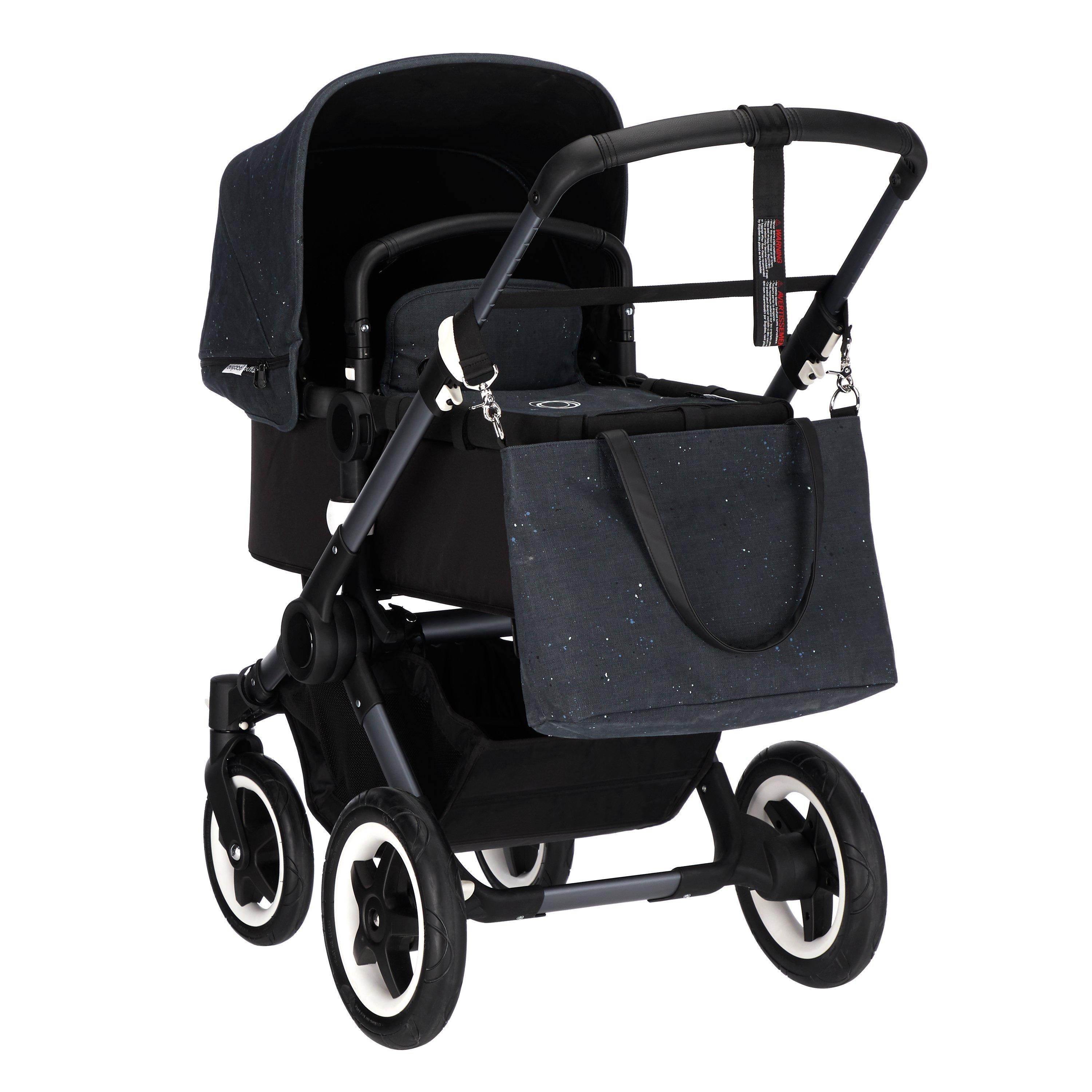 This iconic Buffalo pushchair from Bugaboo is a robust, versatile and spacious pushchair, seamlessly adapting to your journey and now comes in a gorgeous limited edition Denim design. Denim is a classic fabric with a deep heritiage that has taken on a new relevance in the millennial age. The Bugaboo Buffalo Denim captures the spirit of youth, rebellion, and freedom associated with the dynamic world of Denim.The denim sun canopy, bassinet apron and matching tote bag feature free spirited paint flecks for a unique artistic effect. The chassis has been anodized in blue-grey completing the total denim look of the pushchair.