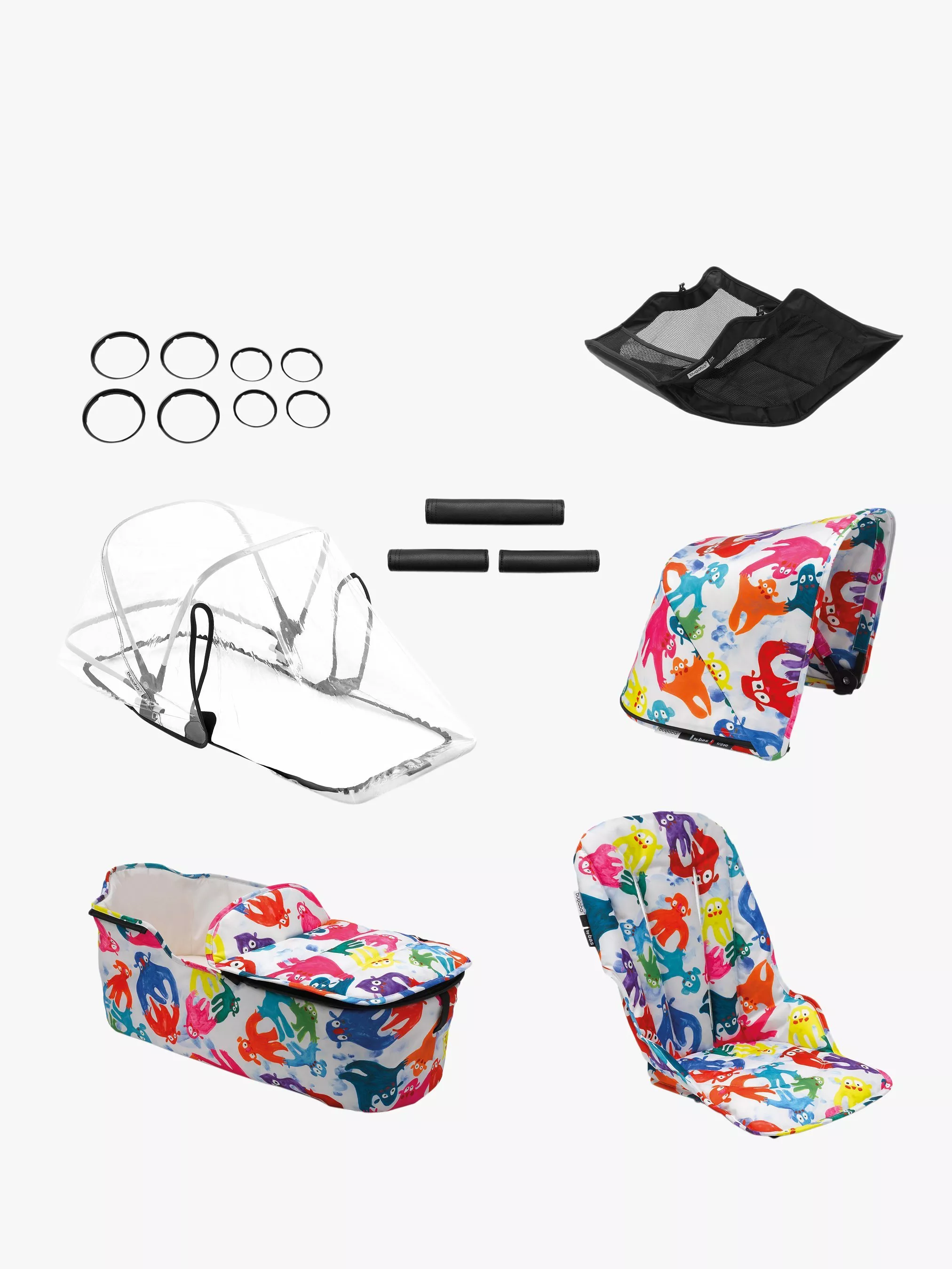 This set includes everything you need to update your existing Bugaboo Fox- the limited edition and numbered Bugaboo by Bas sun canopy, carrycot and seat fabric, mattress cover, under-seat basket, rain cover, black handlebar grips and black wheel caps.