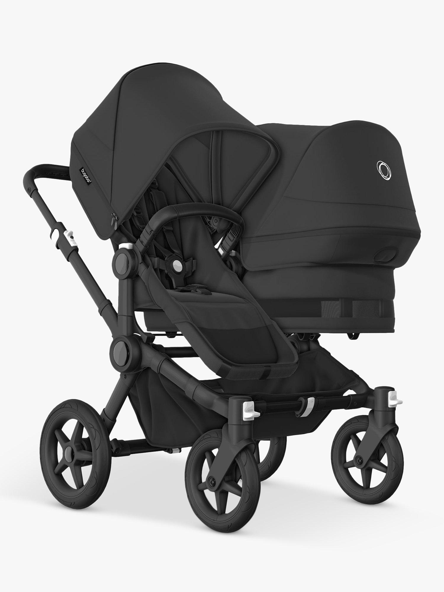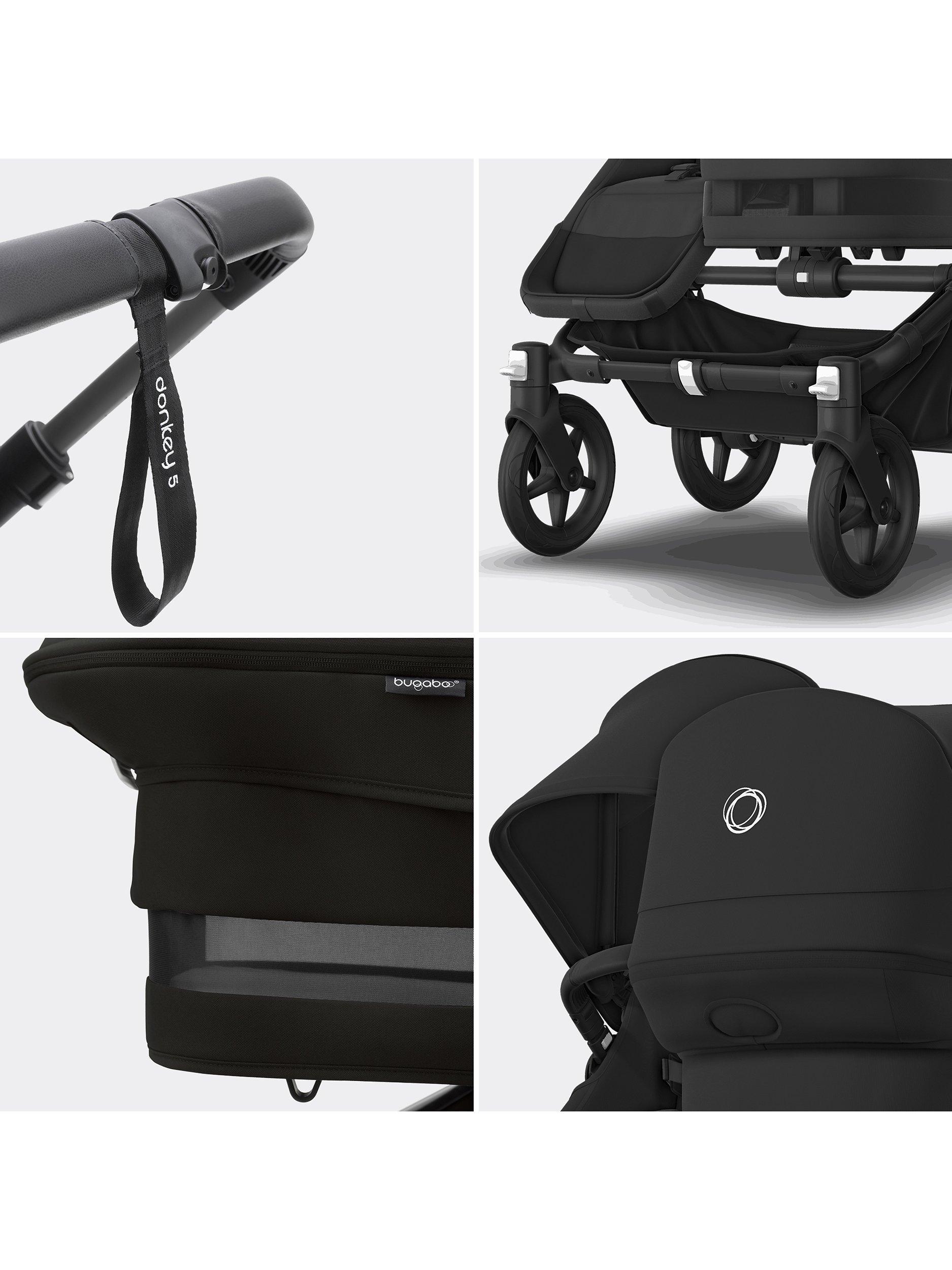 - This item contains the complete Bugaboo Donkey 5 Mono including a chassis with handlebar and carry handle, wheels, seat frame, canopy wires, canopy clamps, rain cover, seat fabric with comfort harness, carrycot stiffeners, carrycot bottom, carrycot fabric with mattress, apron, sun canopy fabric, side luggage basket and underseat basket